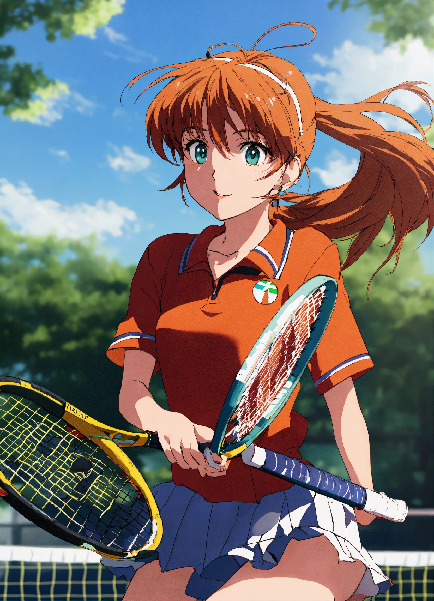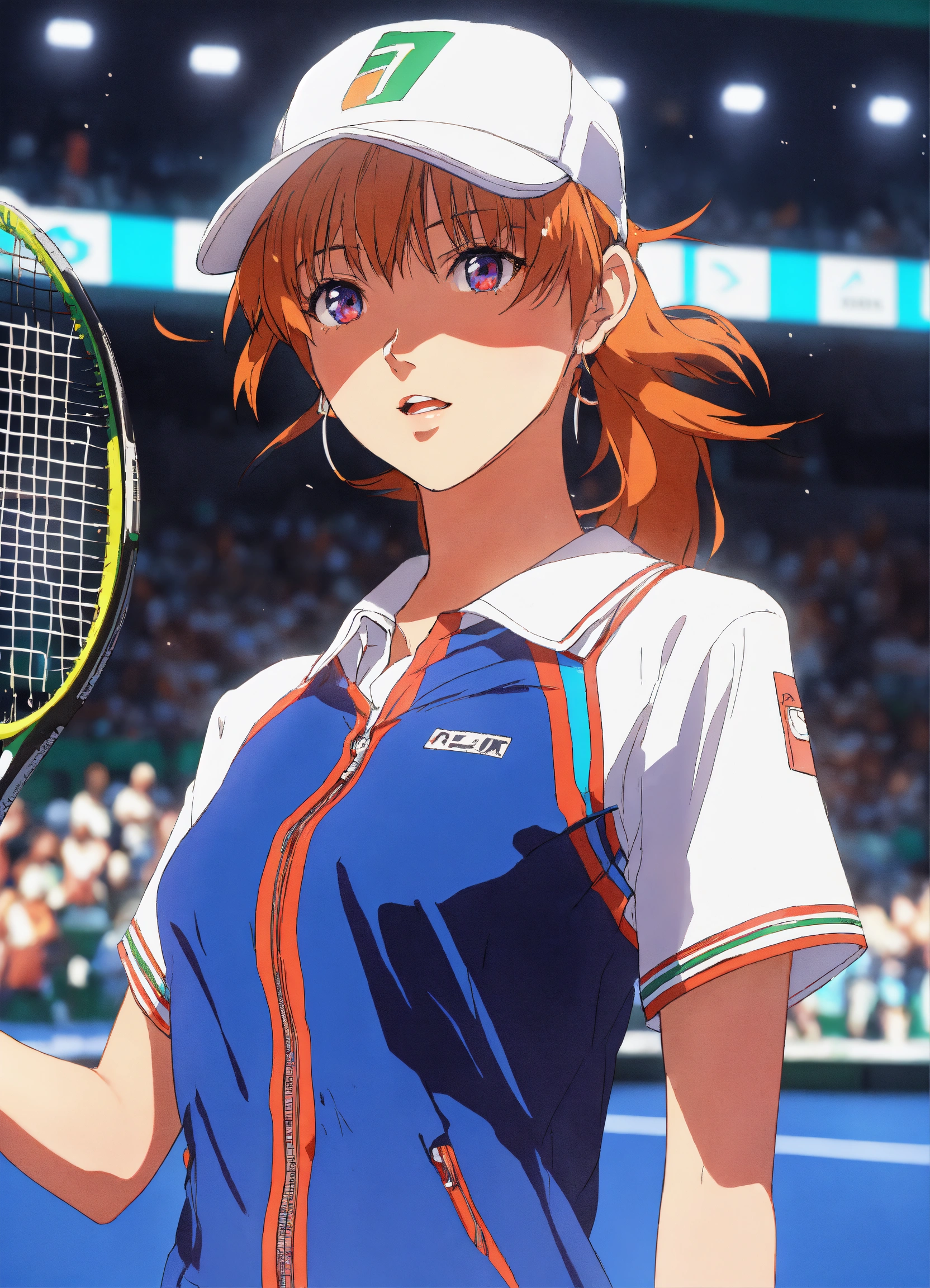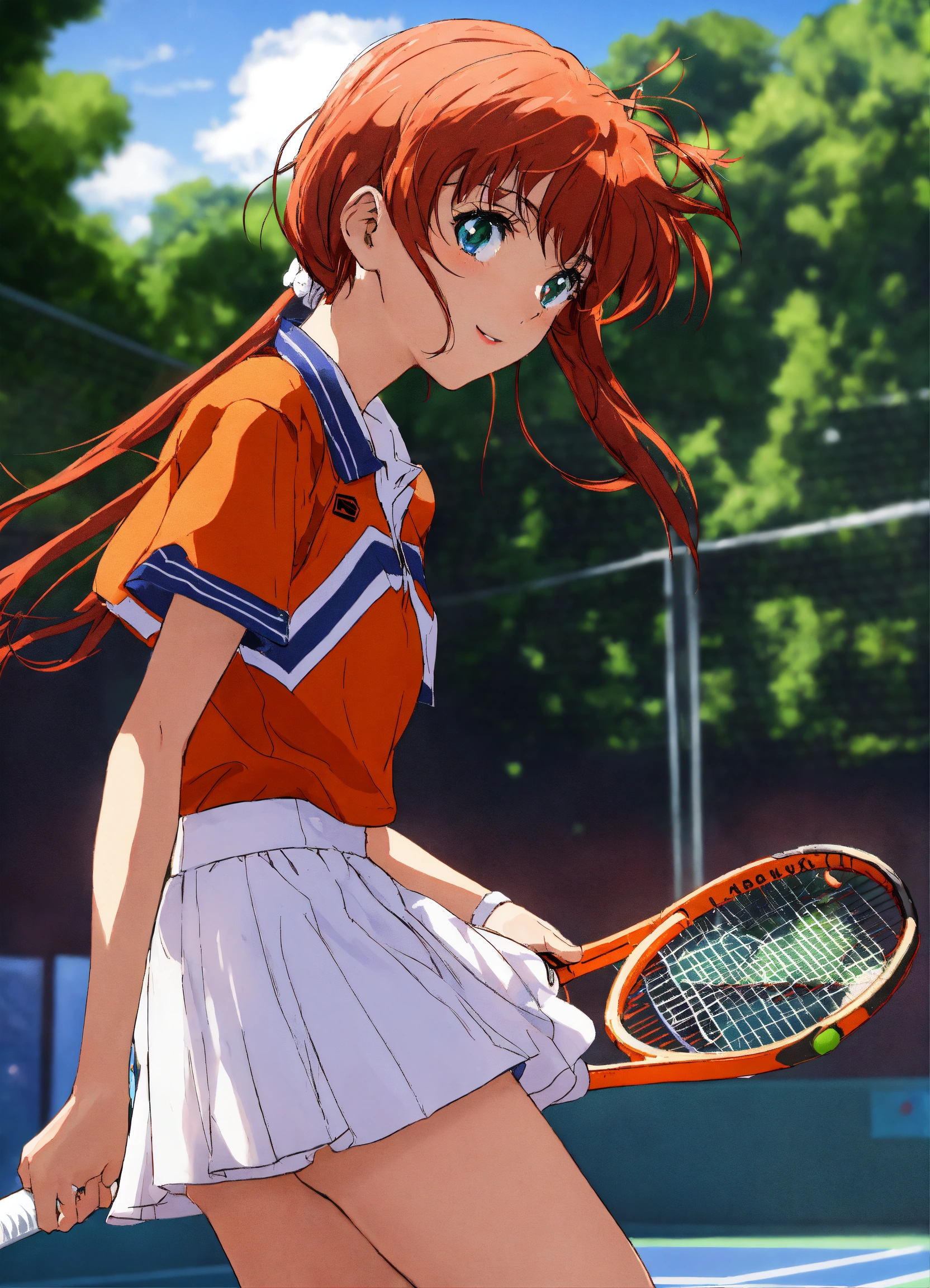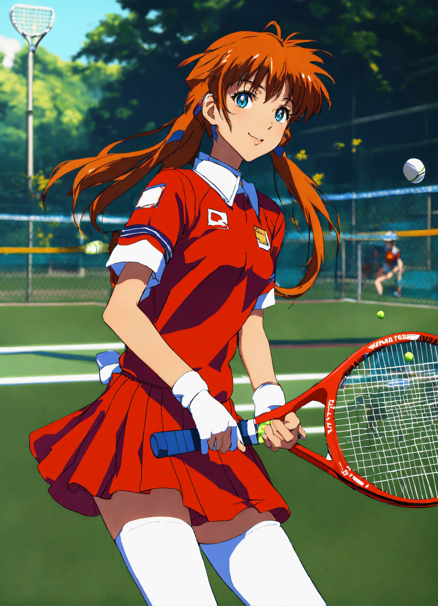 Anime art of asuka from neon genesis evangelion, tennis, tennis girl, tennis skirt, outdoors, sunny, tennis racket, young girl, beautiful girl, happy, stunning detail, detailed environment, trending on artstation, unreal engine render, ray-traced environment, vintage 80’s anime artwork