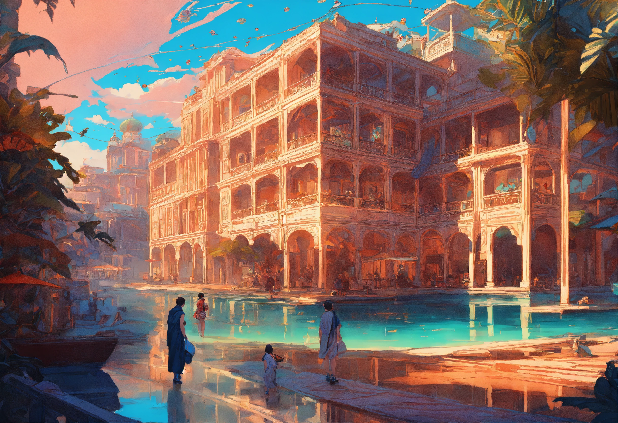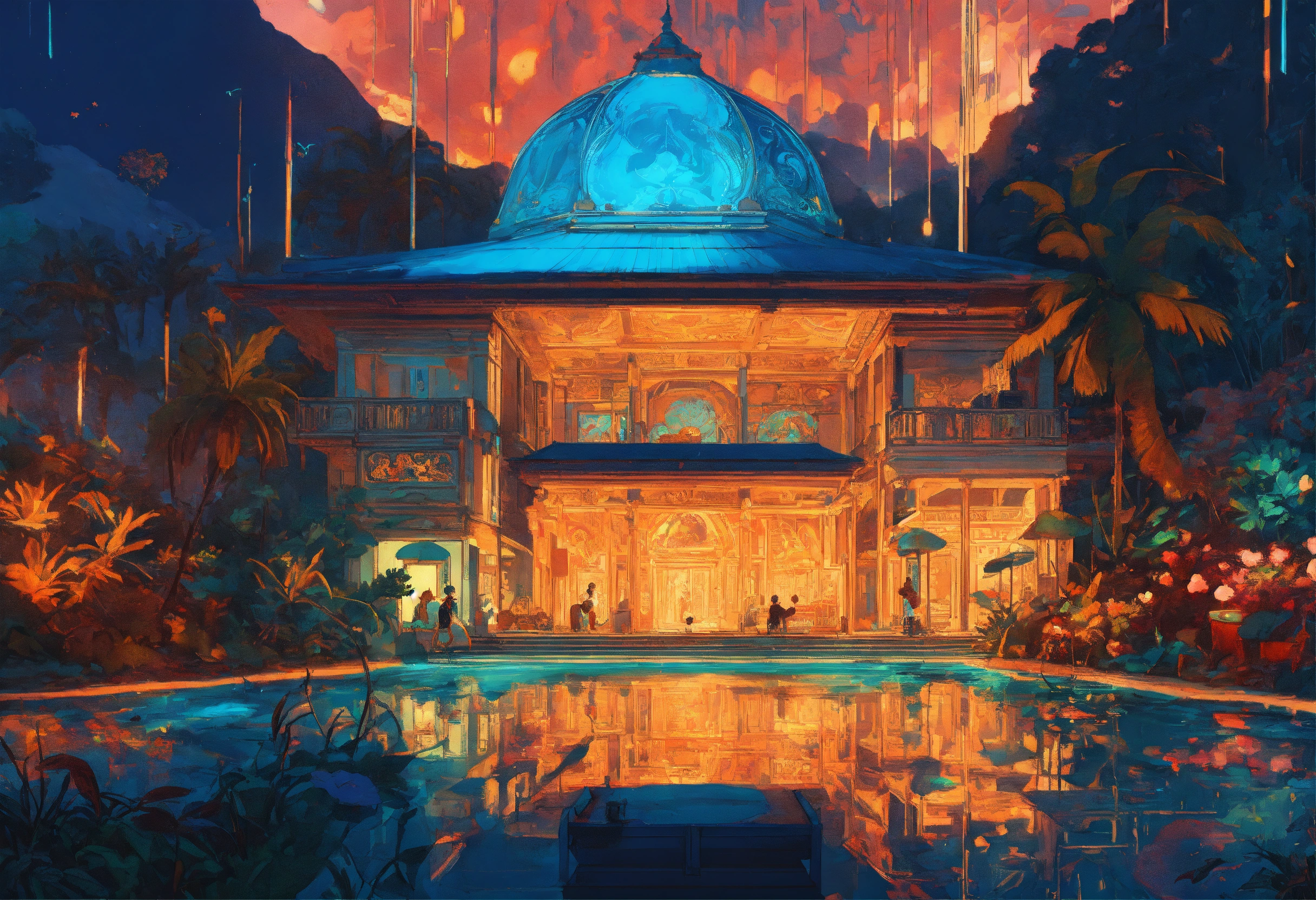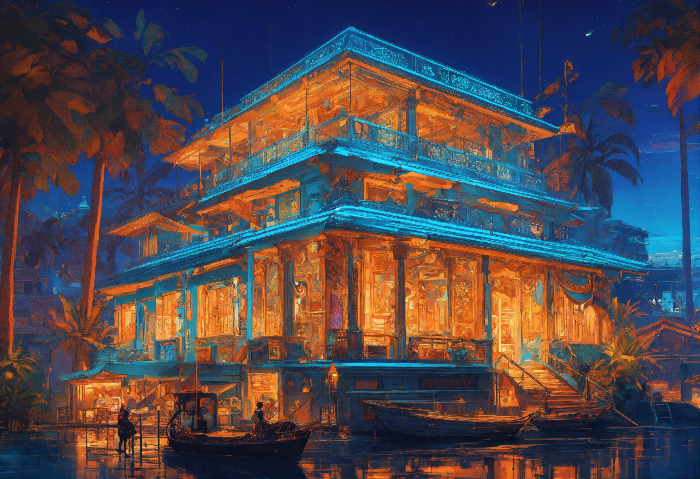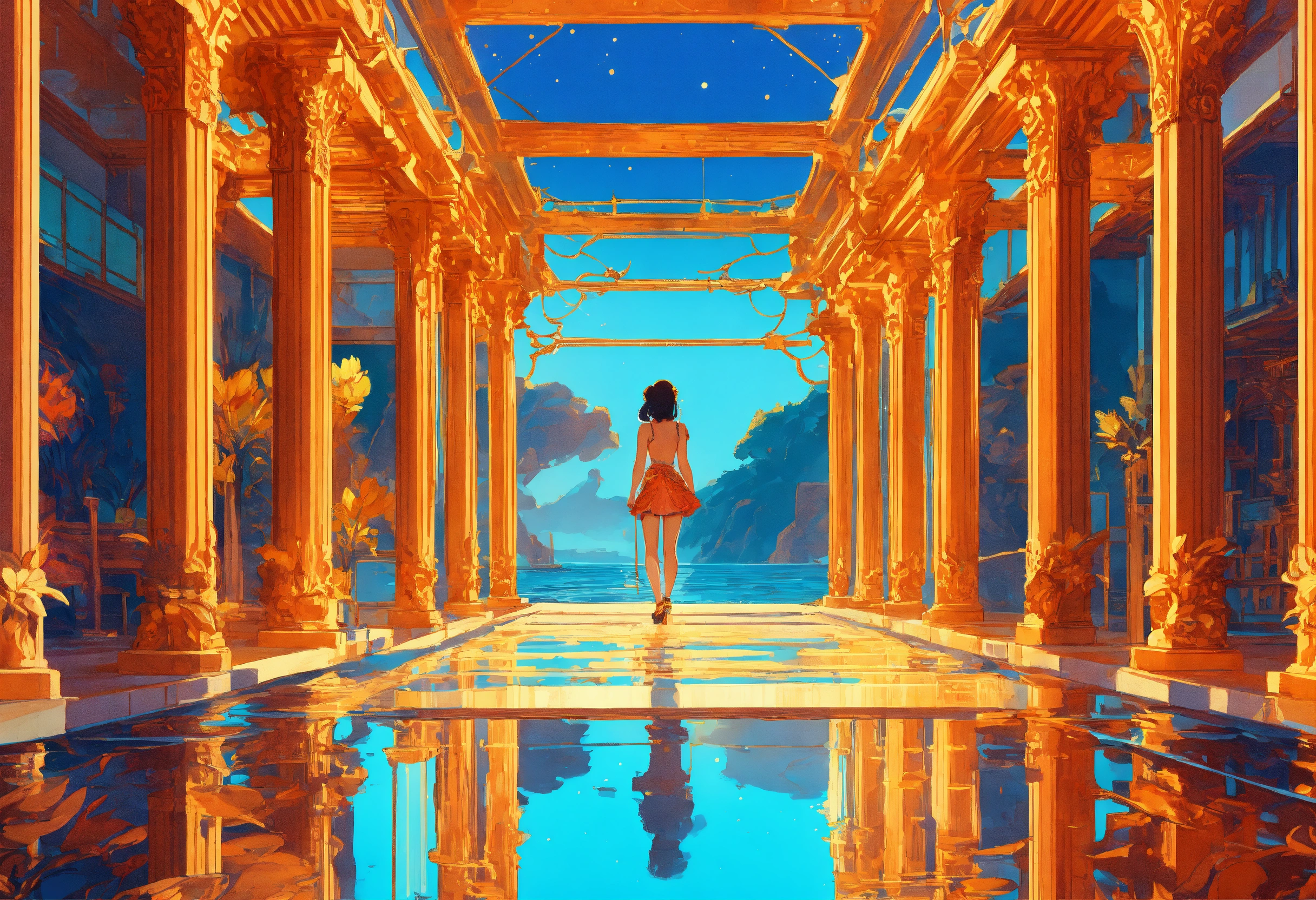 Rich fantasy ocean palace, grecian architecture, blue and gold, ernst haeckel maria sibylla merian. tristan eaton, victo ngai, artgerm, rhads, ross draws, kaethe butcher, hajime sorayama, greg tocchini, virgil finlay, fantasy, colors, neon lights, digital painting, pixiv, by ilya kuvshinov, neon lights, 3d, perspective