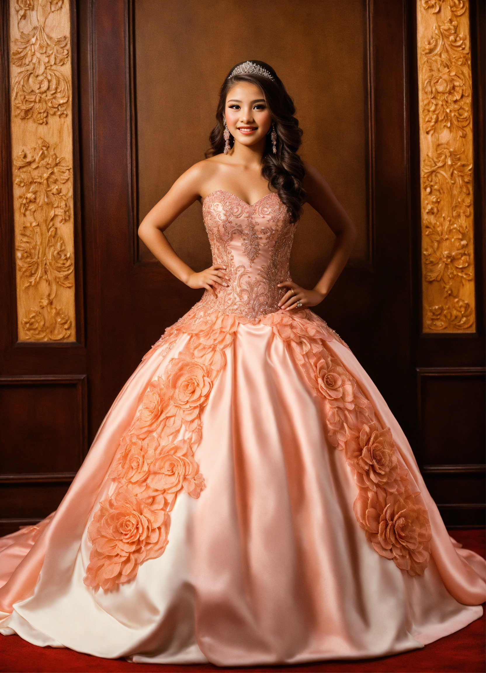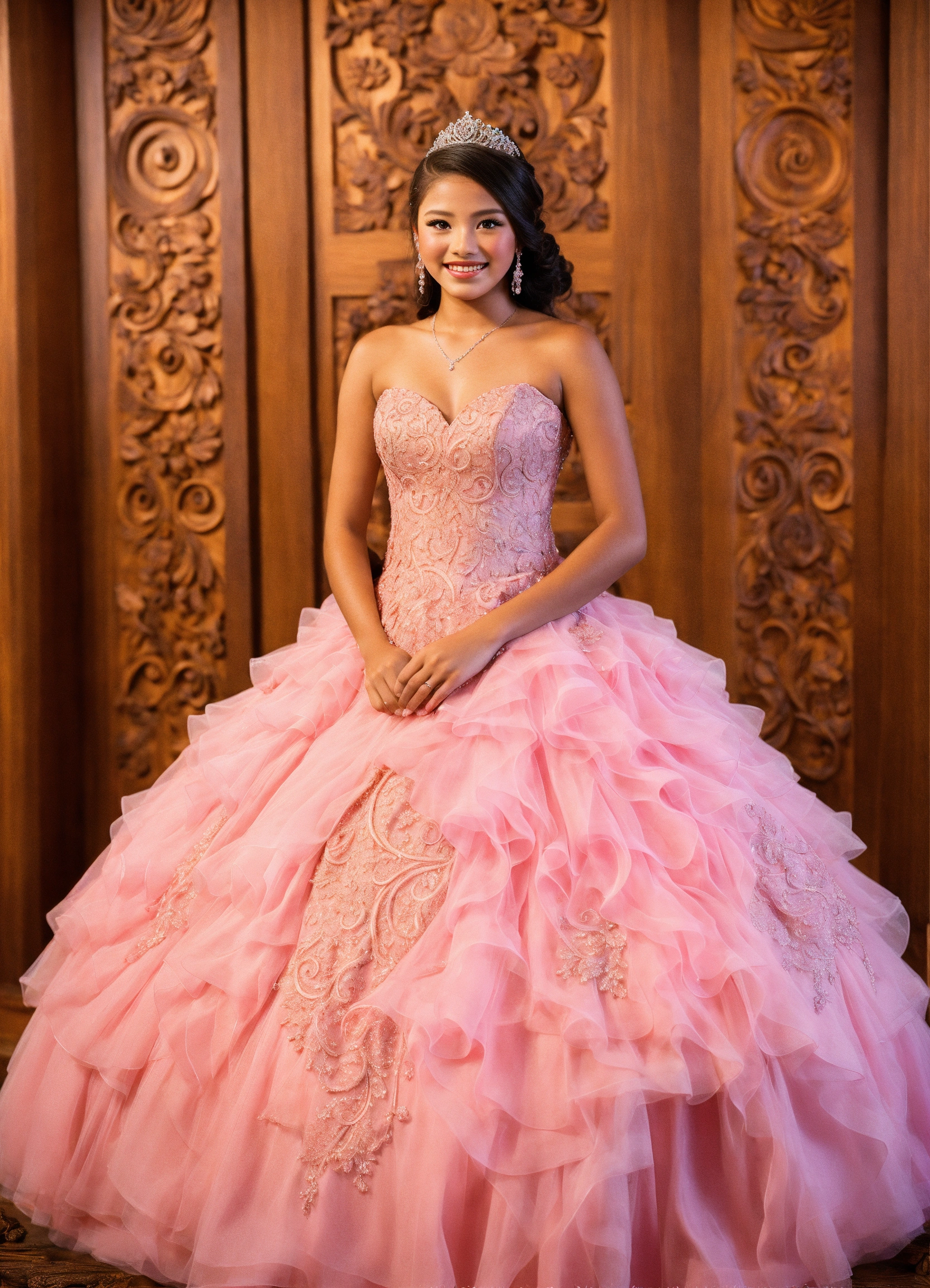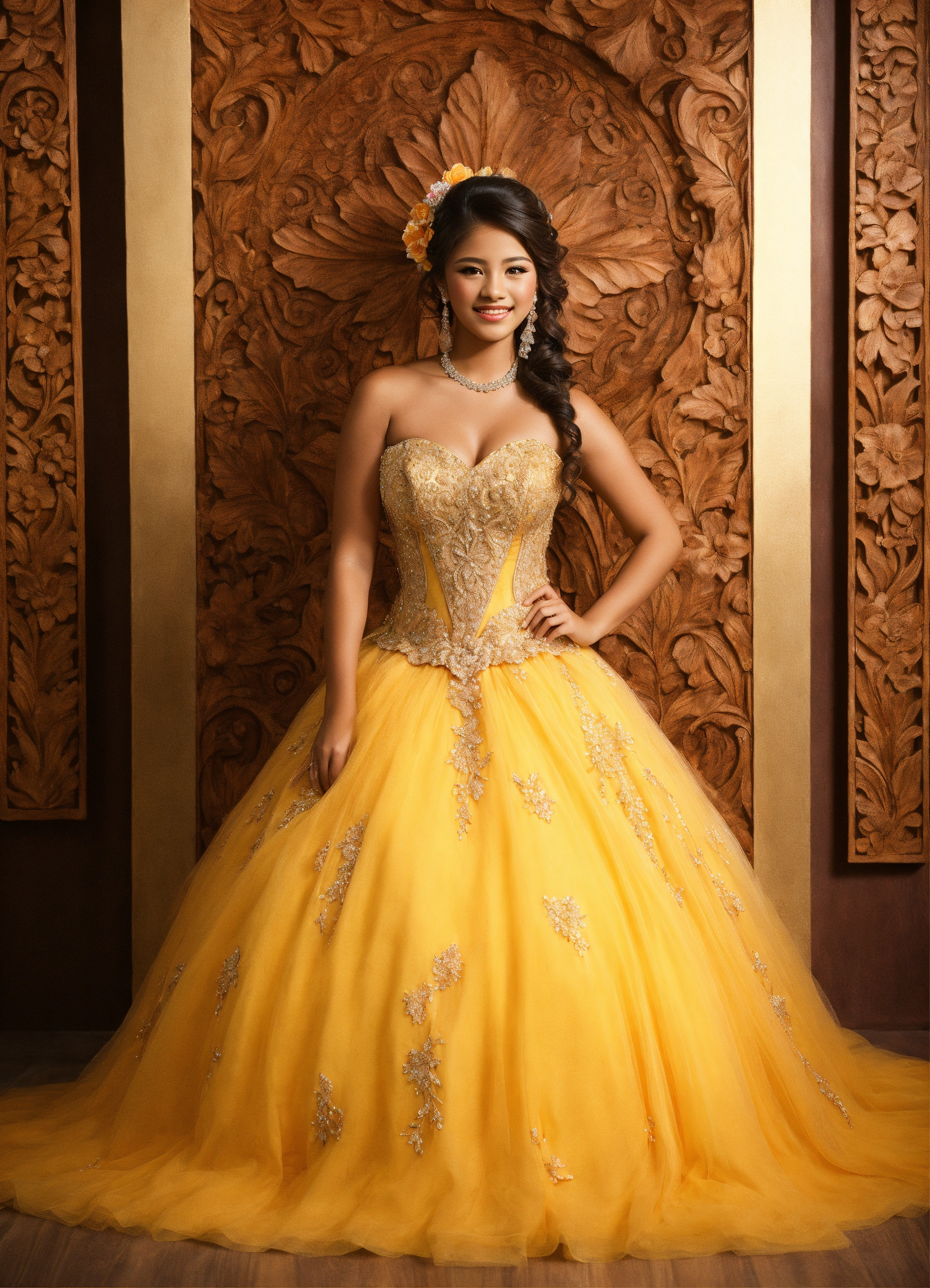 Quinceañera, photorealistic, in a lovely detailed dress, waist up shot, detailed woodcarving panel backdrop
