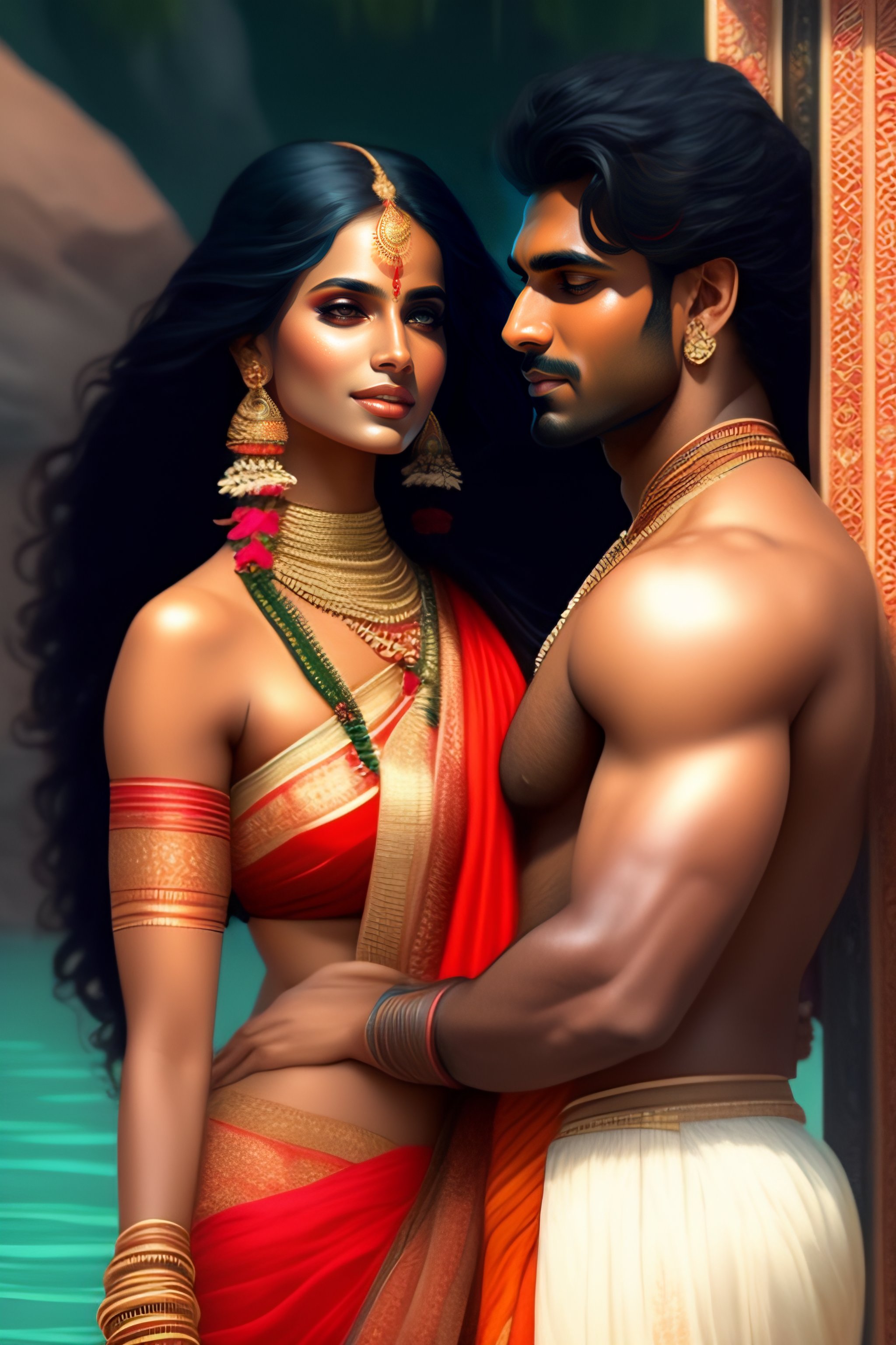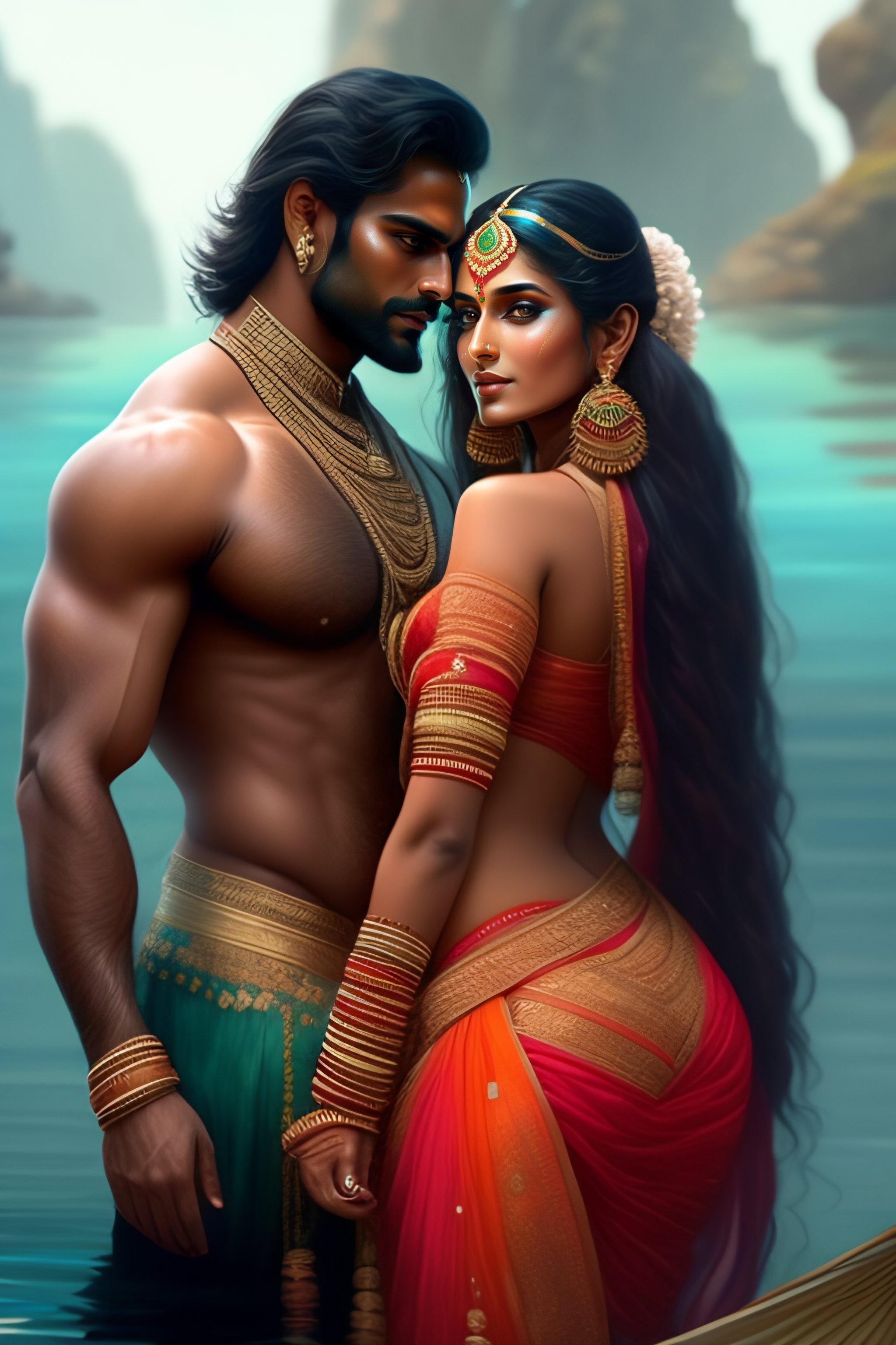 Desi couple romancing beautifully underwater, muscular handsome man with broad hairy chest romancing with beautiful female dancer, indian classical dress, dhoti, very detailed, full figure, wide angle, beautiful, intricate, cinematic, artstation, alphonse mucha, greg rutkowski, octane render