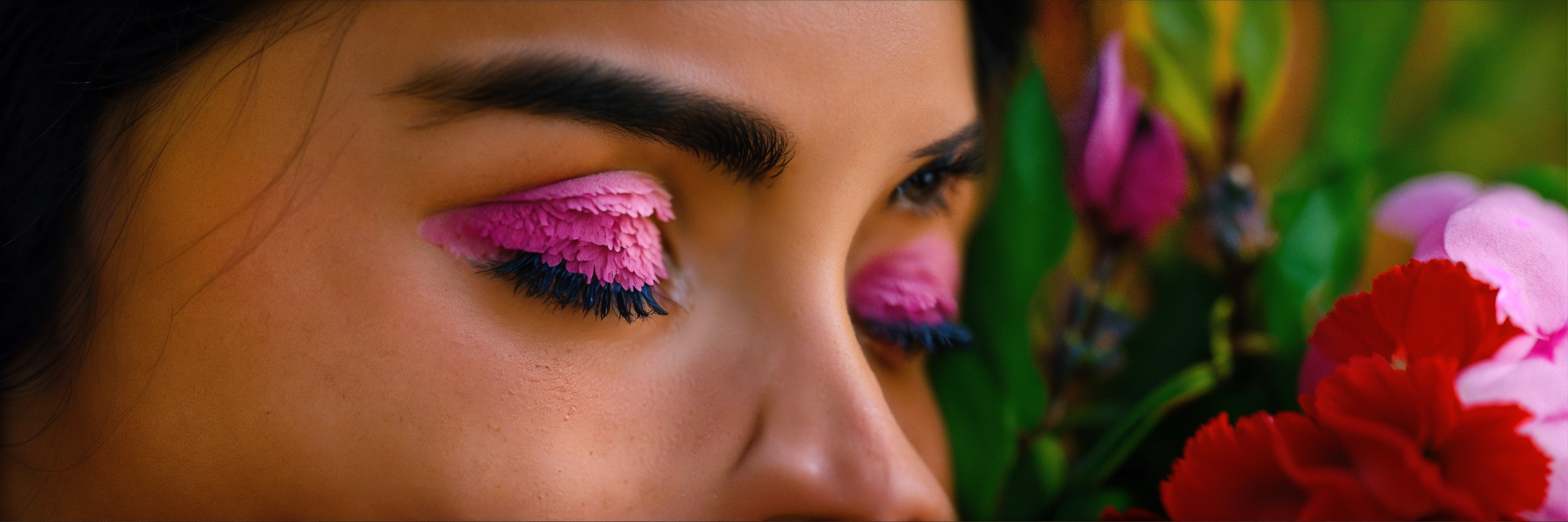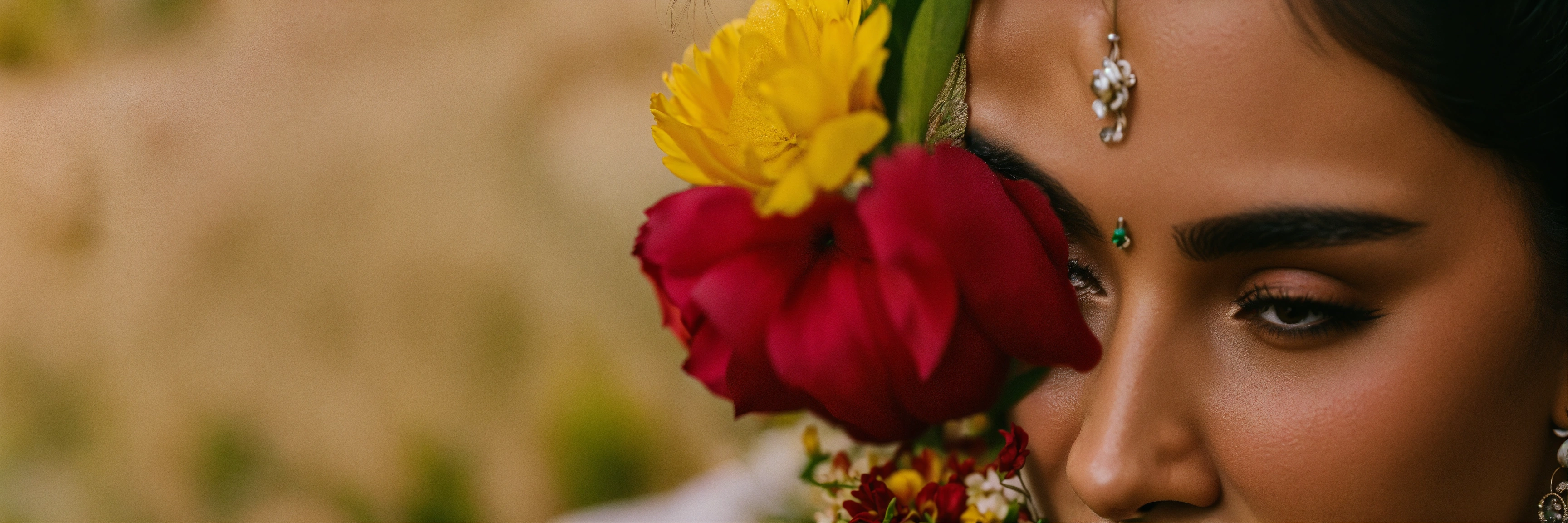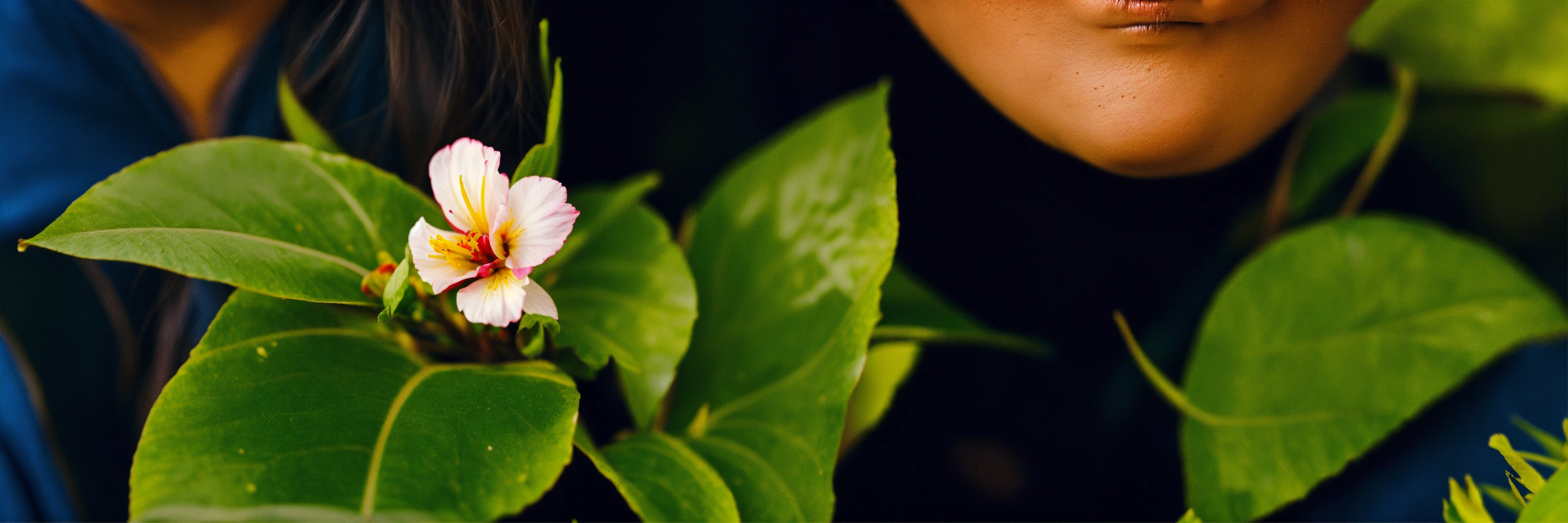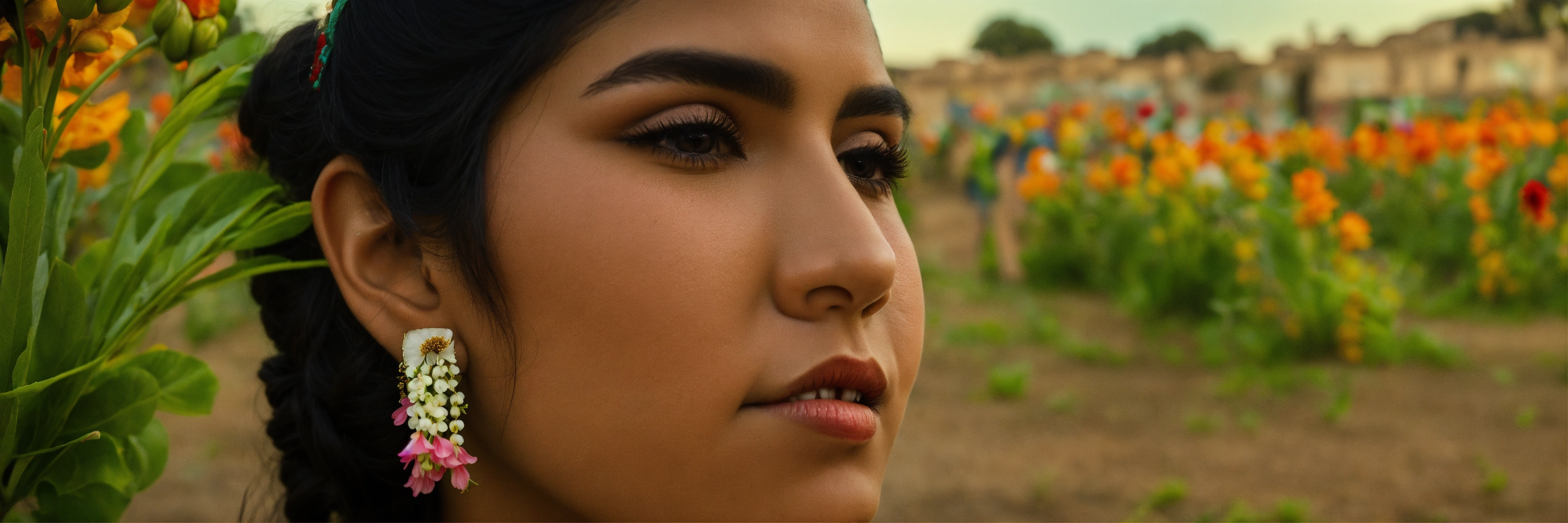 Mexican woman close up to face with a flower in her hand sigh the roma of the flower