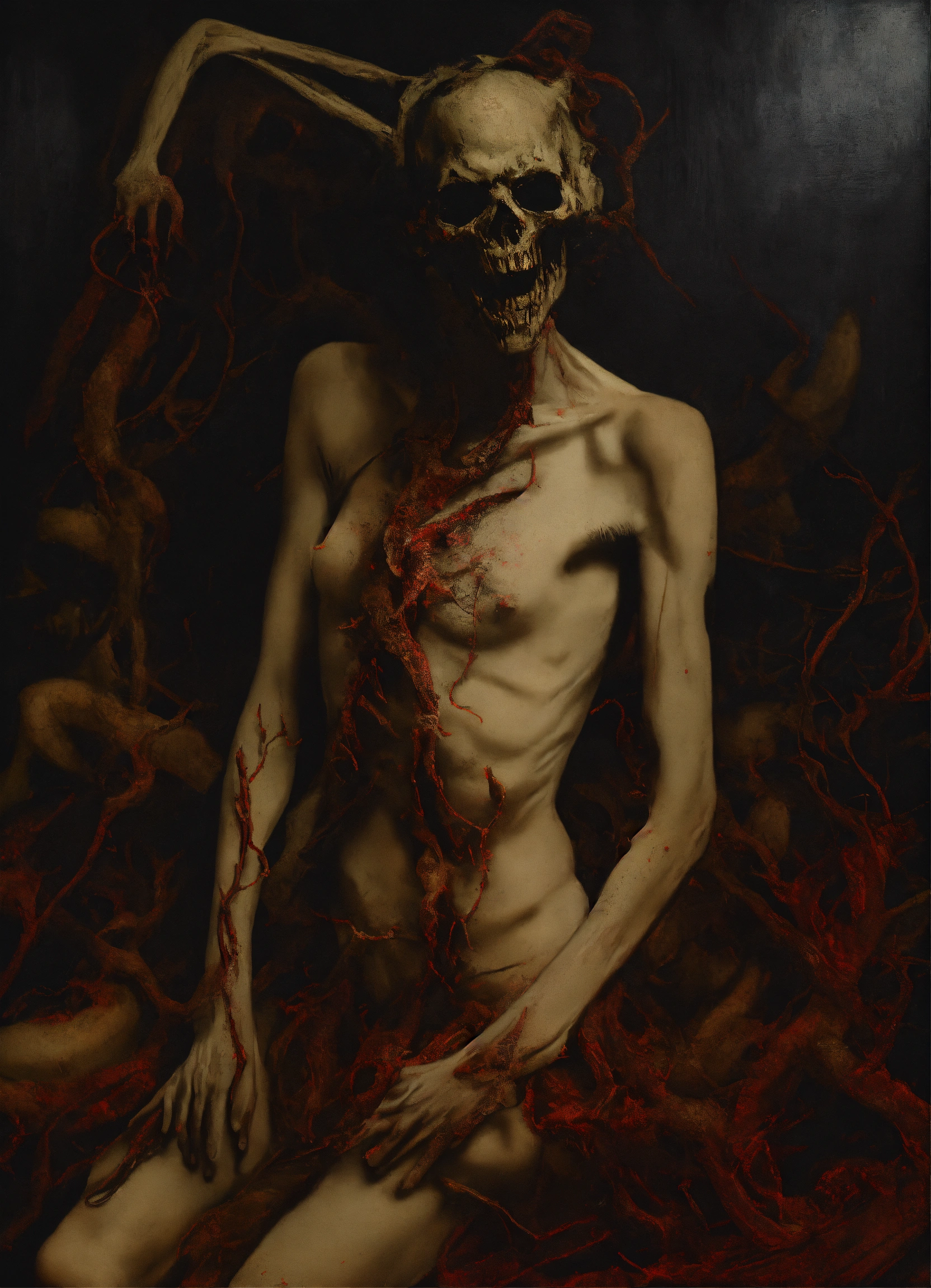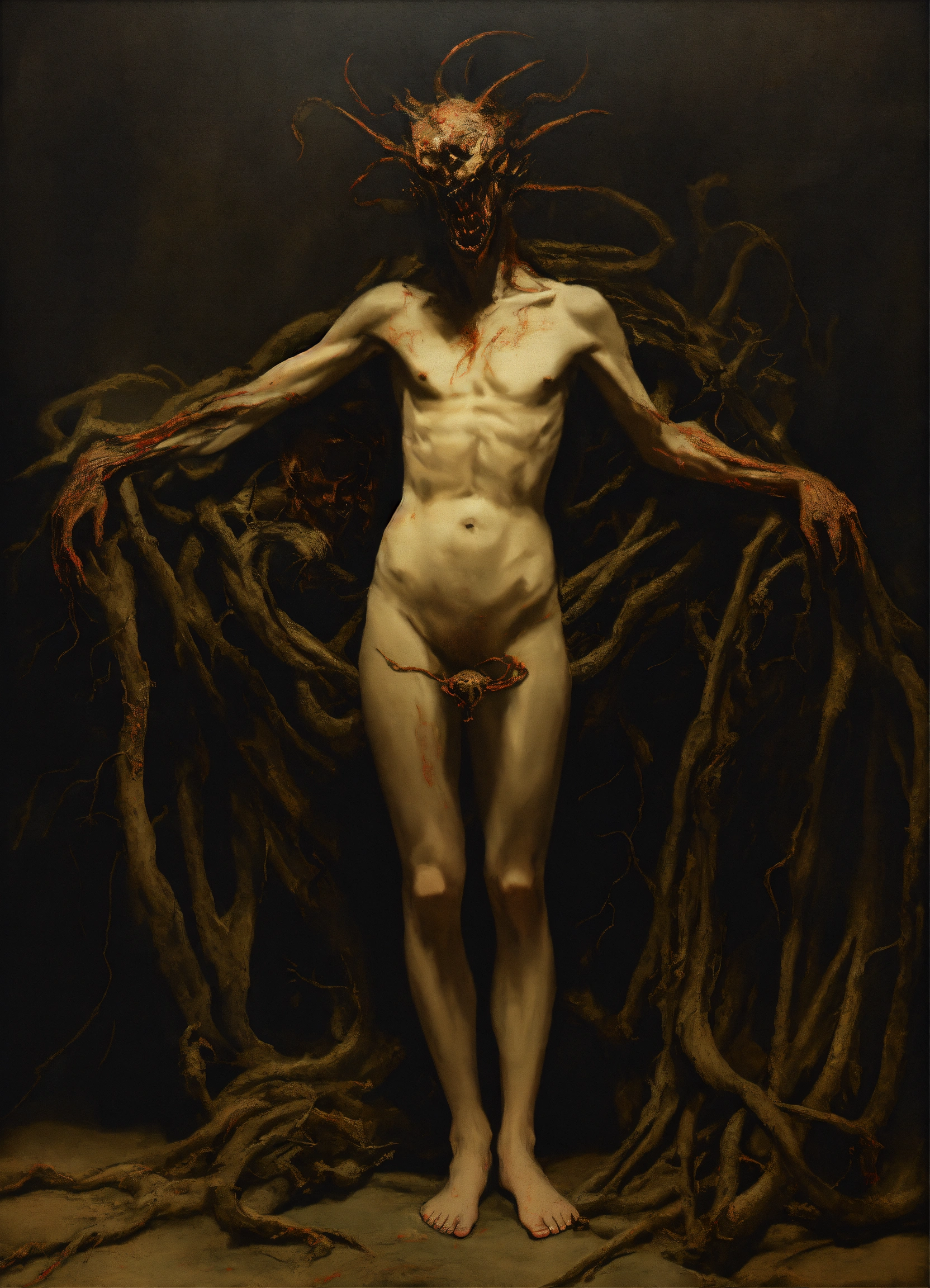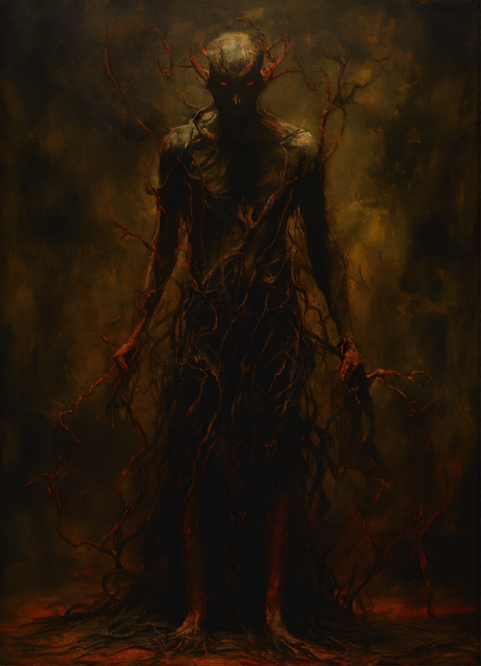 A disturbing picture of a demonic figure on dark canvas