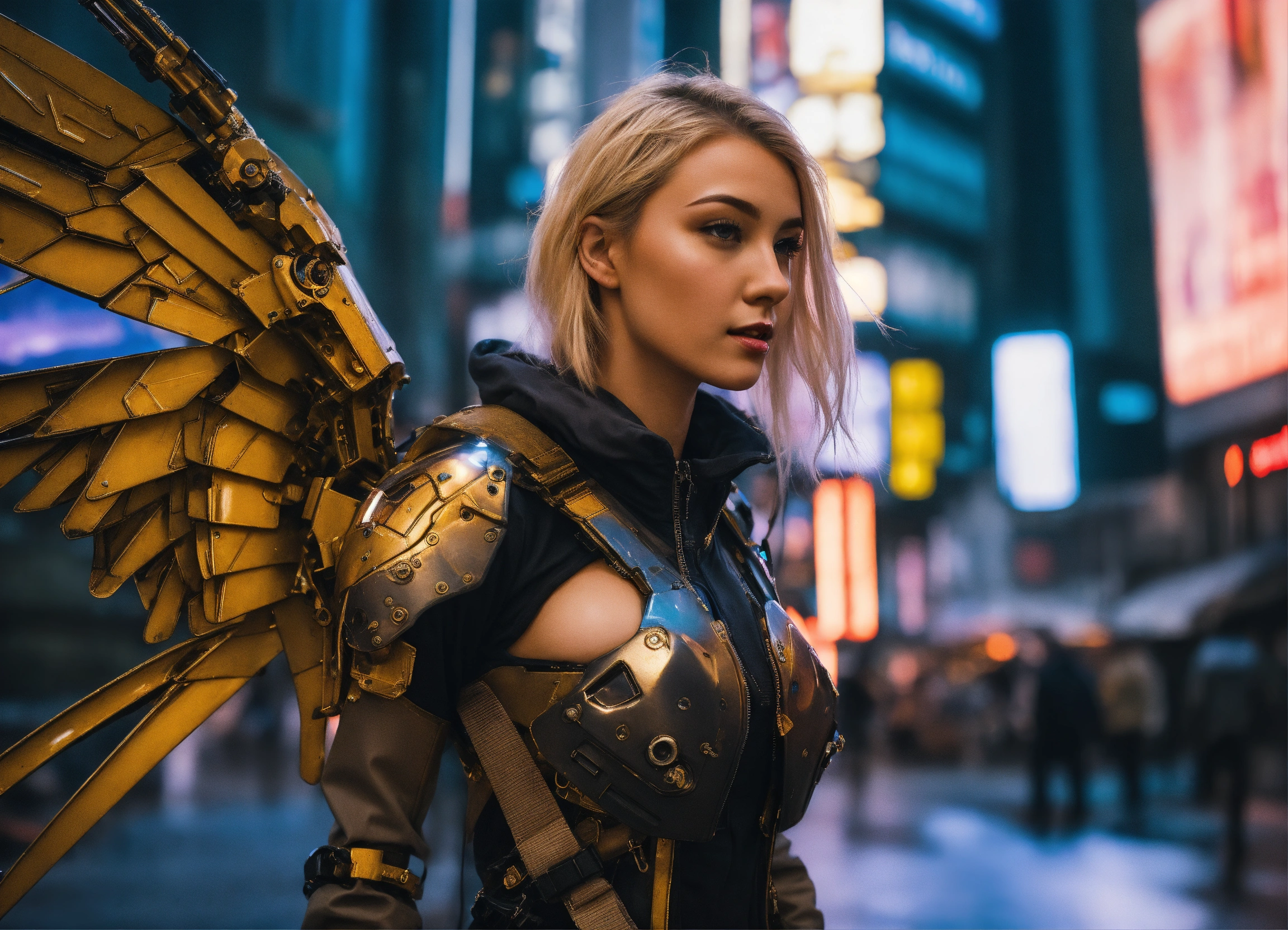 Text full body top view real life photo of a women looking aroused satisfied has blond hair 25 year old woman with big angelwing's wearing mechsuite in a cyberpunk like city