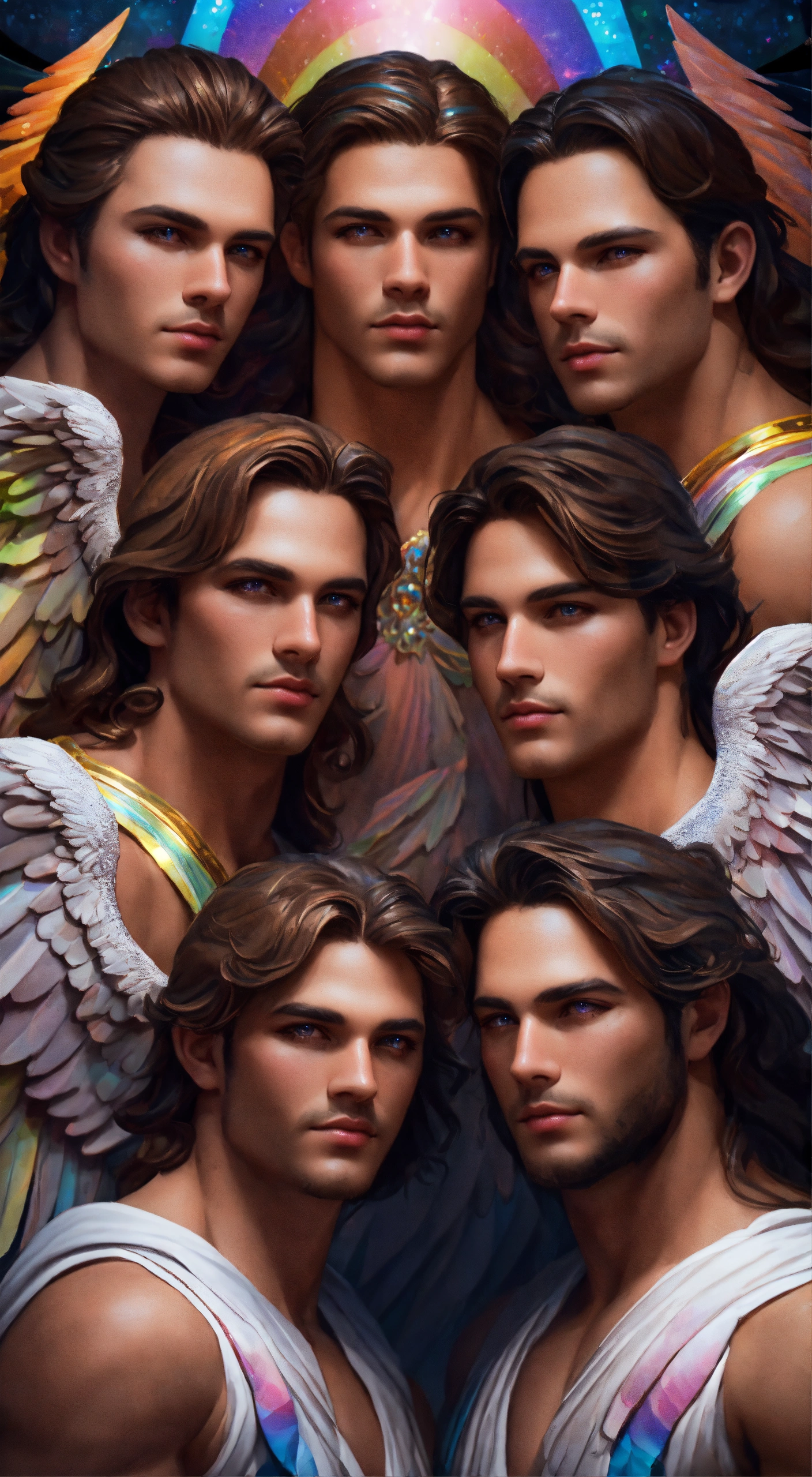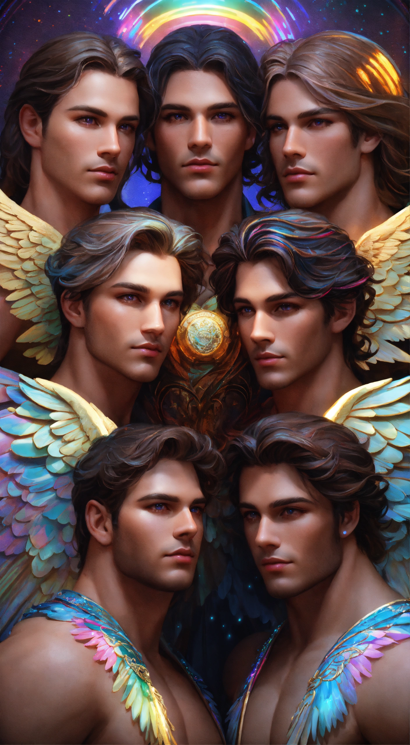 Group of 7 gorgeous and perfect male angels, detailed and defined rainbow colored angel wings, intricate, highly detailed, digital painting, art station, real, 3d, 7 very masculine angels, beautiful and detailed angels, all have rainbow wings with sparkles luminous, large and detailed wings, clear eyes and deep gaze, manly faces perfect in beauty and detail, all have robes of rainbow colors and details, sacred, mystical, sharp focus, cinematic lighting, 8k, 3d, hd, digital illustration, art by artgerm and greg rutkowski, alphonse, cgsociety, high quality and resolution, hyperrealistic