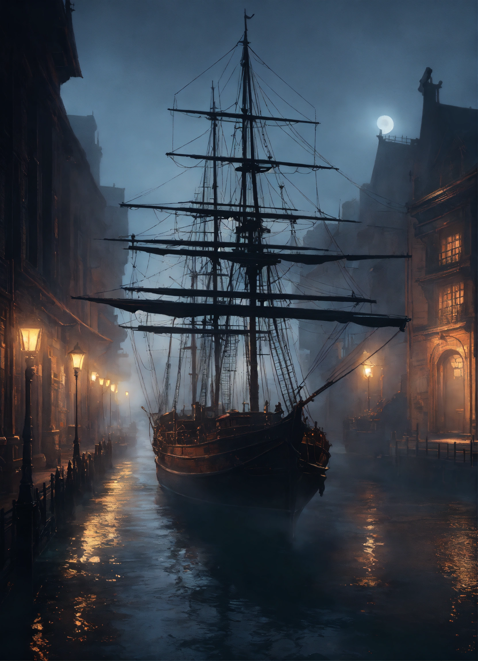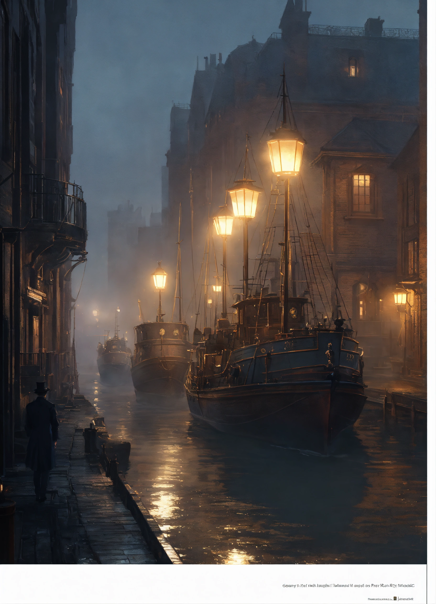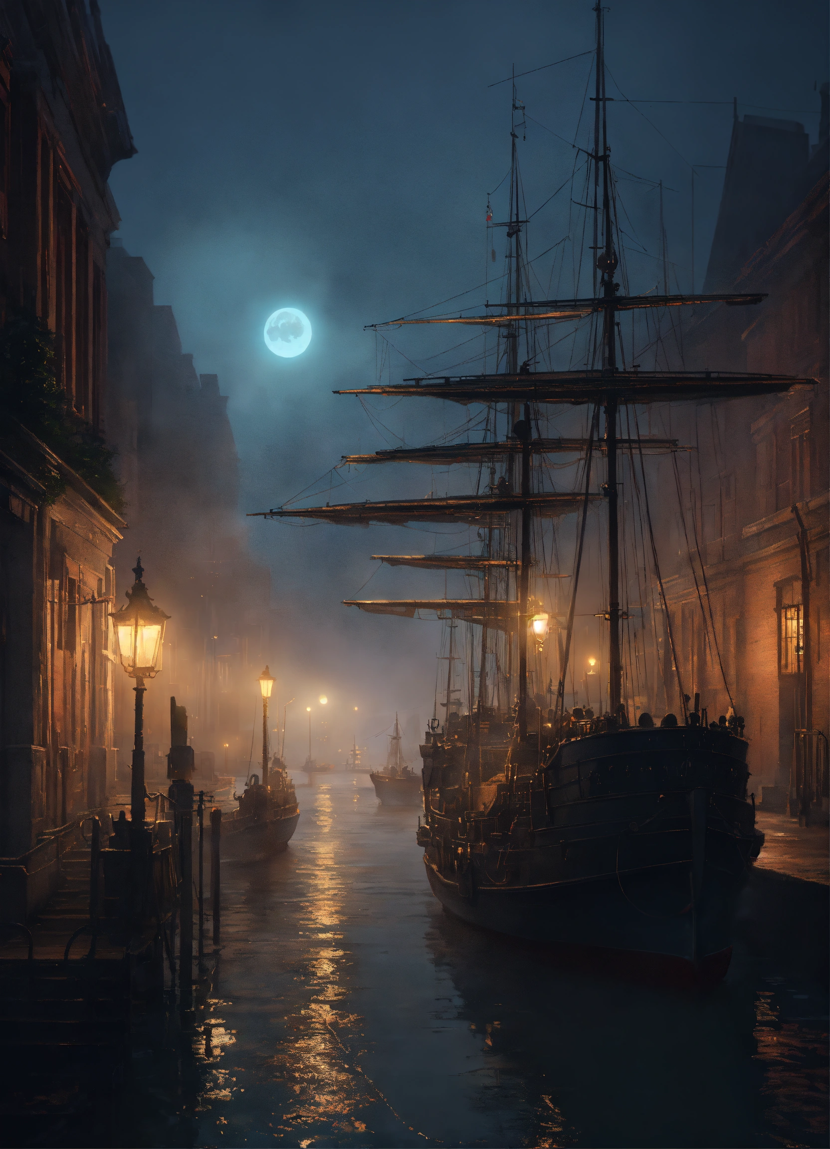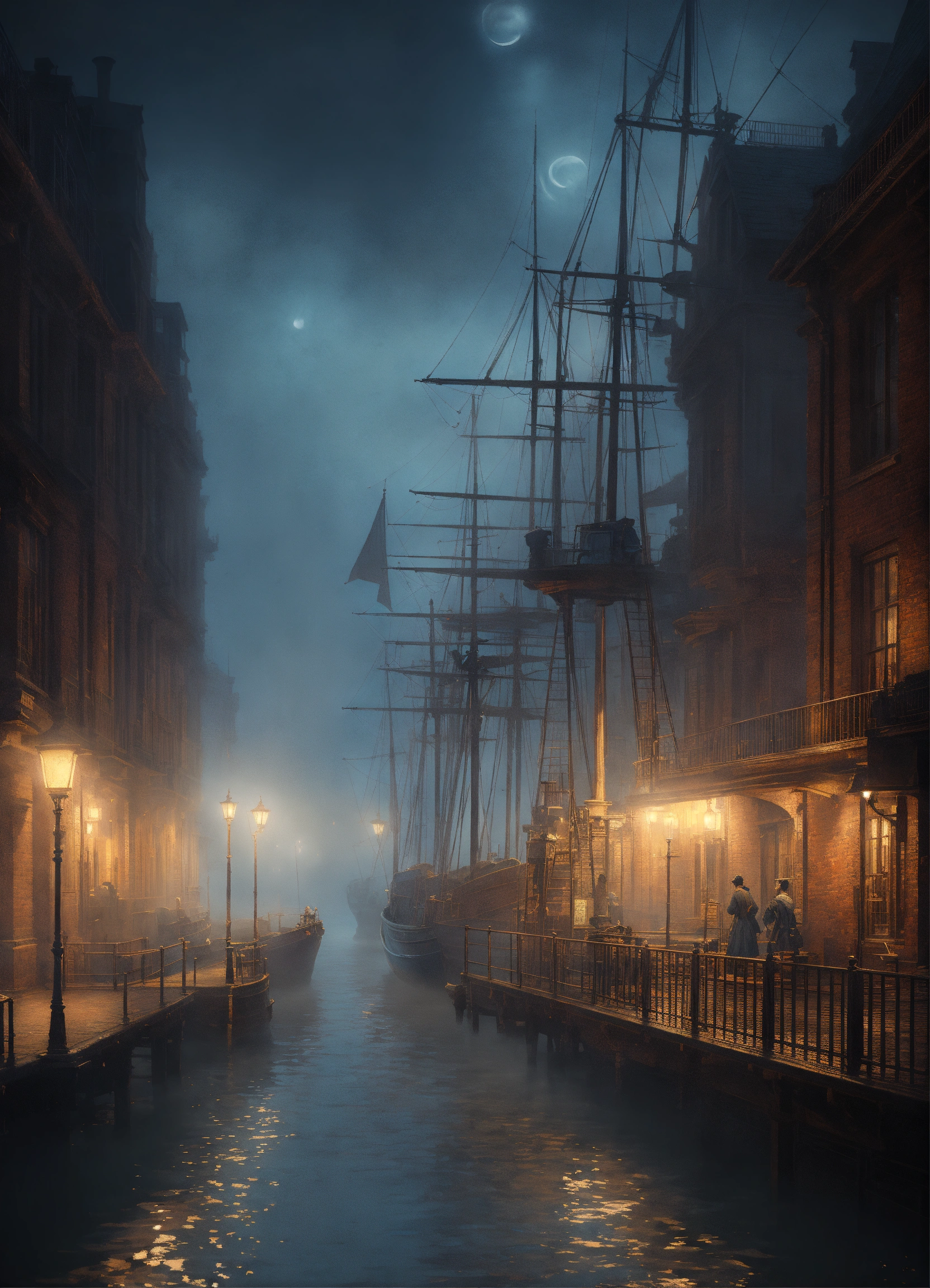 Concept art of a foggy victorian harbour at night, cinematic, moonlight, street lamps, ships, dark, in the style of greg rutkowski and ruan jia and jeremy lipking and peter mohrbacher, mystical colors, rim light, beautiful lighting, 8 k, stunning scene, raytracing, octane, trending on artstation