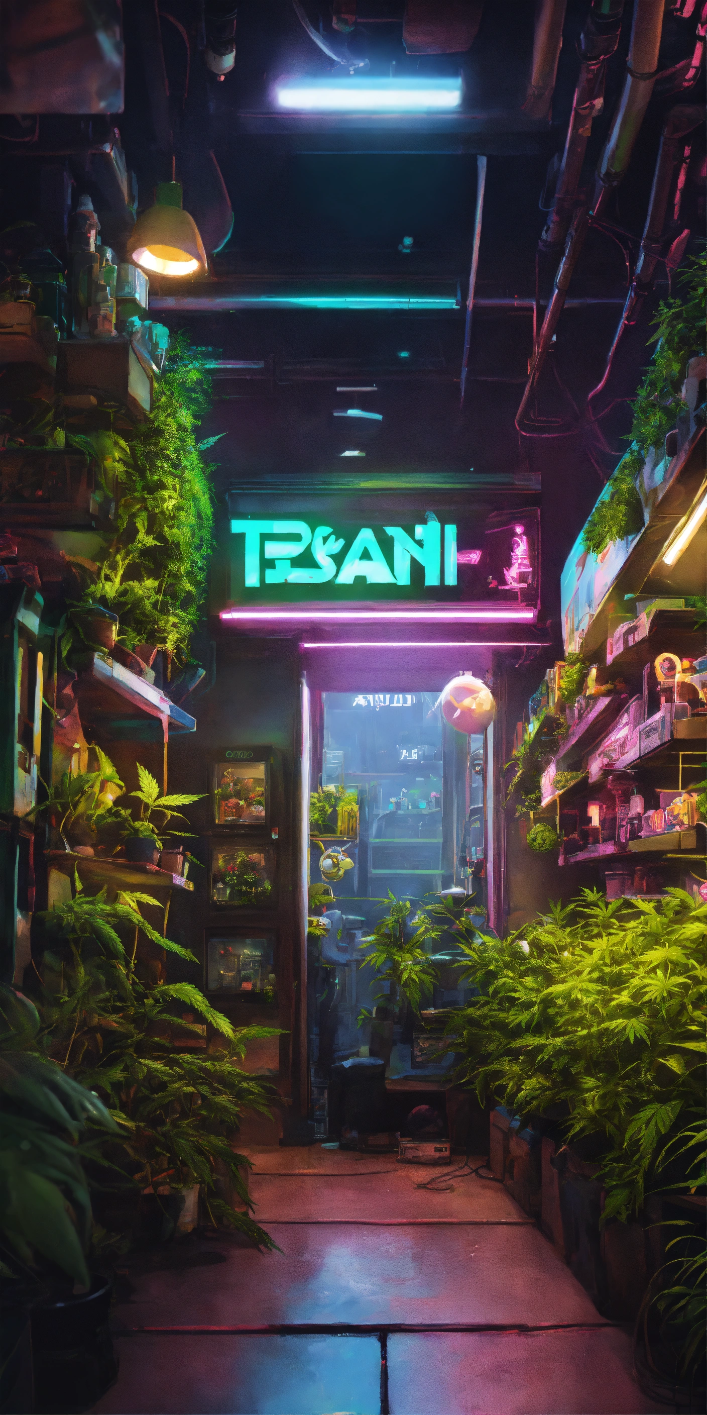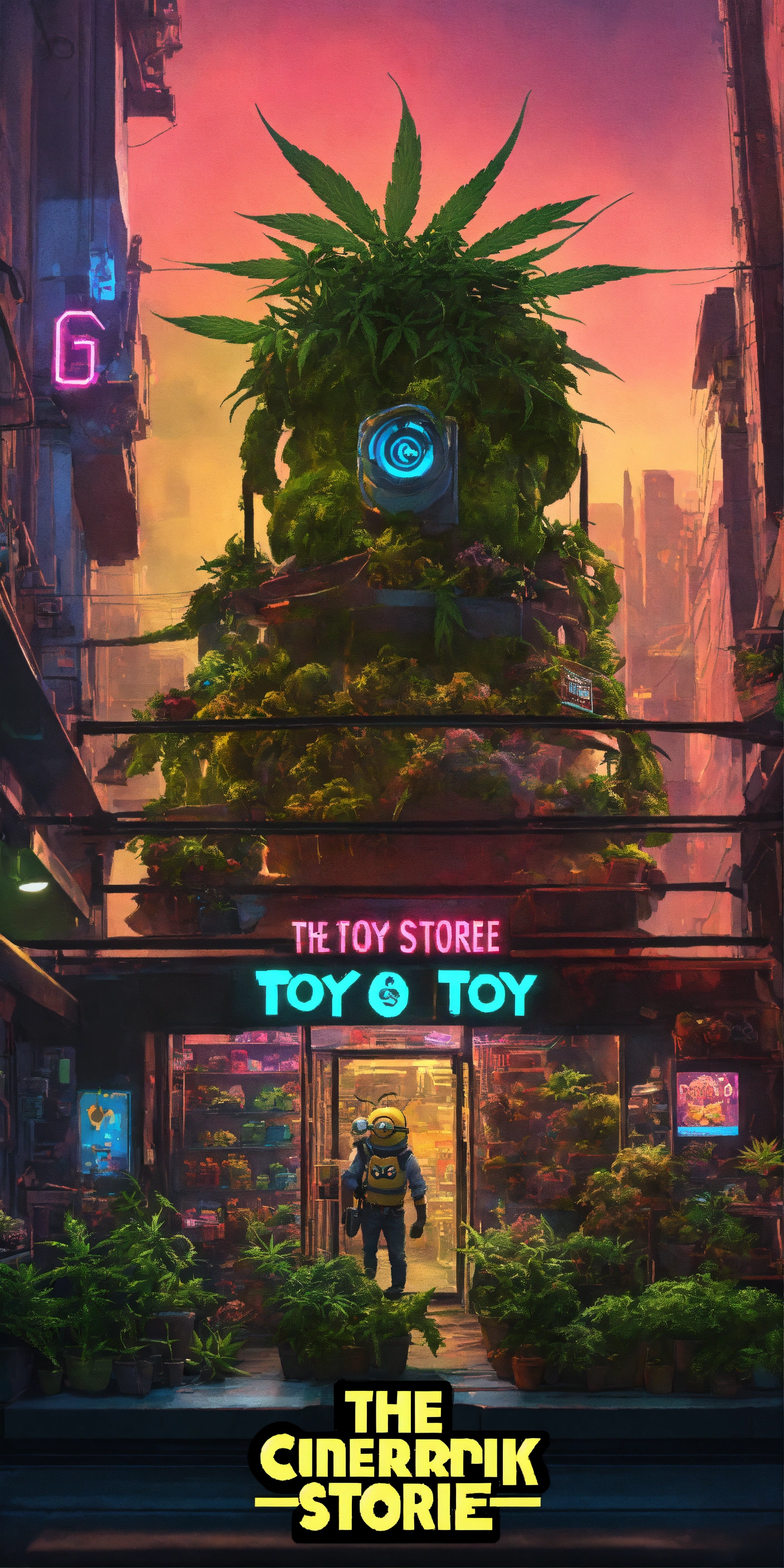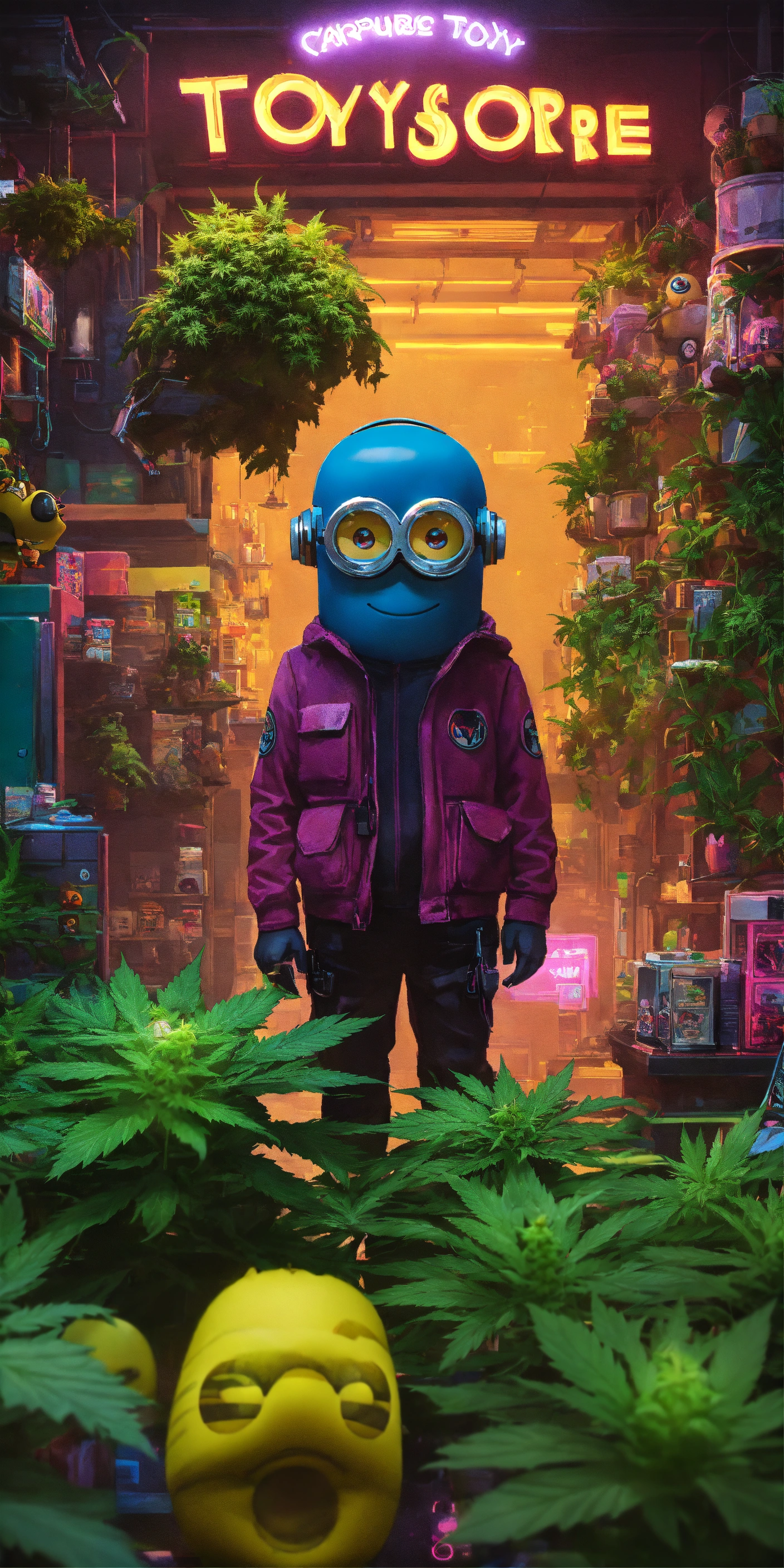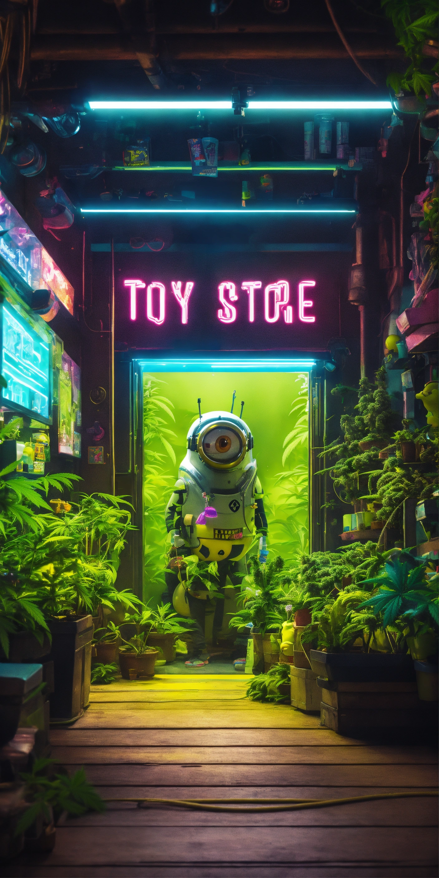 Cyberpunk logo of "the toy store" surrounded by cannabis plants and minion inside