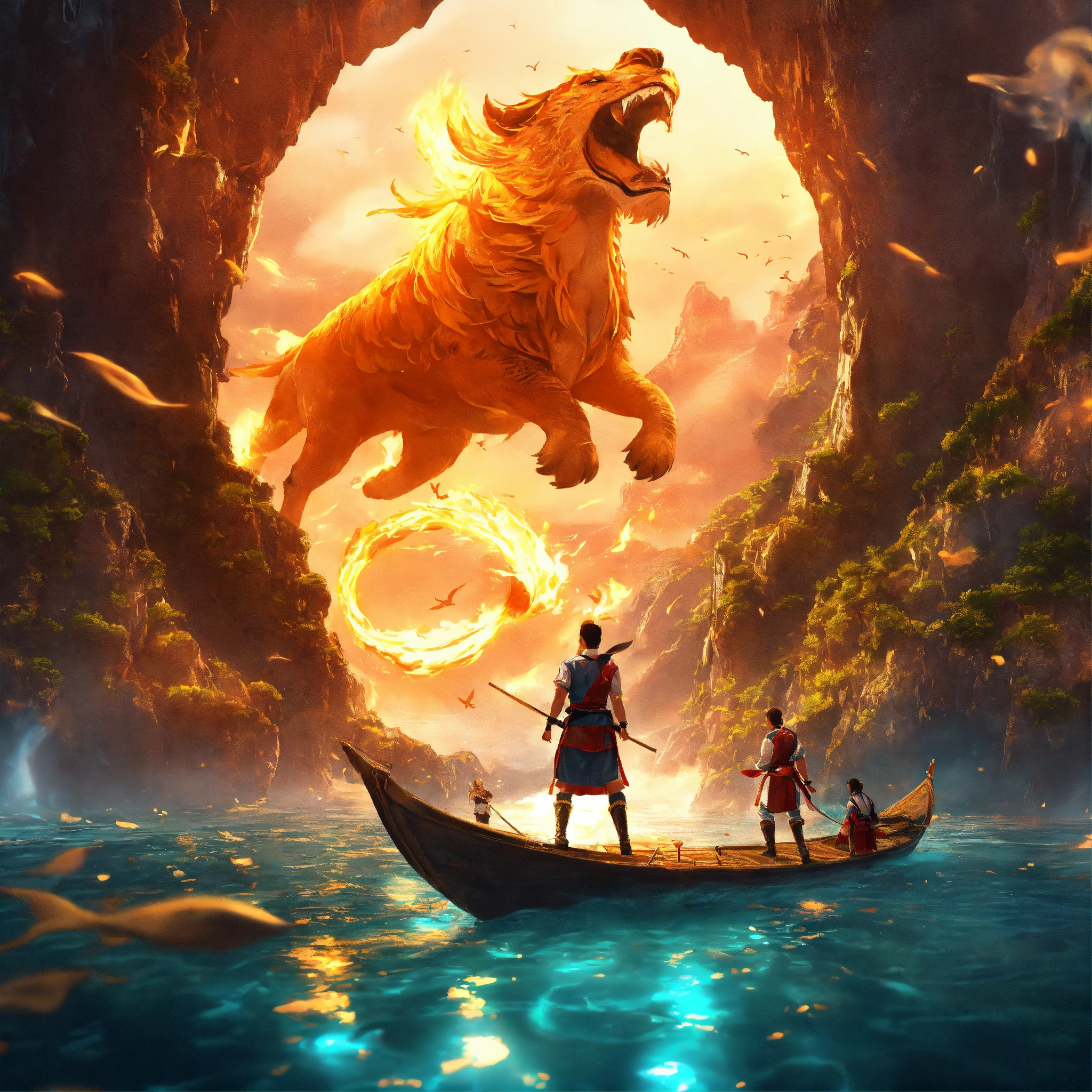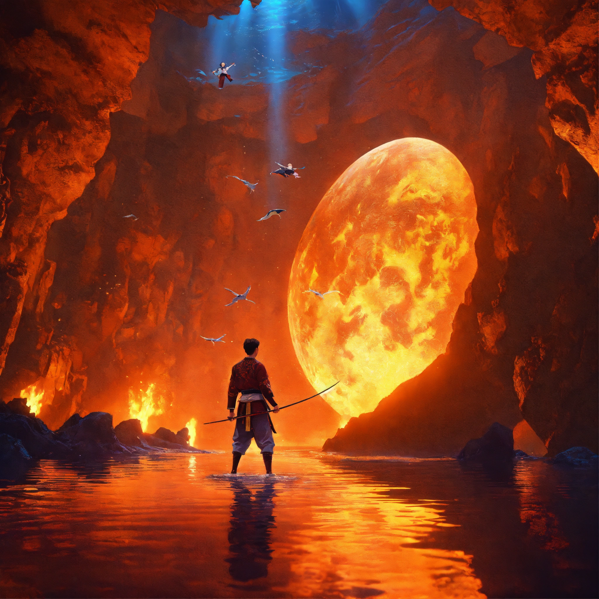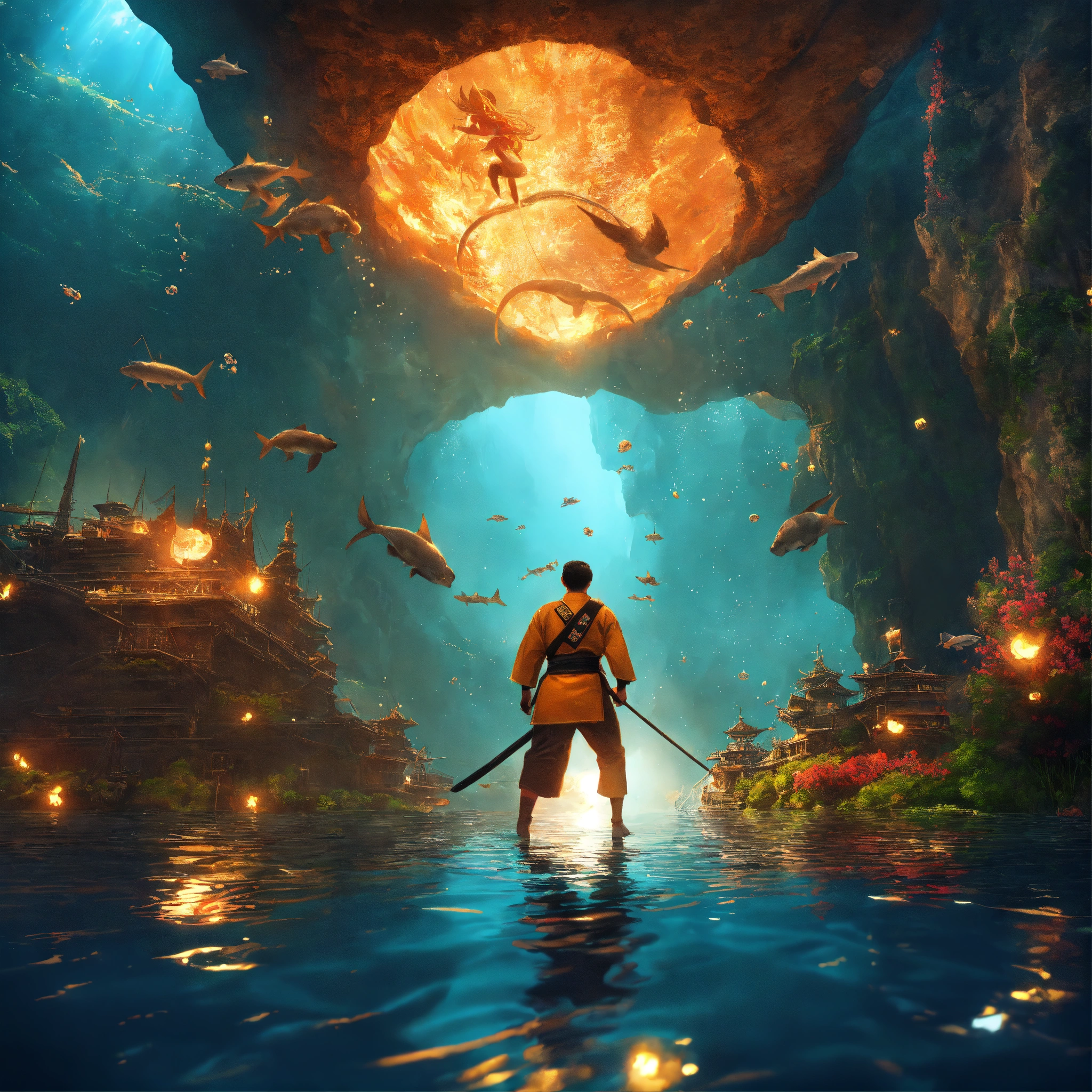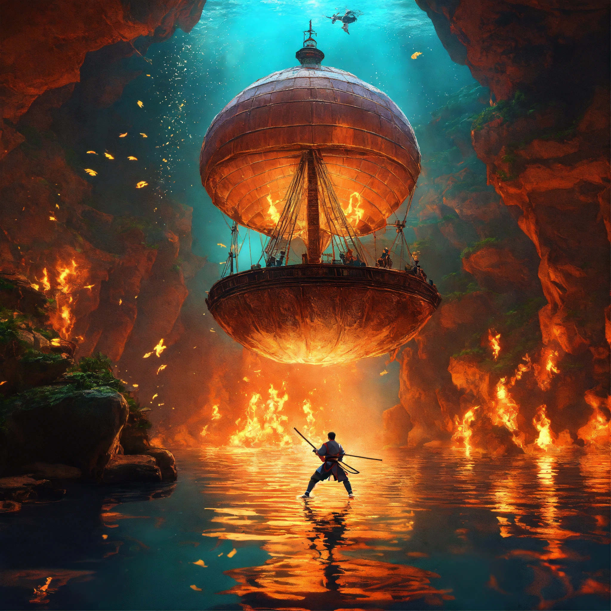 Dream-like animation, martial artists in sight, ready for war, 2moons, ships sailing with martial artists jumping in an underwater cavern., 35888, animal water fire 🔥, mirror the image
