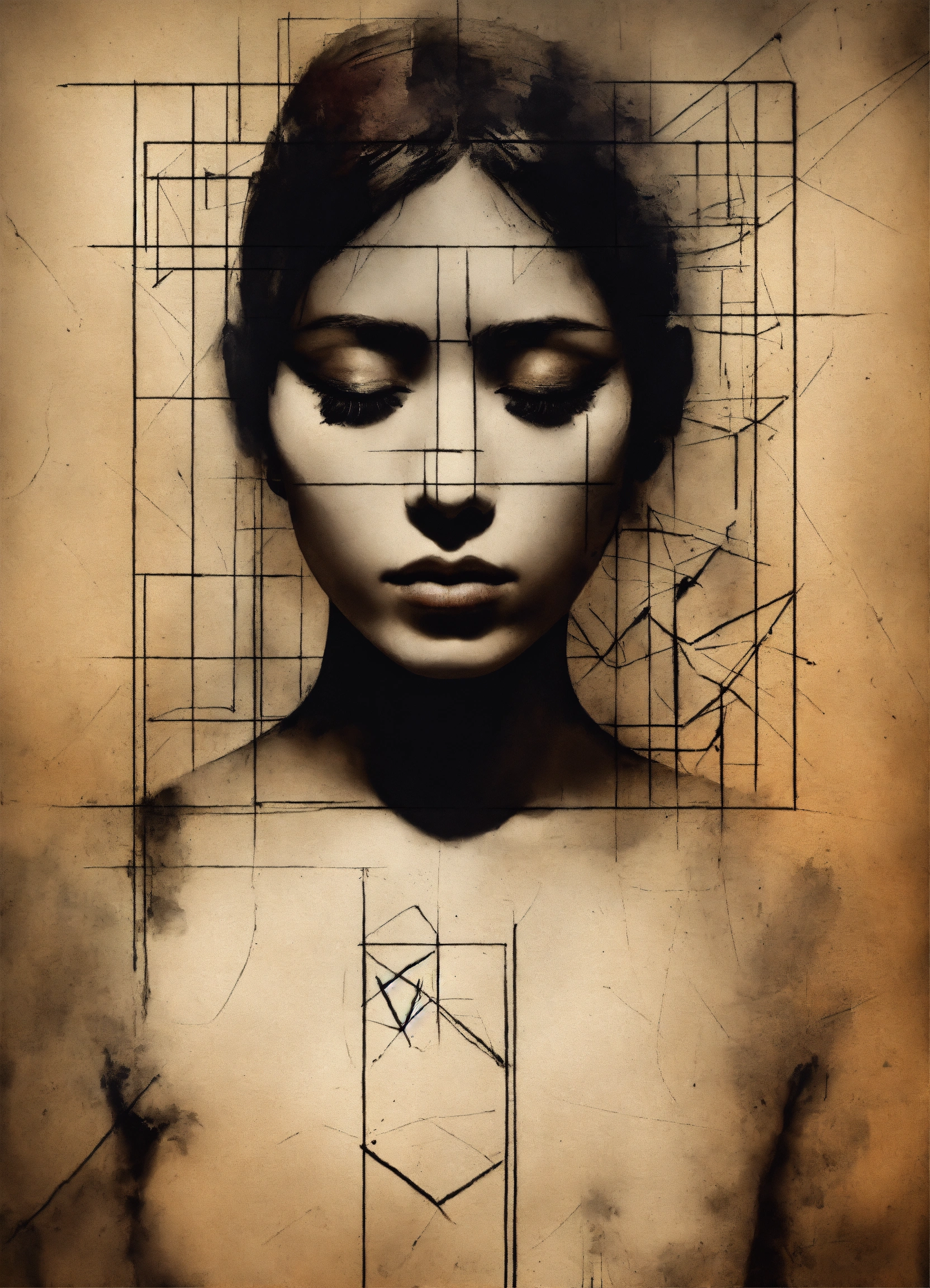 Create a poster with the outline of a personification of sadness, painted with a few charcoal smudges. in the background there are three geometric figures overlaps. all on a grunge wall.
