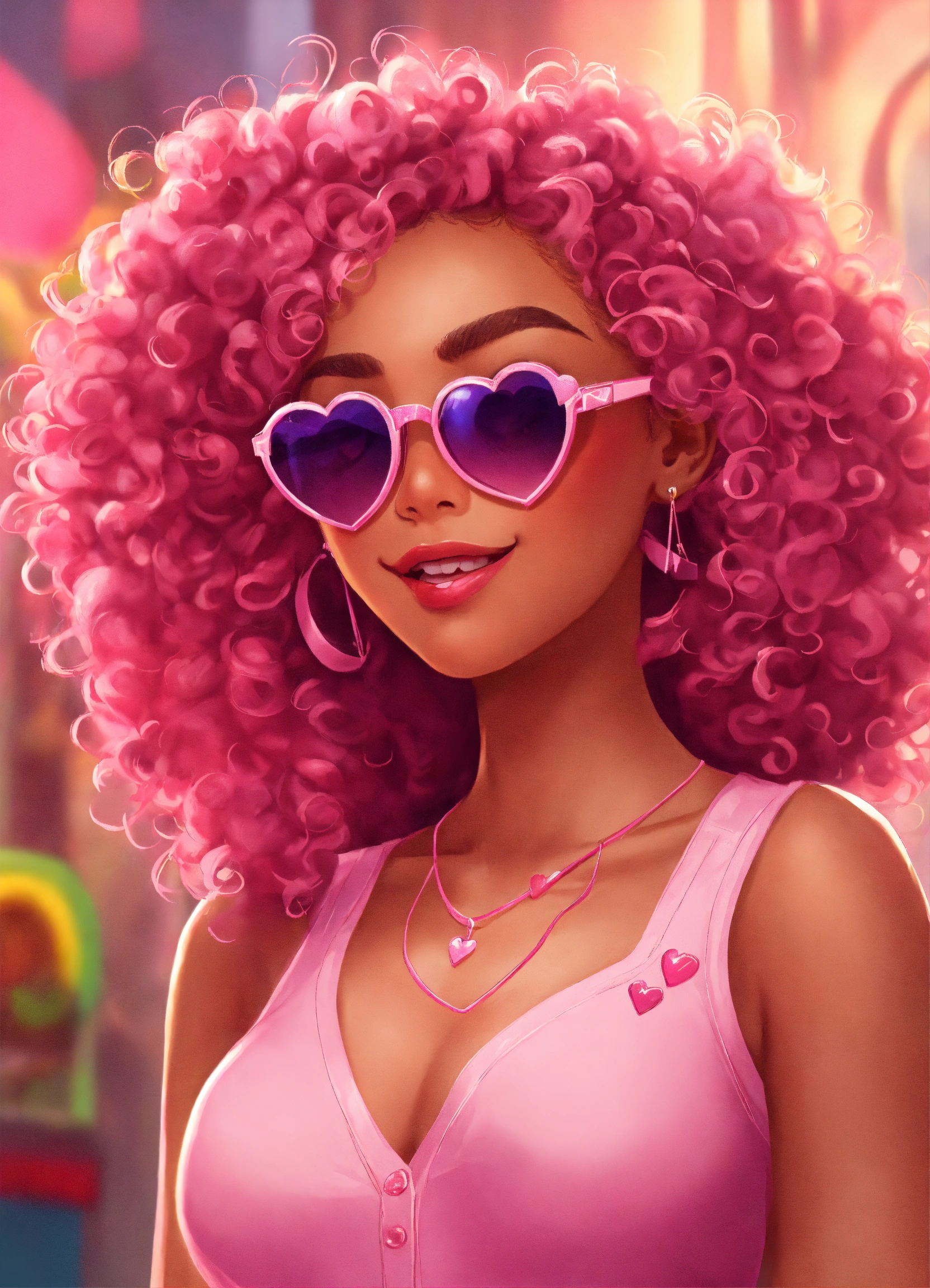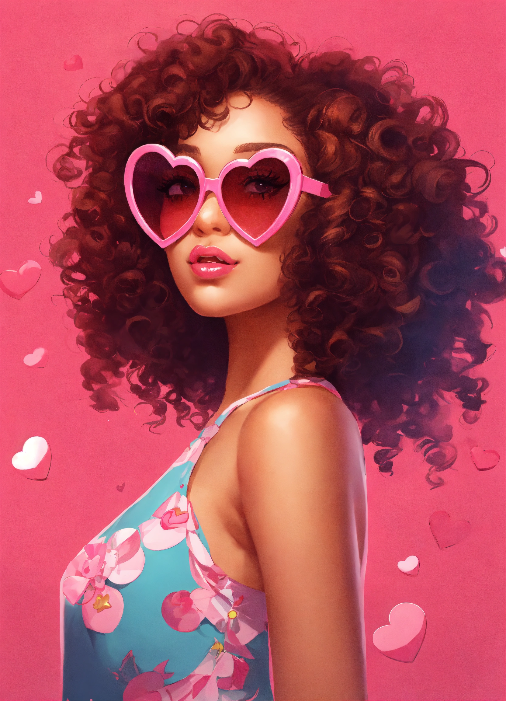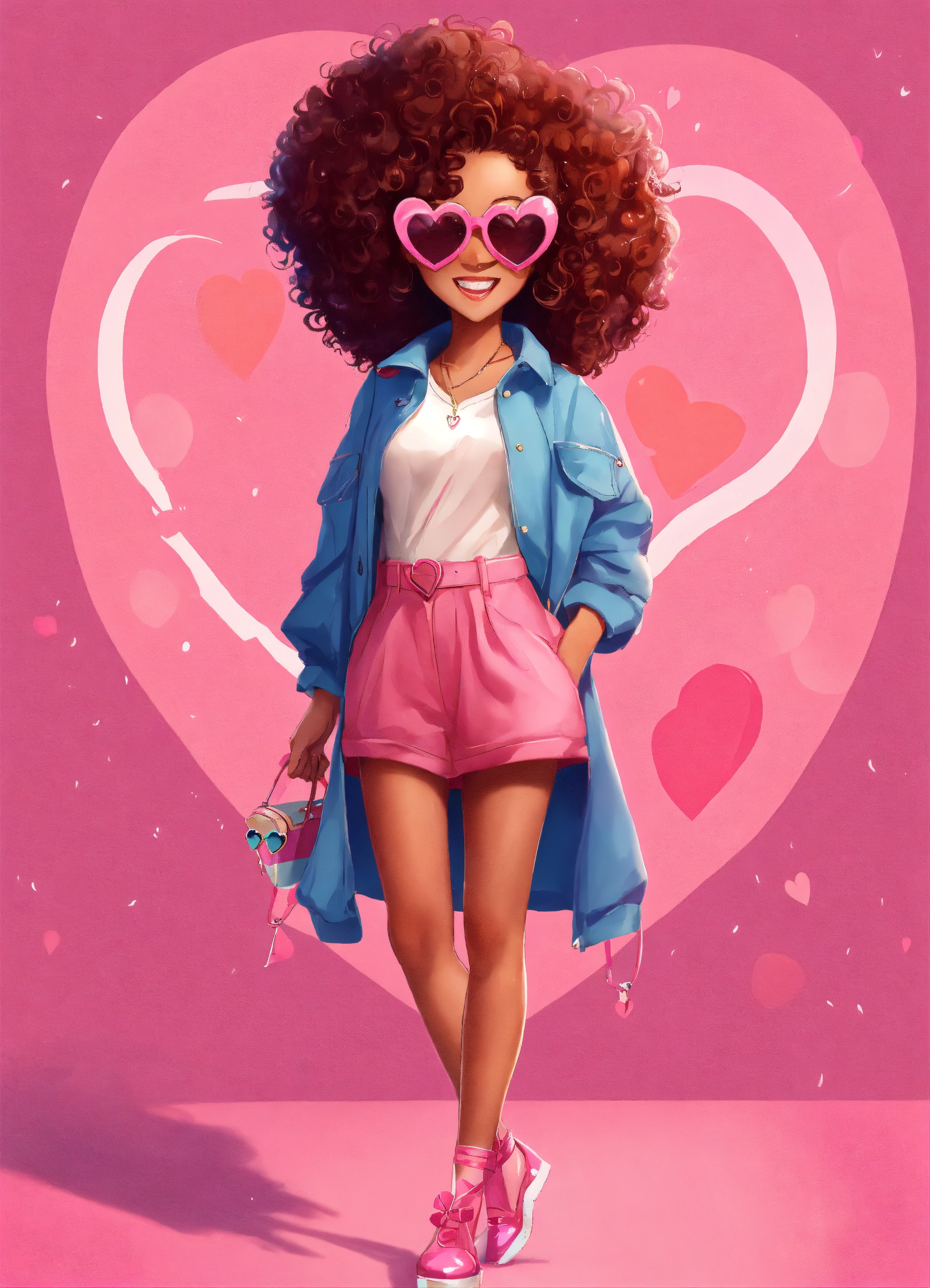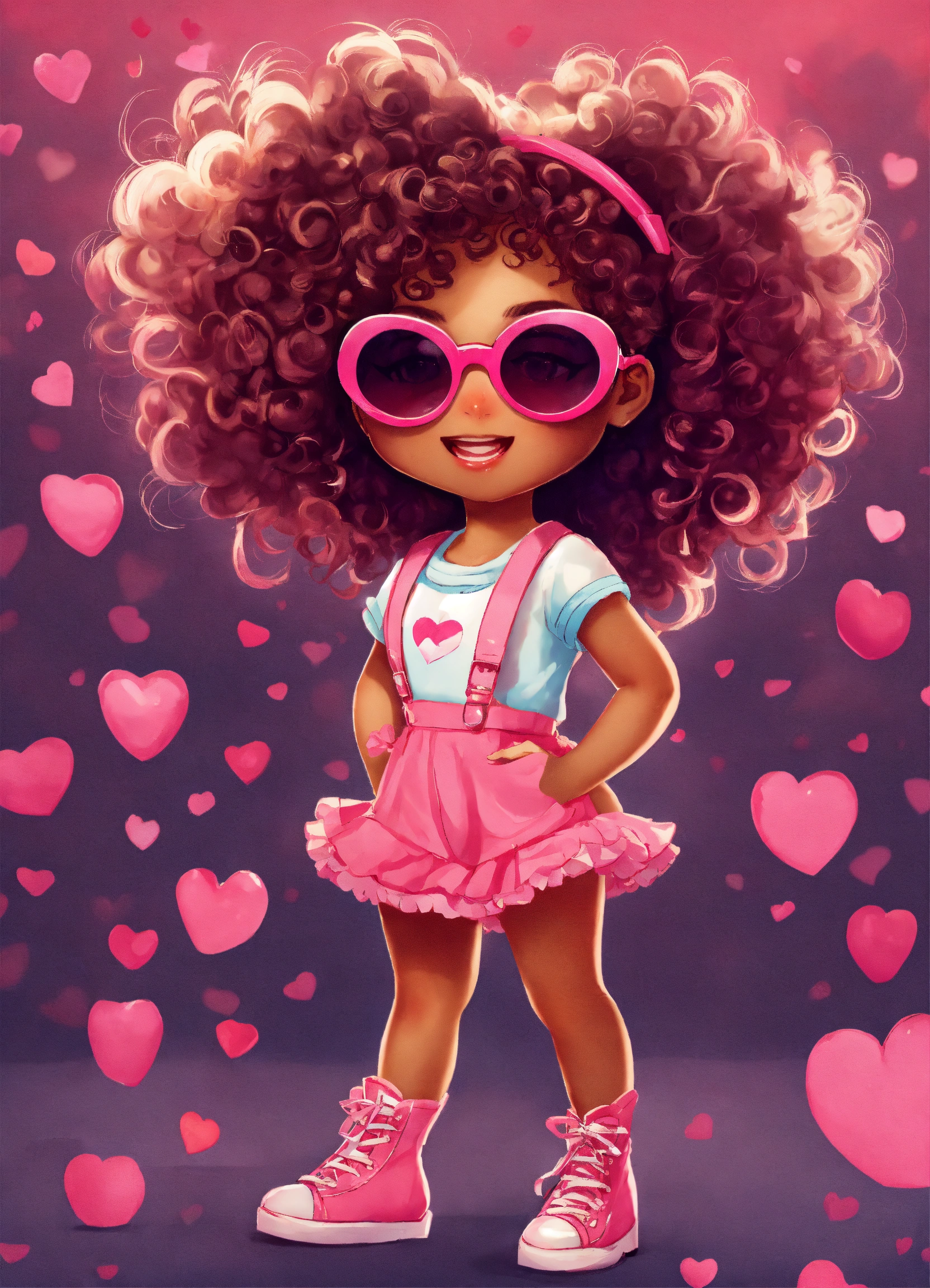 "imagine a cute cartoon character girl with curly hair, wearing heart-shaped sunglasses and pink heels, exuding a fun and confident vibe."