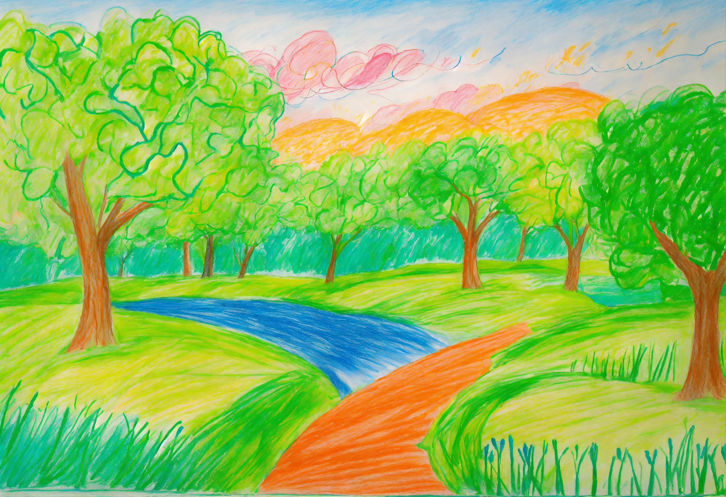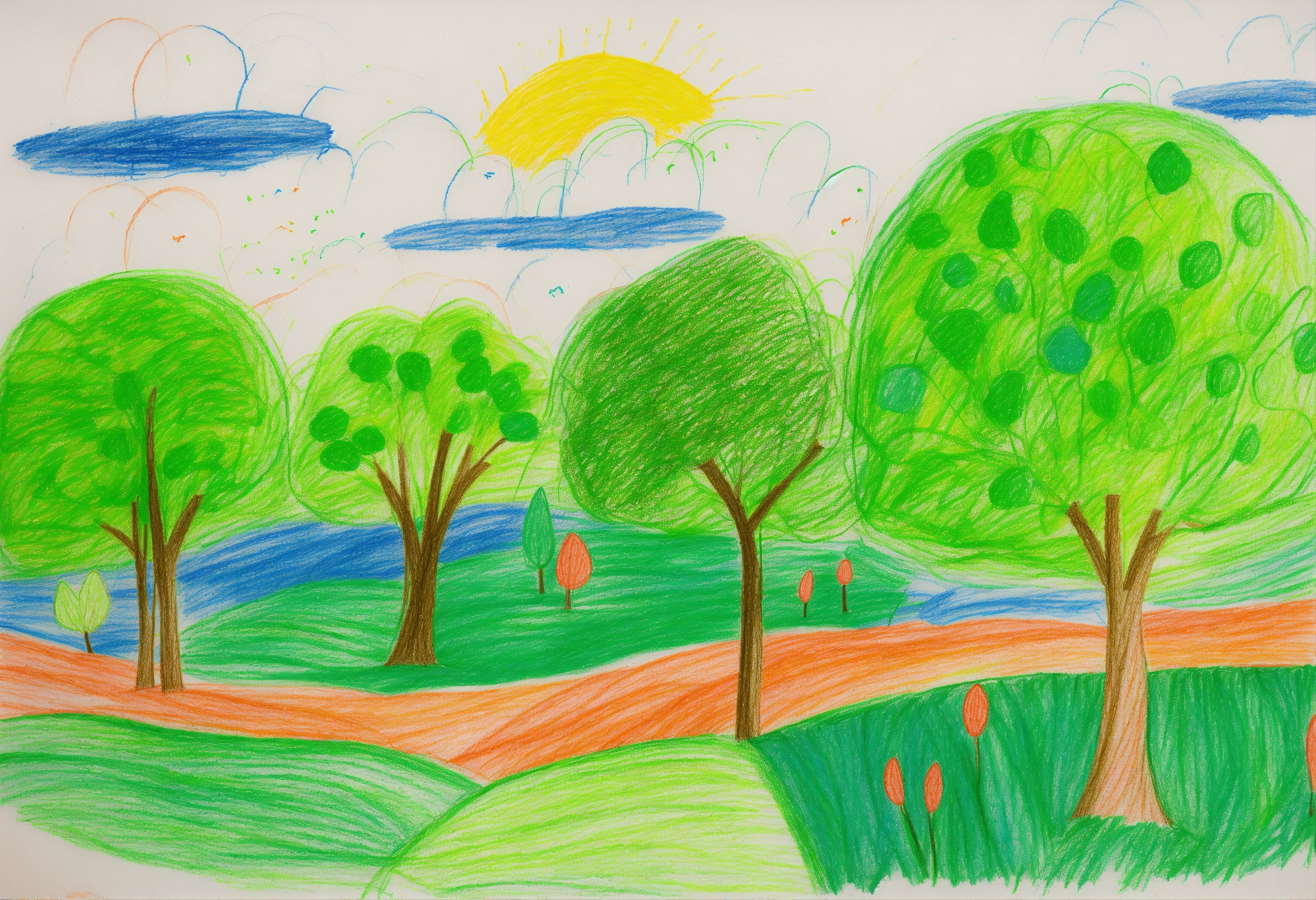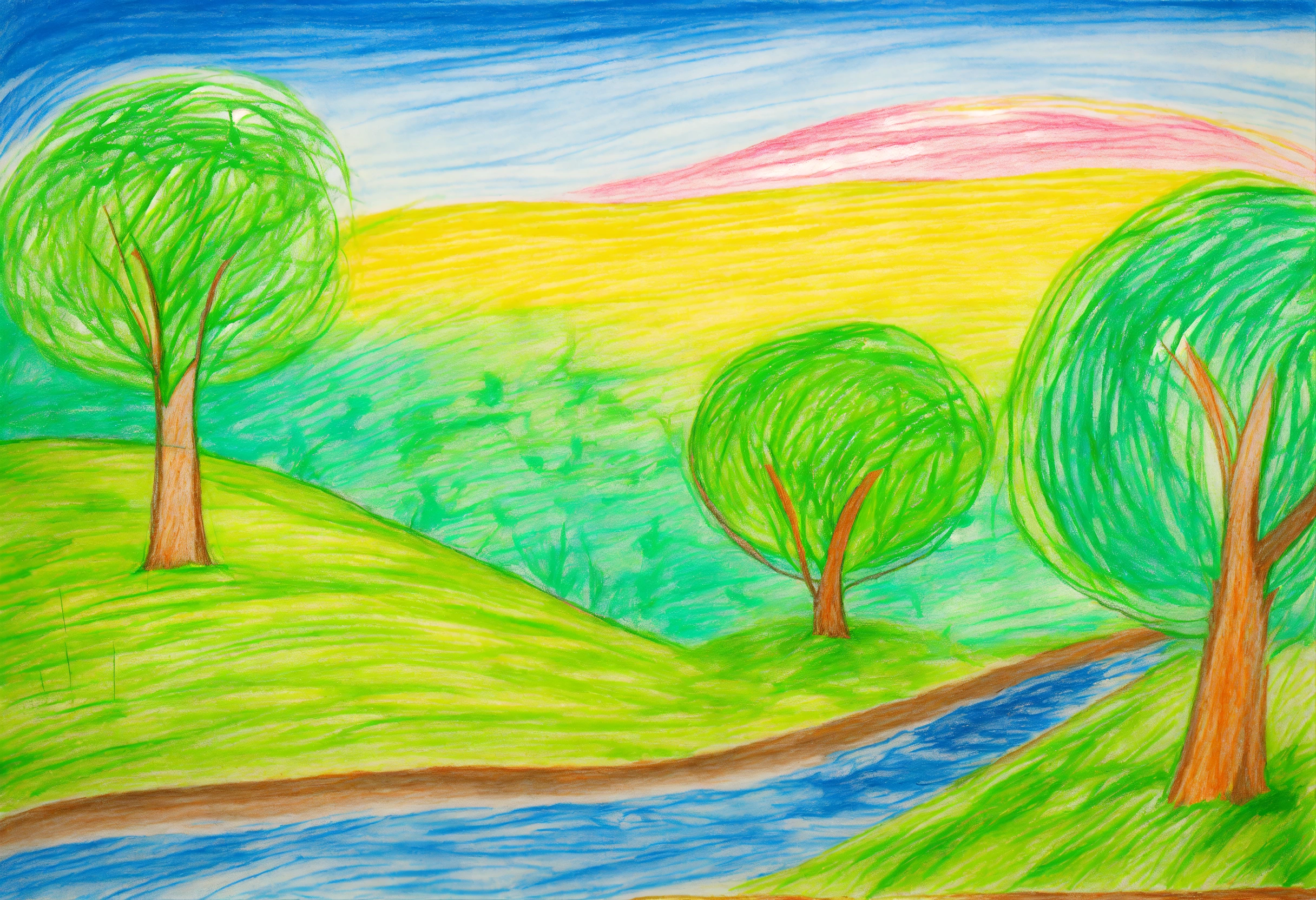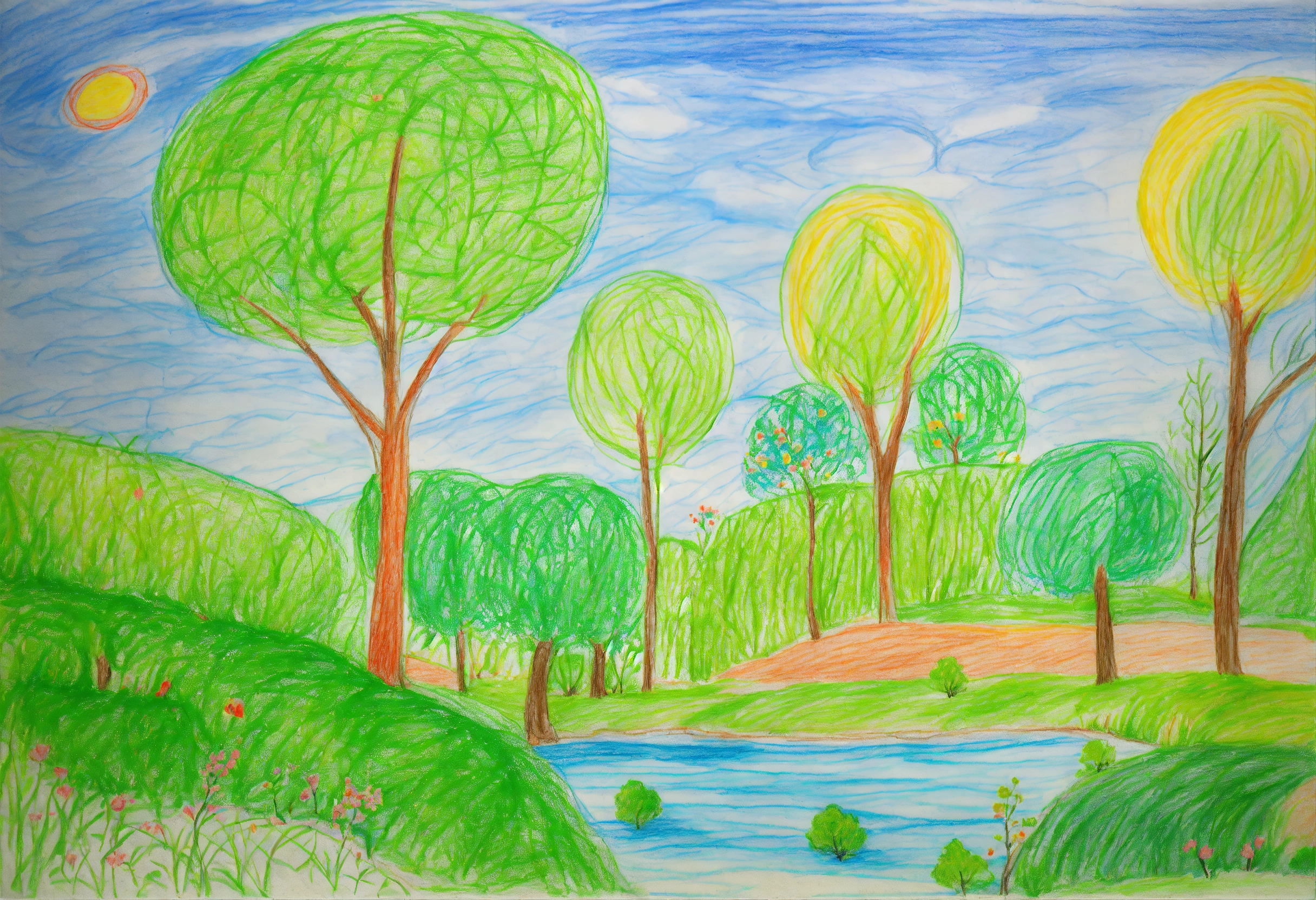 A child-like and naive drawing of a green landscape with trees and water and blue sky scribbled with colored pencils drawn by a 5 years old child