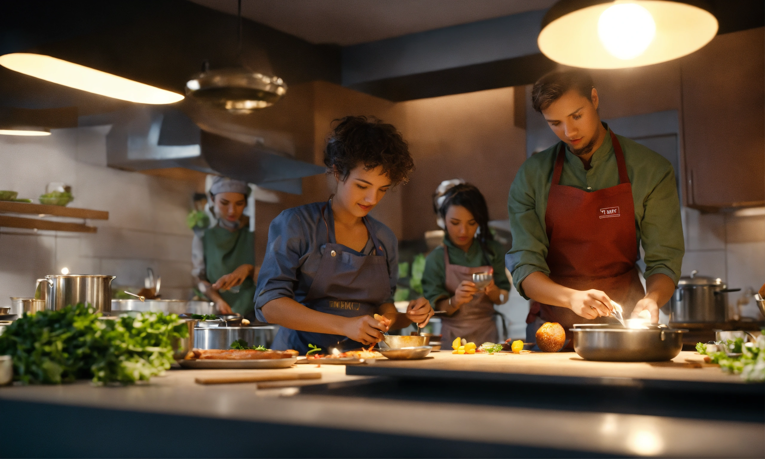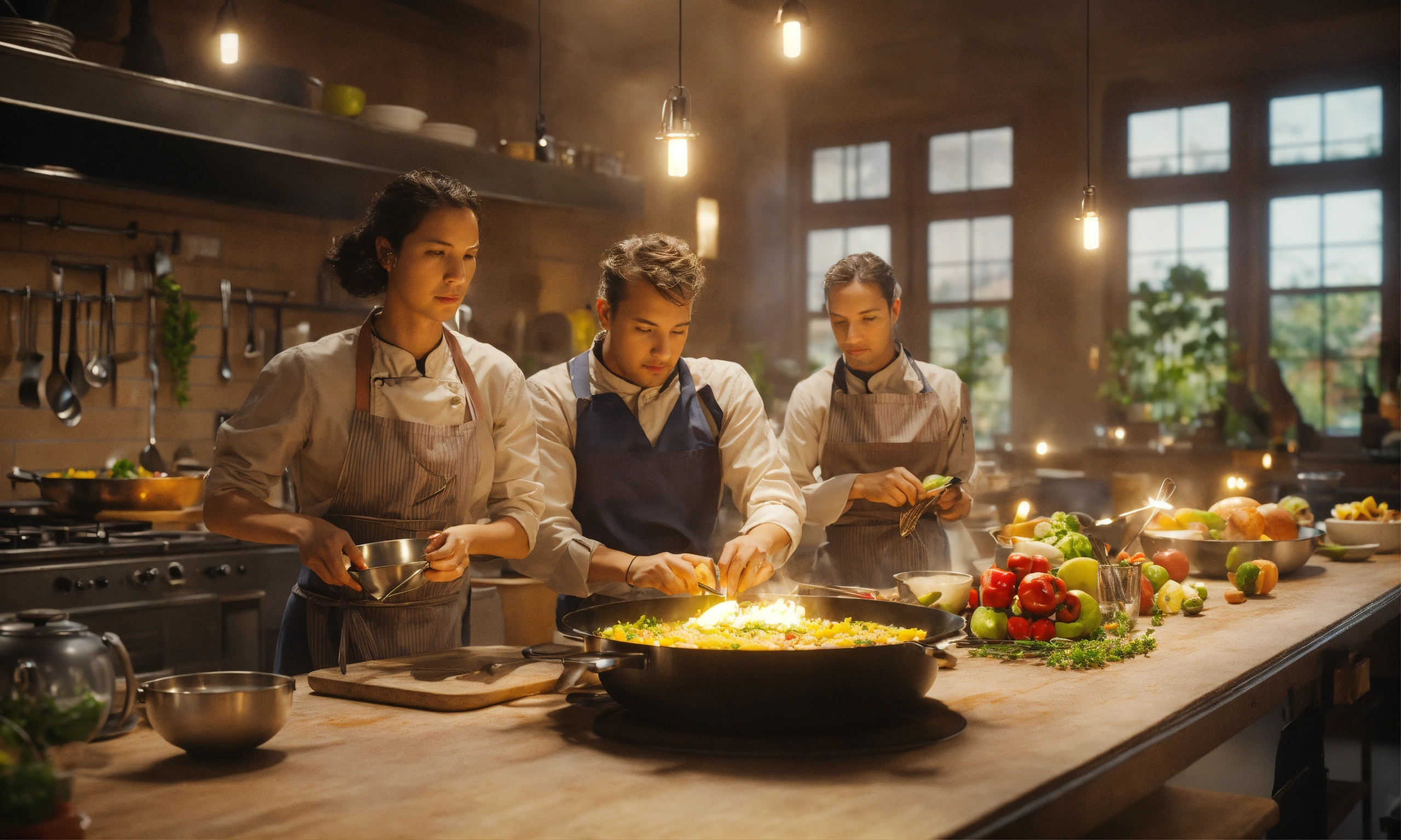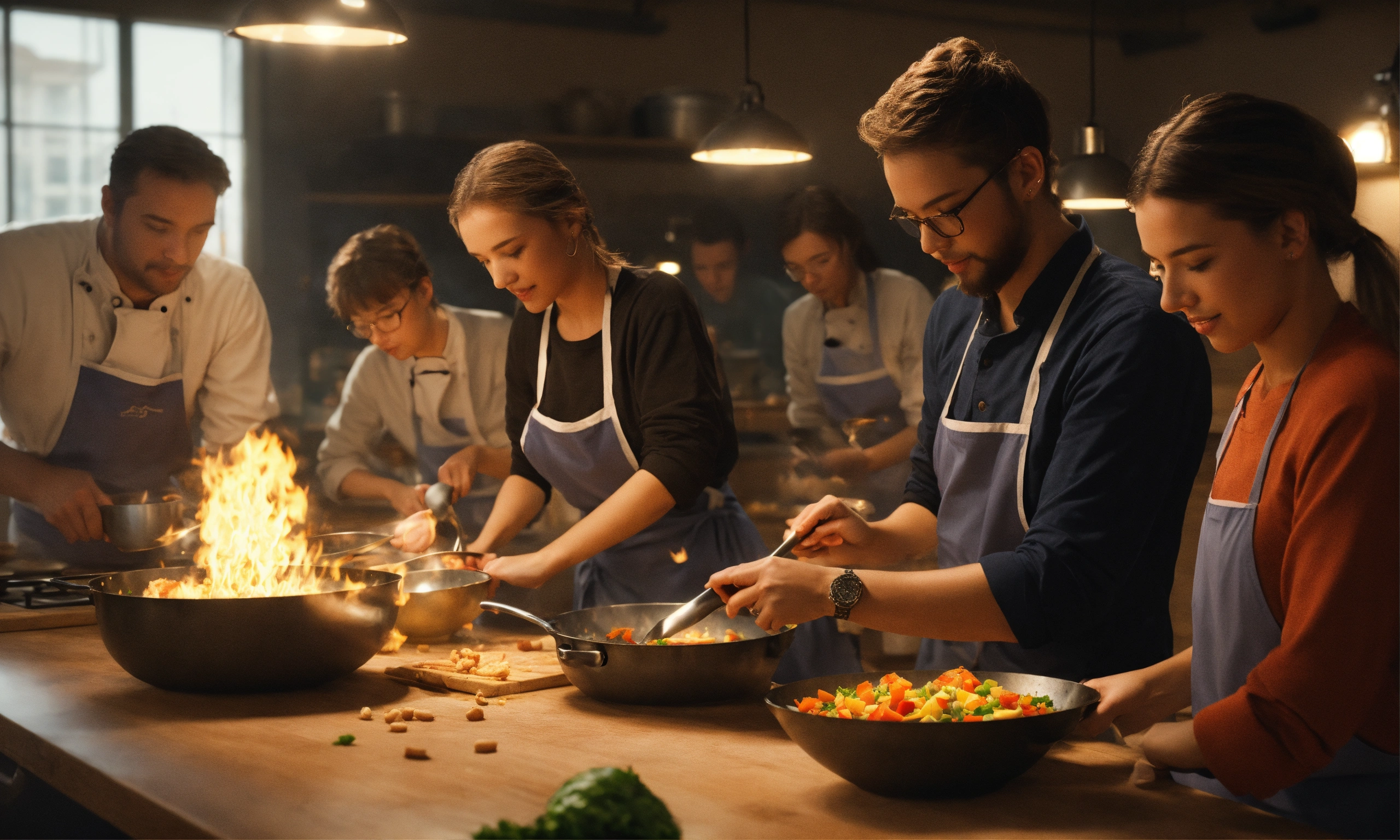 Team of people. teacher's master class for a group of people on cooking. octane render, trending on artstation, highly detailed, lighting, professional, realistic, sharp focus, 4k, 8k, high resolution, candid, personal, –testp, bright lighting, ultra-detailed, bright lighting, photo, high quality photo, cinematic shot, volumetric light, imax