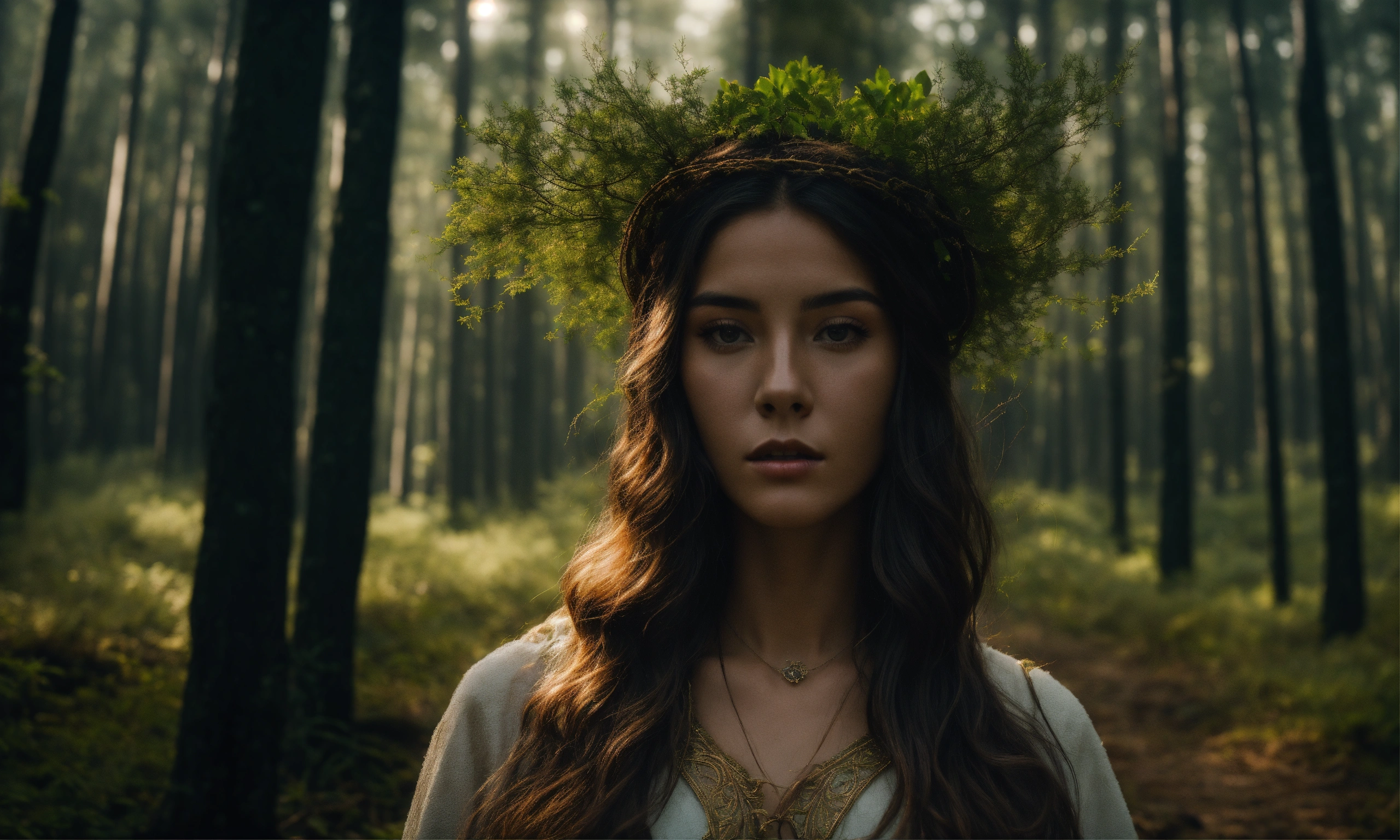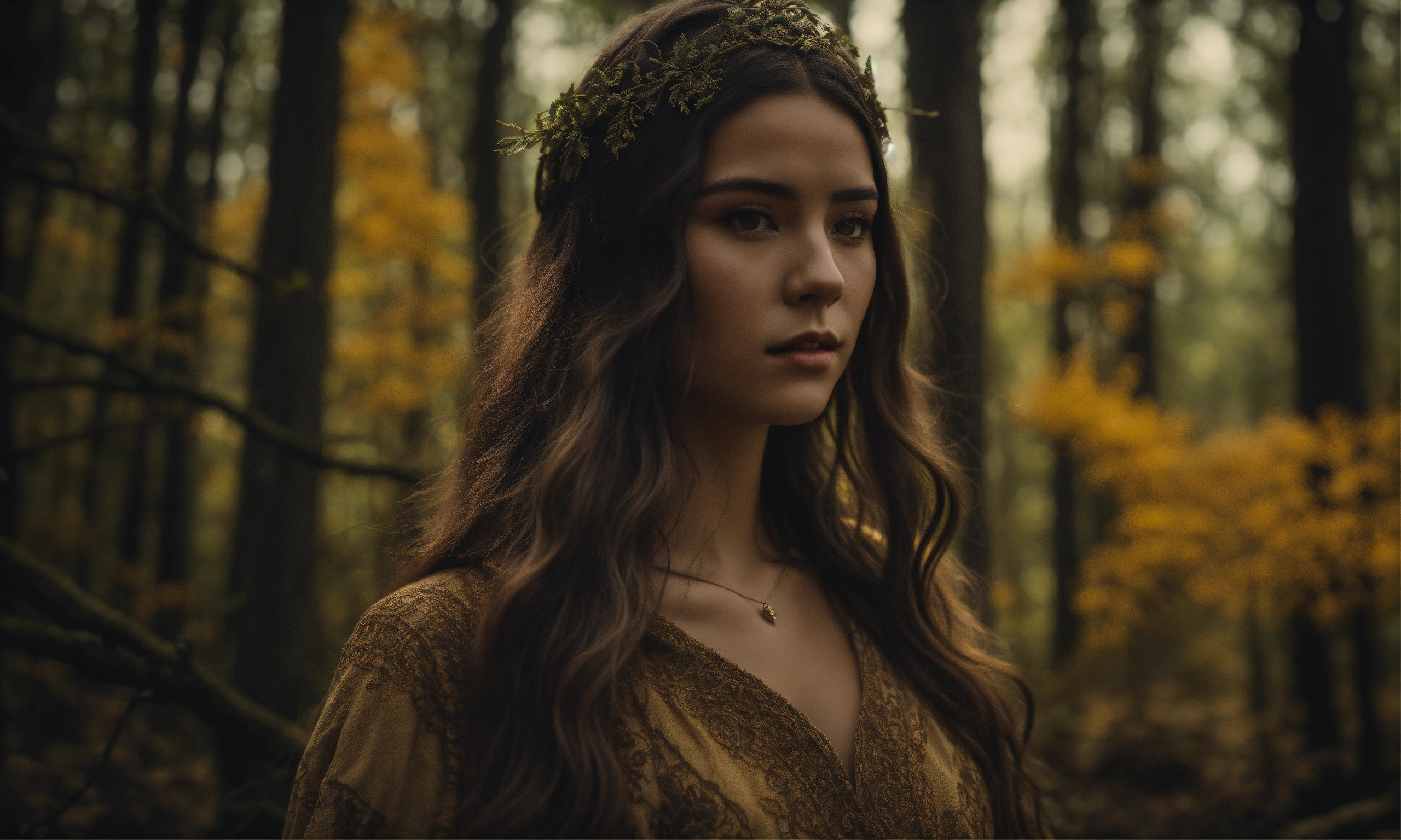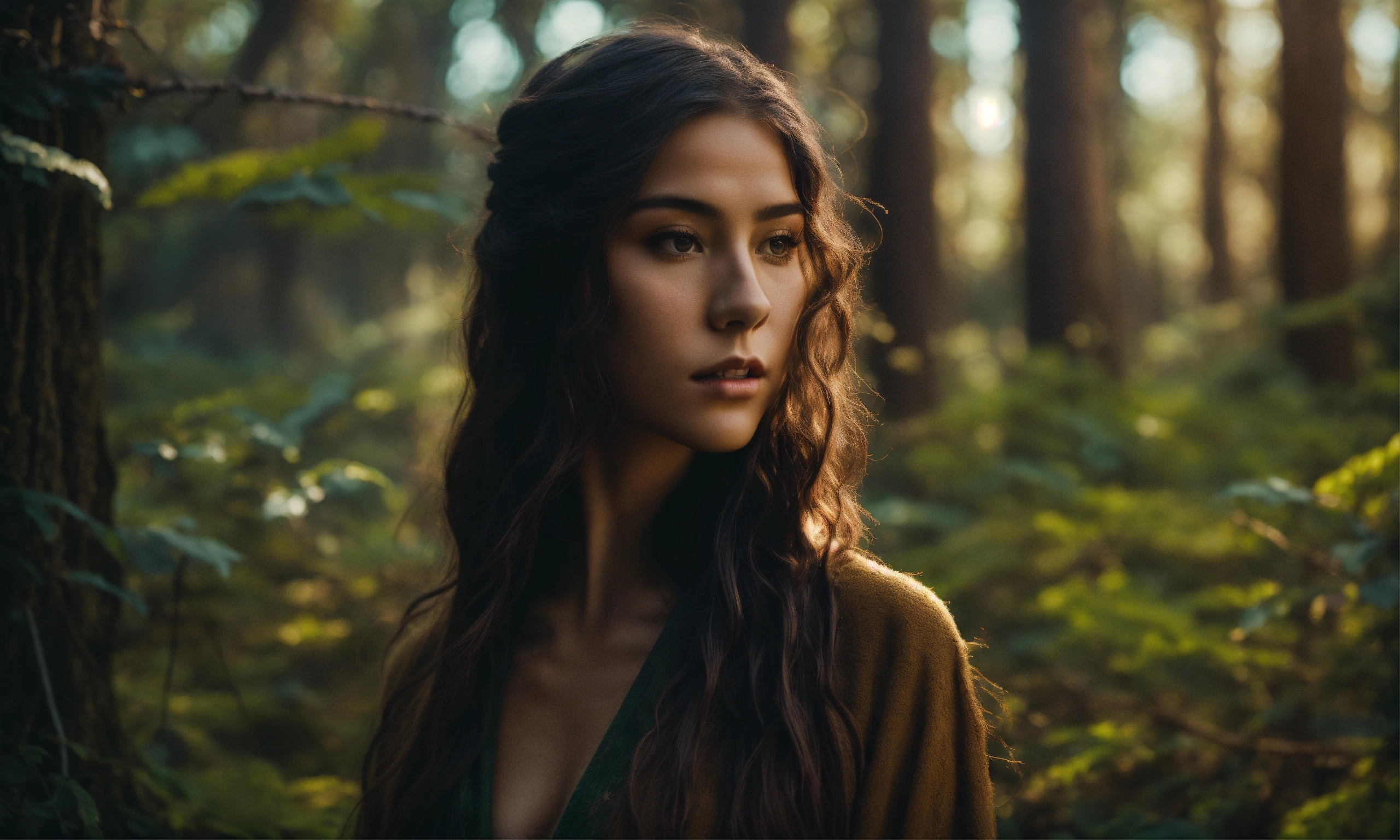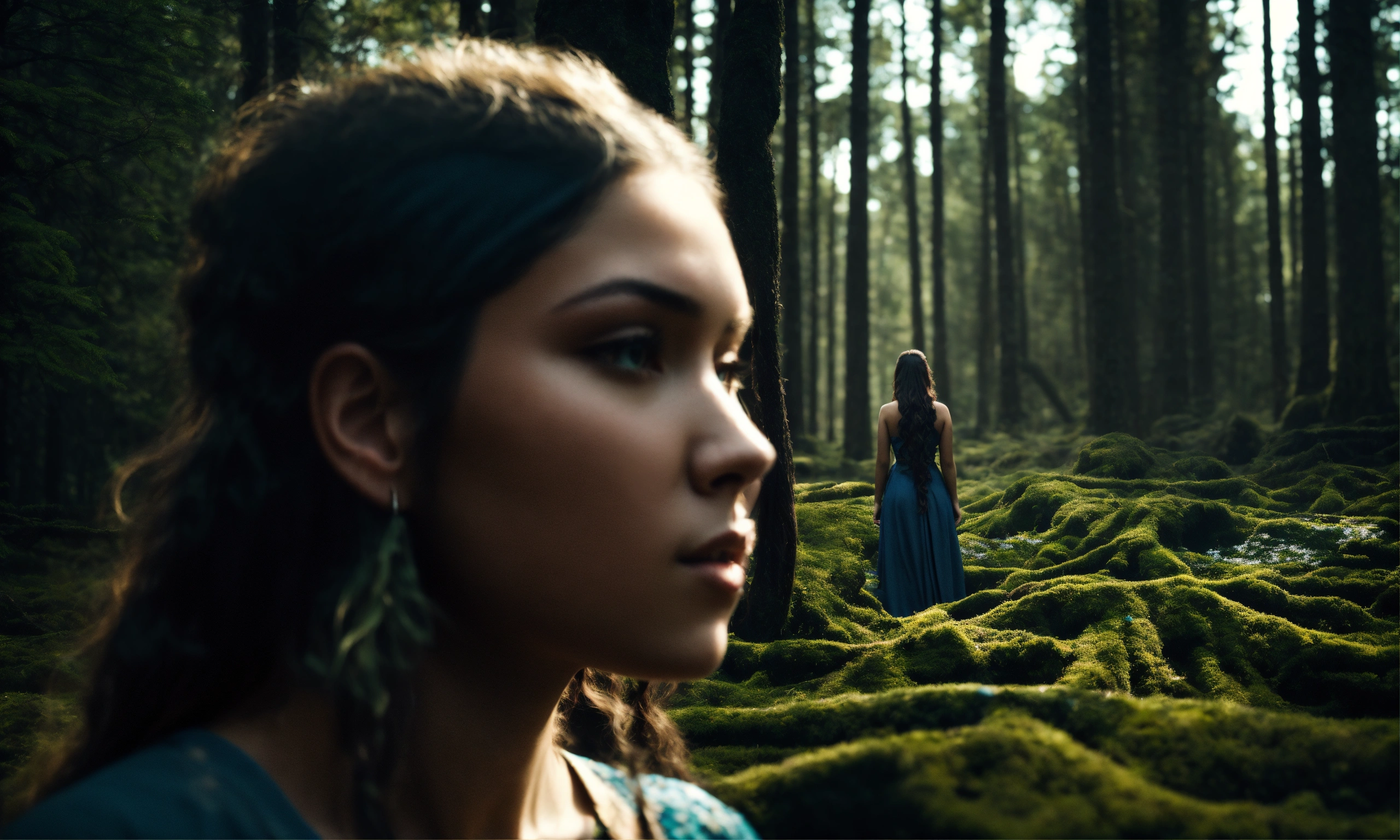 Beautiful revealed metis girl with long wavy hair with the face of vaea garrido in forest with minimalist far perspective intricate, sharp focus, fantasy, cinematic lighting, other worldy, surreal 8k photo, dark moody aesthetic