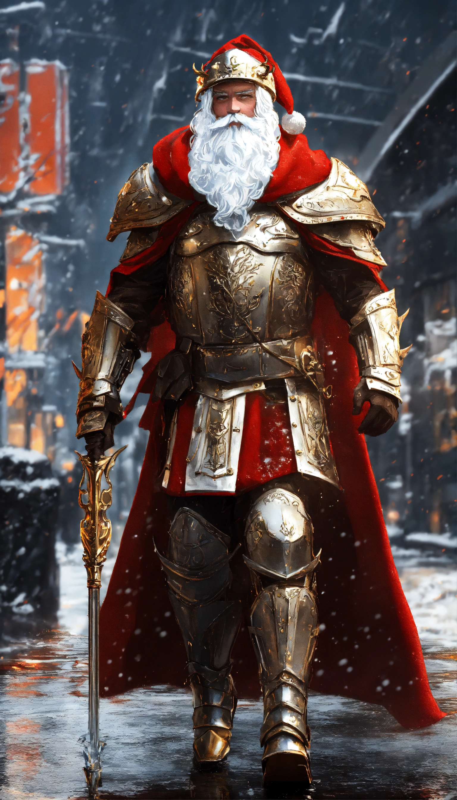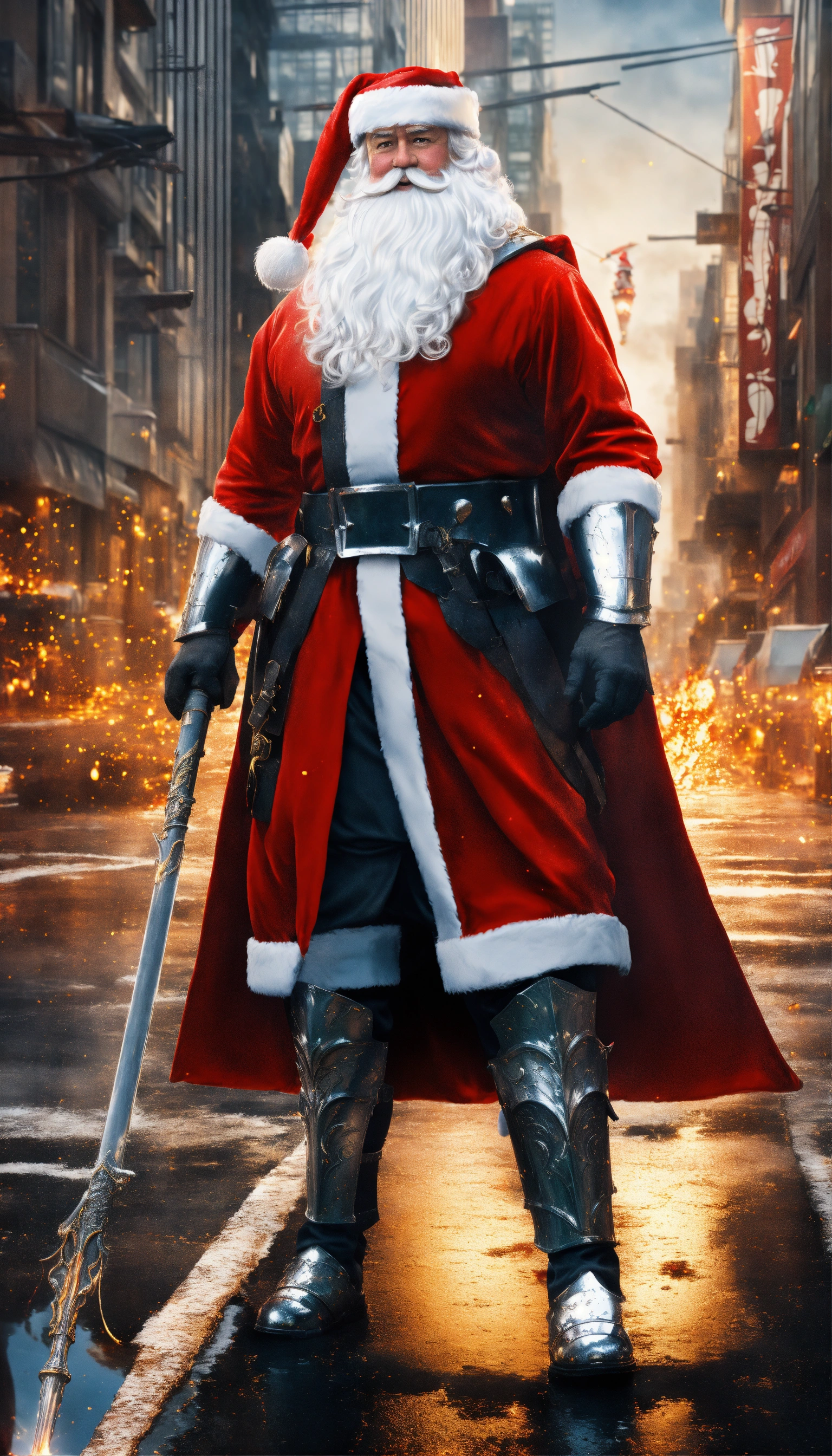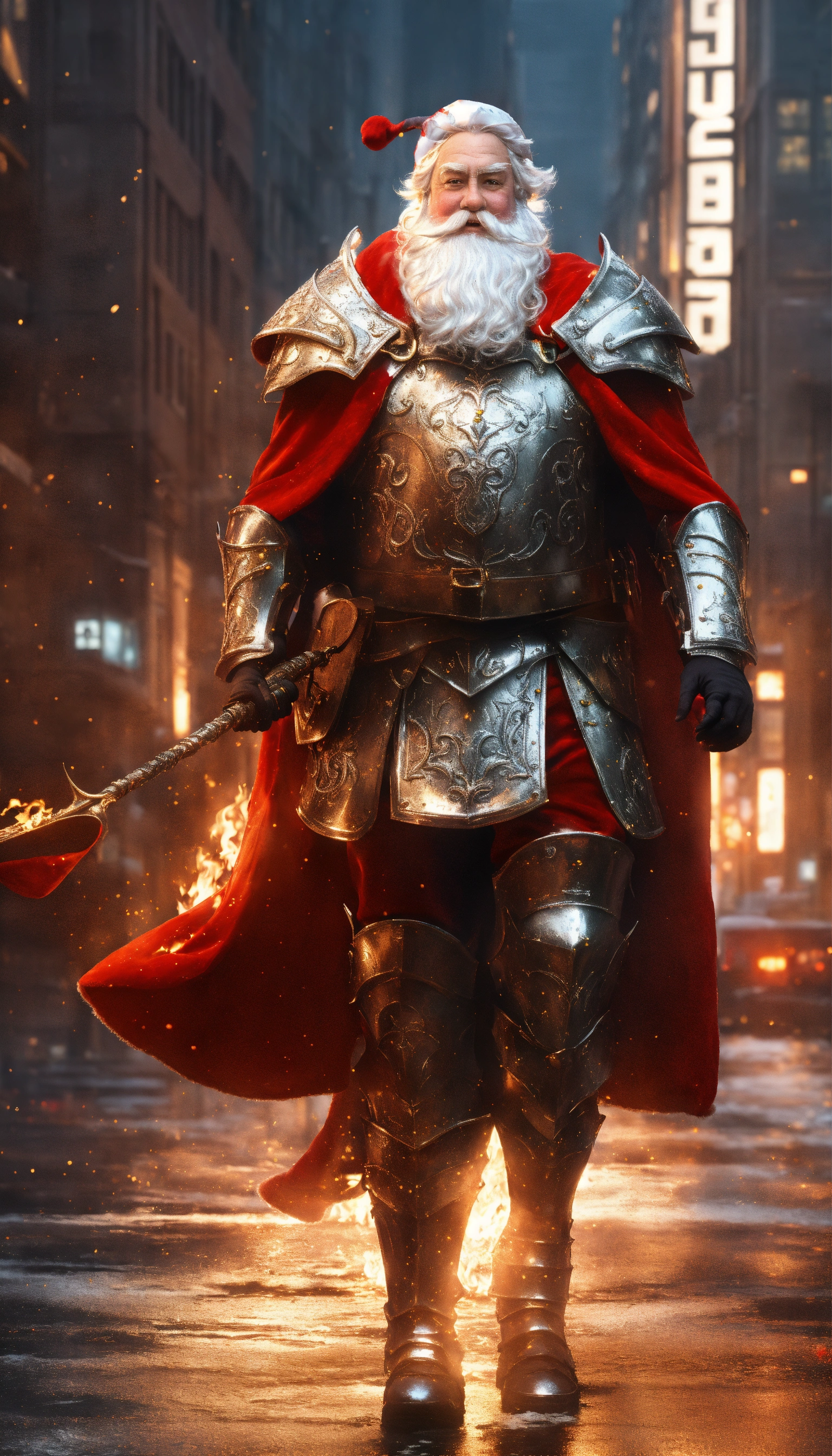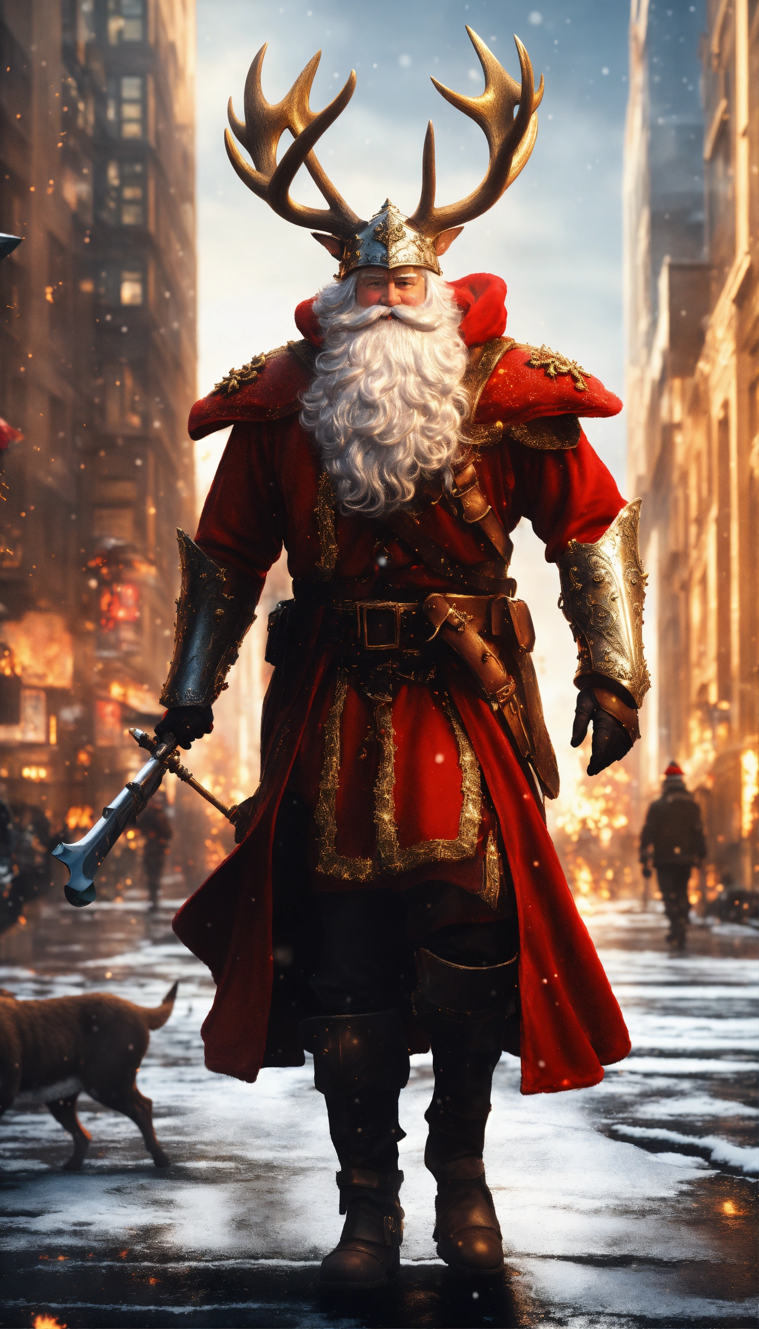 ((santa claus in armor walks down the street of a modern city)), full body, detailed fearless stern face, natural skin, red coat, red santa claus hat with metal base, hyperdetailed eyes, long staff, deer antlers, line art, black fire background, ultra detailed artistic, super dynamic, water splash, fire and ice, splatter, sparks, black ink, liquid silver melting, dreamy, glowing, glamour, glimmer, shadows, brush strokes, smooth, ultra high definition, 8k, unreal engine 5, ultra sharp focus, intricate artwork masterpiece, ominous, golden ratio, highly detailed, vibrant, production cinematic character render, ultra high quality model, snowy burning city