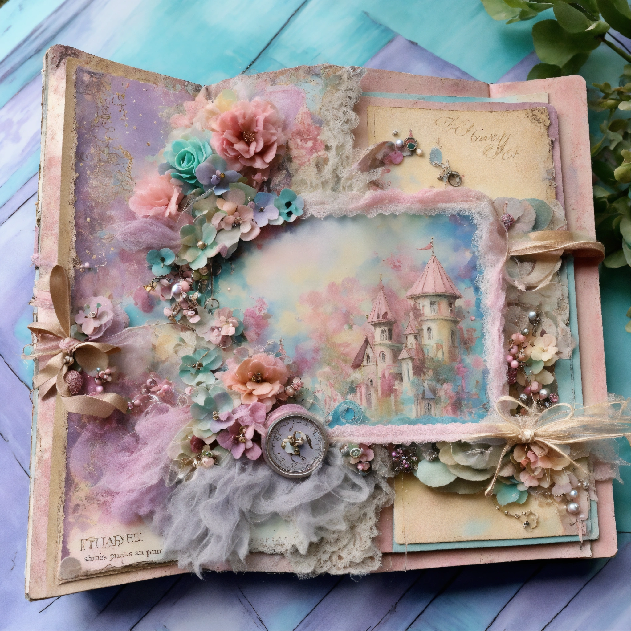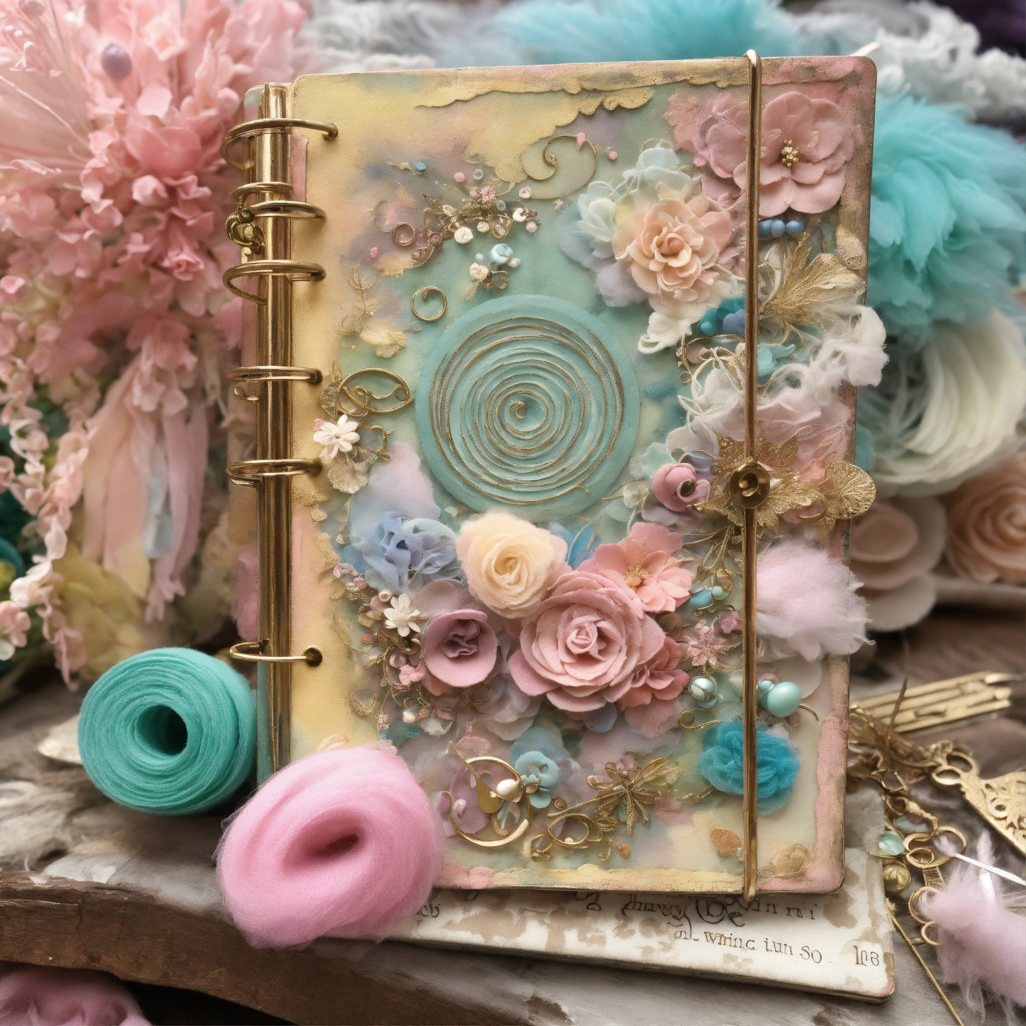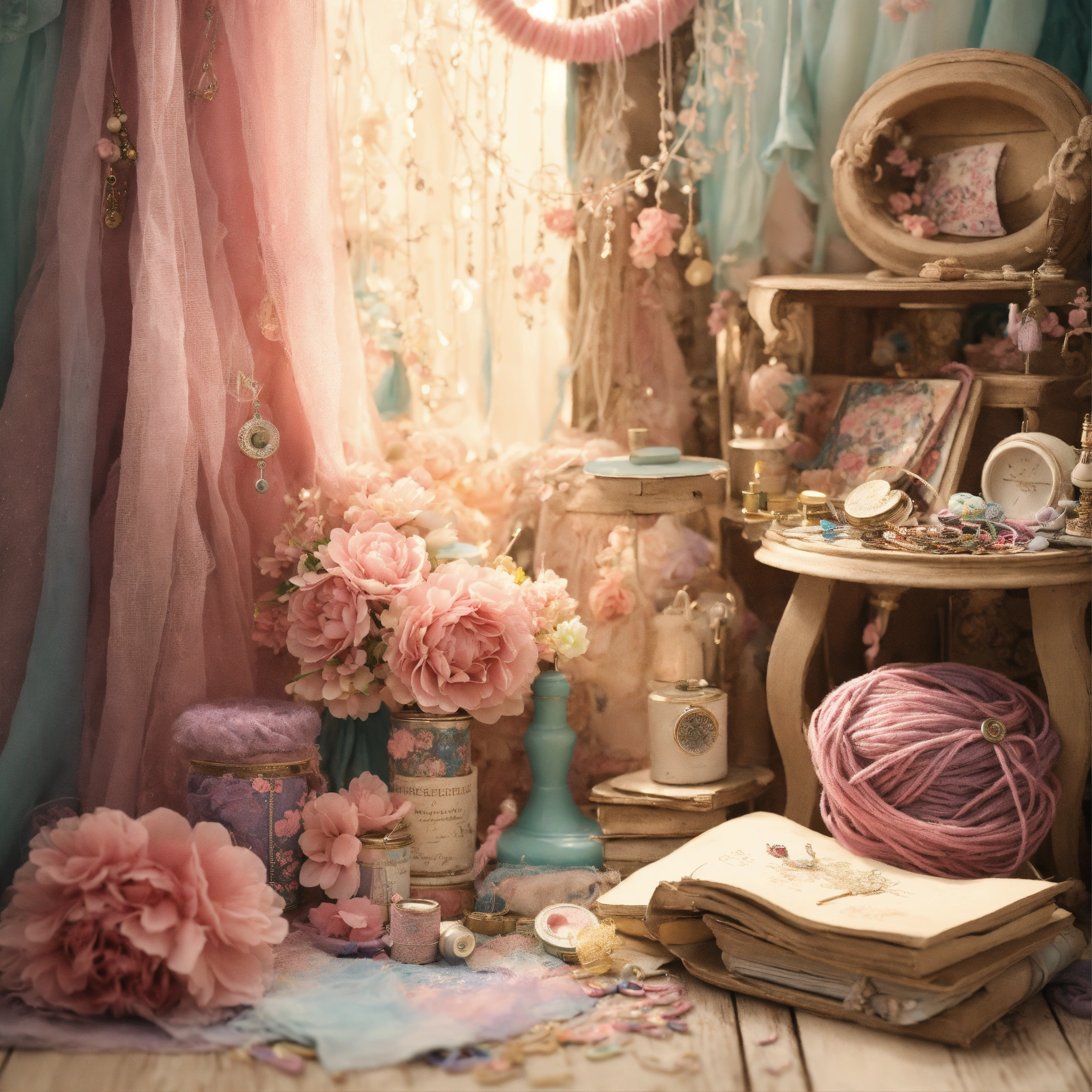 Shabby chic dreamy mist pastel junk journals sewing kit accessories swirling magical fairytale abstract art style