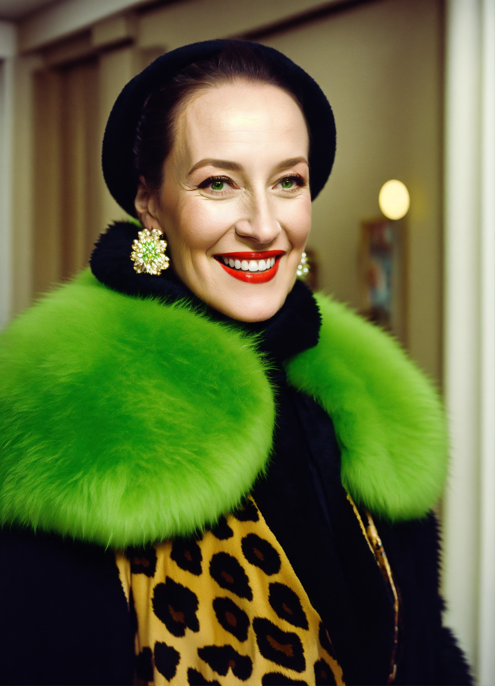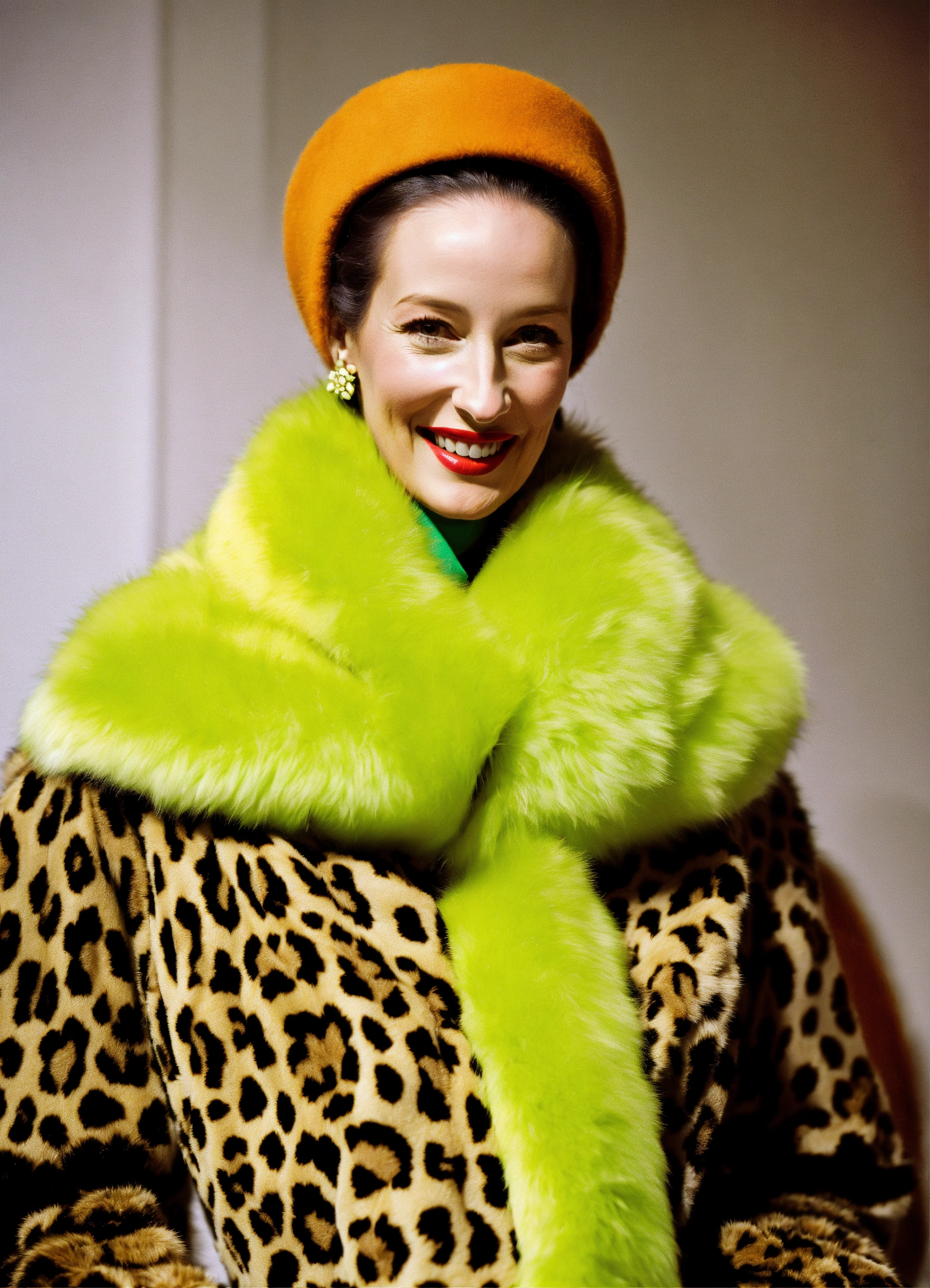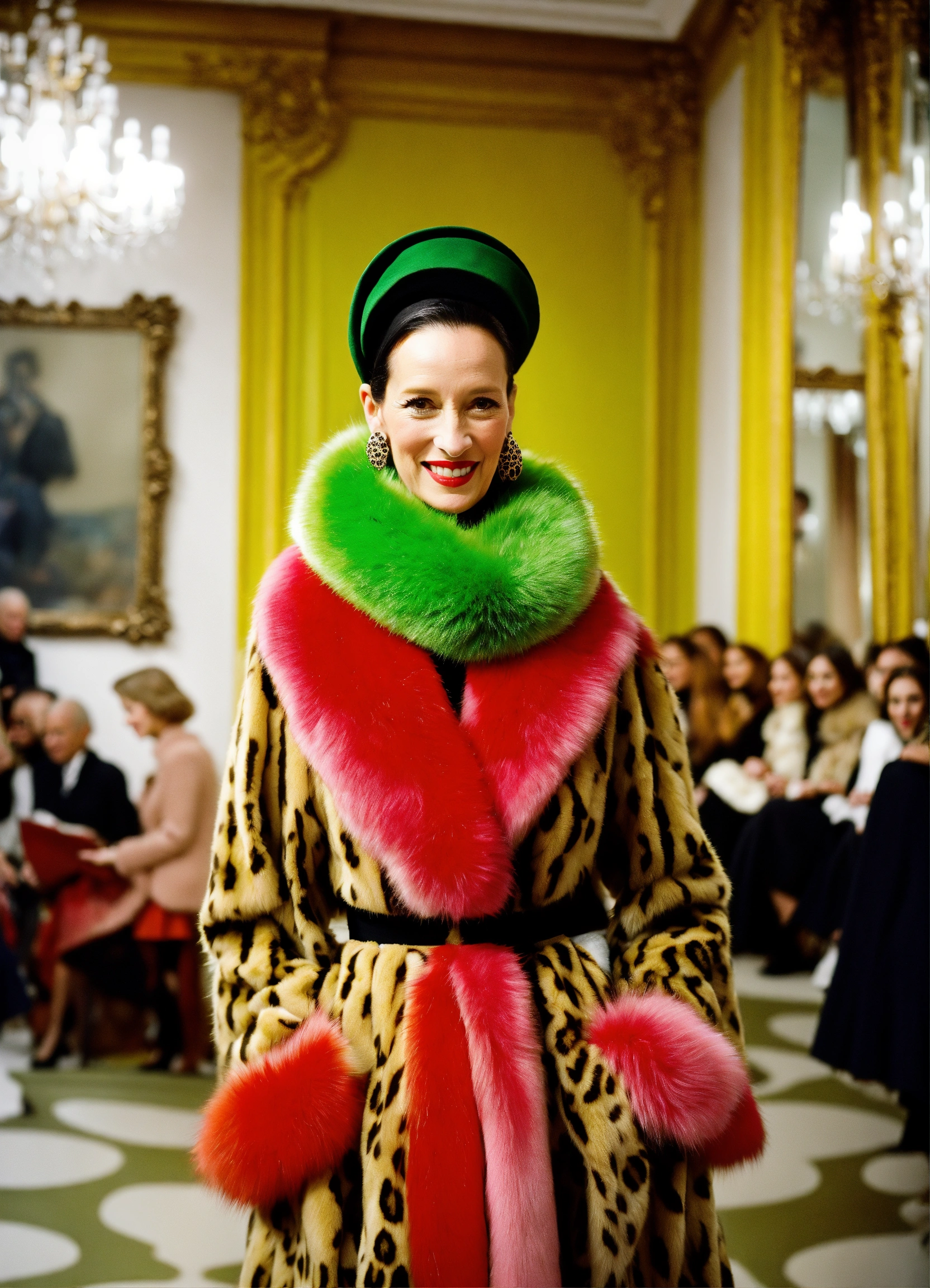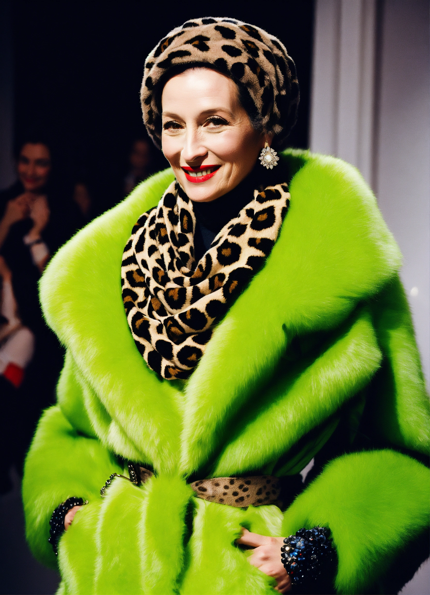 Photo of diana vreeland of grey gardens scarf covering scalp smiling as a runway model catwalking, wearing her scarf and her usual clothing style either skirt and brooch or fur coat on runway in a parisian salon, boutique, montaigne avenue, bright space well, white walls, fluorescent green fur, leopard.