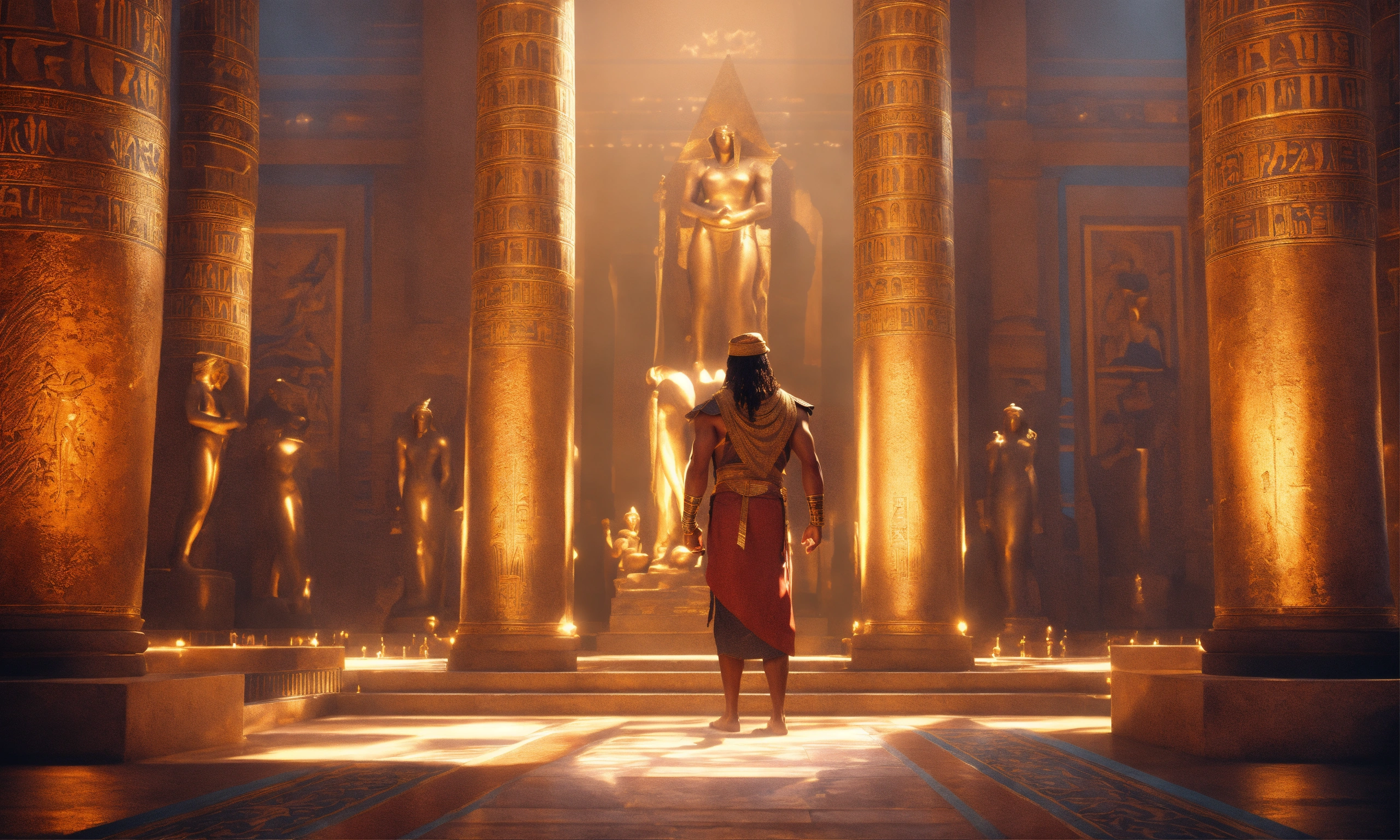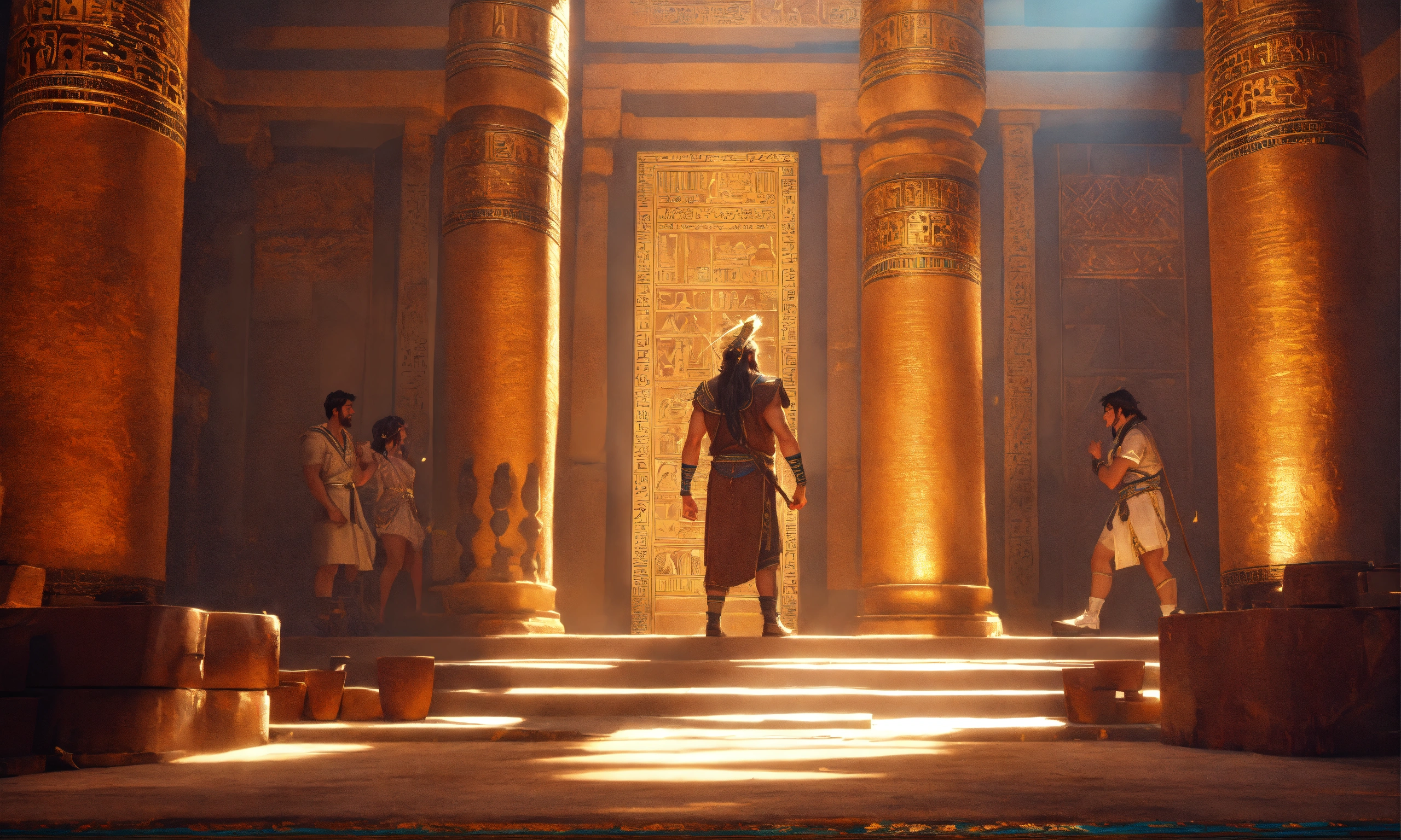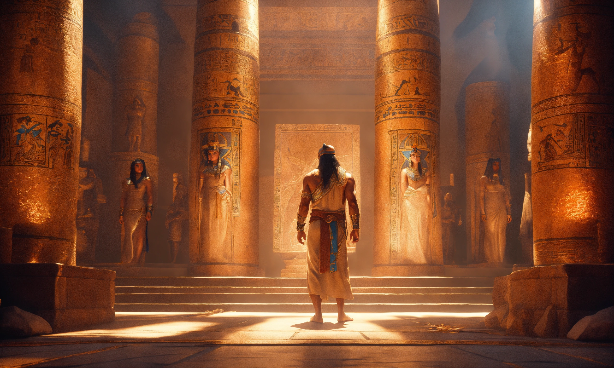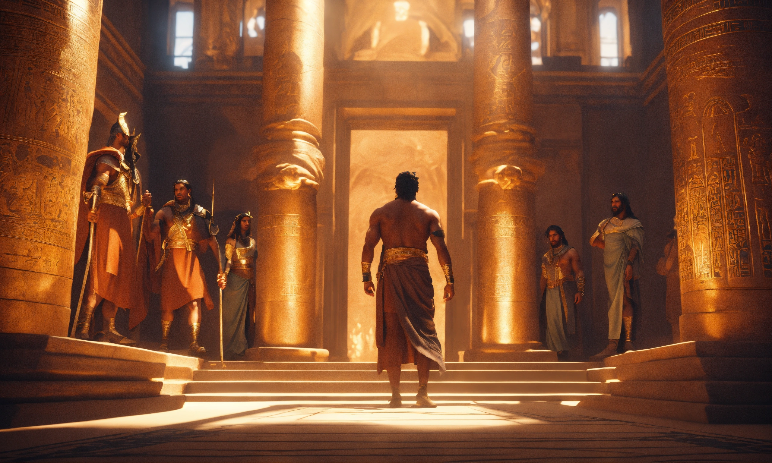 Moses holds the hand of the man who beat his brother in ancient egypt, cinematic lighting, complex, elegant, super highly detailed, art station, concept art, smooth, sharp focus, no blur, no dof, extreme illustration, unreal engine 5, photorealism, hd quality, 8k resolution, cinema 4d, 3d, beautiful, delicate, art by artgerm and greg rutkowski and alphonse mucha and loish and wlop