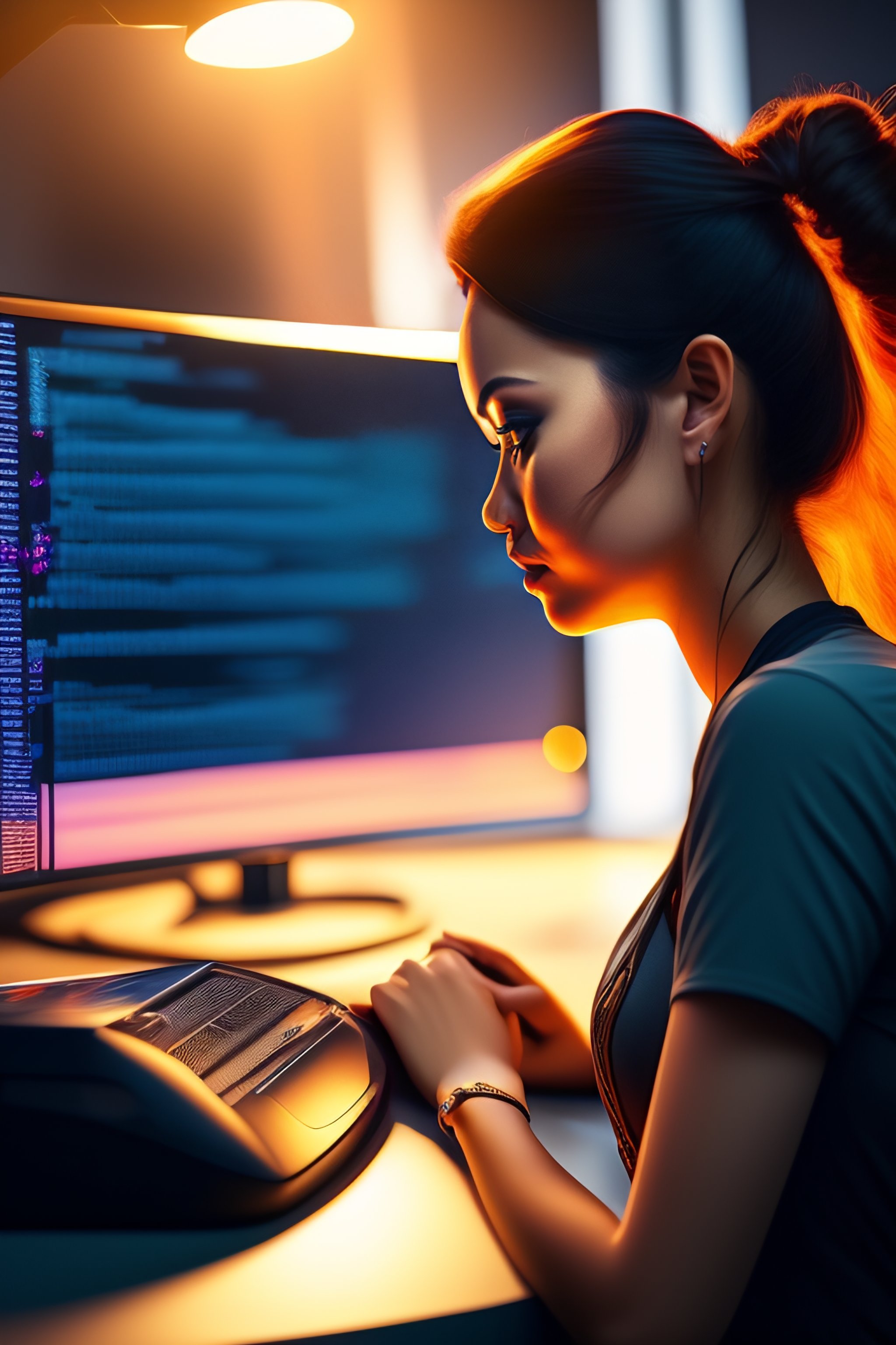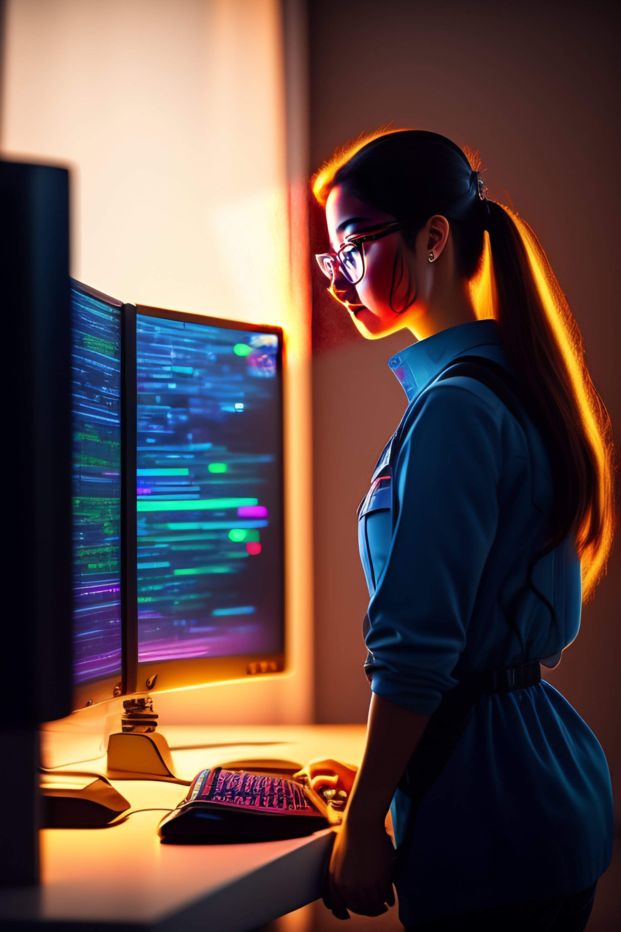 A nerdy girl is programming at a computer in a room full of gadgets, dramatic lighting, highly detailed, incredible quality, 2d, cartoon