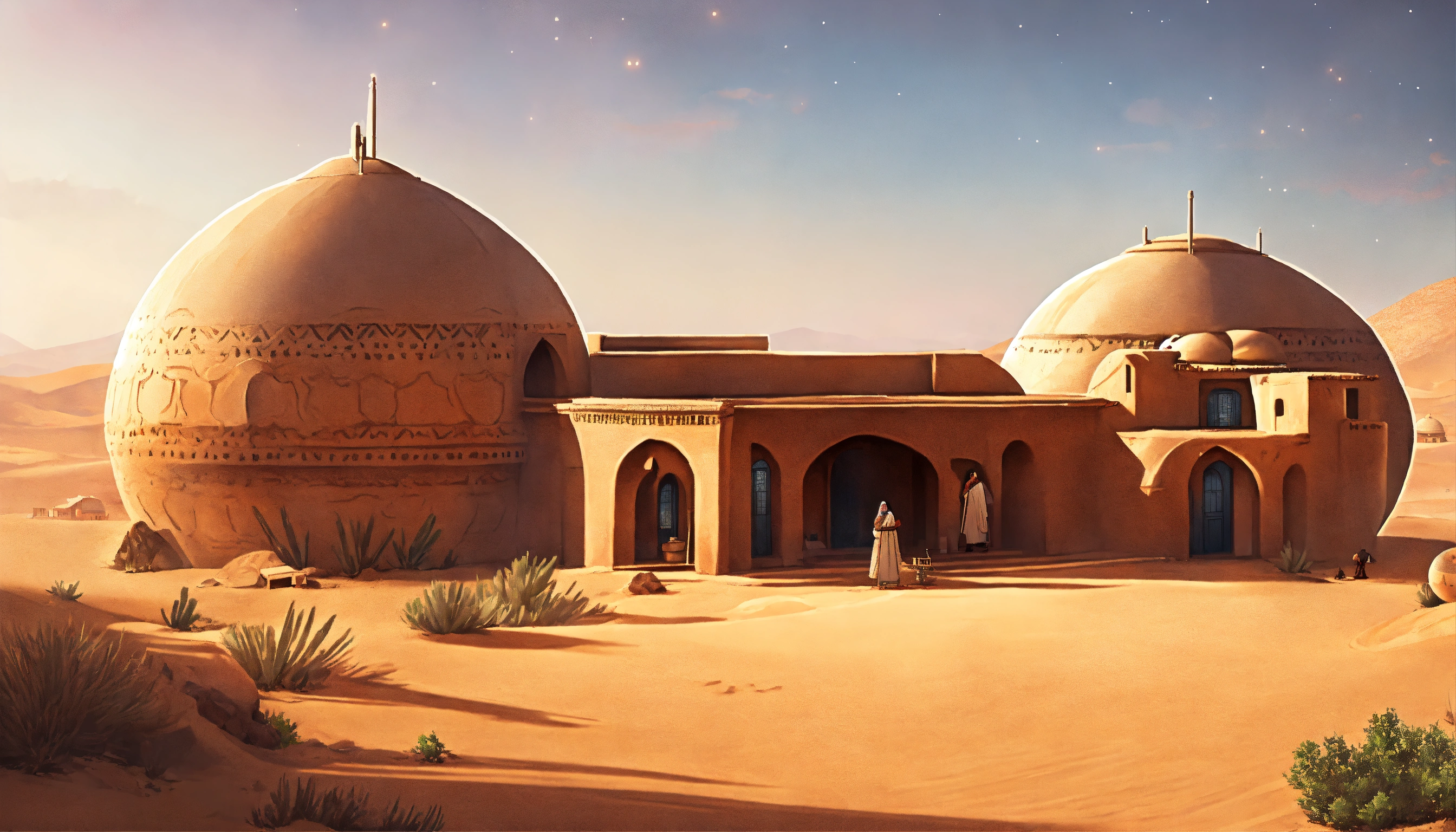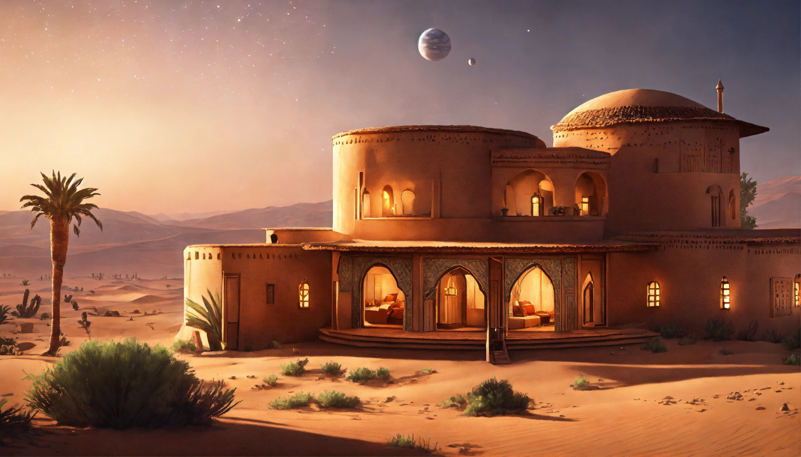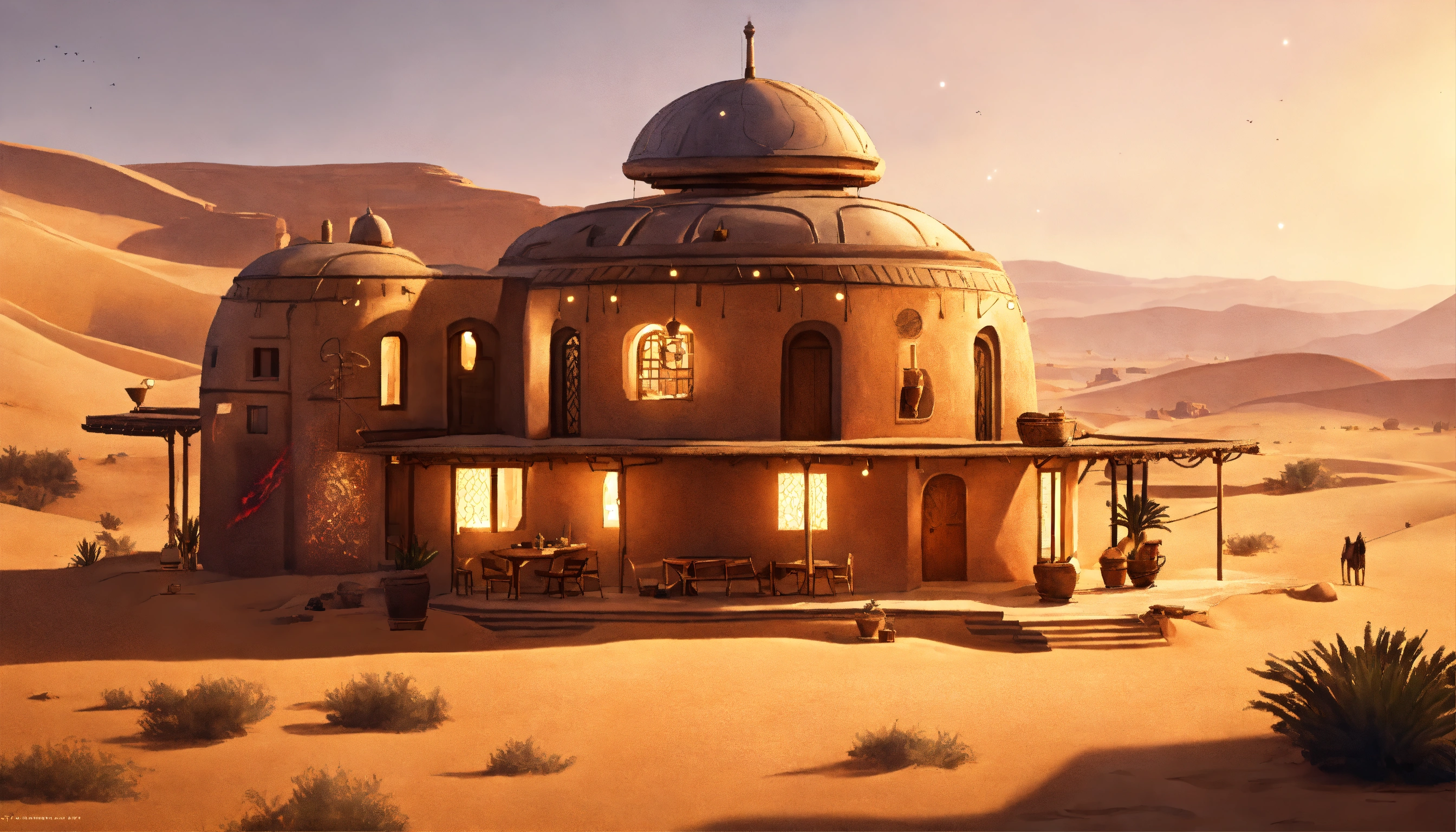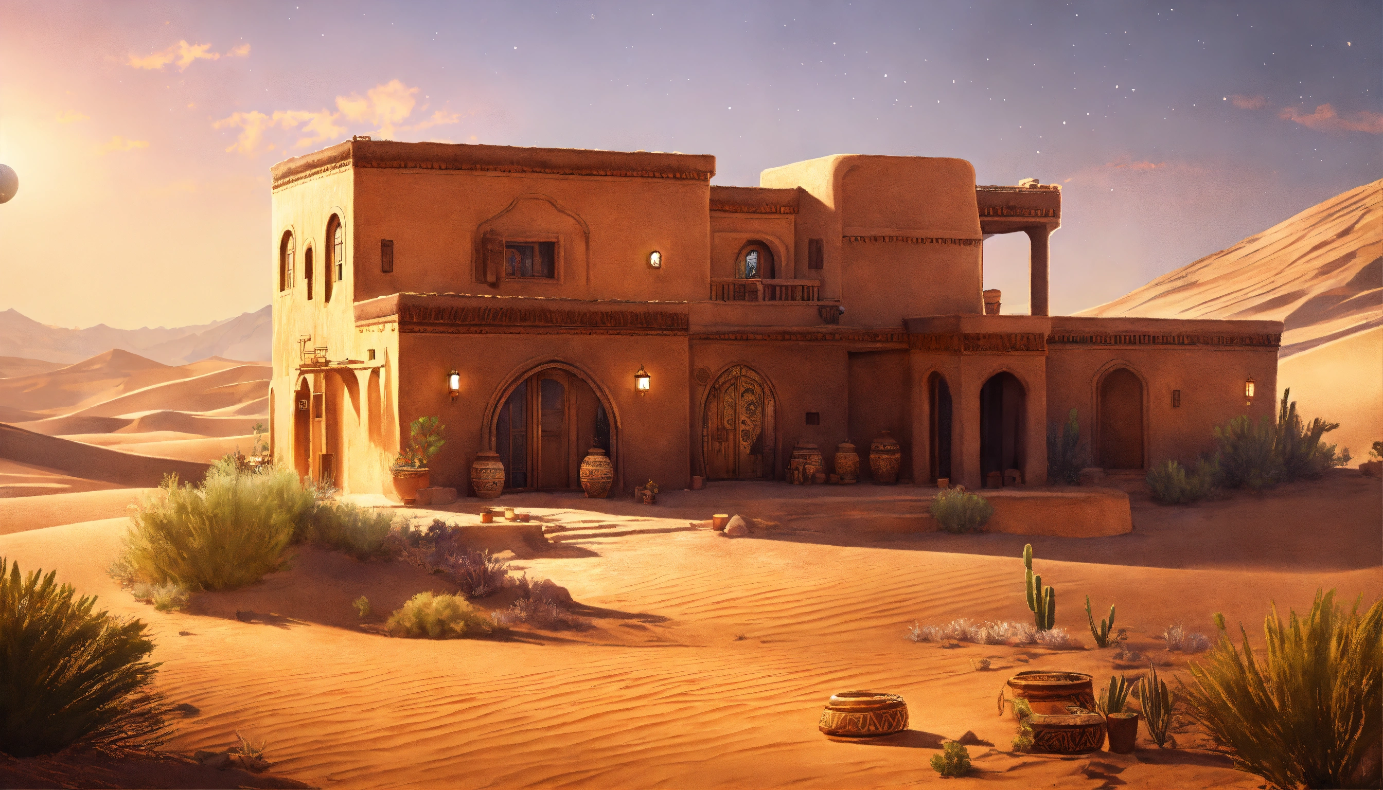 Concept art of a large desert home, jakku, desert, flat roof, several rooms, hut, two story, peasant, fire and chairs outside, survivor, charming, desert planet, multi-room, moroccan, starry desert planet sky, lanterns outside, moroccan fairy light lanterns outside poor, view from the outside, exterior view only, stucco outhouse, patterned design stucco walls, windows without glass, windows have shimmer flowing curtains, exterior only, house with courtyard in the center, beautiful, adobe, sand dunes in background, large huge two story house, alien desert planet, stranded, adobe villa, star wars, very long adobe mansion, huge