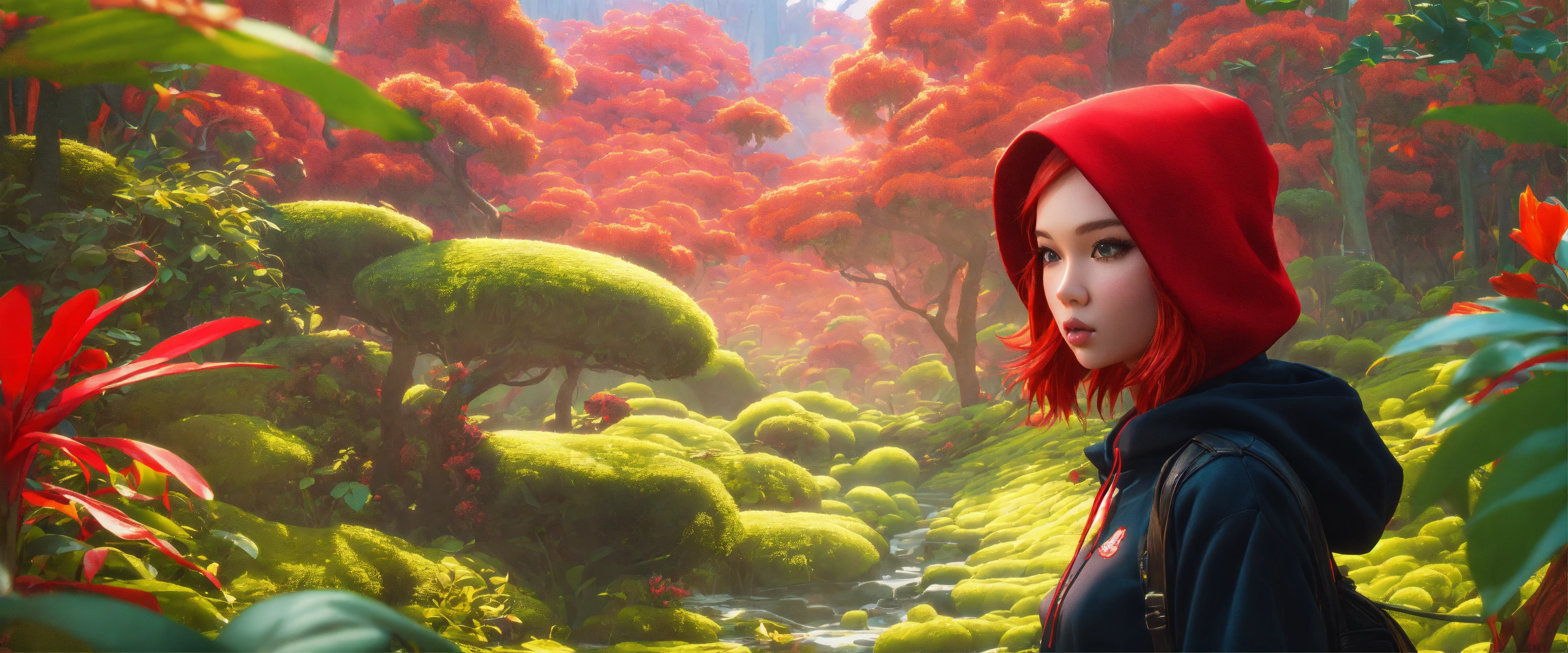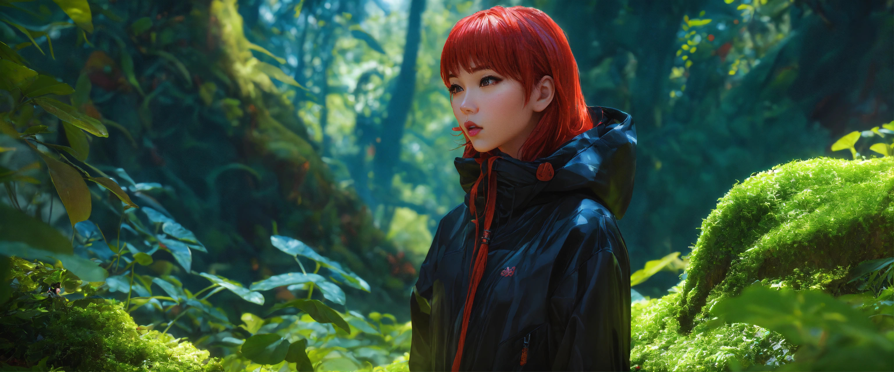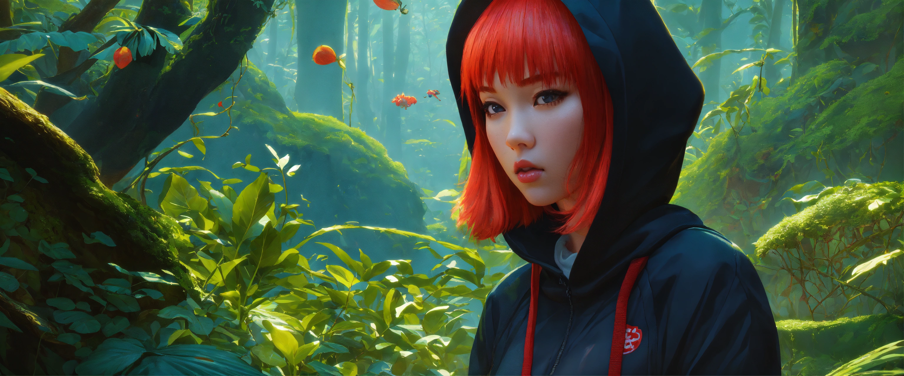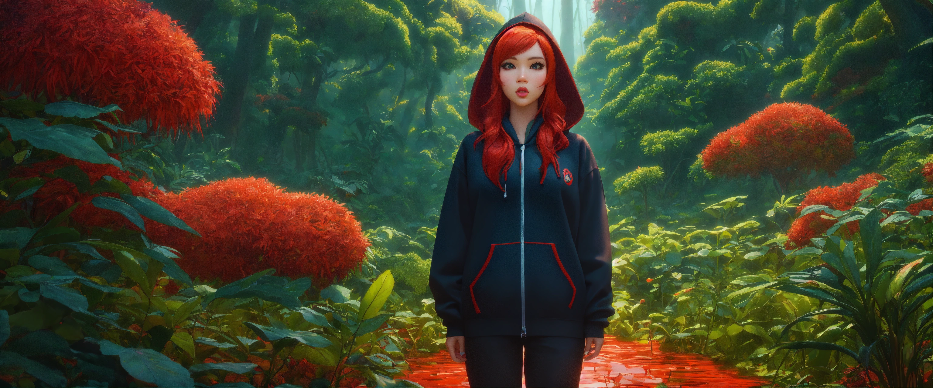 Extremely ultrarealistic photorealistic 3d cute asian anime red hair big girl wearing a black hoodie holding a matcha in a vast jungle, by james jean and android jones jeff koons erin hanson joe fenton dan mumford professional photography, natural lighting, volumetric lighting maximalist photoillustration 8k resolution intricately detailed, complex, elegant, expansive, fantastical