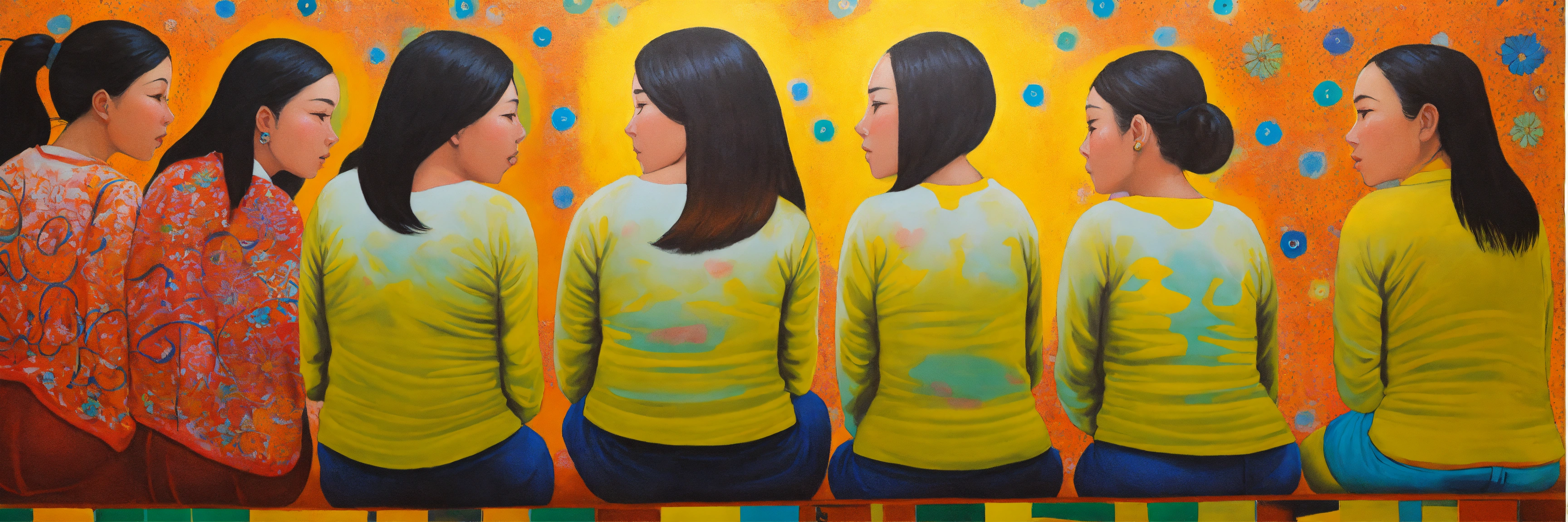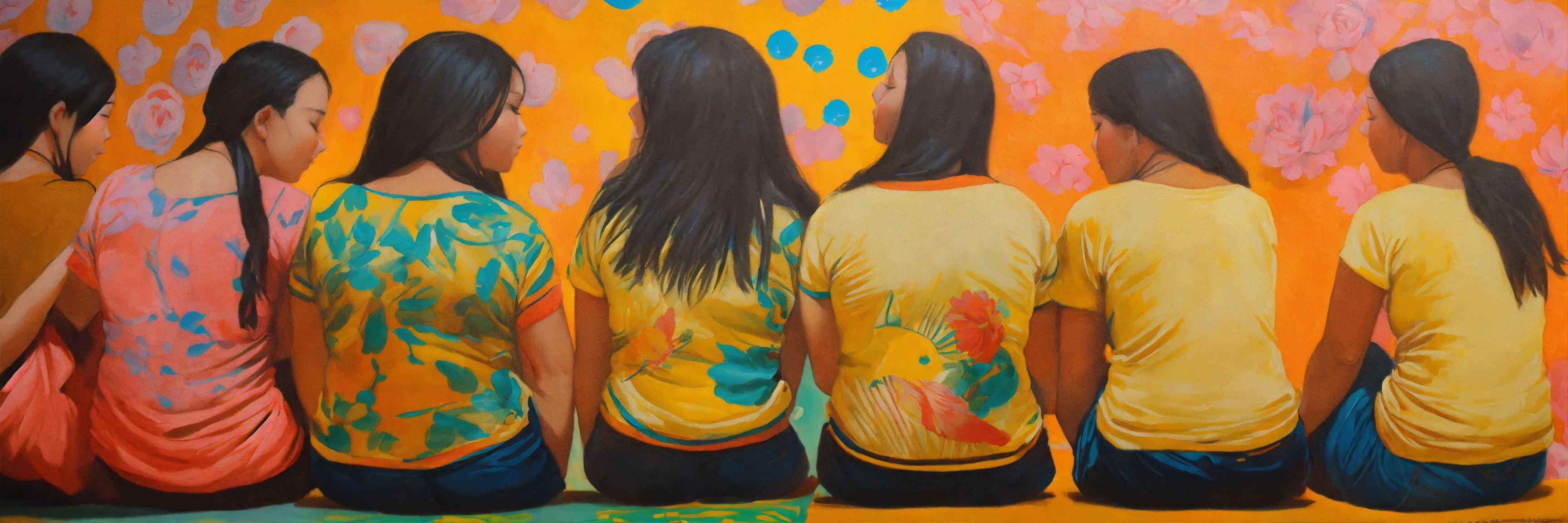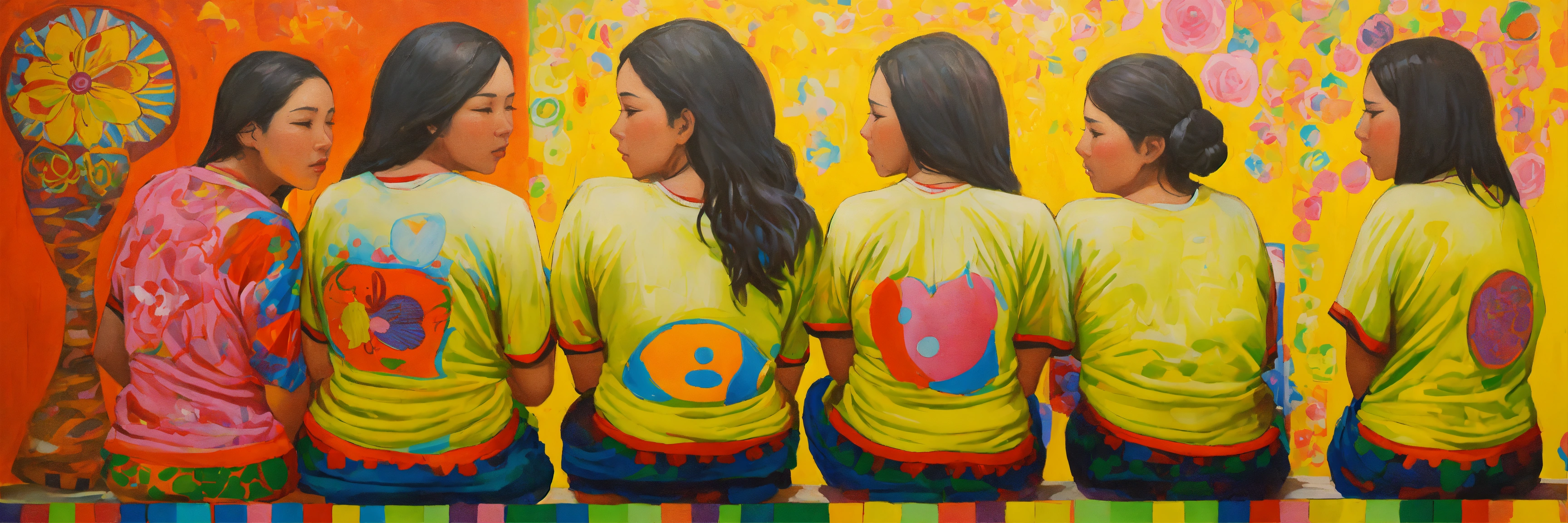 Pintura, de mujeres de distintas etnias o razas, todas comparten una tela o frazada colorida que las protege, no uses fottografías, quiero pintura, that showcases empathy osea the emotional involvement of a person in a reality outside of their own, usually in the feelings of another person, graffiti. abrazo entre dos mujeres, cariño, altruismo, ai weiwei style. by belkis ayún and yayoi kusama
