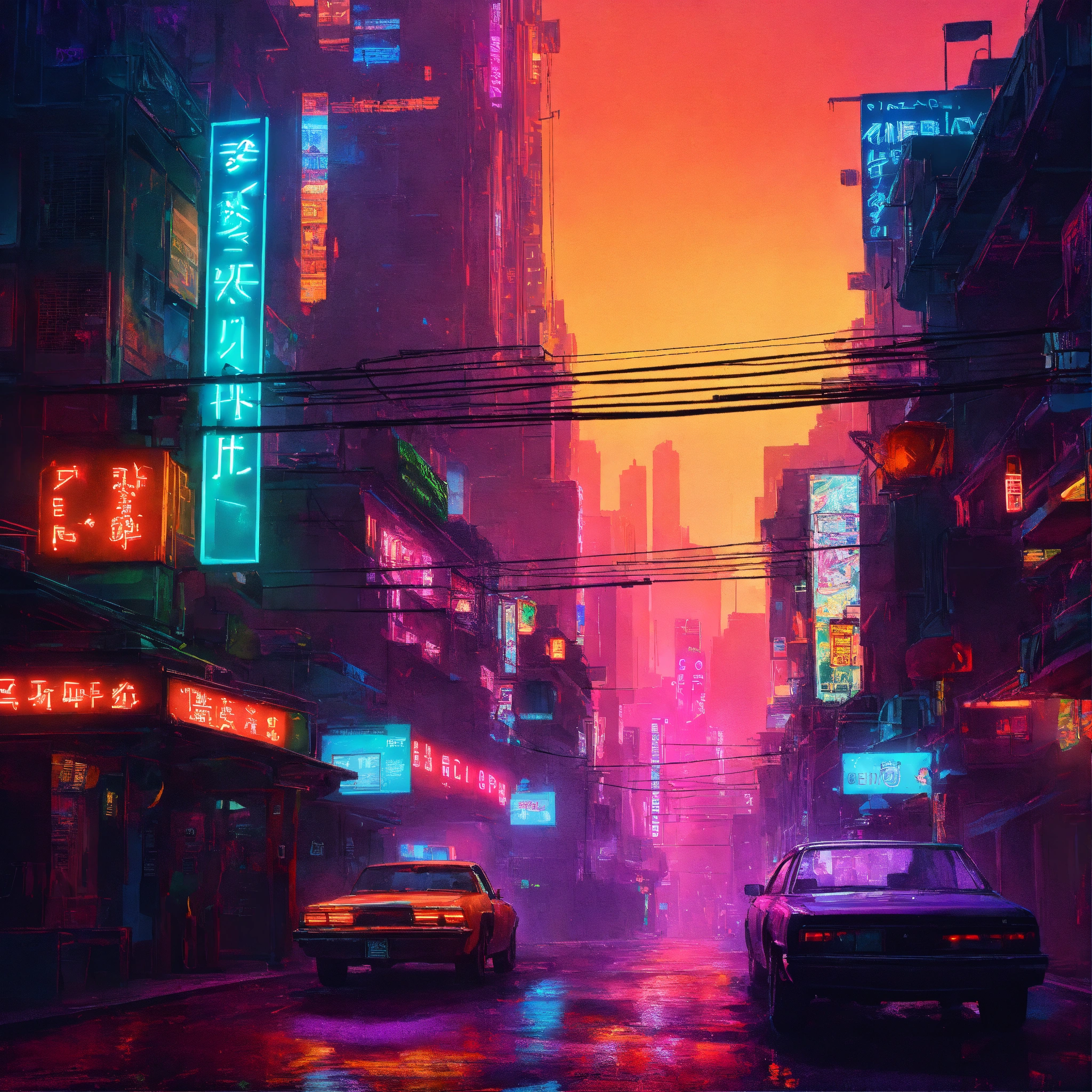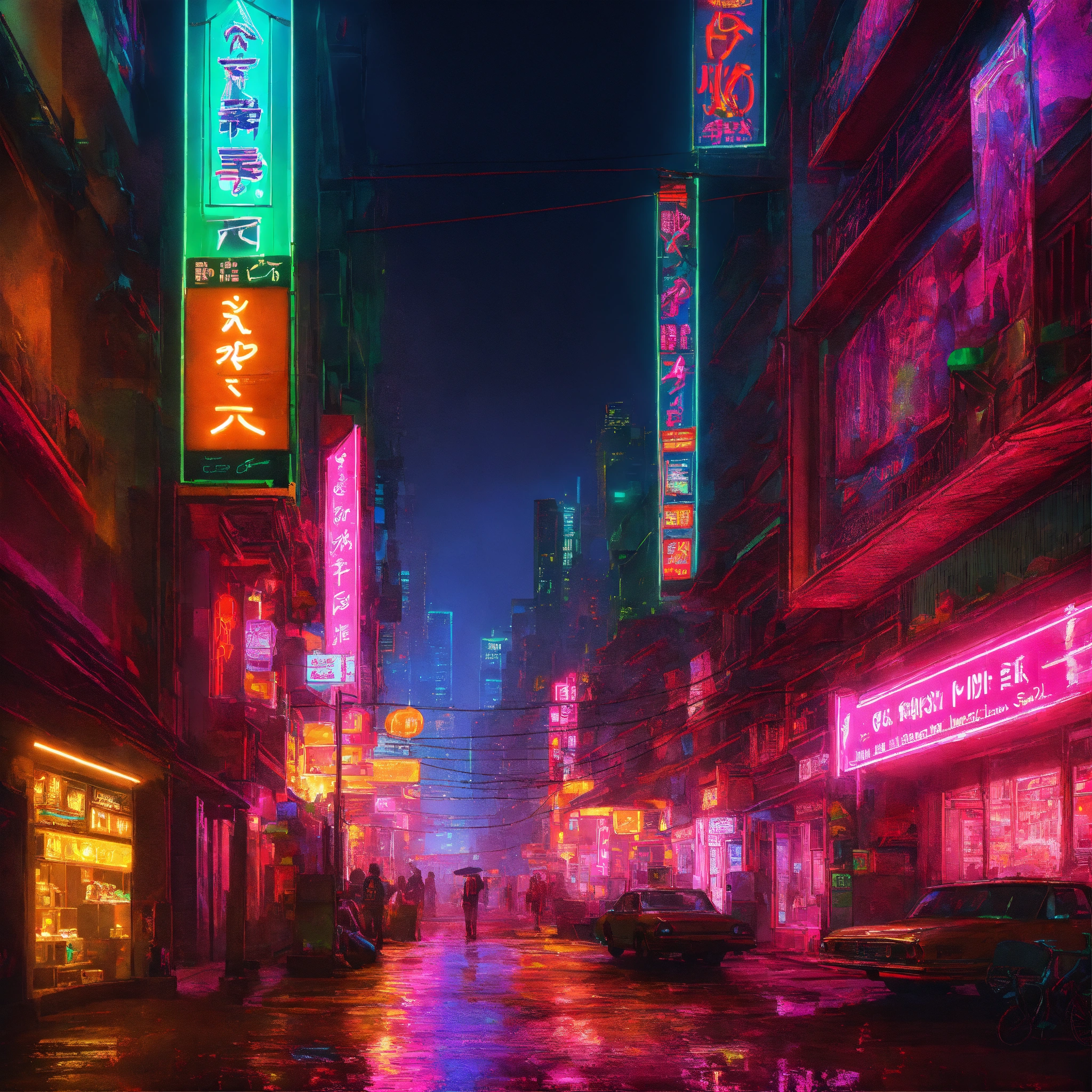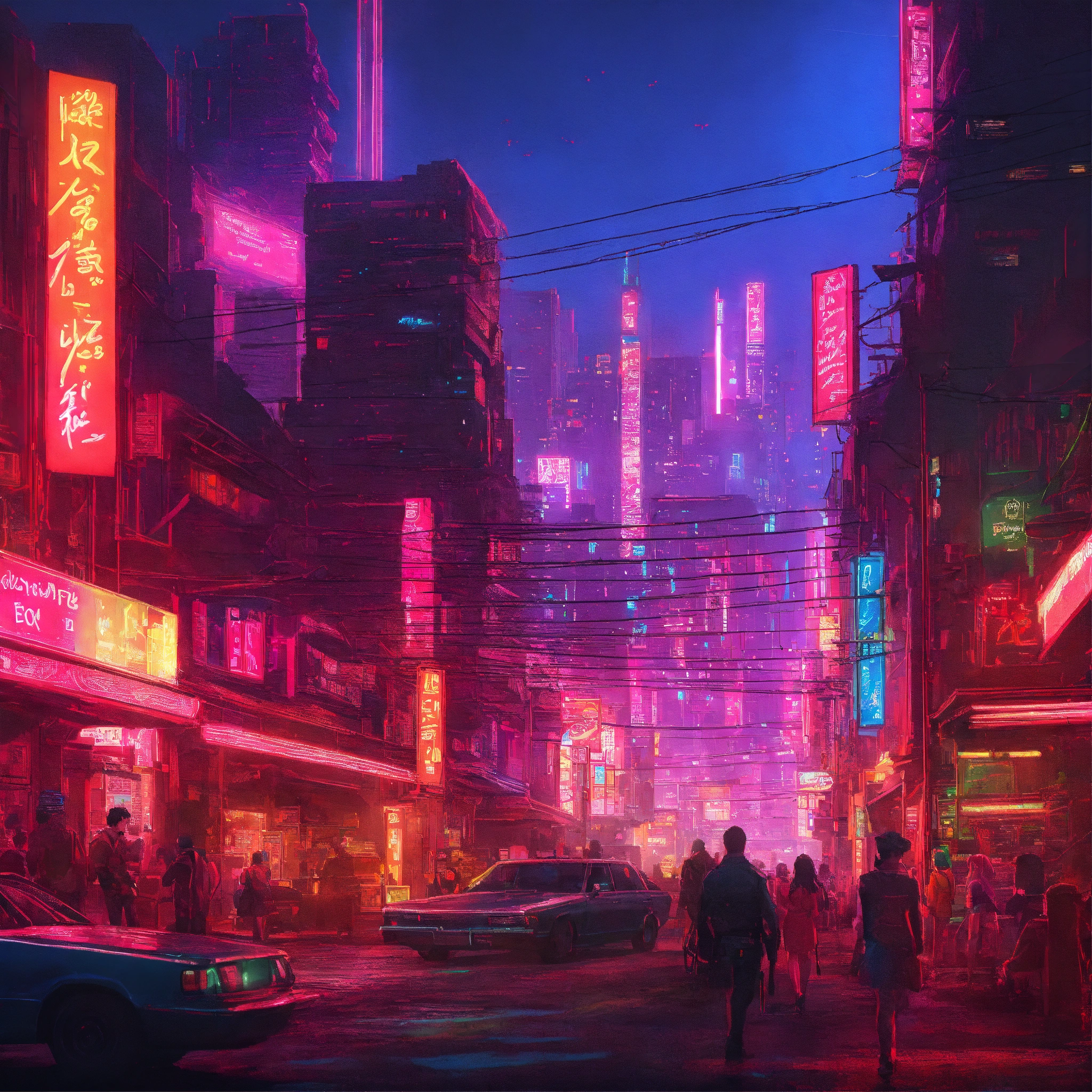 A dazzling neon lit city with an urban dystopia