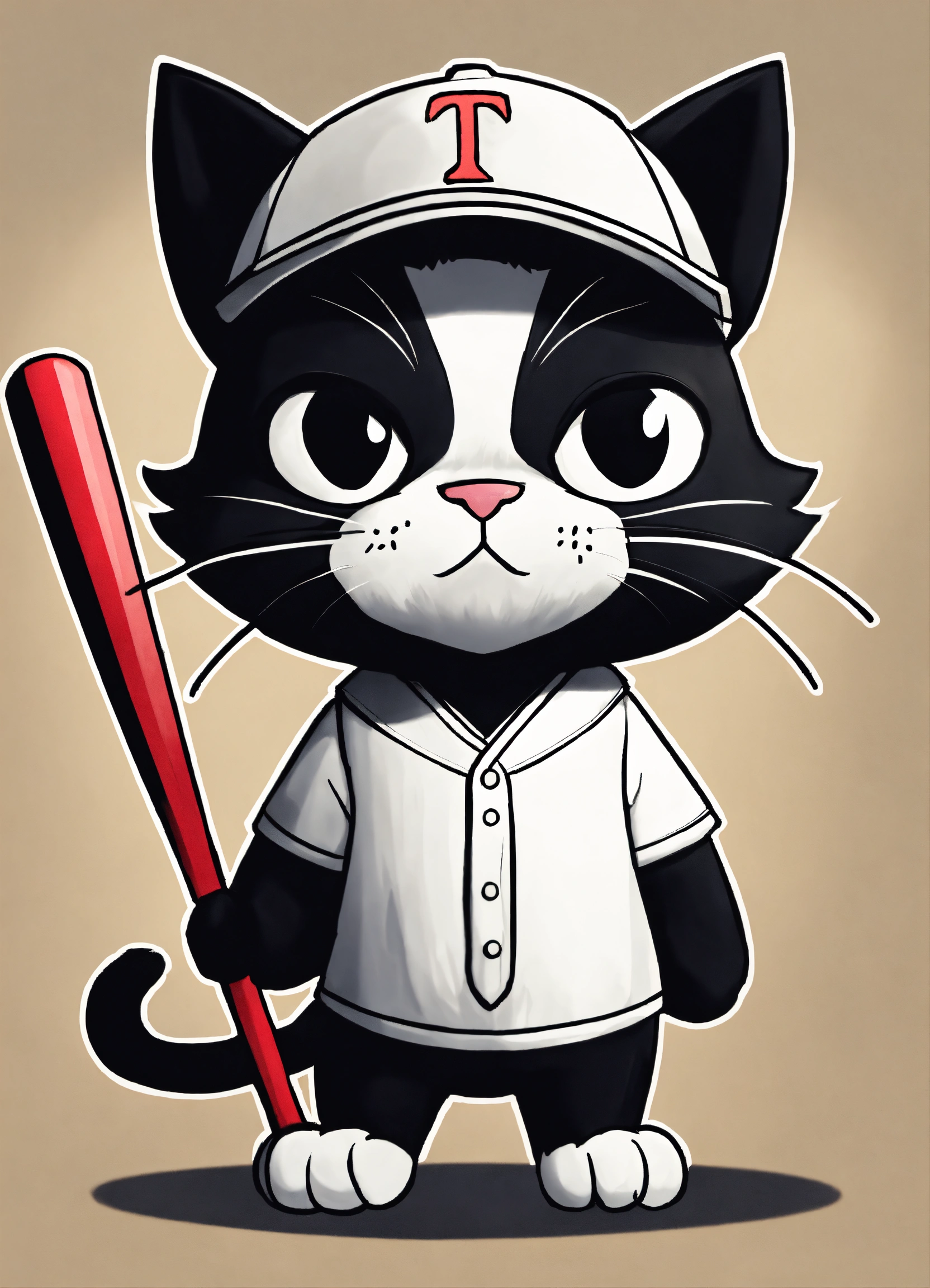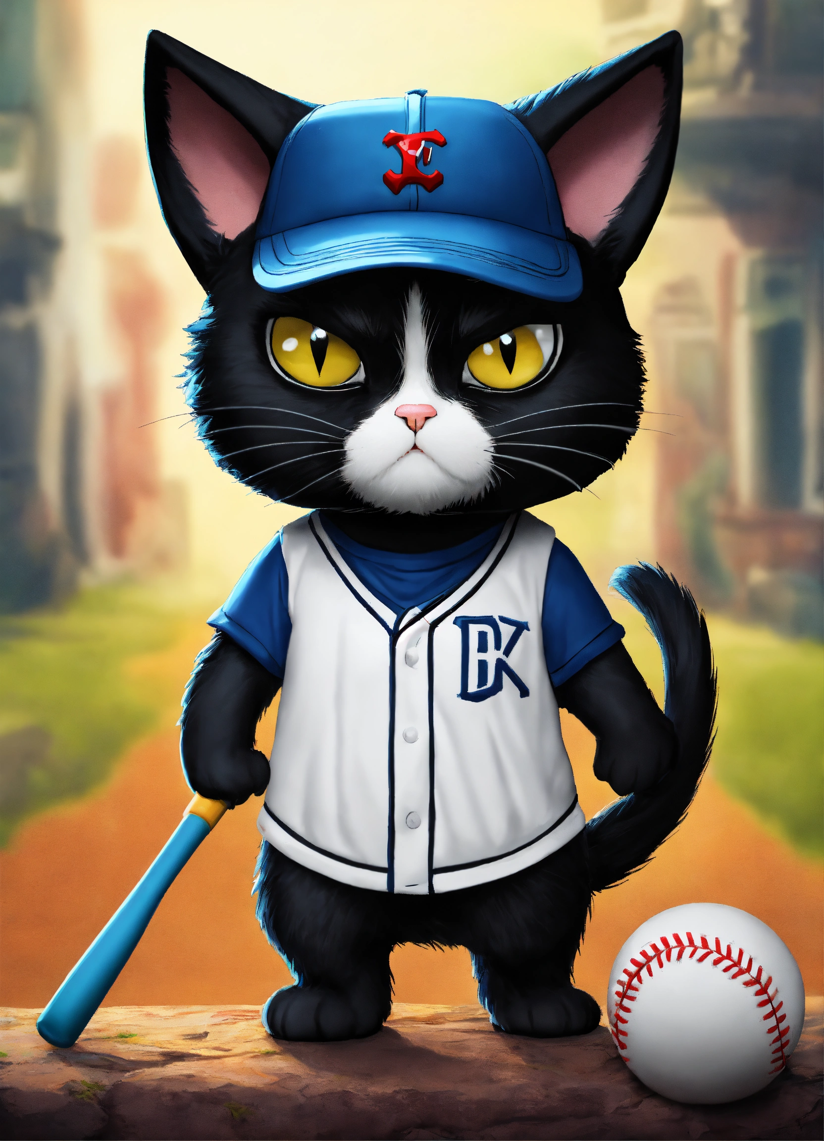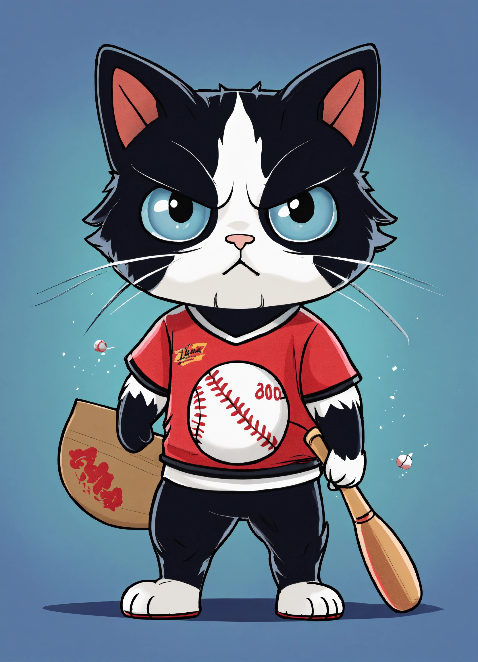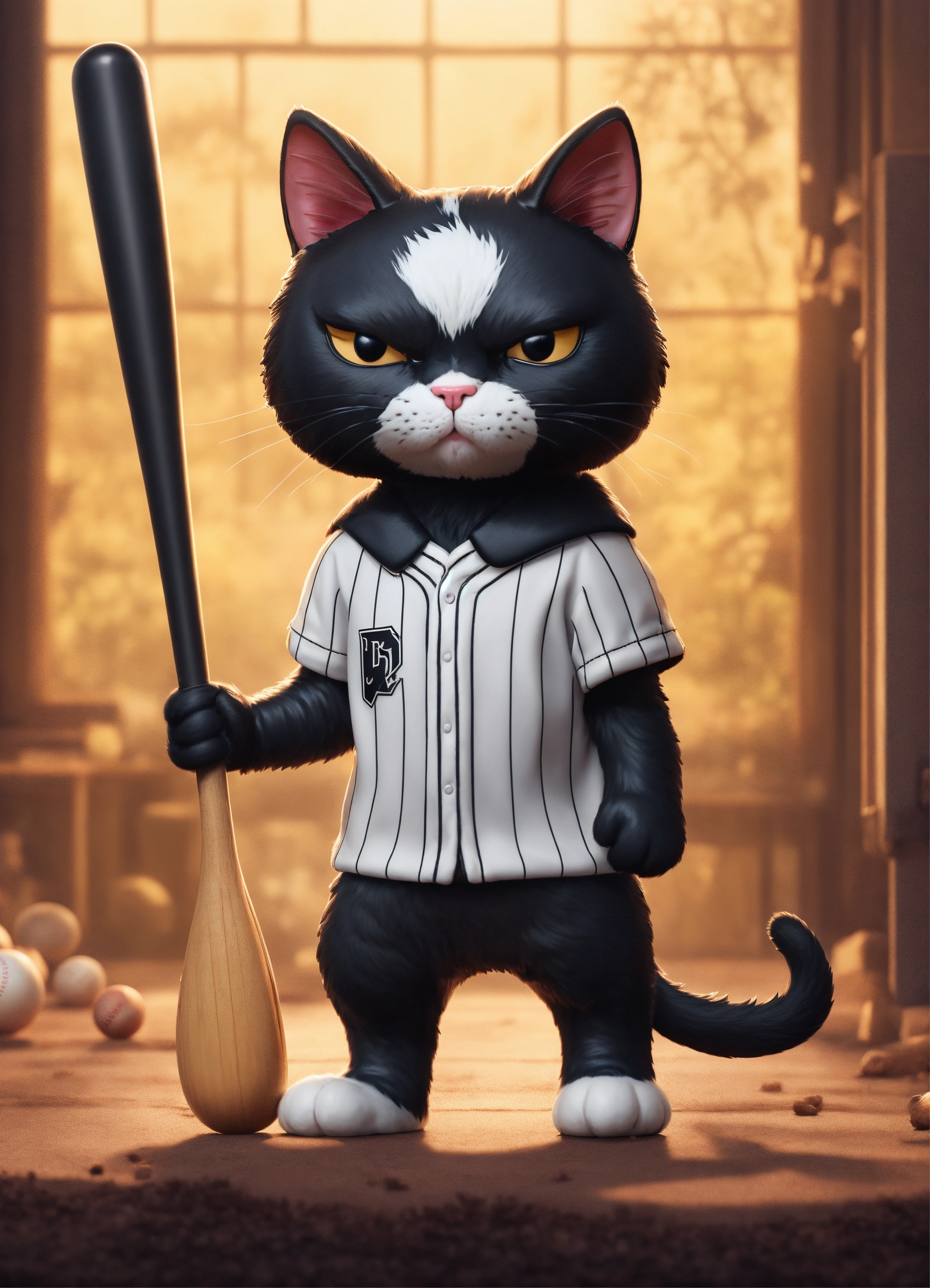 Cute and adorable cartoon angry black and white cat, standing up, fantasy, dreamlike, surrealism, super cute, holding a bat, funko pop, wearing a baseball shirt