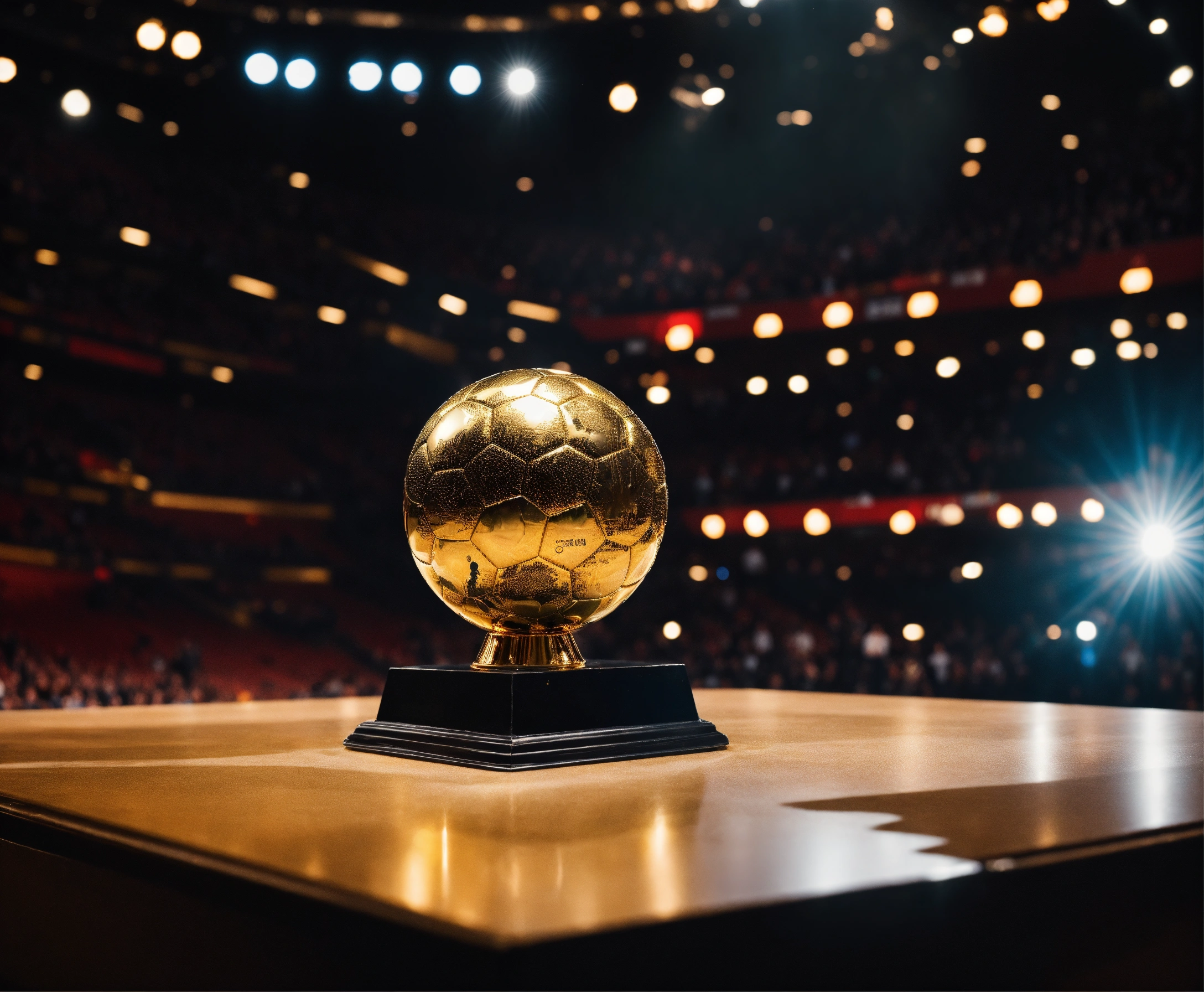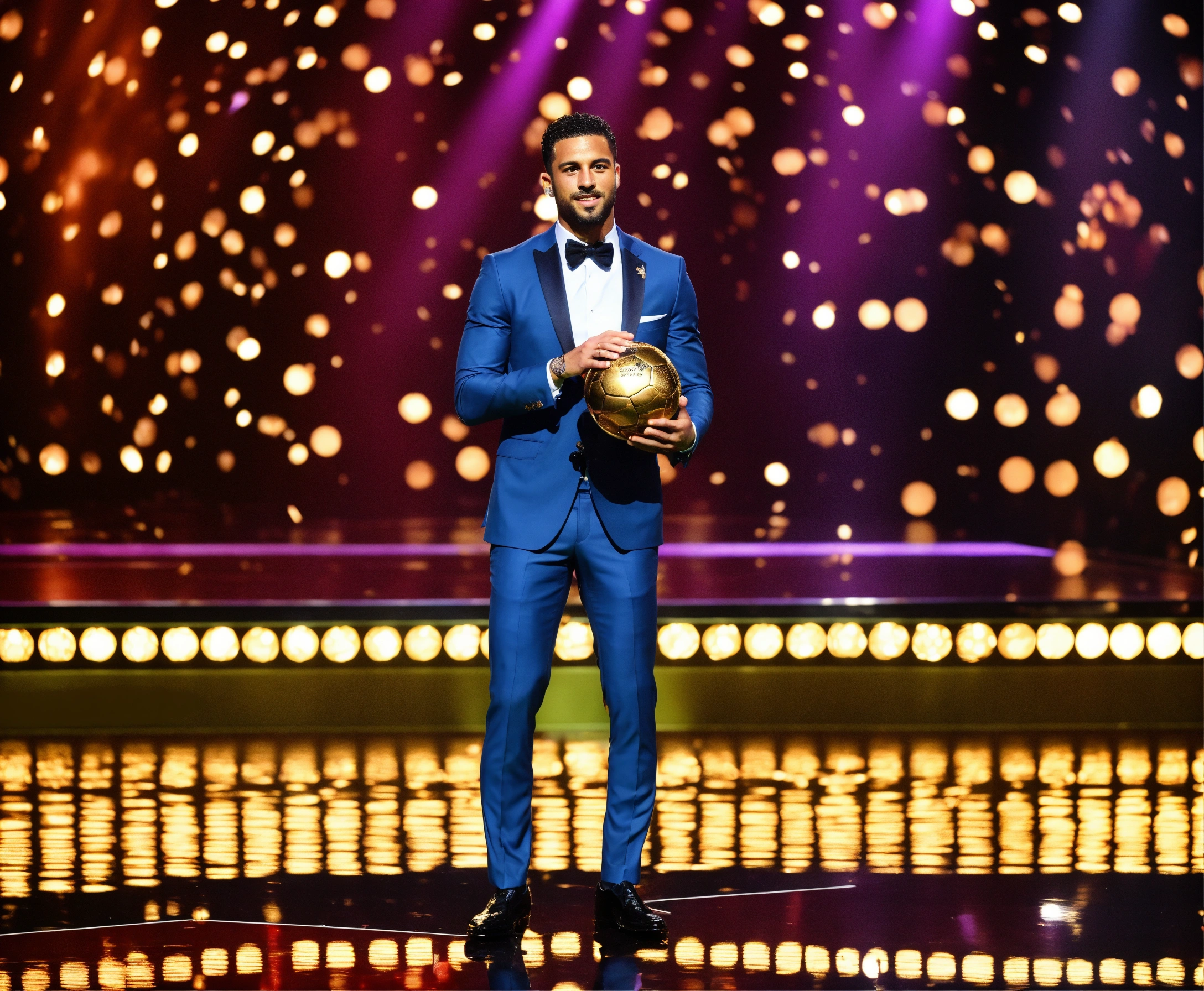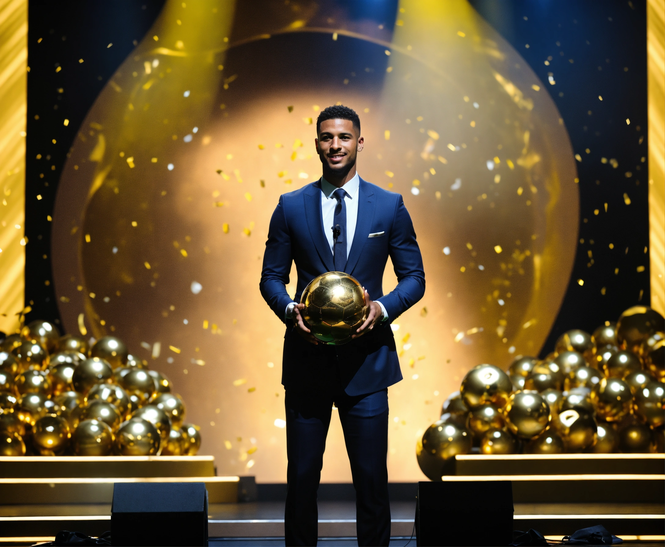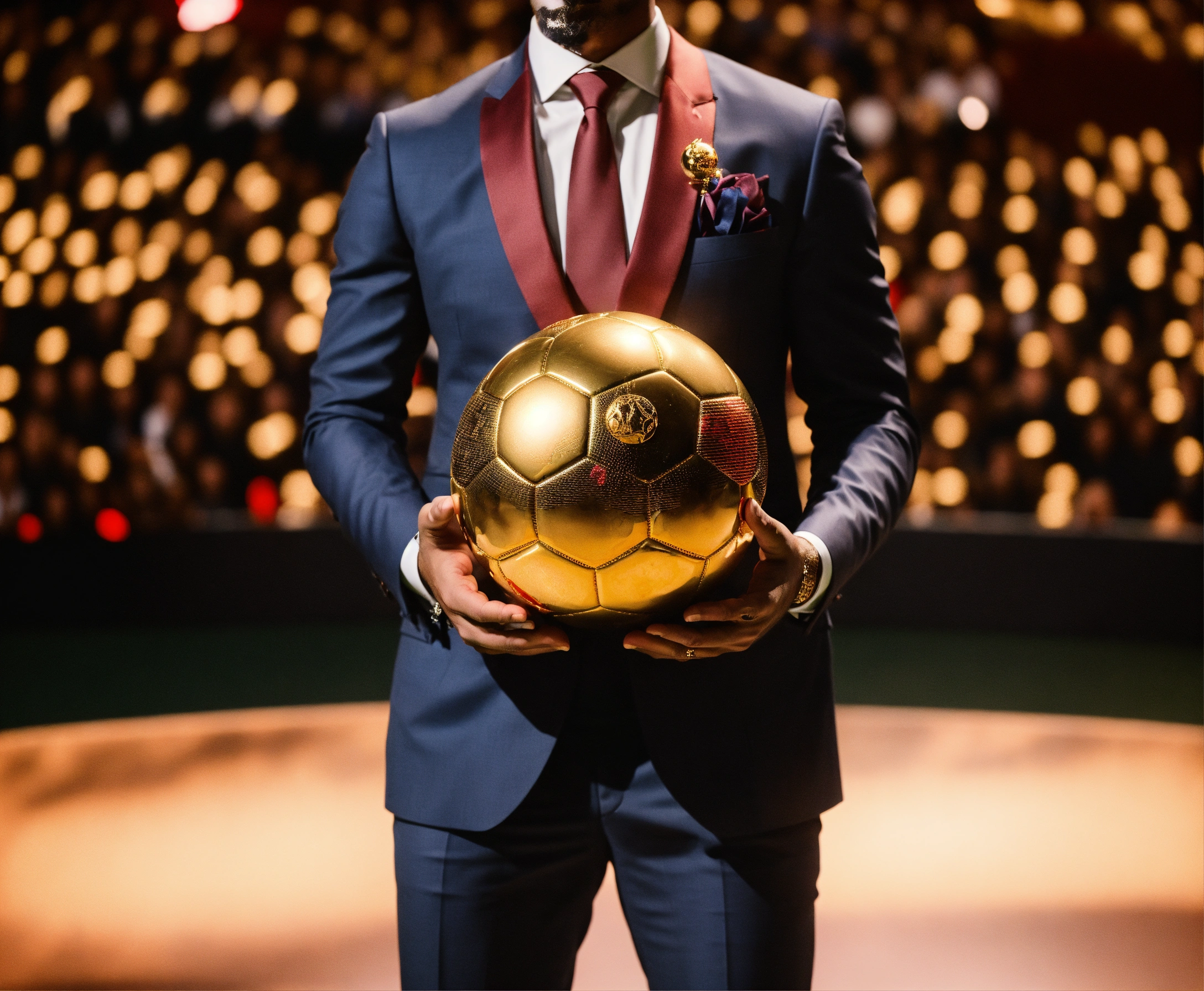 Awarding the golden ball to the best football player, on stage, half of the body is visible, a man in a suit