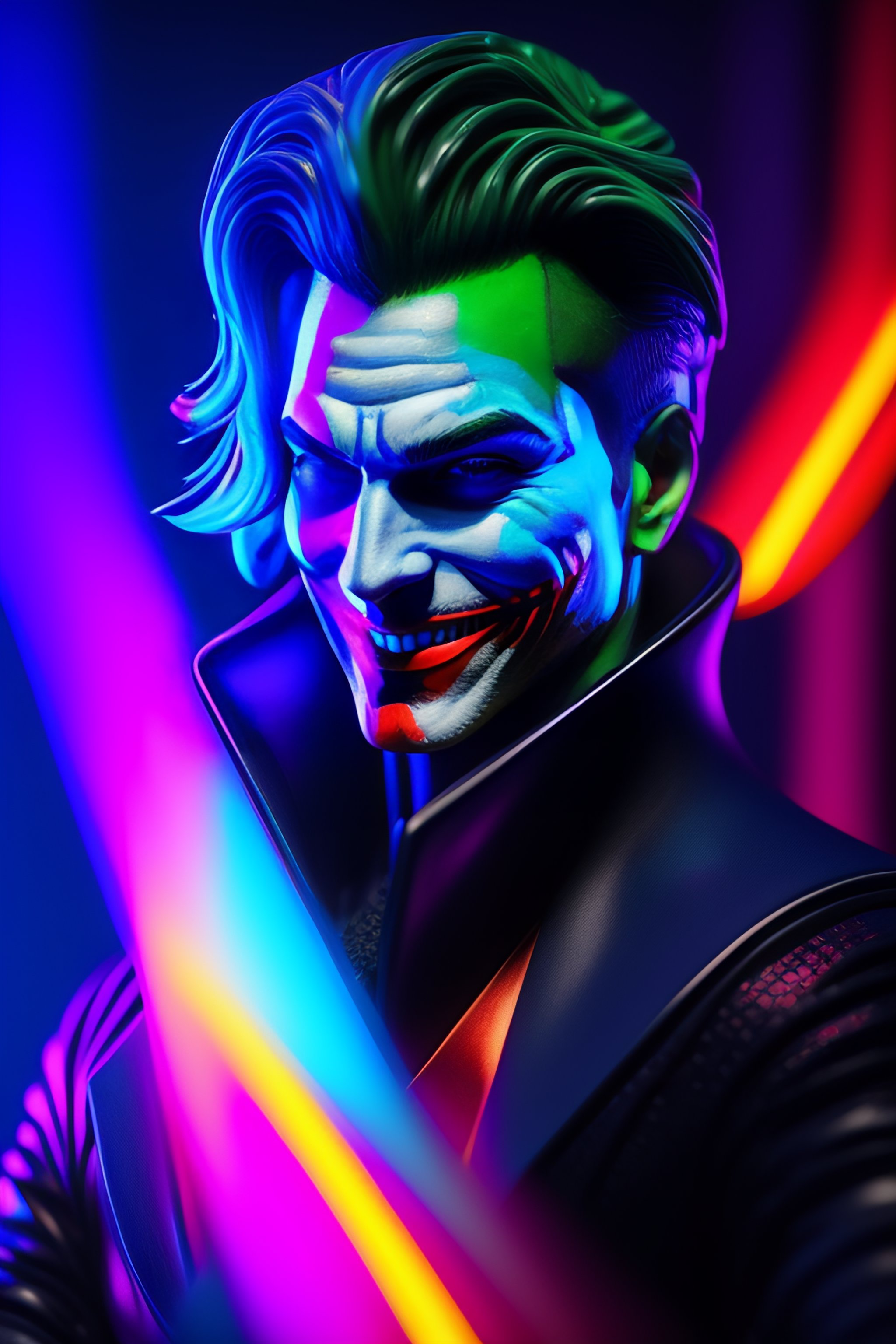 Joker colorful 3d hyperrealistic::5 carbon fiber::5 cyberpunk::2, 5 gconcert lighting::1 electfire::1 fluorescent::1 indigo::1 neon blue color::1 rgb::1 aluminum::1 carbon fiber::1 fiber optic::1 magma::1