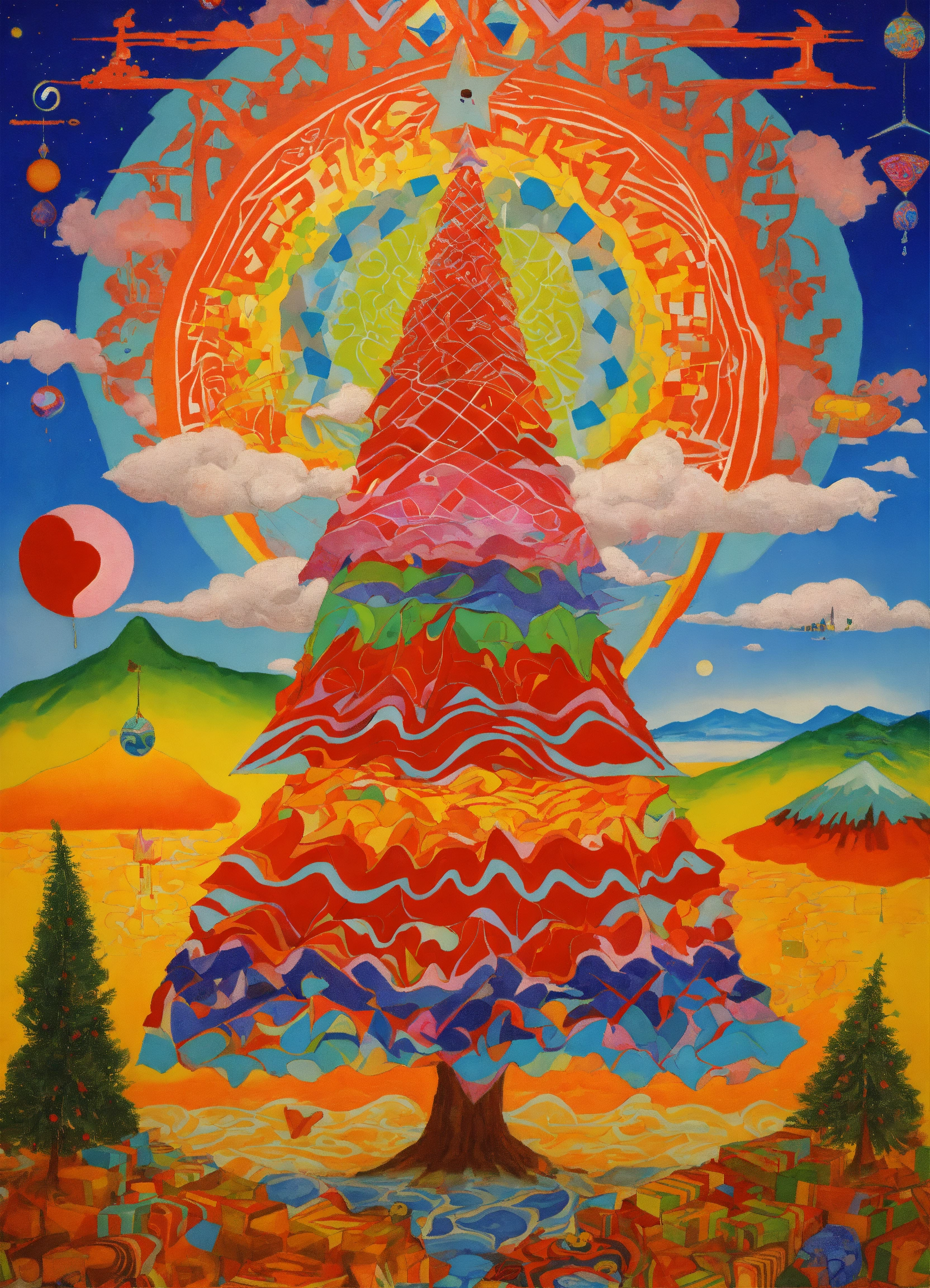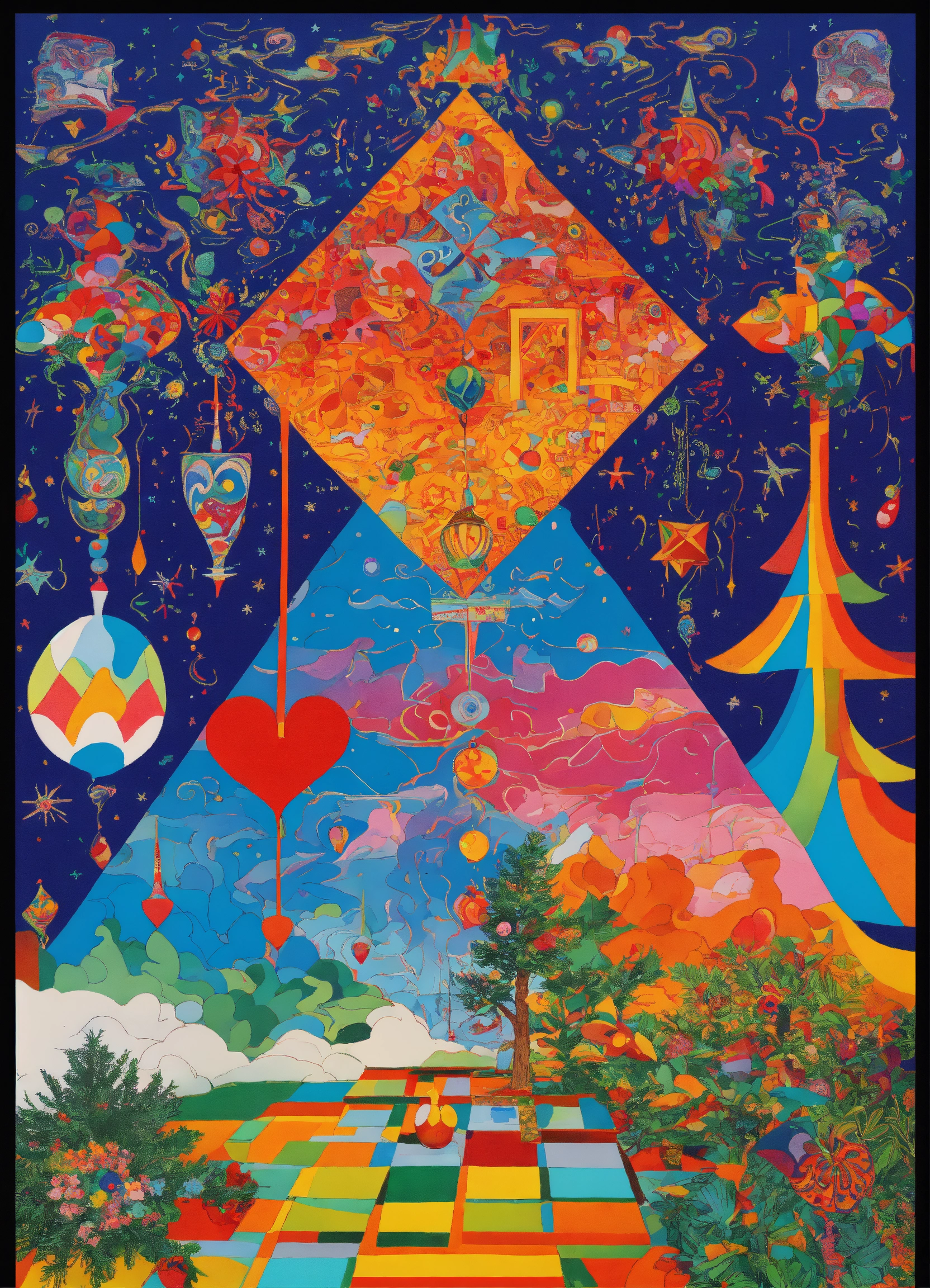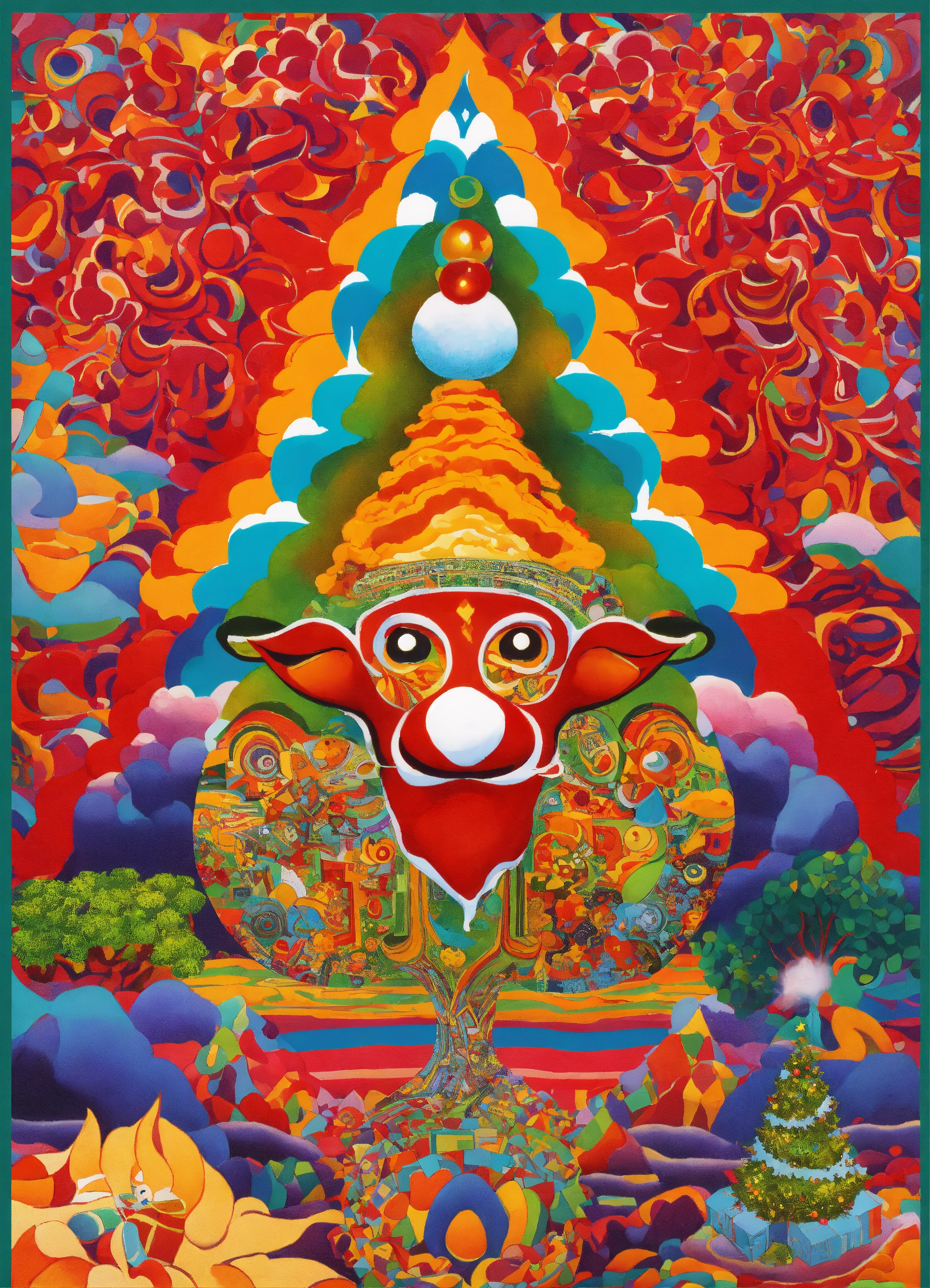 Rudolph the red-nosed reindeer smoking pipe, japanese retro poster, christmas tree of life merging with love heart melting merging with oriental the most beautiful cosmos, coogi abstract psychedelic vortex background by wassily kandinsky, elfs paradise, snow man wearing coogi jumoer, containing symmetrical grid patterns, psychedelic patterns melting merging into dripping into presents by coogi pattern mount by maurits cornelis escher, 5d outline, wavy dream dimension, chevron florescent geometrical sno dripping, dense jungle melting into four corners of universe by picasso, coogi checkerboard patterns dripping by keith haring