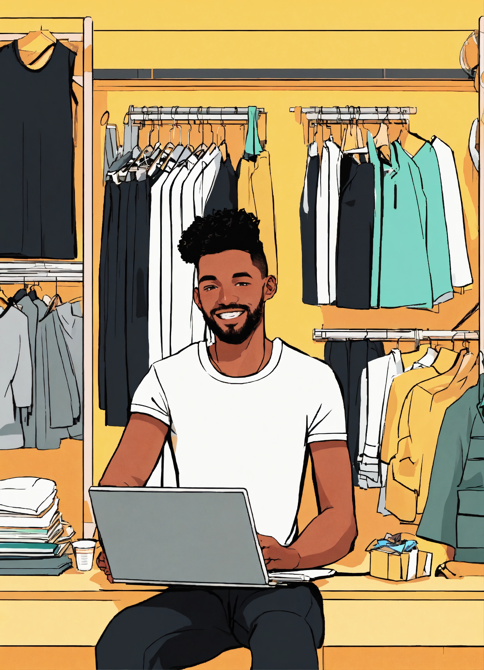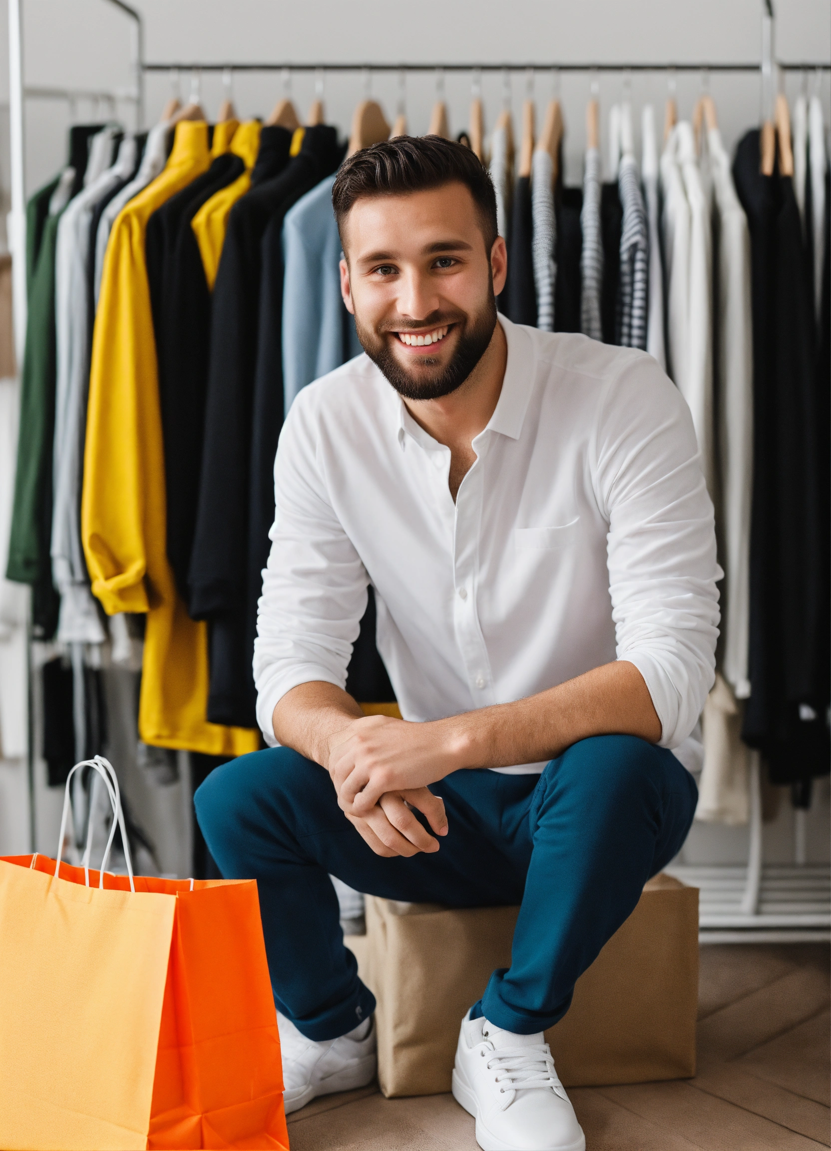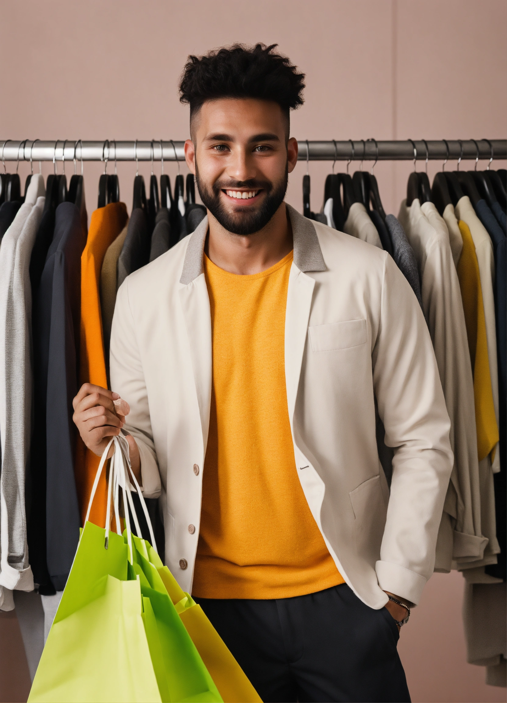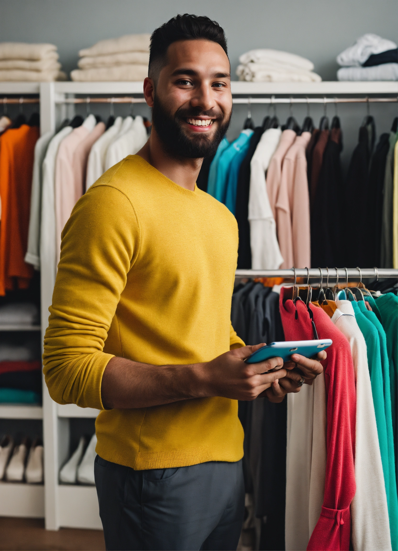 A close-up of a 30-year-old minimalist man shopping quality garments online, looking into the camera; mostly black and white with a pop of fresh happy colors