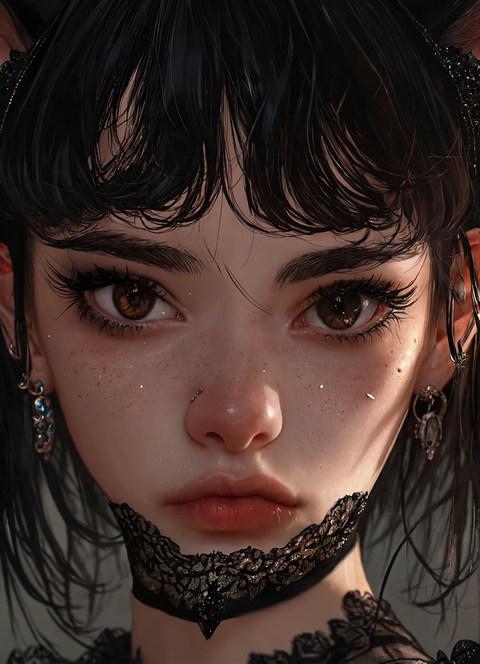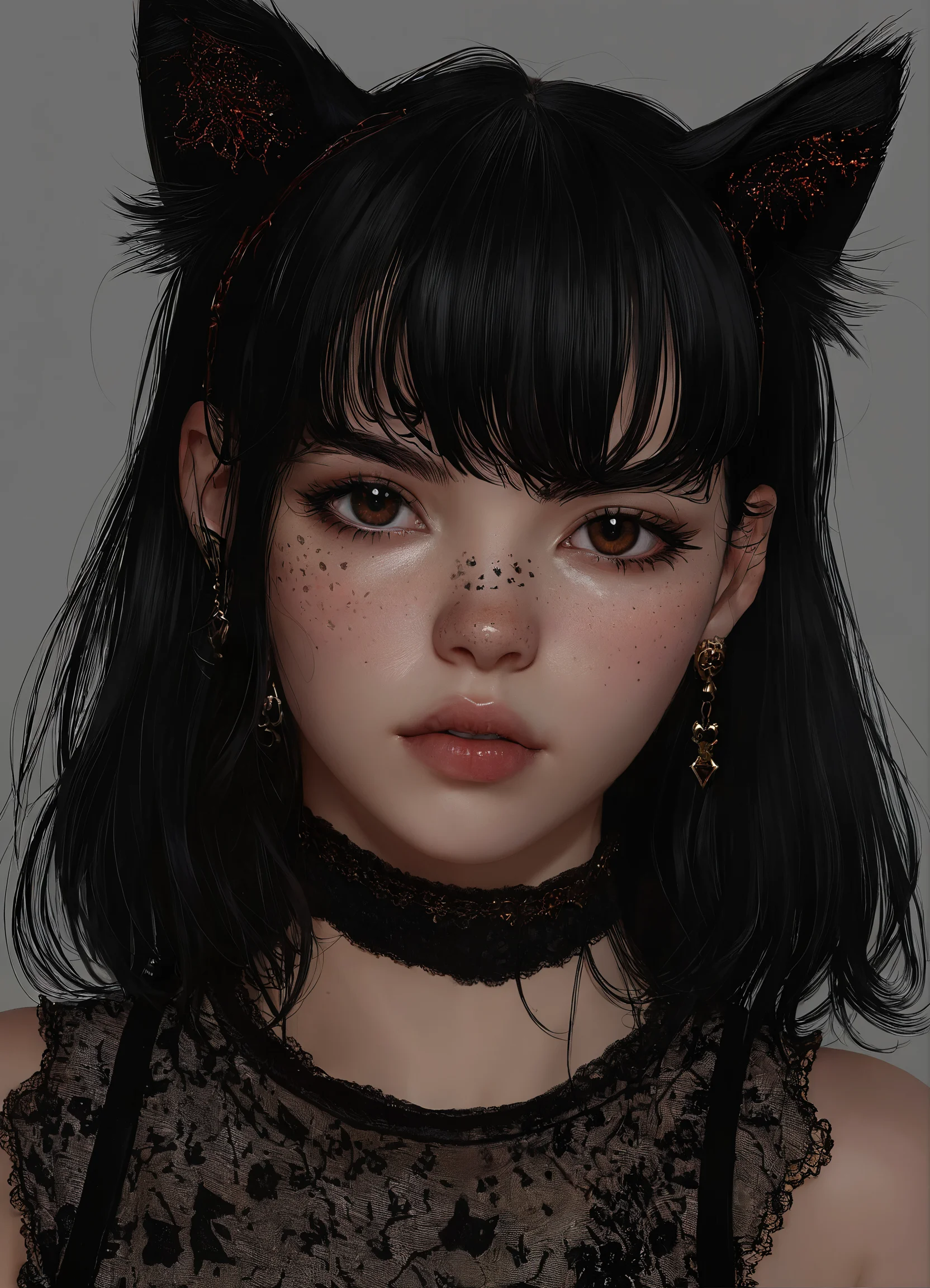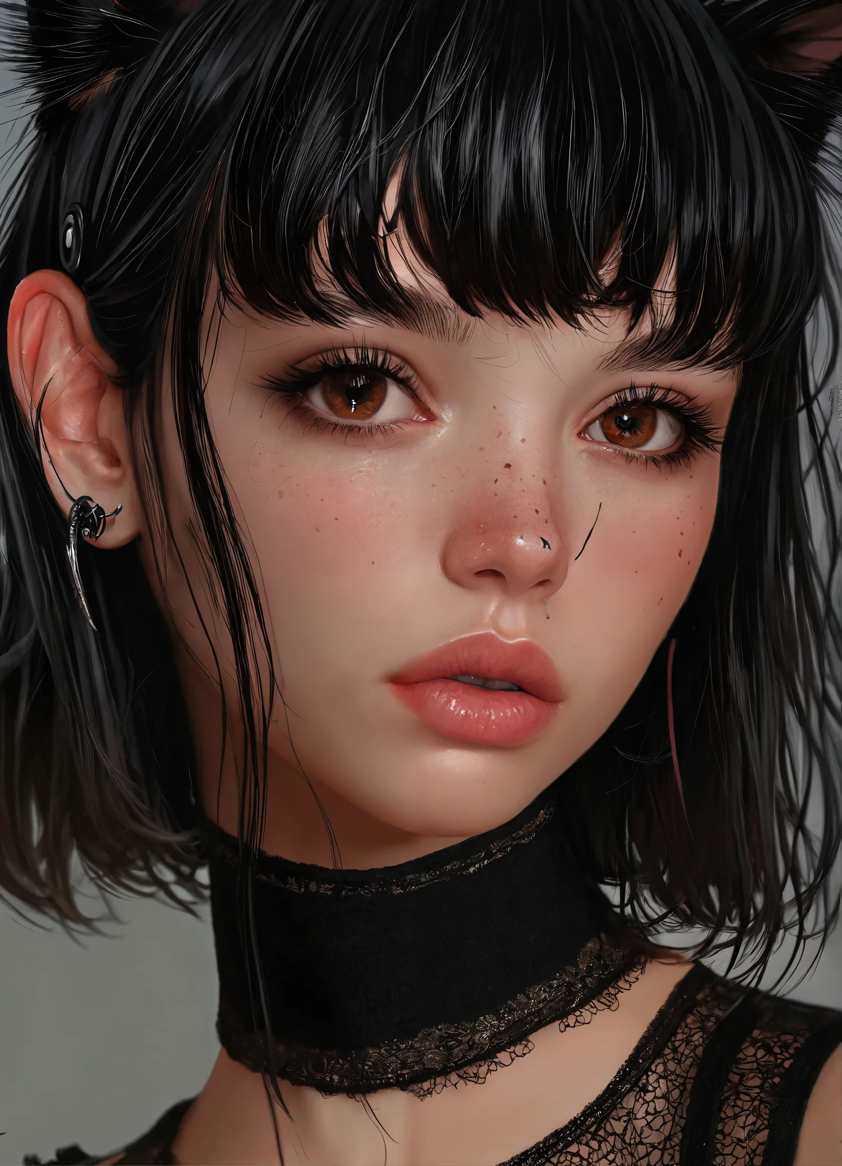 Spanish, e-girl, bangs, black hair, brown eyes, beautiful eyes, beautiful lips, gothic, slim, stylish, freckles, cat ears, 8k, high detail, highly detailed, digital painting