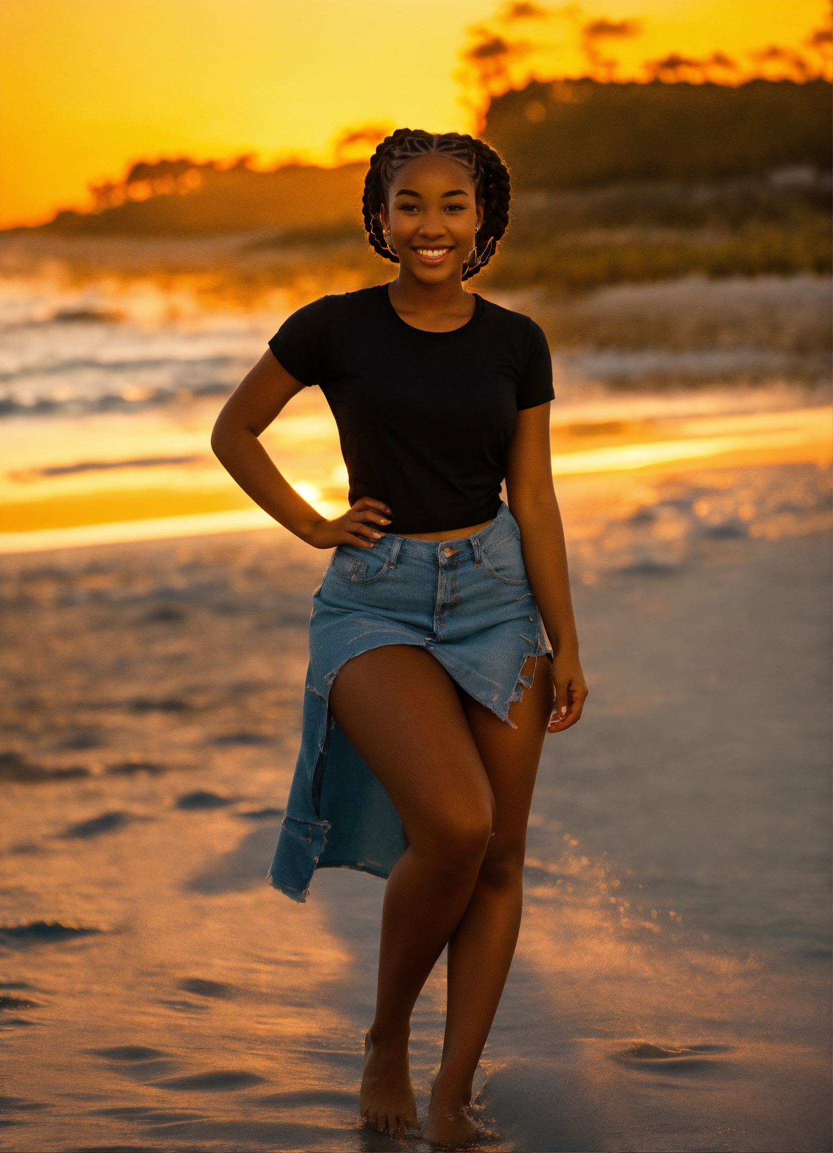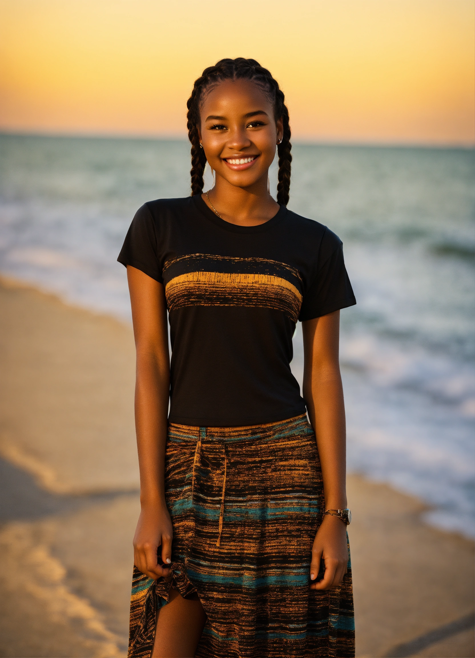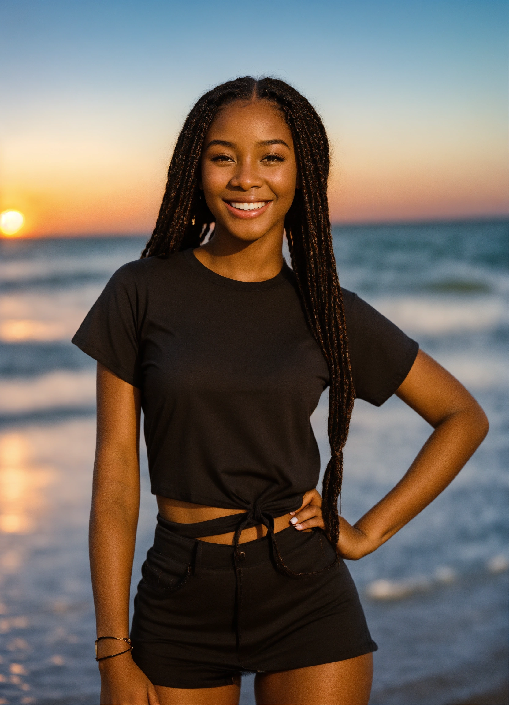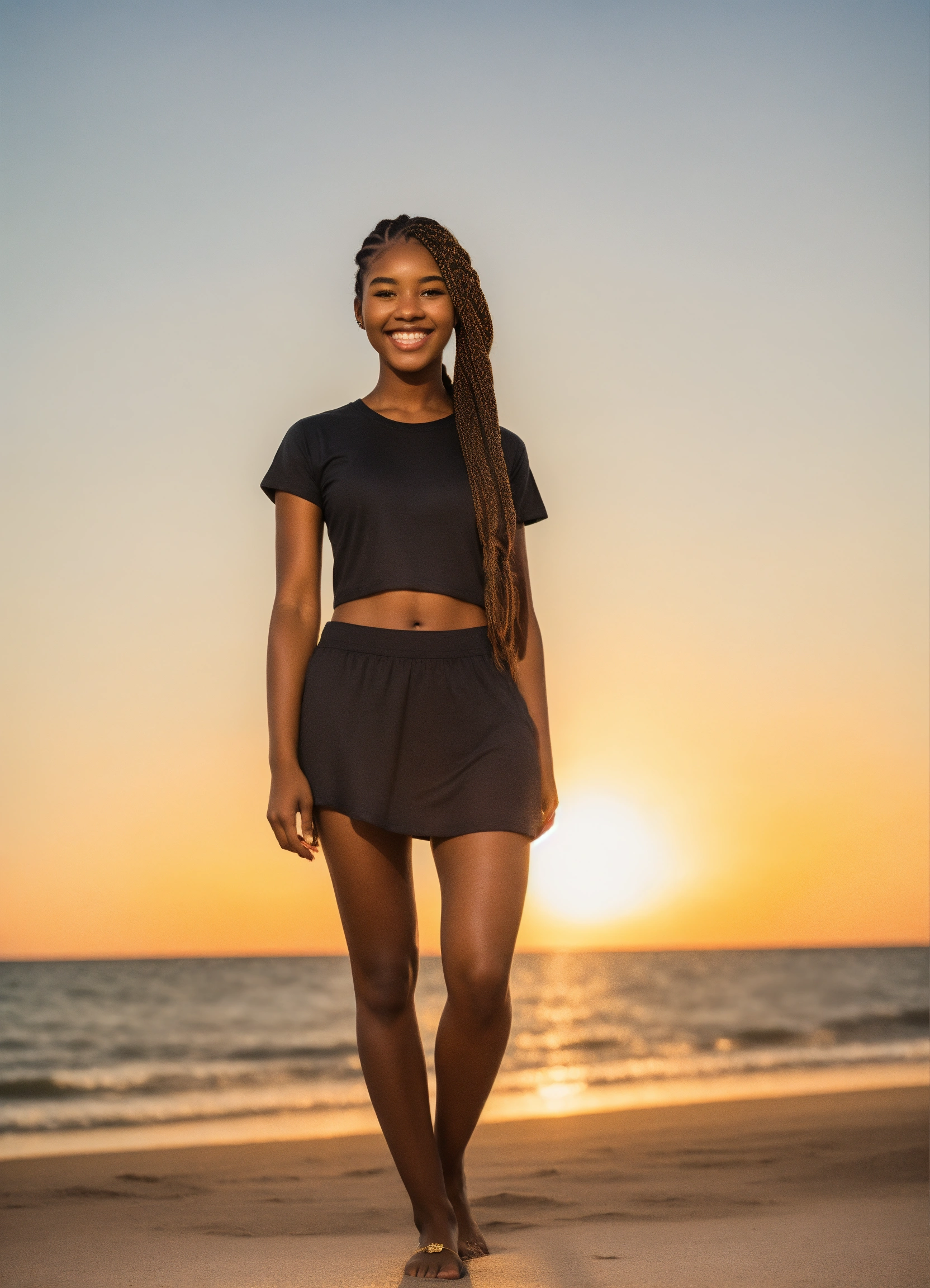 Knees up photo of one happy 20 yr old black female model who has a rounded face and happy eyes, with beautiful long braids, modeling plain blank black t-shirt, skirt, at golden hour by gulf of mexico. front of tee shirt needs to be visible and blank.