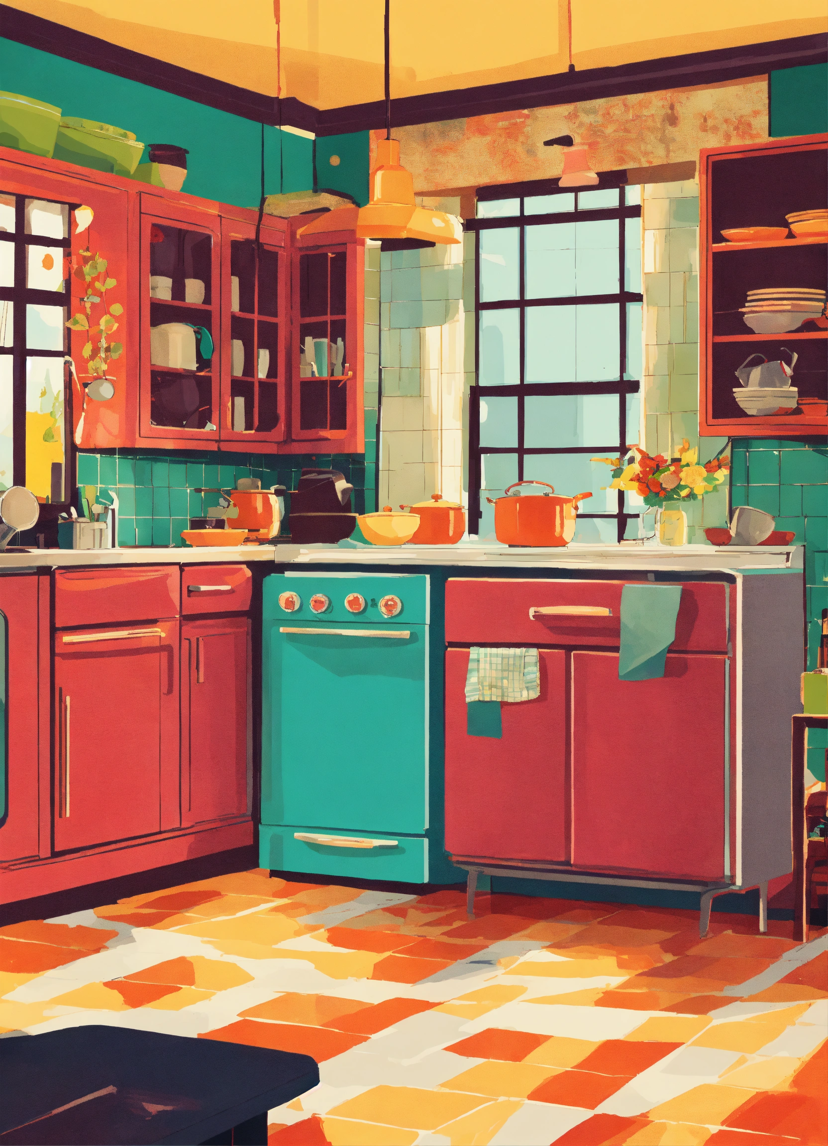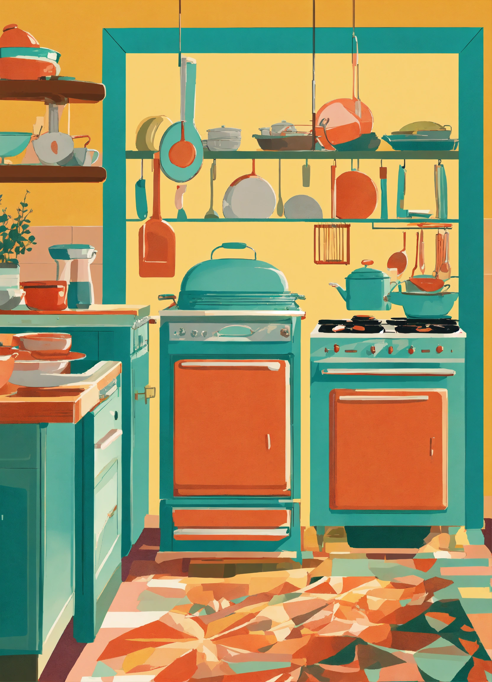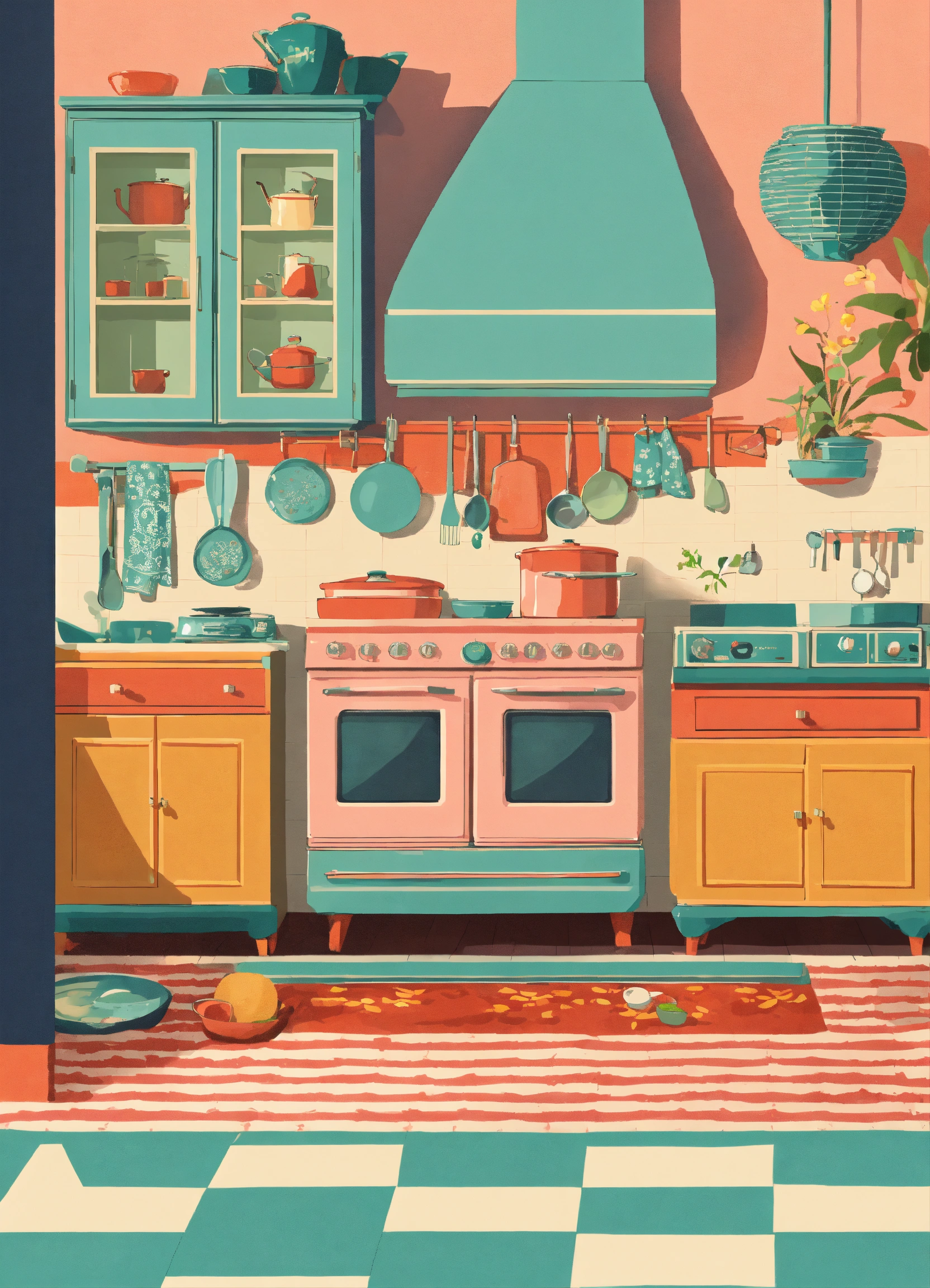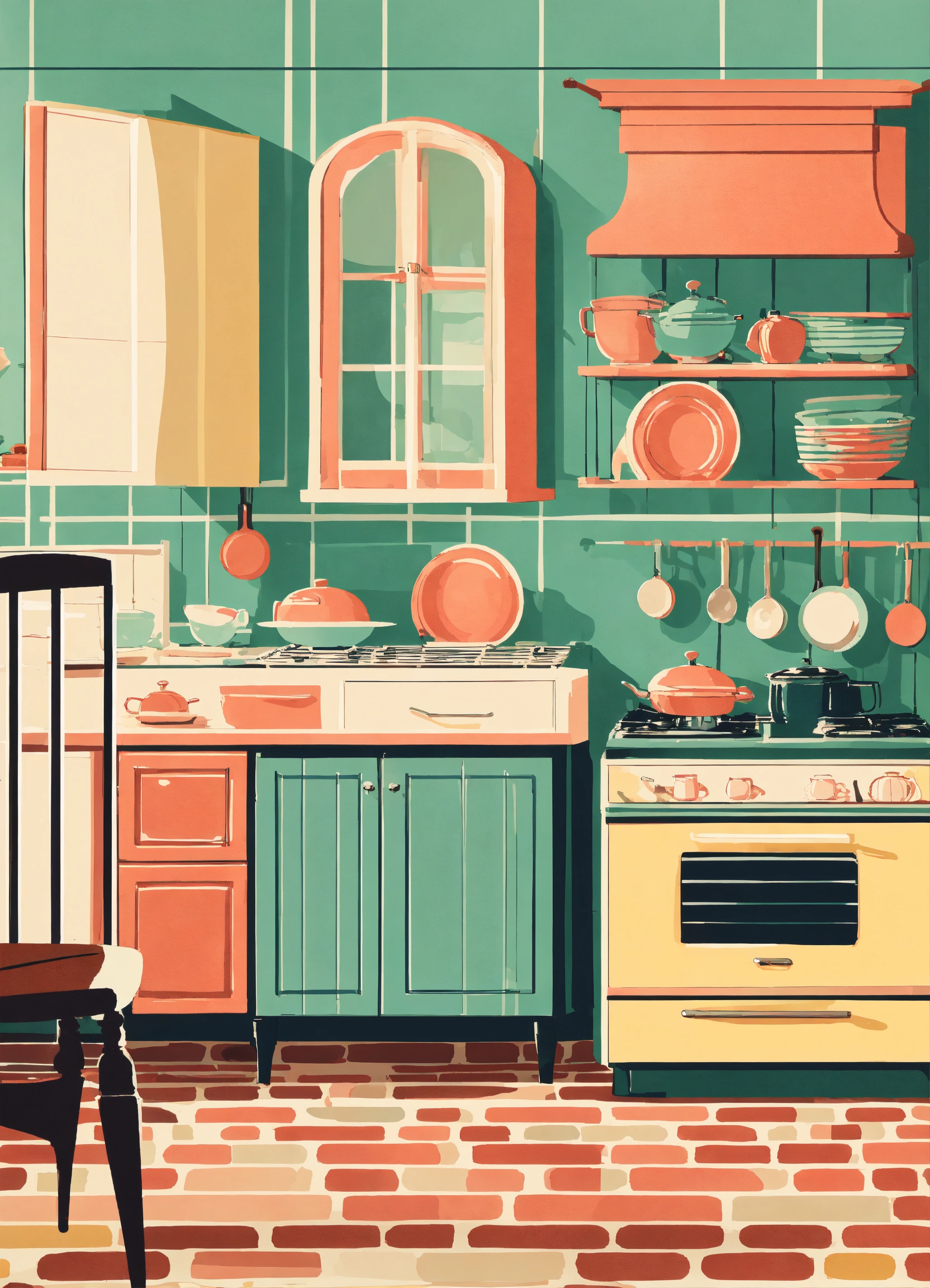 An illustration of a retro-inspired kitchen scene, with vintage appliances, retro dishes, and colorful cooking utensils. use a playful color palette and whimsical details. --v 5 --stylize 500