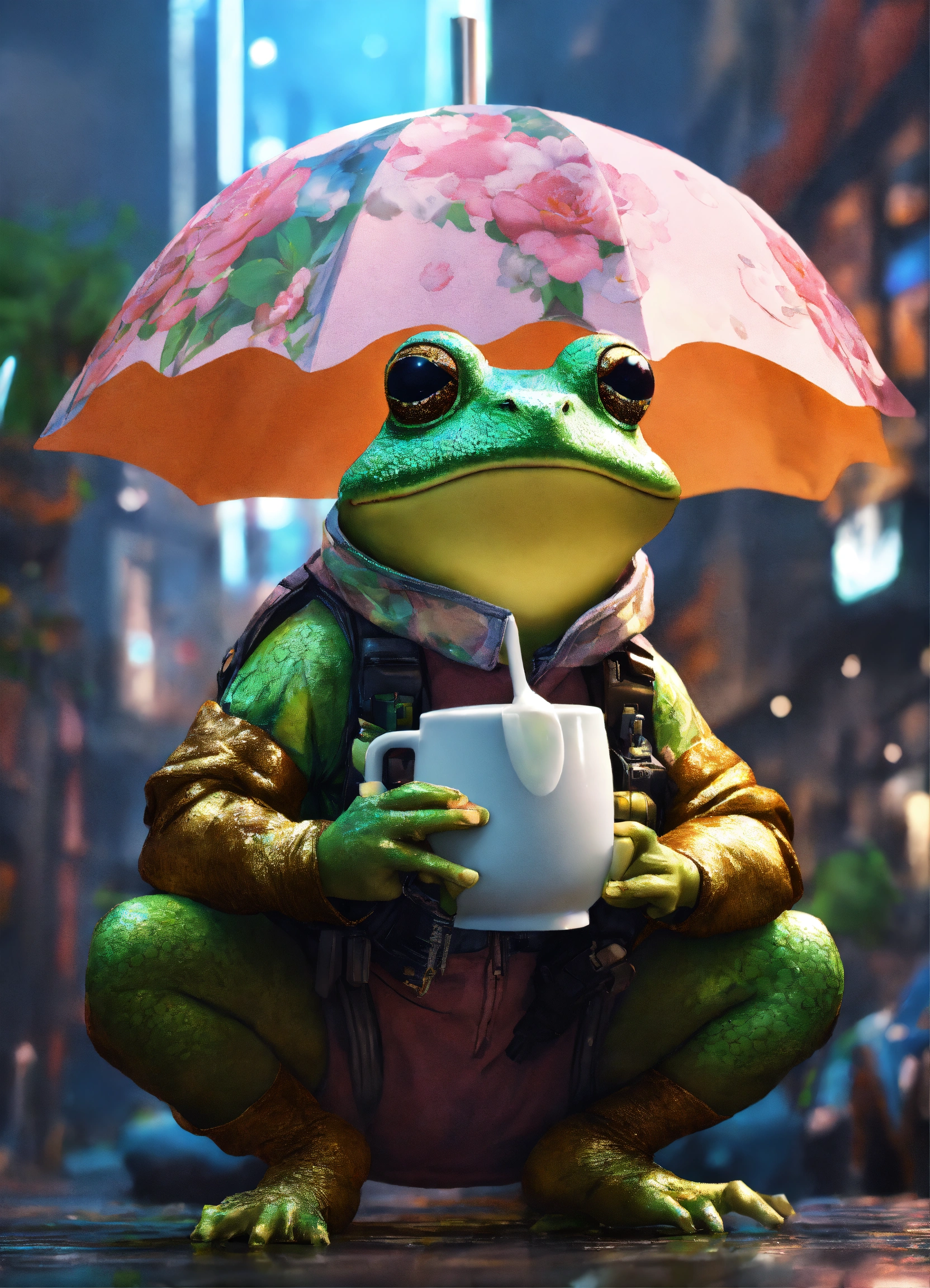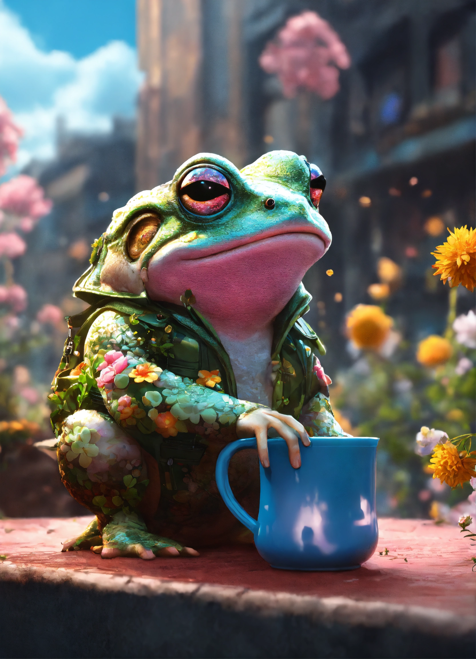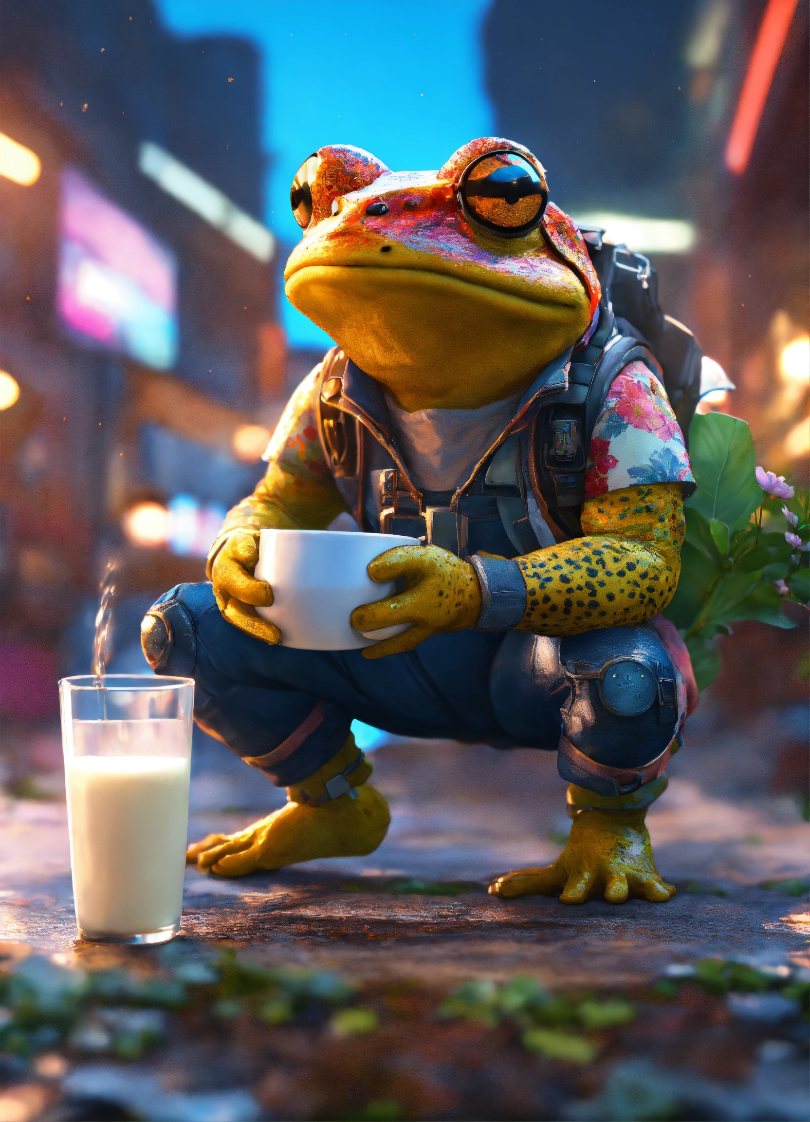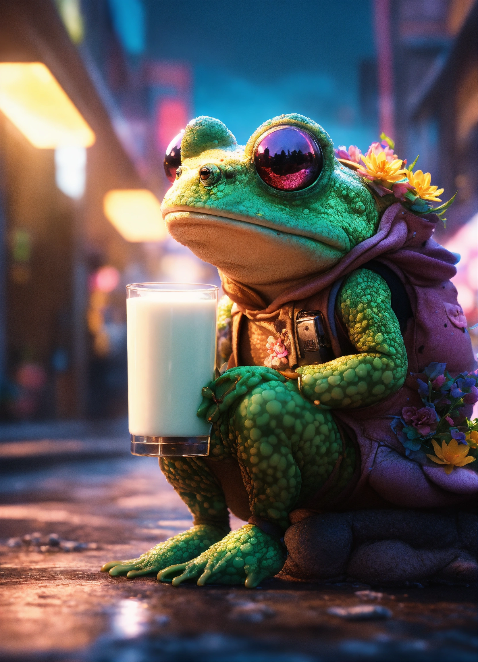A toad drinking milk slice of life anime, cyberpunk style, of a person in urban floral wear, with a cloud as a head, photorealistic, volumetric lighting, 8k, highly detailed