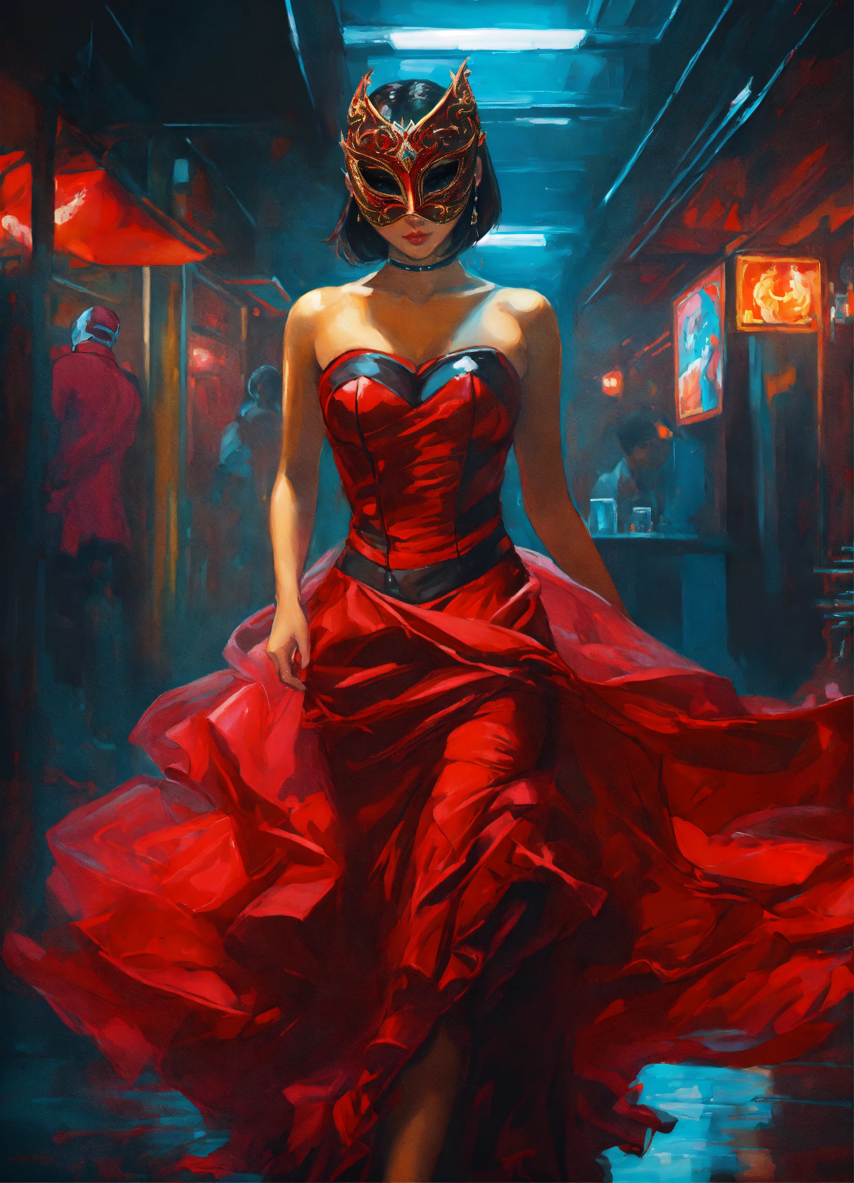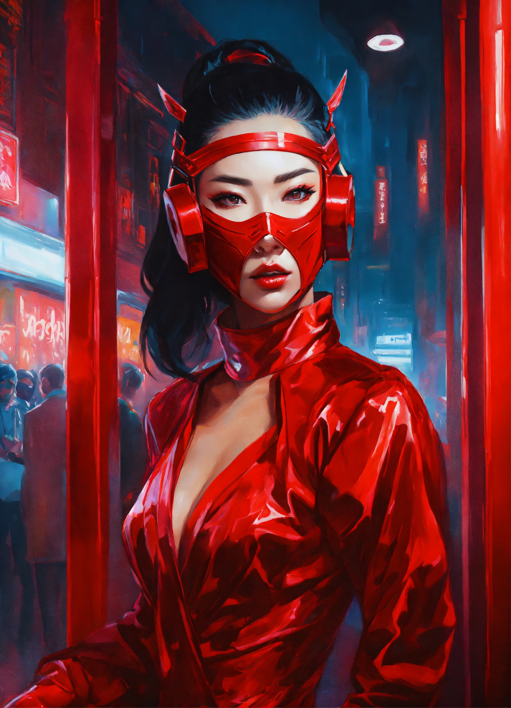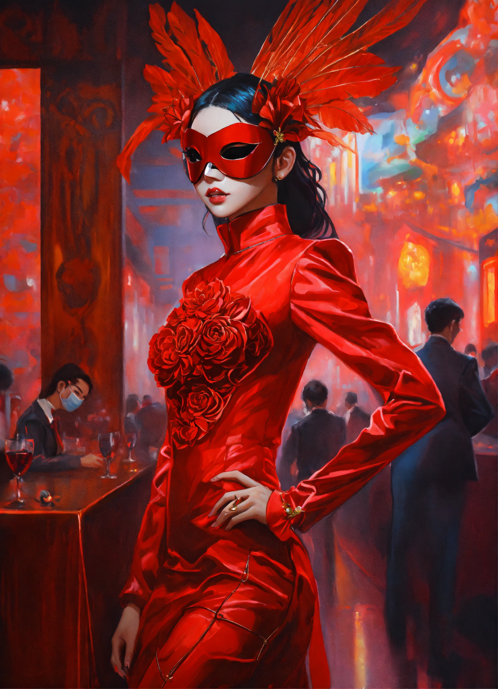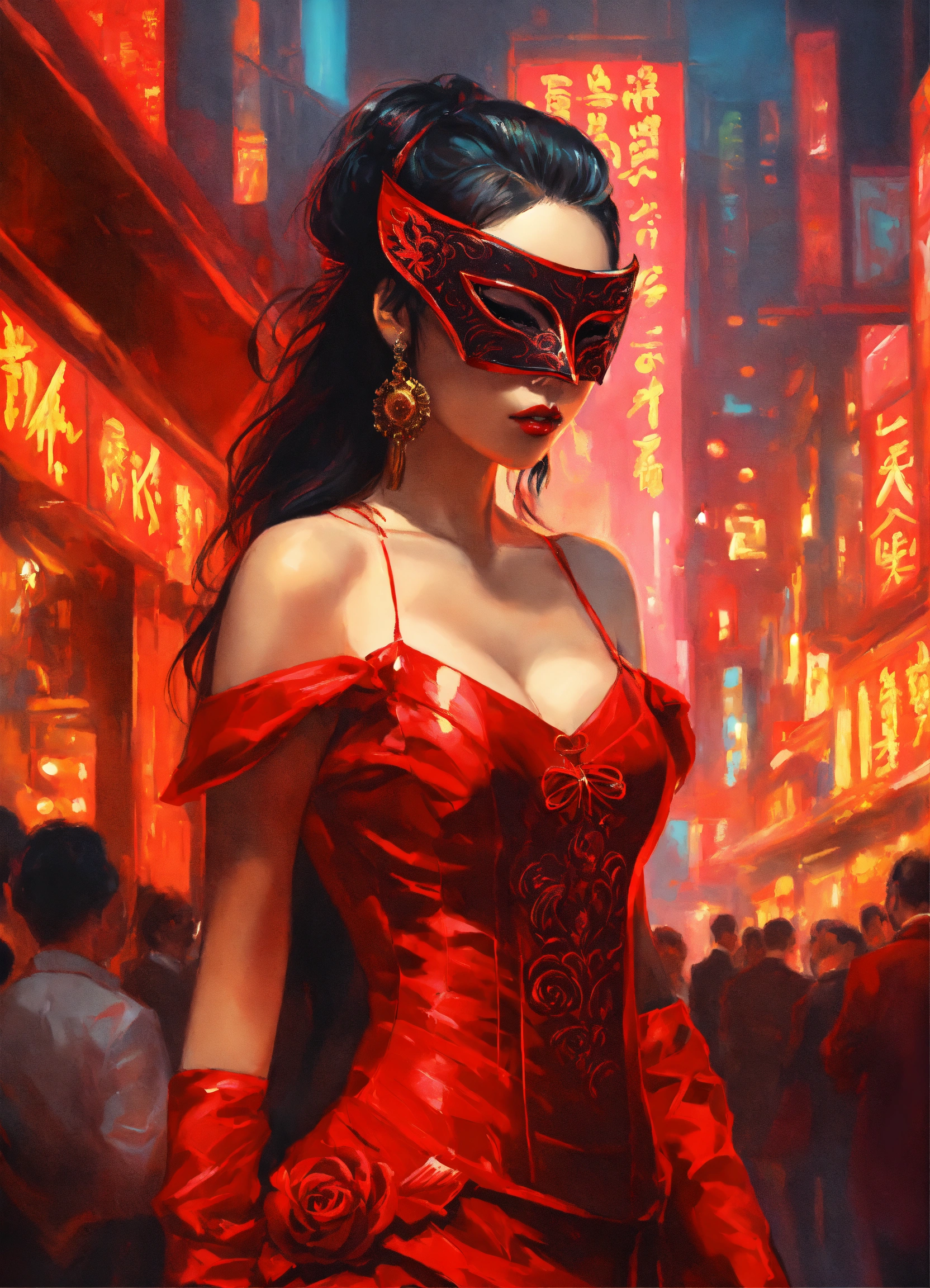 Asian cyberpunk feme fatale in expensive red dress with mask at a masquerade ball smart but dangerous in a high-tech club, highly realistic oil painting
