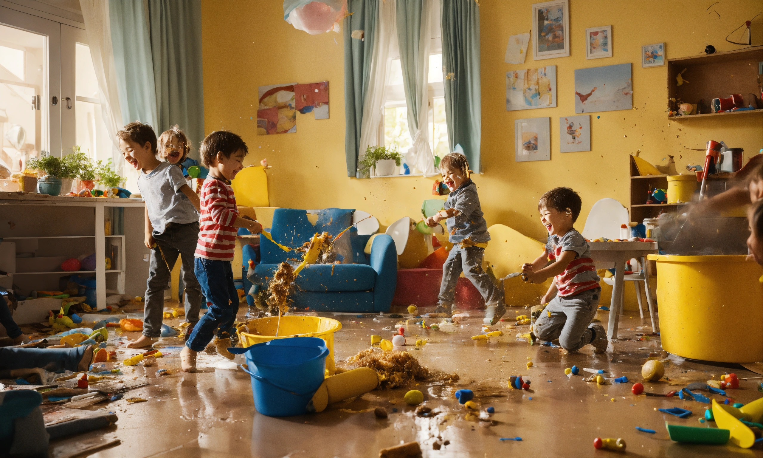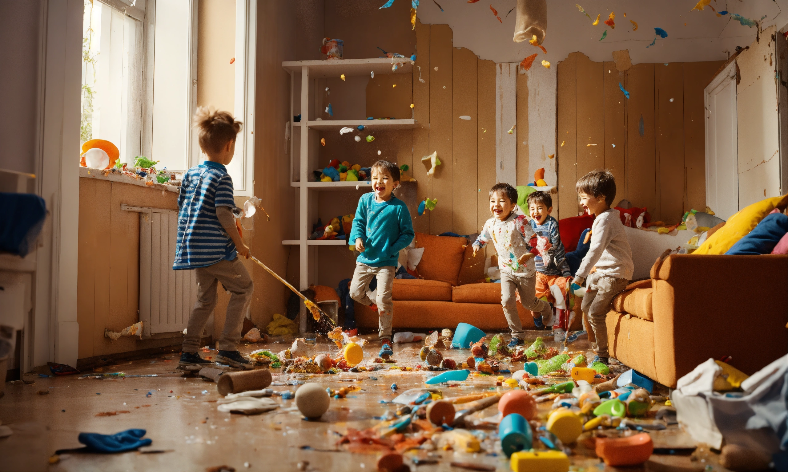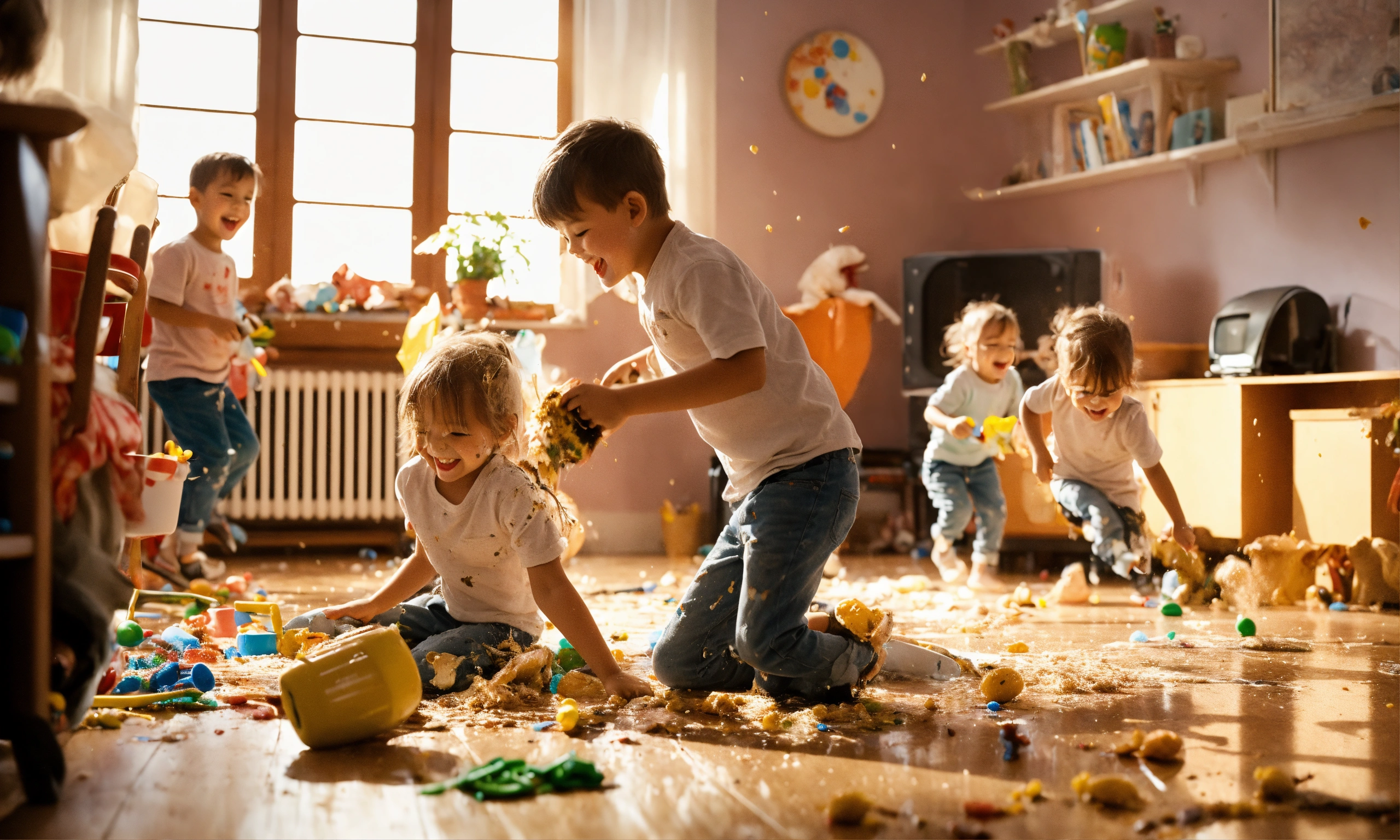 Six cheerful and active children make a mess of their house