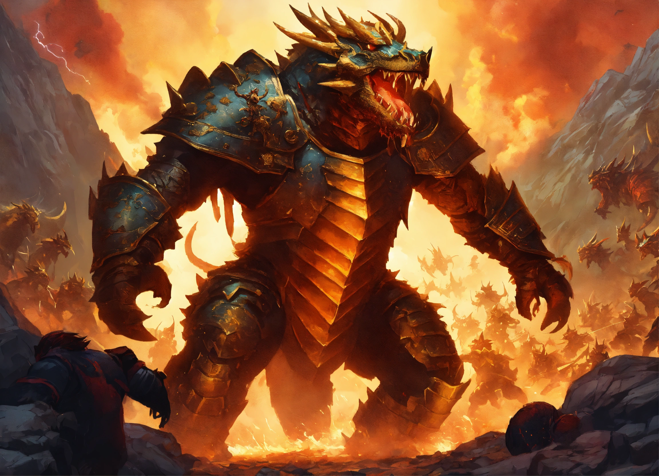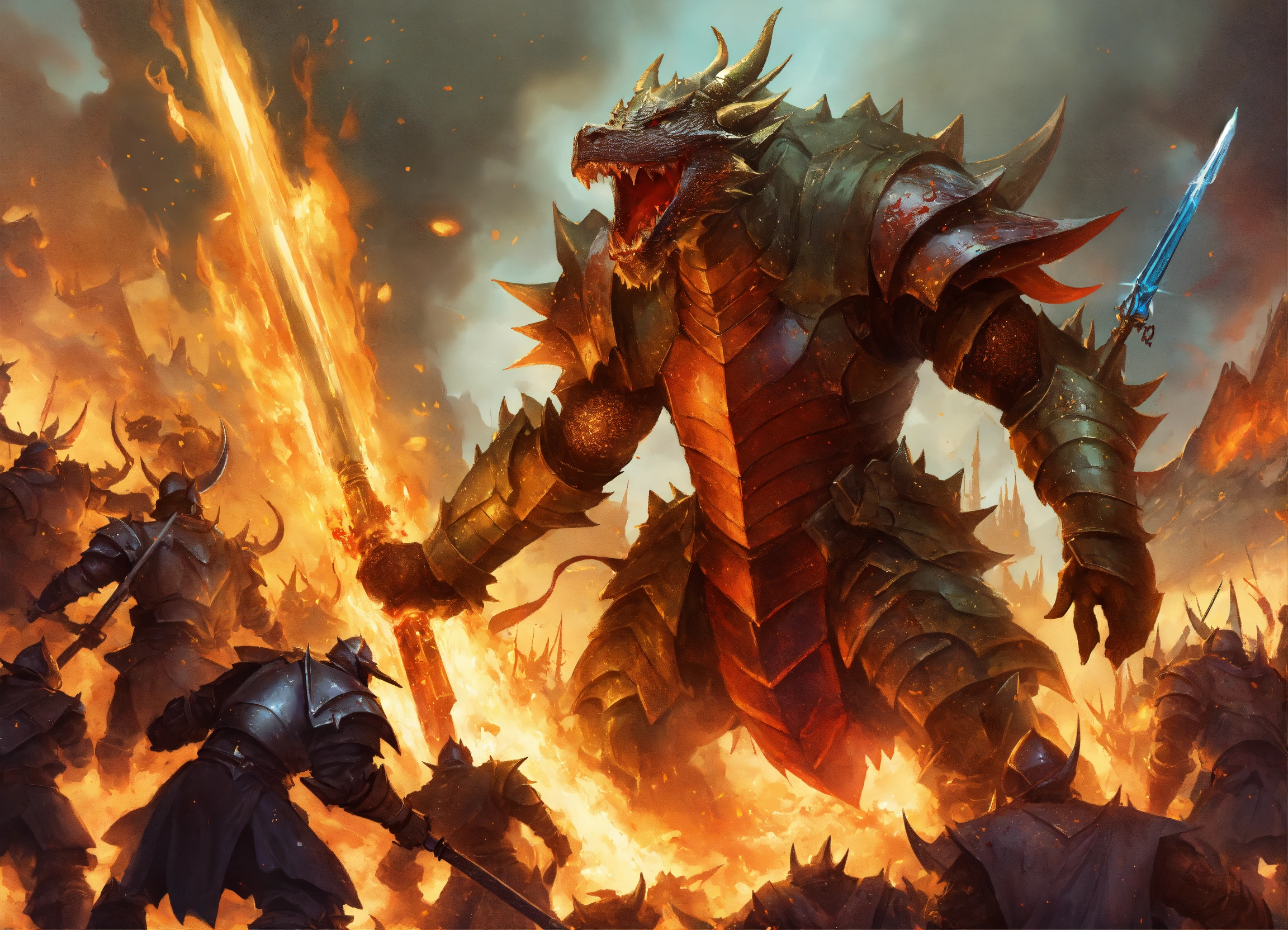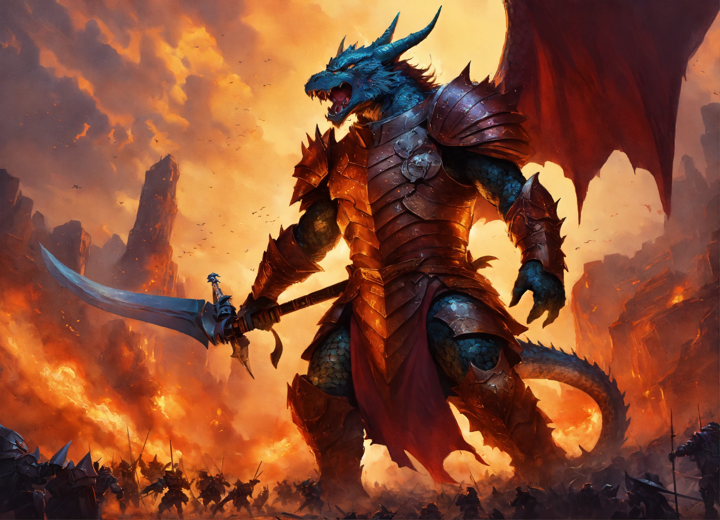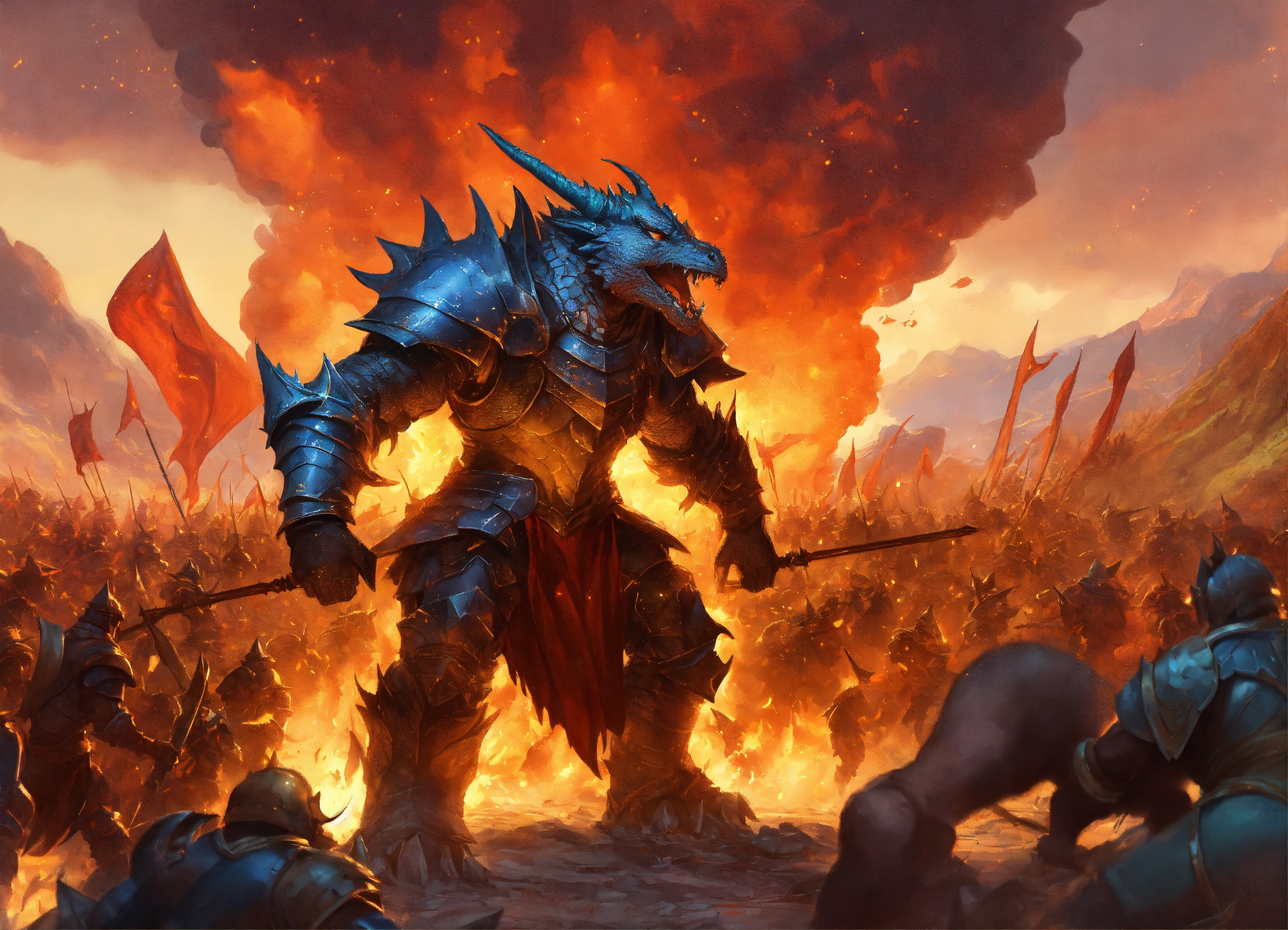 In a devastating fantasy battle, a giant dragonborn in plate armor of many colors stands before a massive army of humanoids, emanating explosive power, killing people, causing havoc on the lands, fantasy setting, comic book art