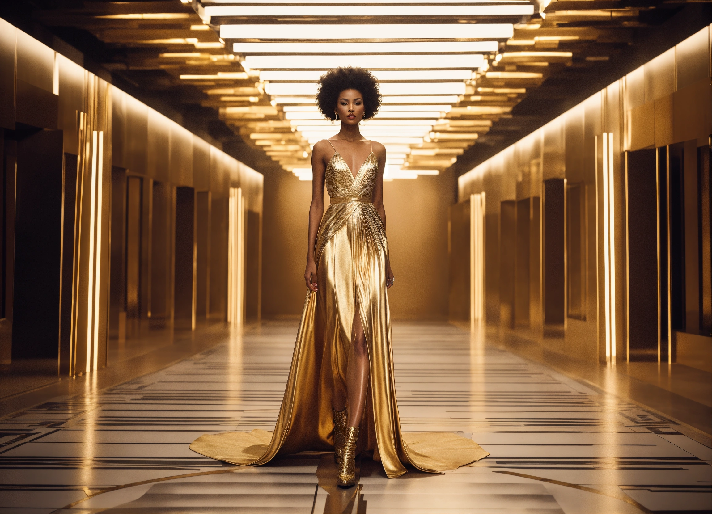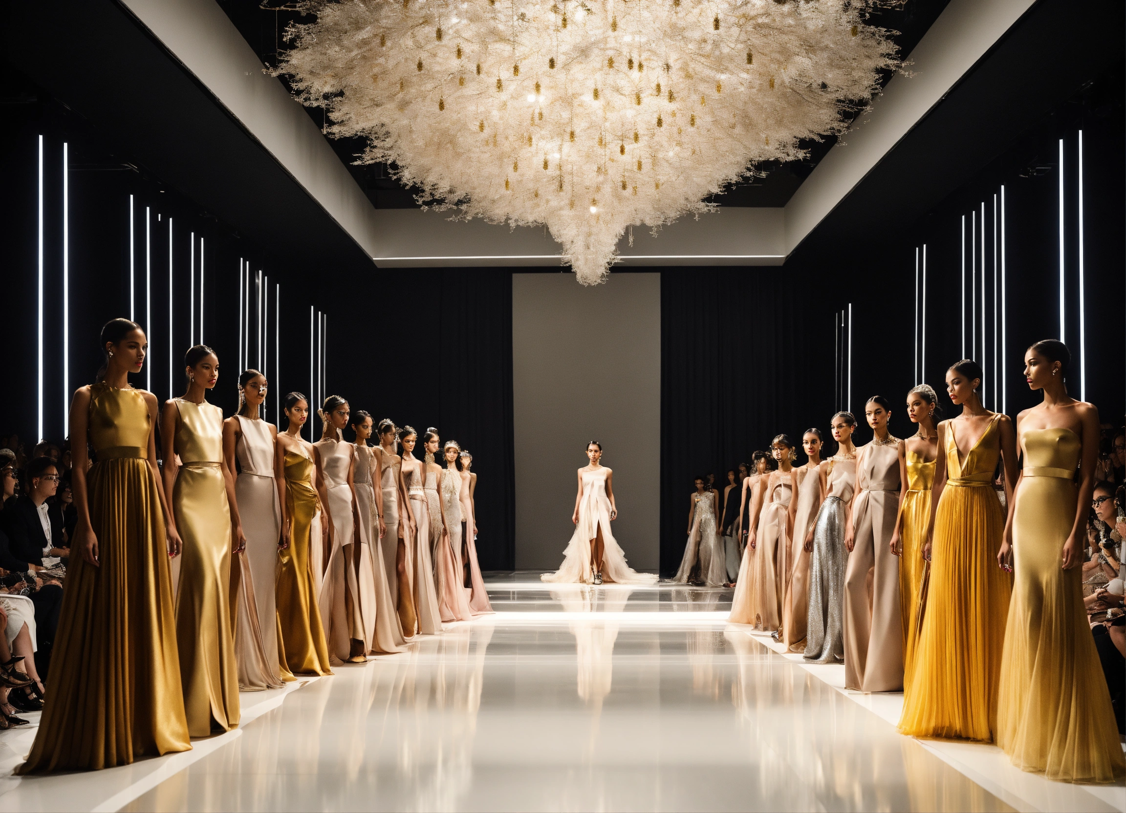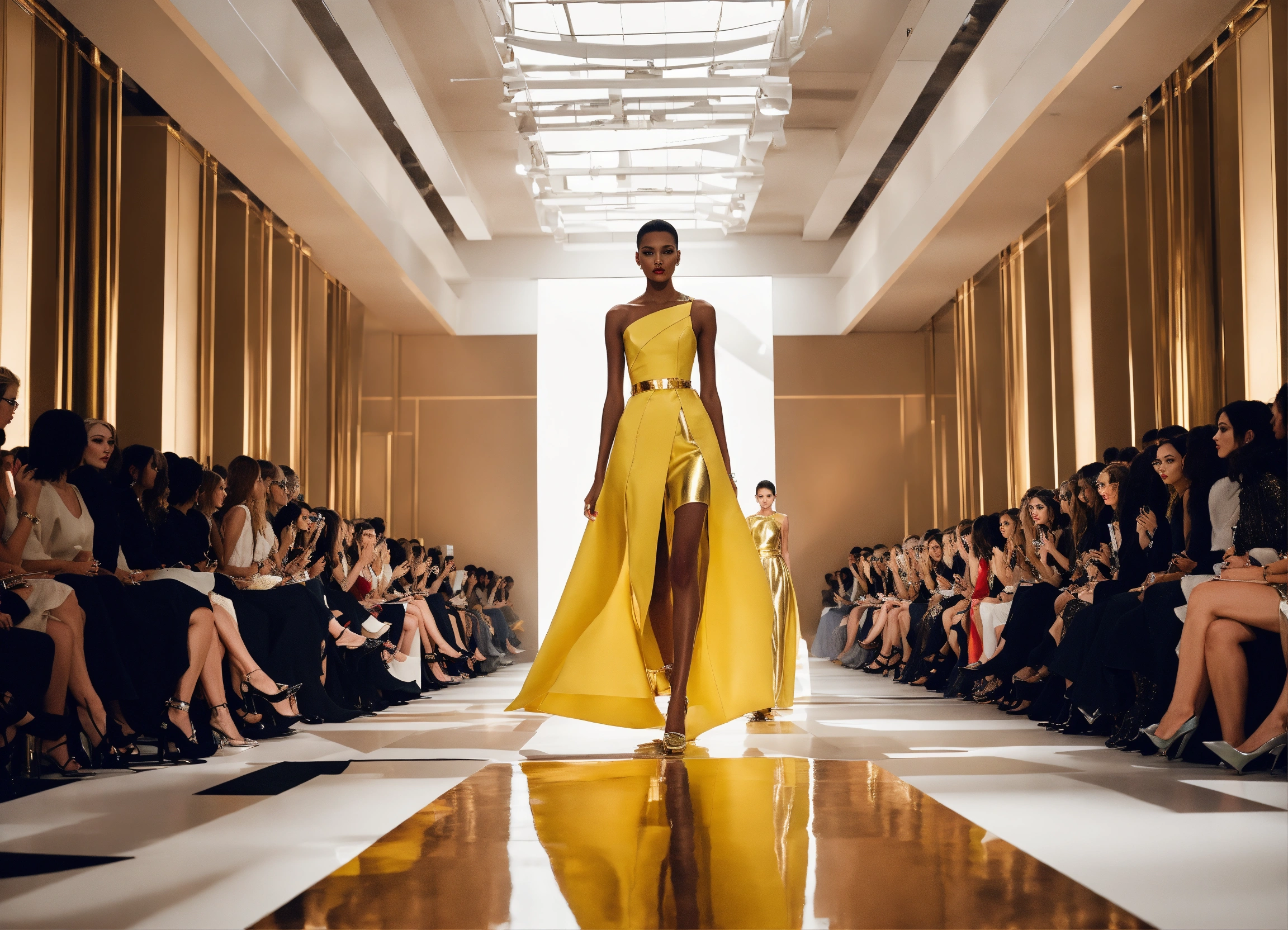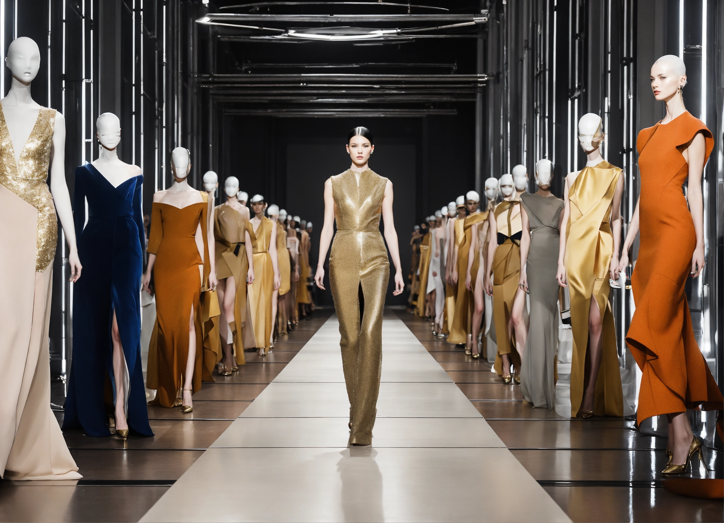 A womens high fashion haute couture runway showing off the expensive, chic, and trendy styles of the upcoming season in 2025. sketch, photography, or 3d rendering could all be appropriate techniques for this prompt. in a style reminiscent of futurism, with clean lines and a sleek aesthetic that reflects the modernity of the fashion industry. the fusion of contemporary and classic elements with a focus on geometric shapes and architectural fashion designs. a minimalist color palette, consisting of vibrant hues with pops of metallic silver and gold, lending an air of elegance and sophistication to the scene. high key lighting from overhead spotlights to create clear and defined shadows, adding depth and drama to the runway presentation.
