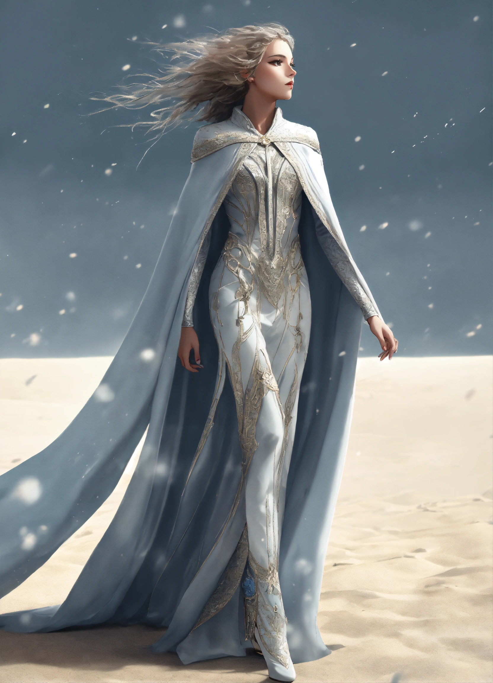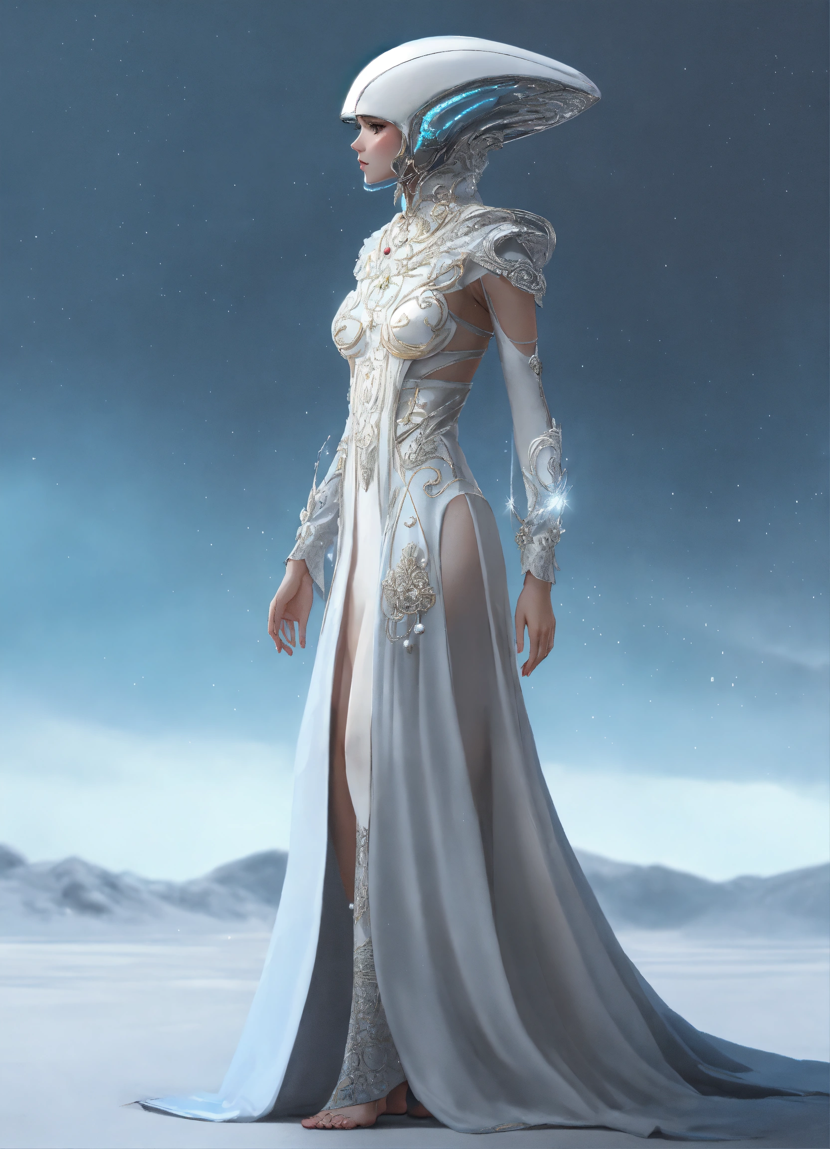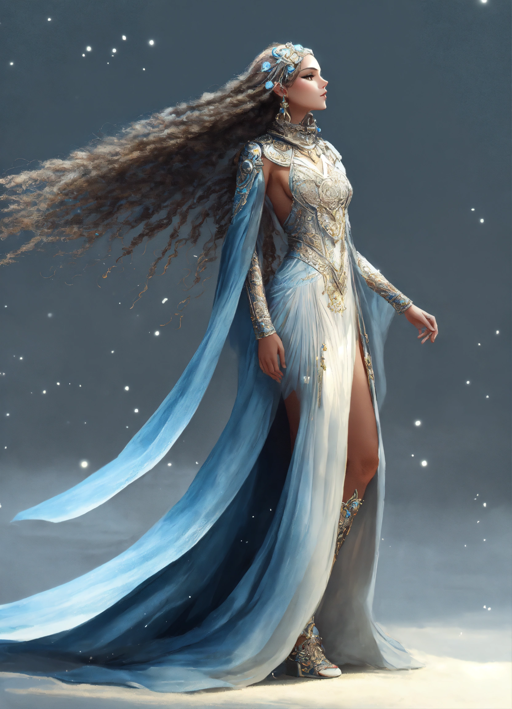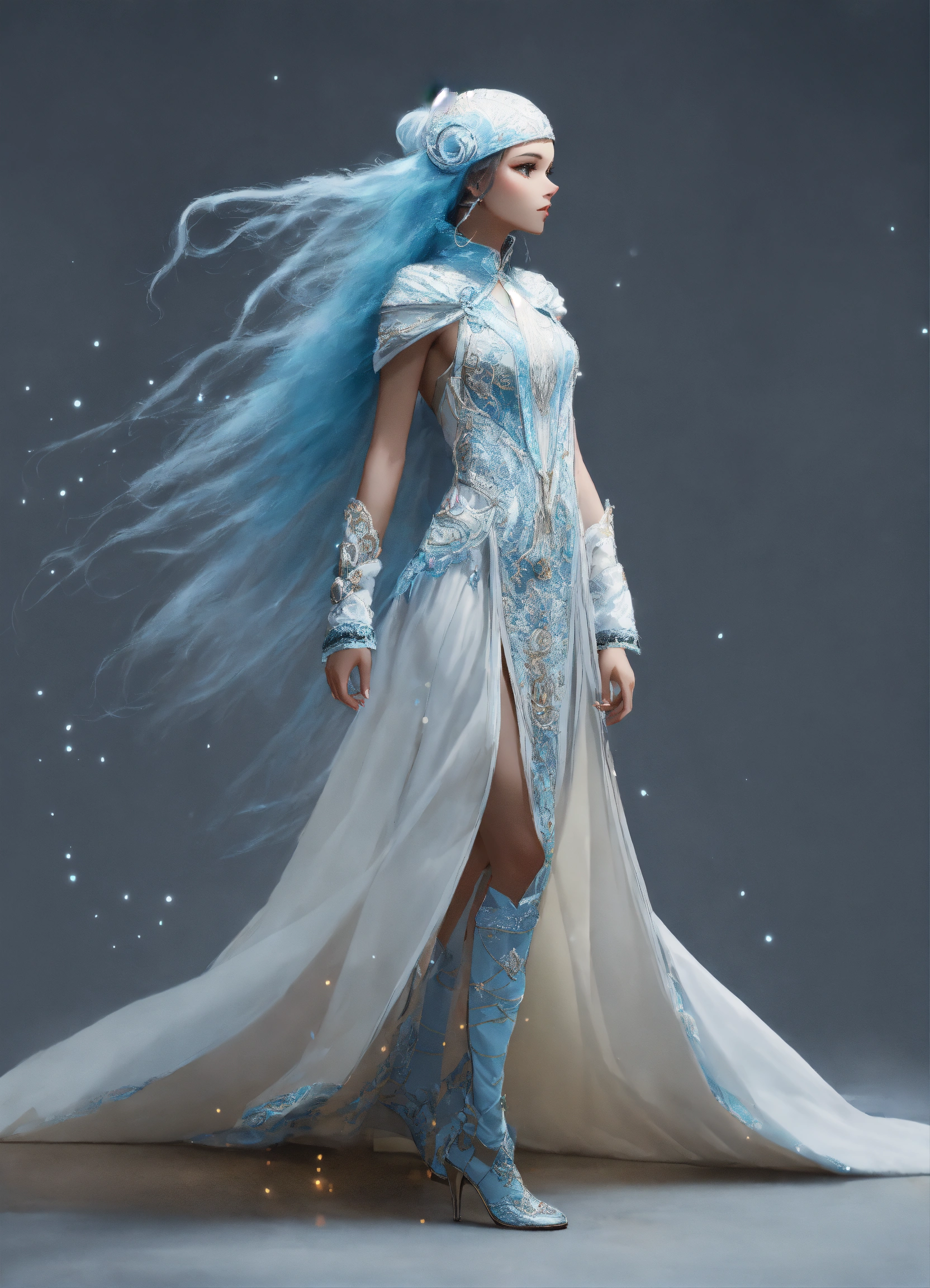A alien, woman with a long beutiful dress, winter cape hippiestyle with rastahair, vibrand soft light blue and pearl white, silver decoreted clothings, full body wide shot, walking pose, side view, intricate, sharp_focus, concept_art, simple white backround