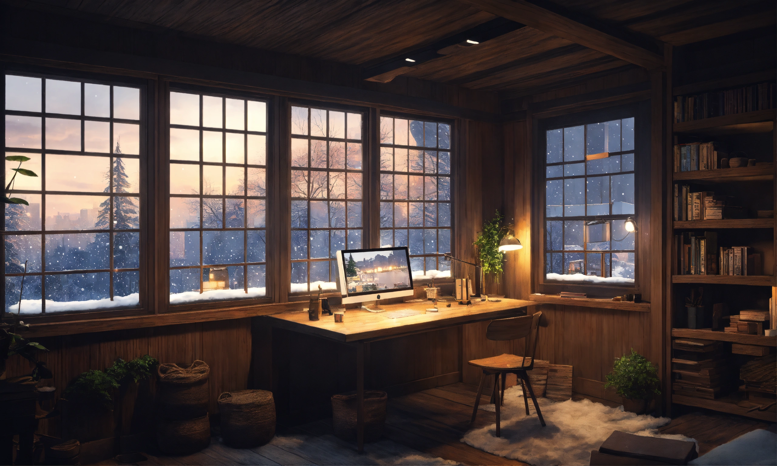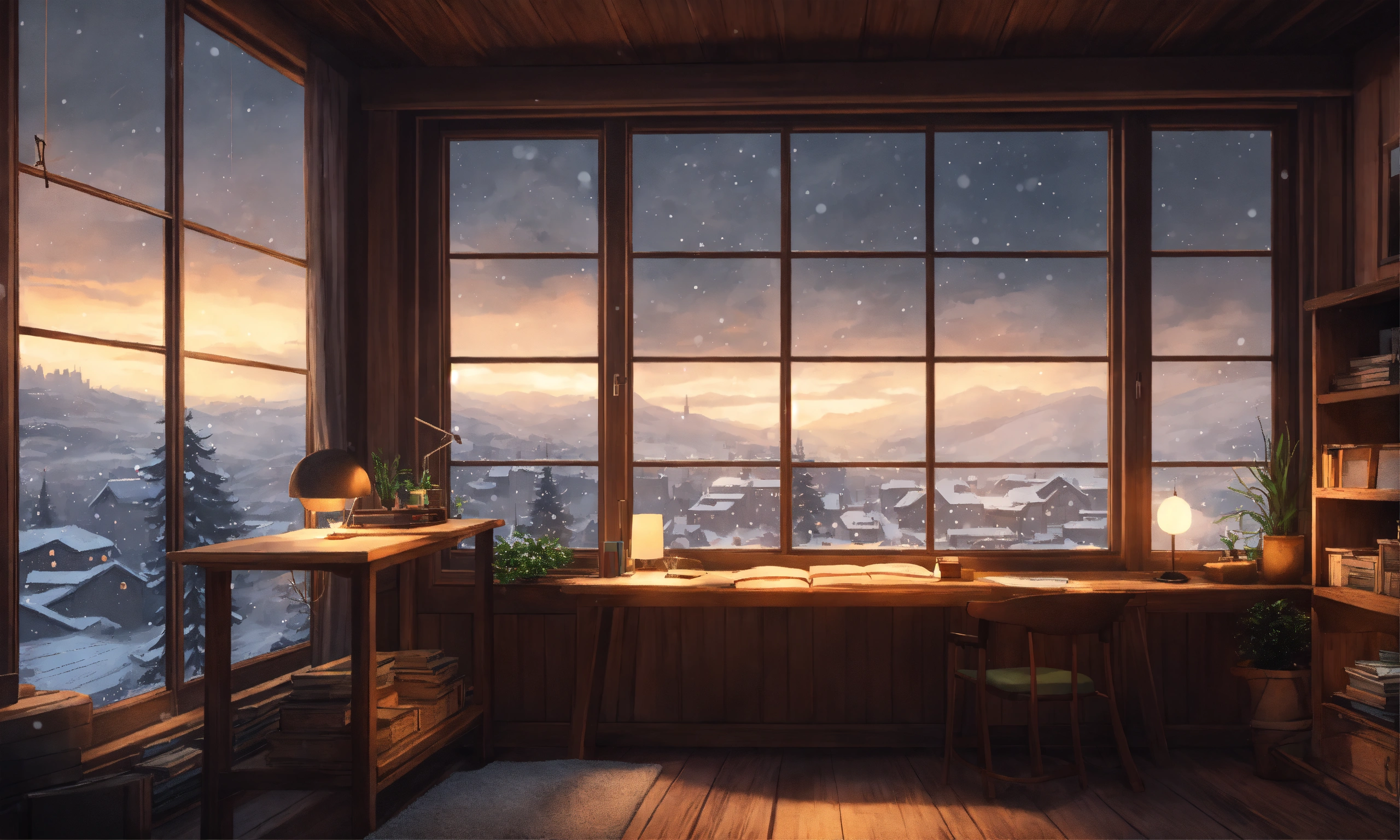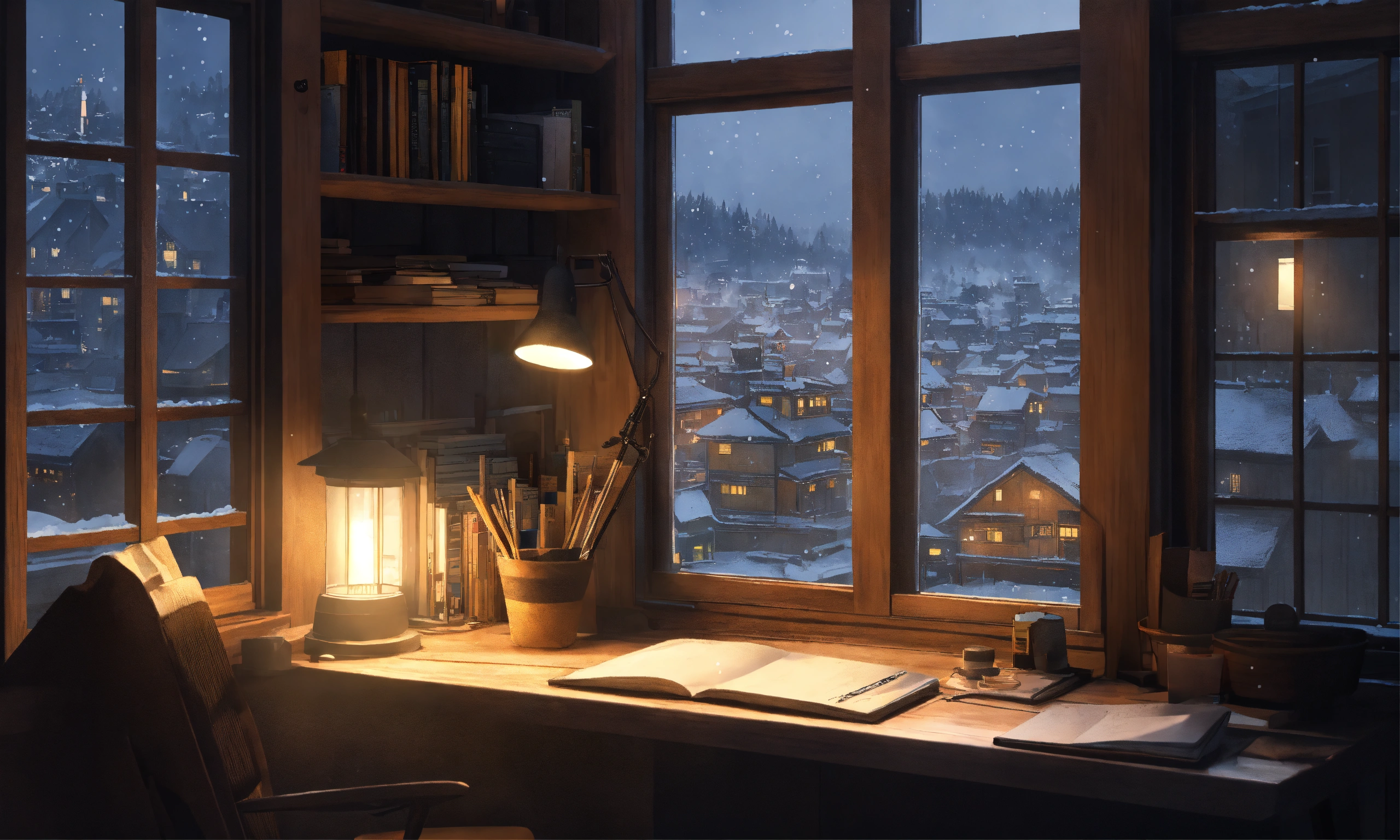 Study room in forrest cabin, studio ghibli, big centered window view over city buildings, wooden desk against window, snowing outside the window and winter night, wooden tints, dark grey washed colors, anime/lofi style, minimalistic design
