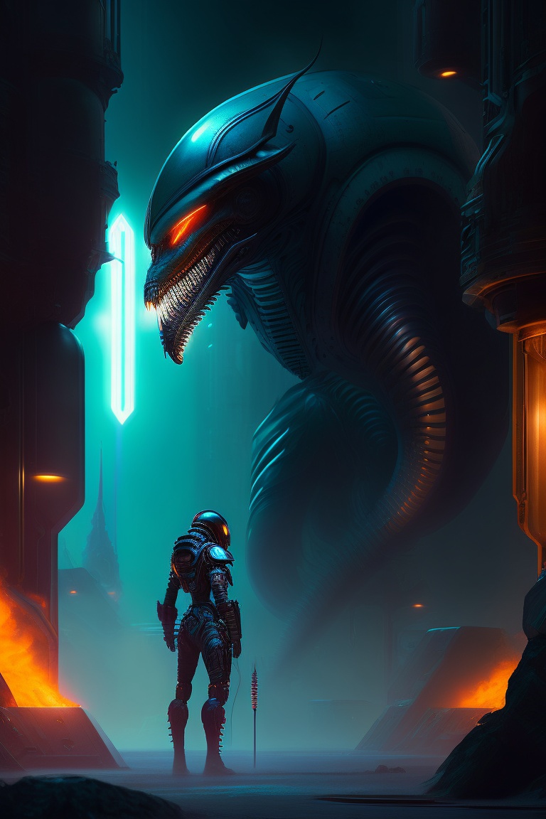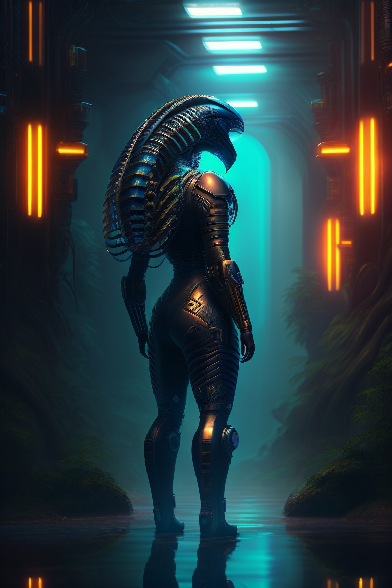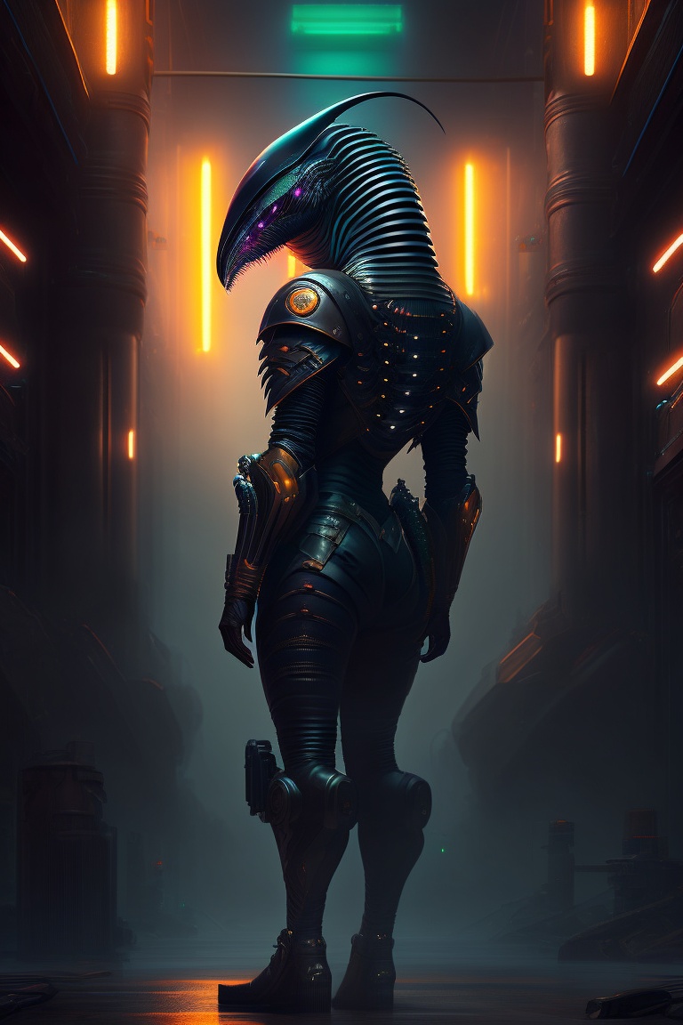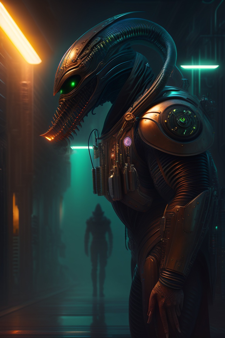 Xenomorph, full body cinematic style digital art render with mechanical and futuristic details in a cyberpunk underworld, moody atmospheric lighting, bizarre, dangerous, art by boris vallejo and giger.