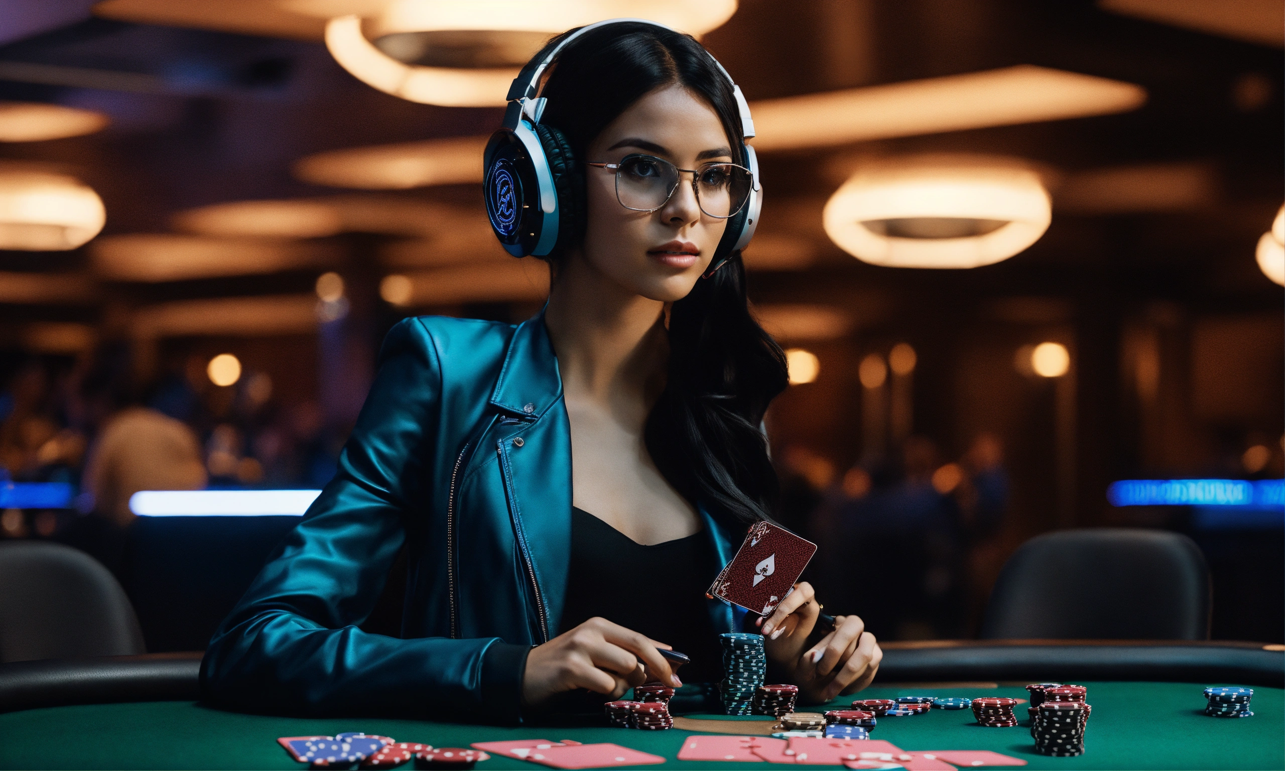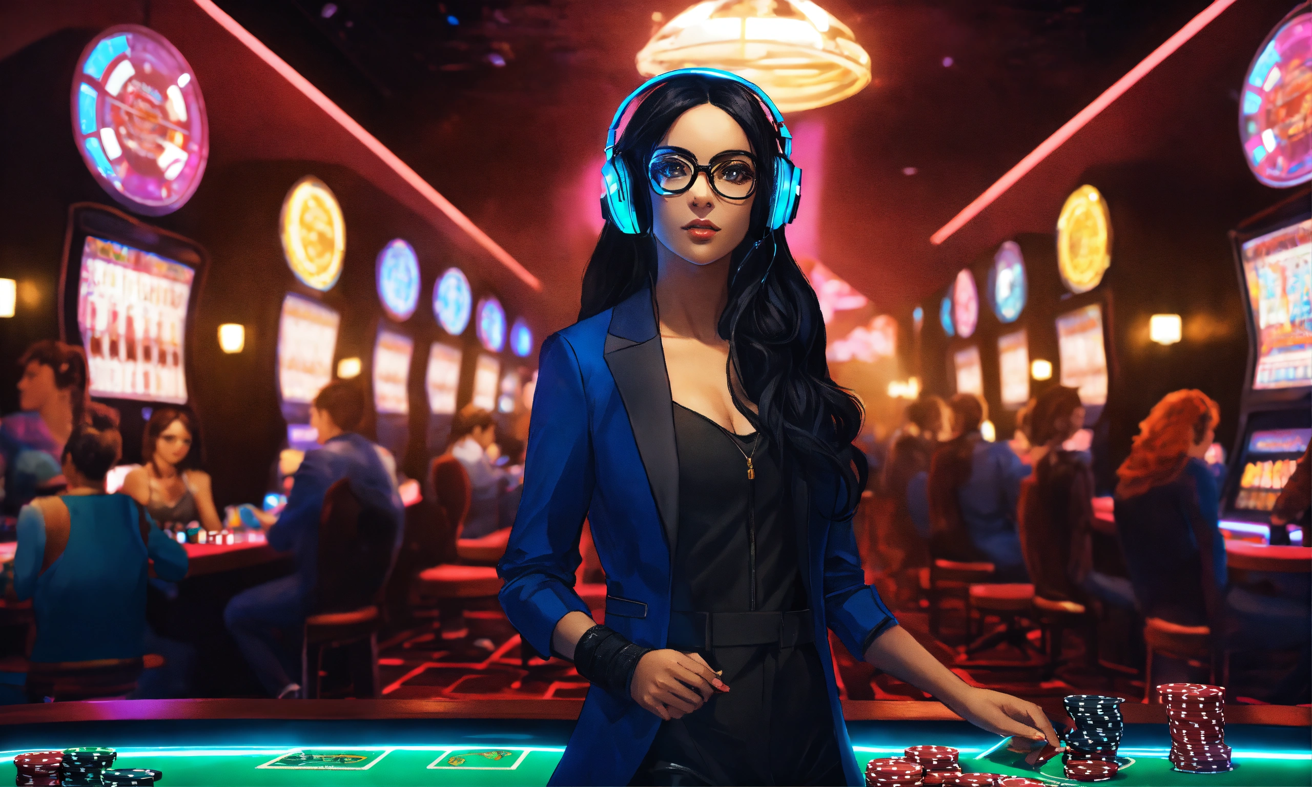 A female protagonist with black long hair in glasses and headphones, in a fashionable outfit, stands at the poker room with cards in her hands with a futuristic touch.
