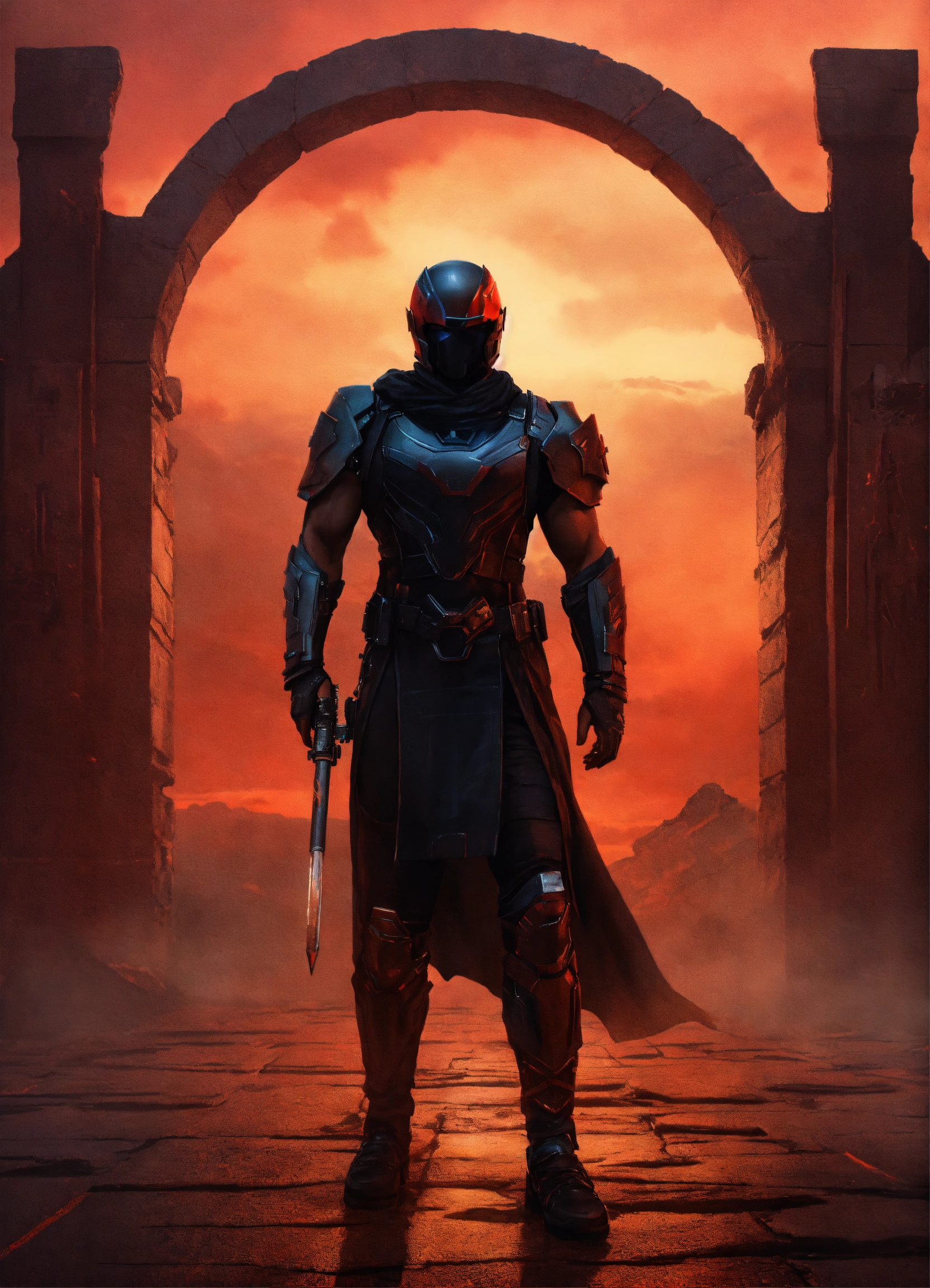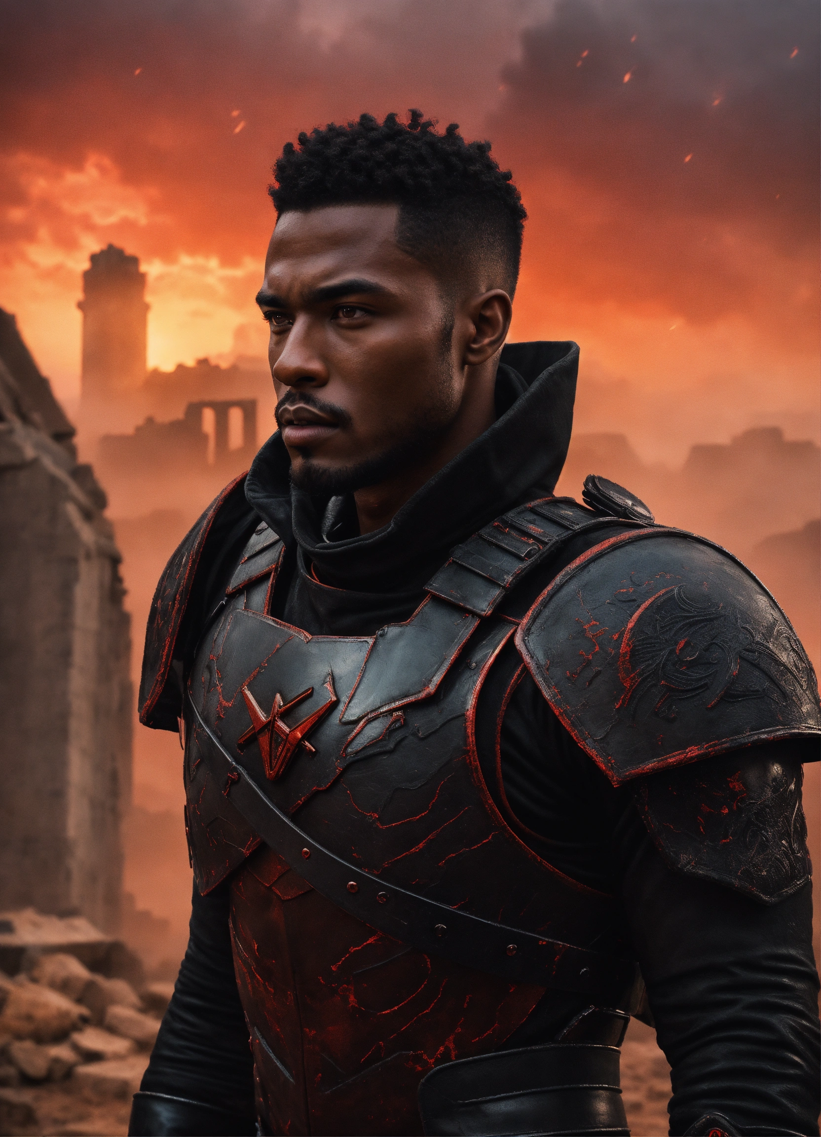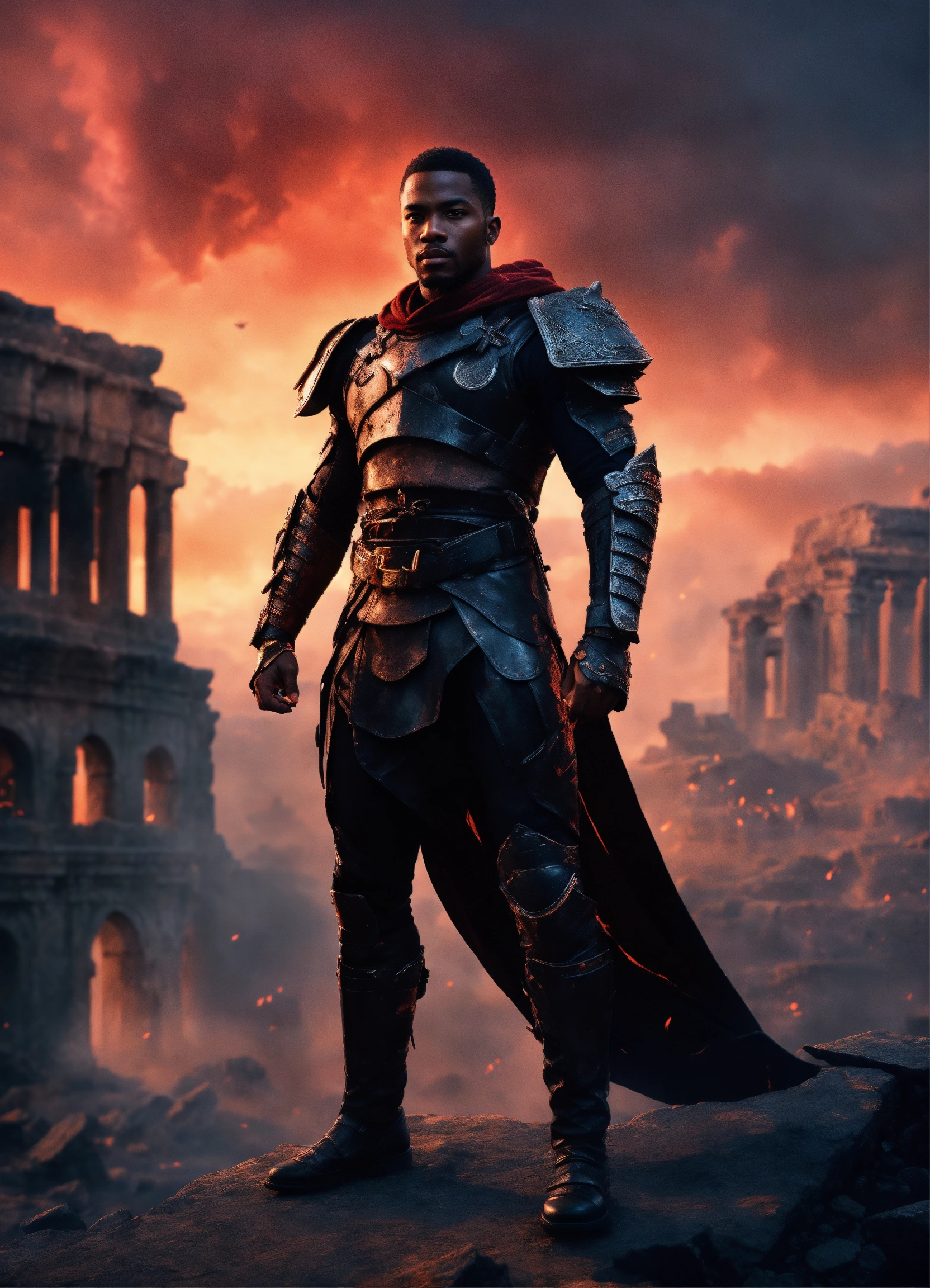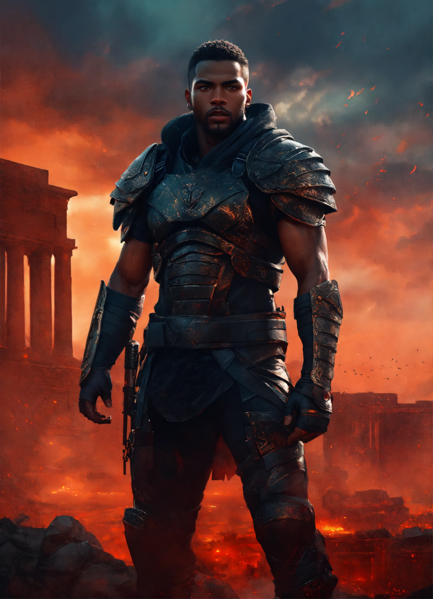 Young strong handsome black futuristic warrior, front facing in an ancient arena, front facing strong handsome god with short hair wearing a black leather super spy stealth suit, muscular dark skinned black male god warrior, short hair handsome male god, front facing, with ruins and a violent red sky behind him and warriors in the mist watching him, fantasy, high detail, realistic photo, high detail, digital painting, cinematic, stunning, hyper-realistic, sharp focus, high resolution 8k, insanely detailed