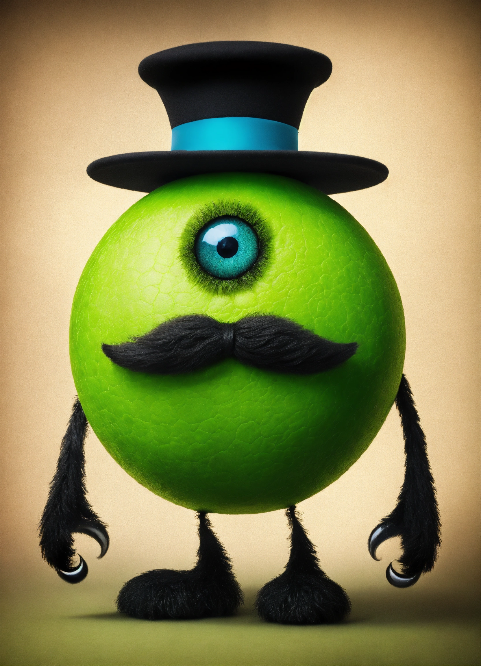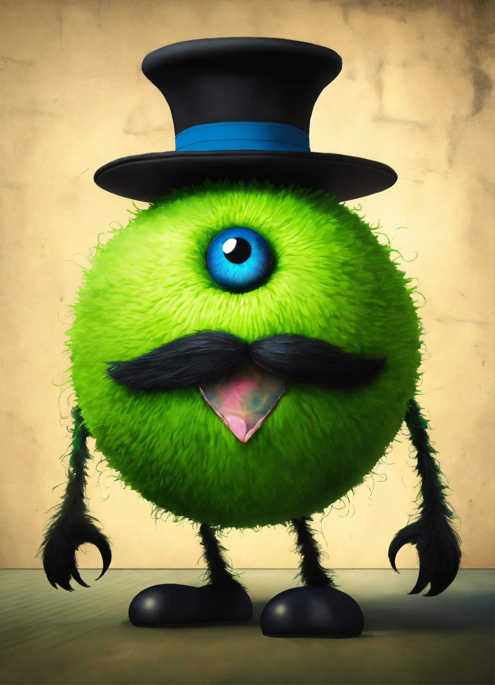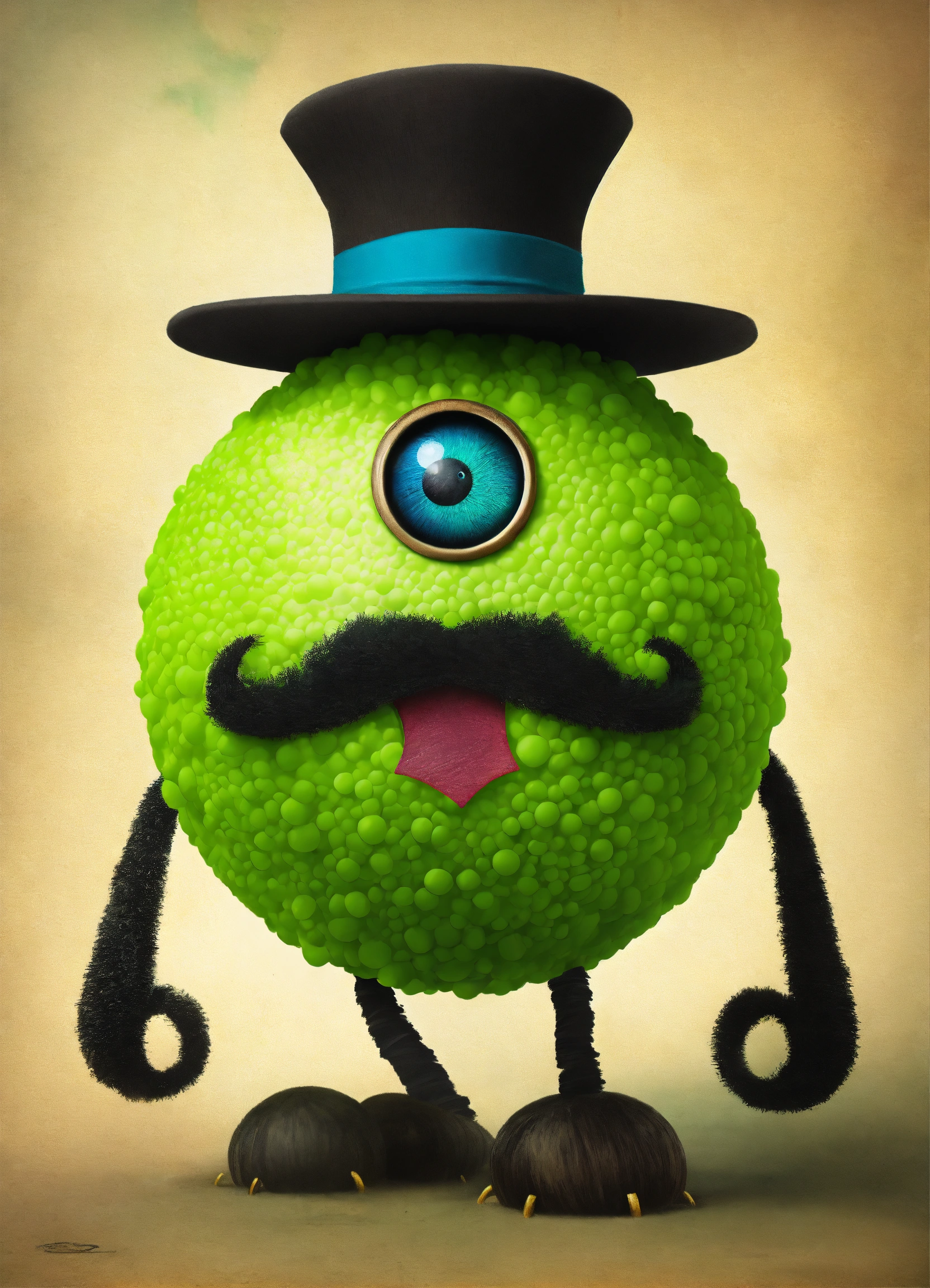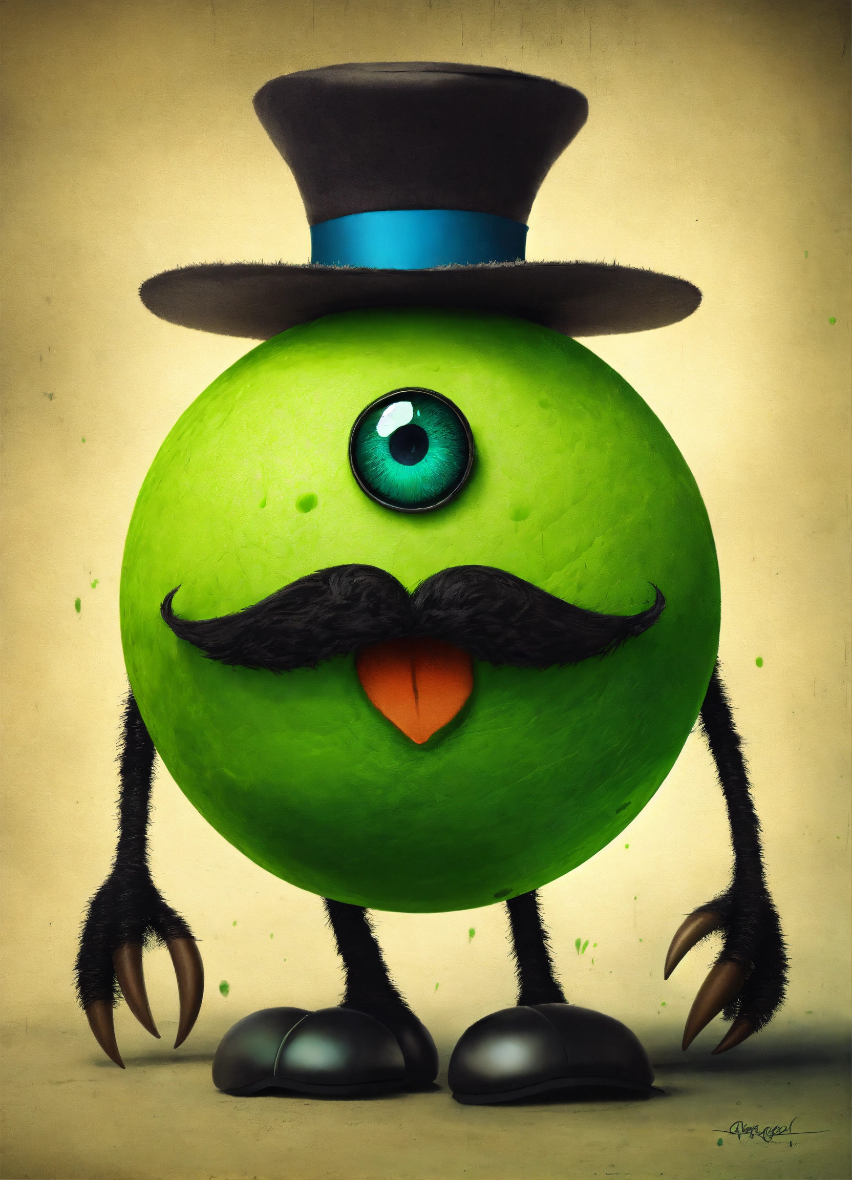 A green ball monster with a black mustache and a black hat