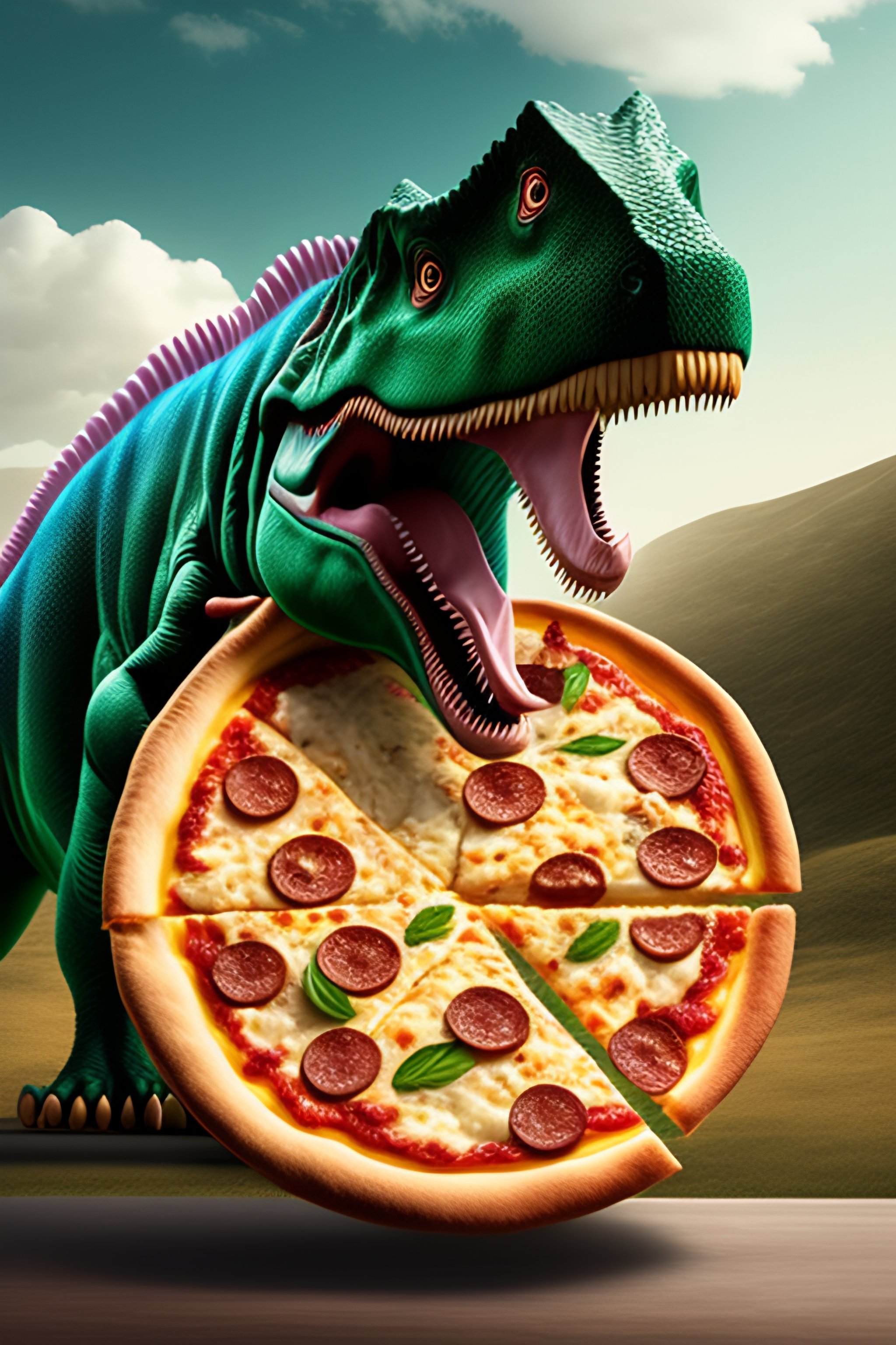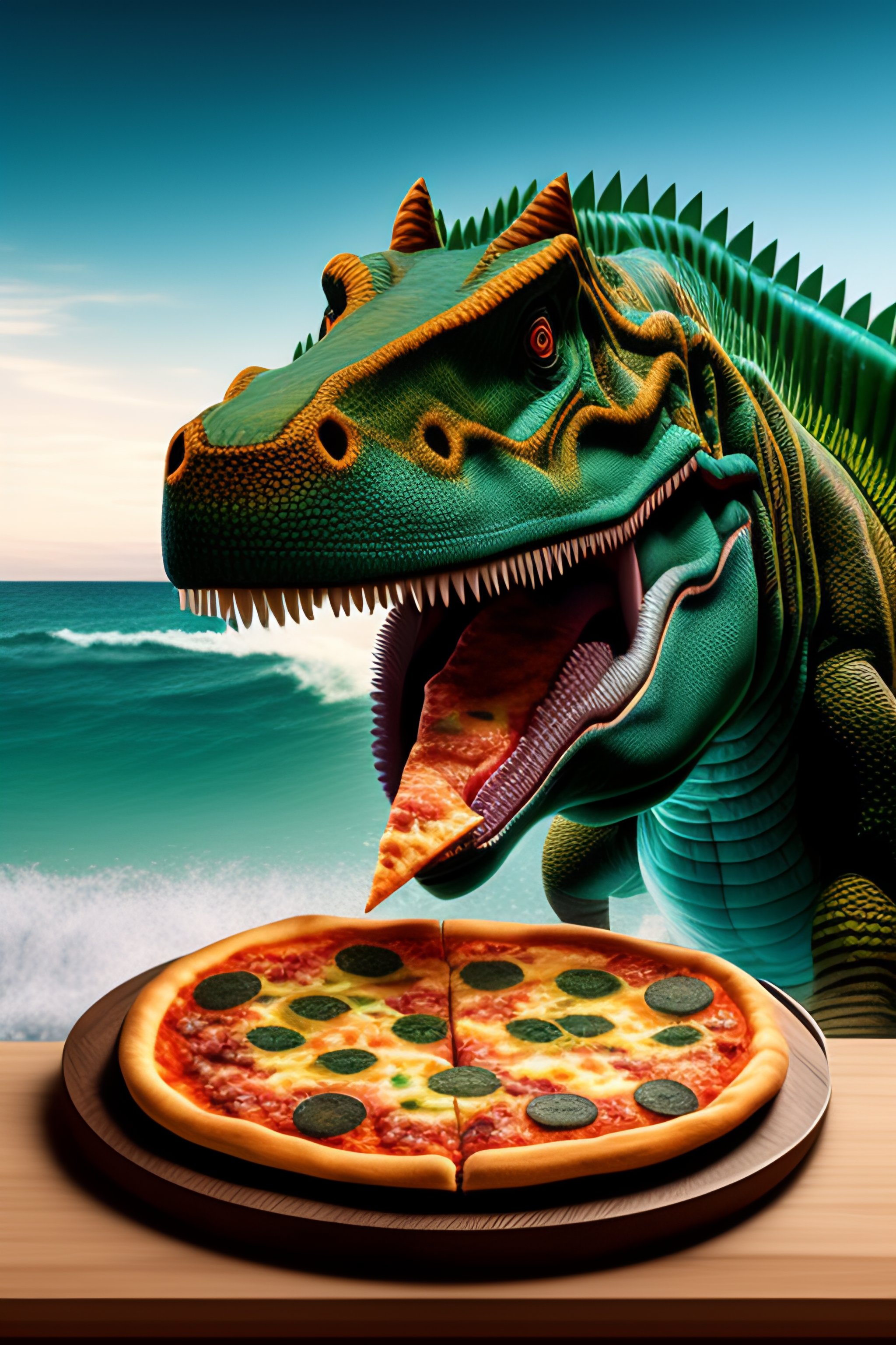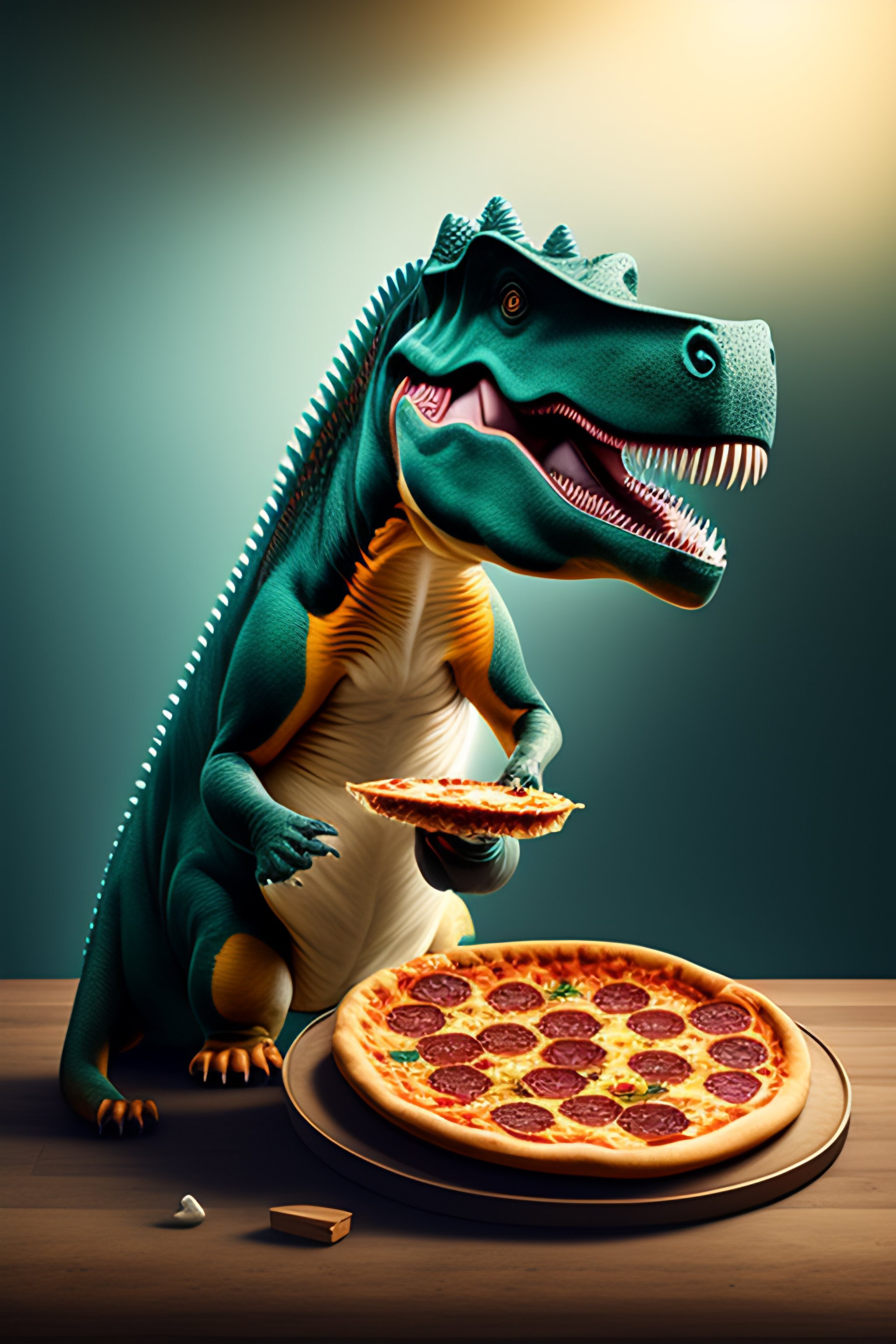 Dinosaur eating pizza
