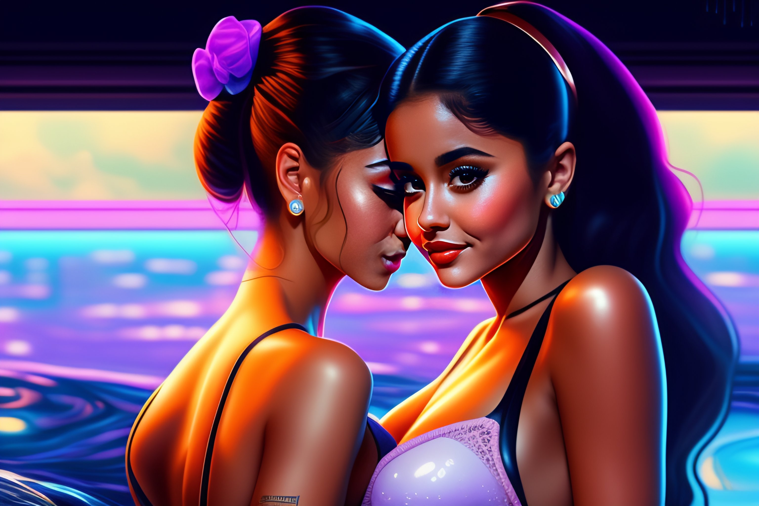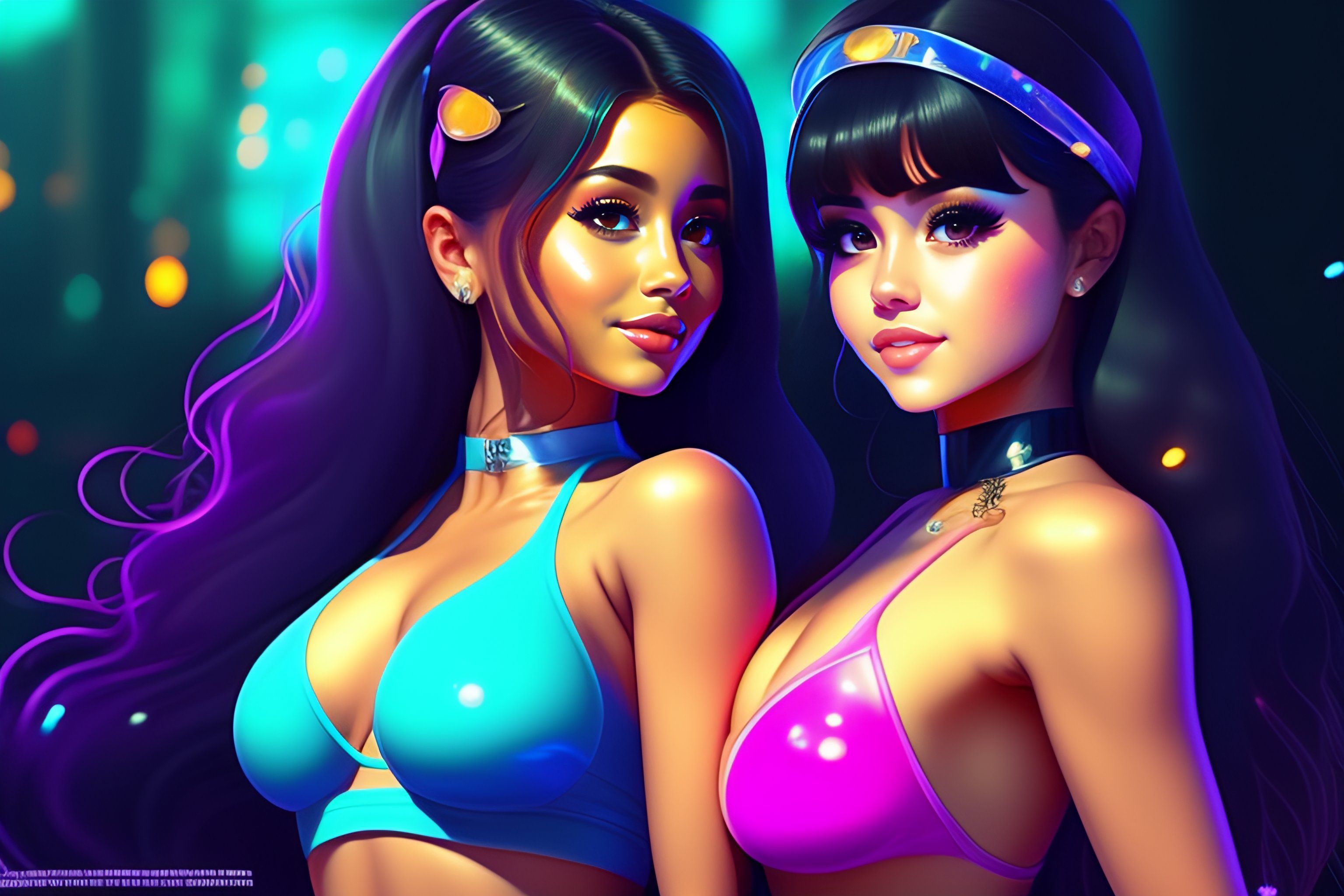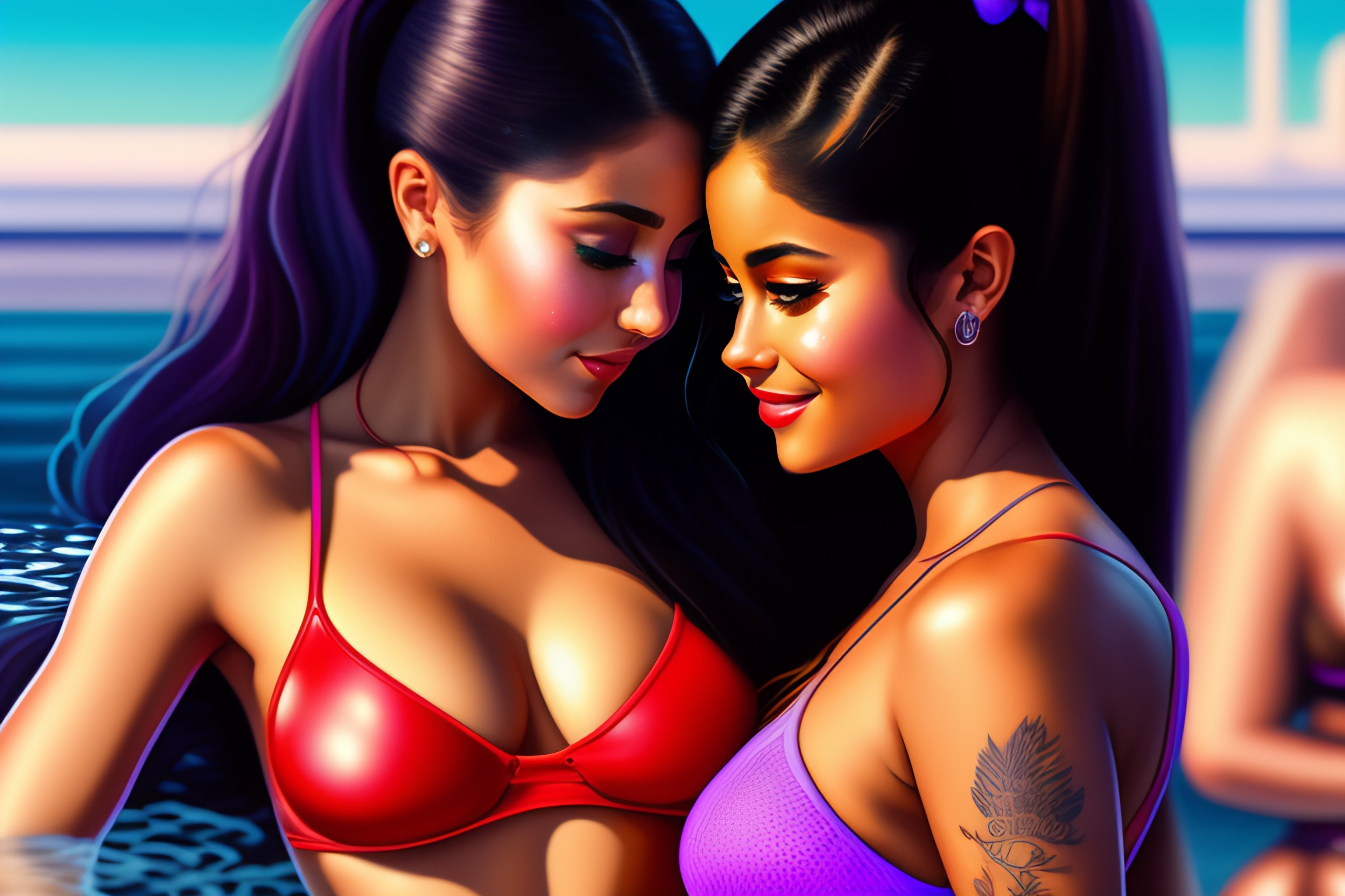 Full body ariana grande and selena gomez hugging each other with cute expression in micro piece of transparent bikini, playing with water on dark room, hyperdetailed painting, laurie greasley style, studio ghibli, akira toriyama, 4k, vibrant colors, trending on deviantart, trends in artstation, high details