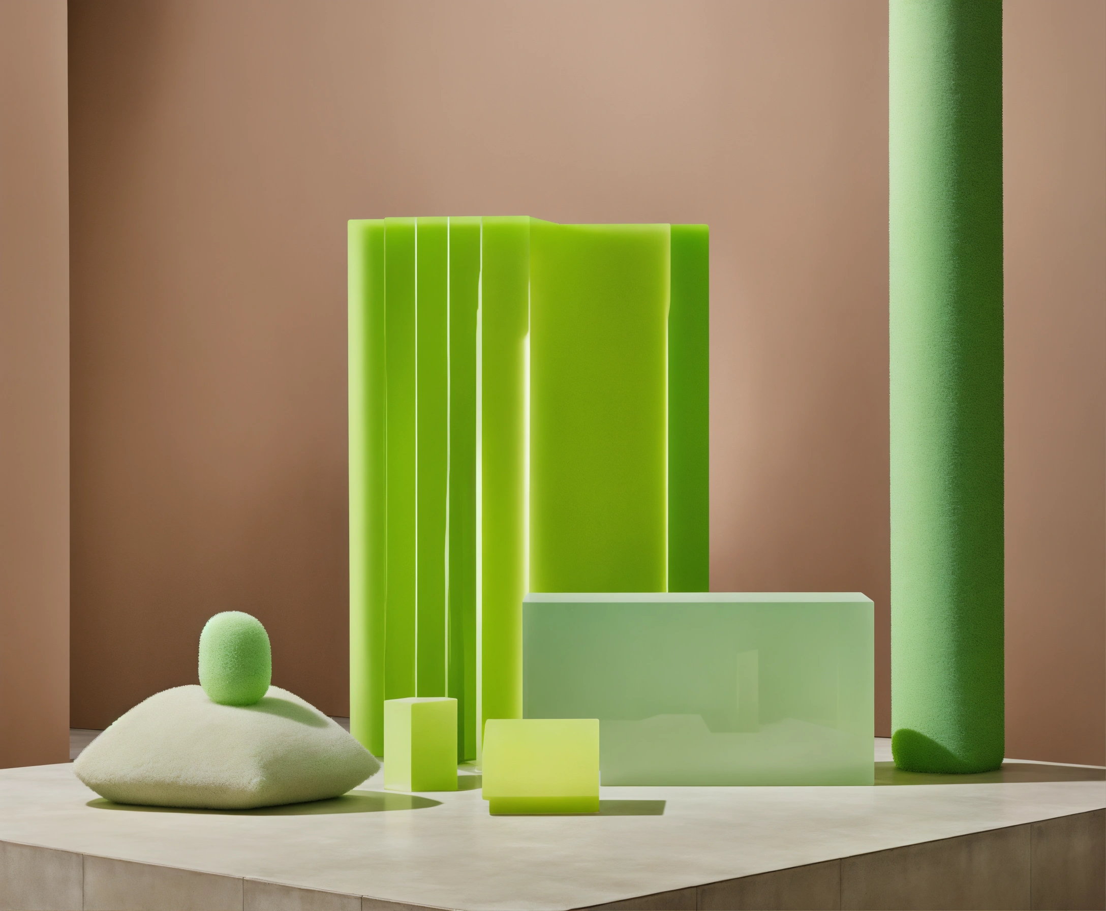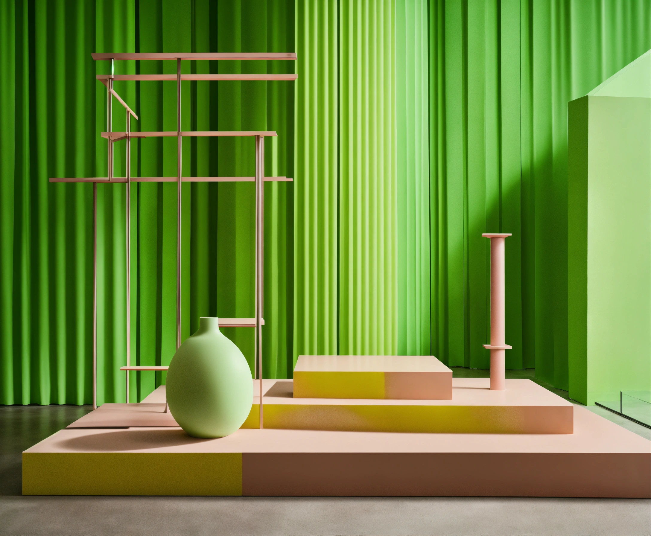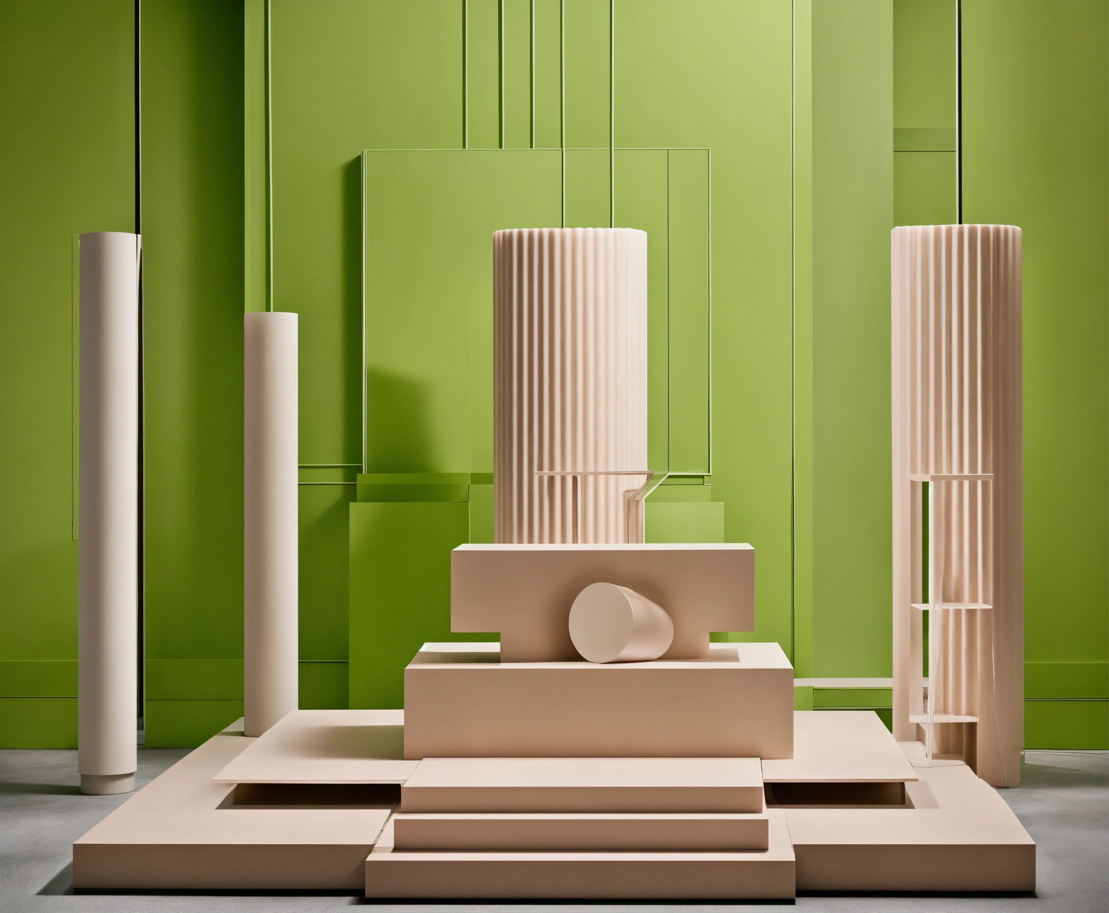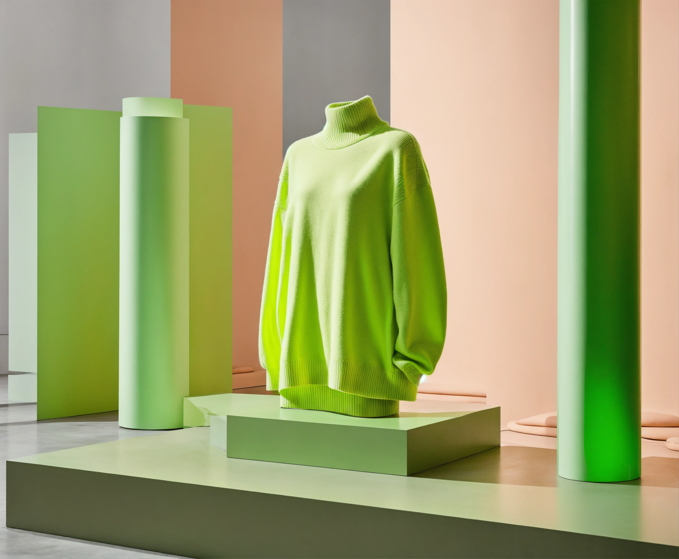 Store product display, acne studios, studio photography, minimal, stacked sweaters on abstract shape podium, resin material, neutral tones, pop of neon green, roman pillars! sculpture!