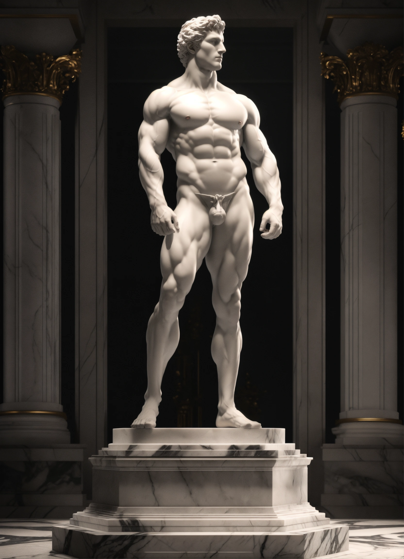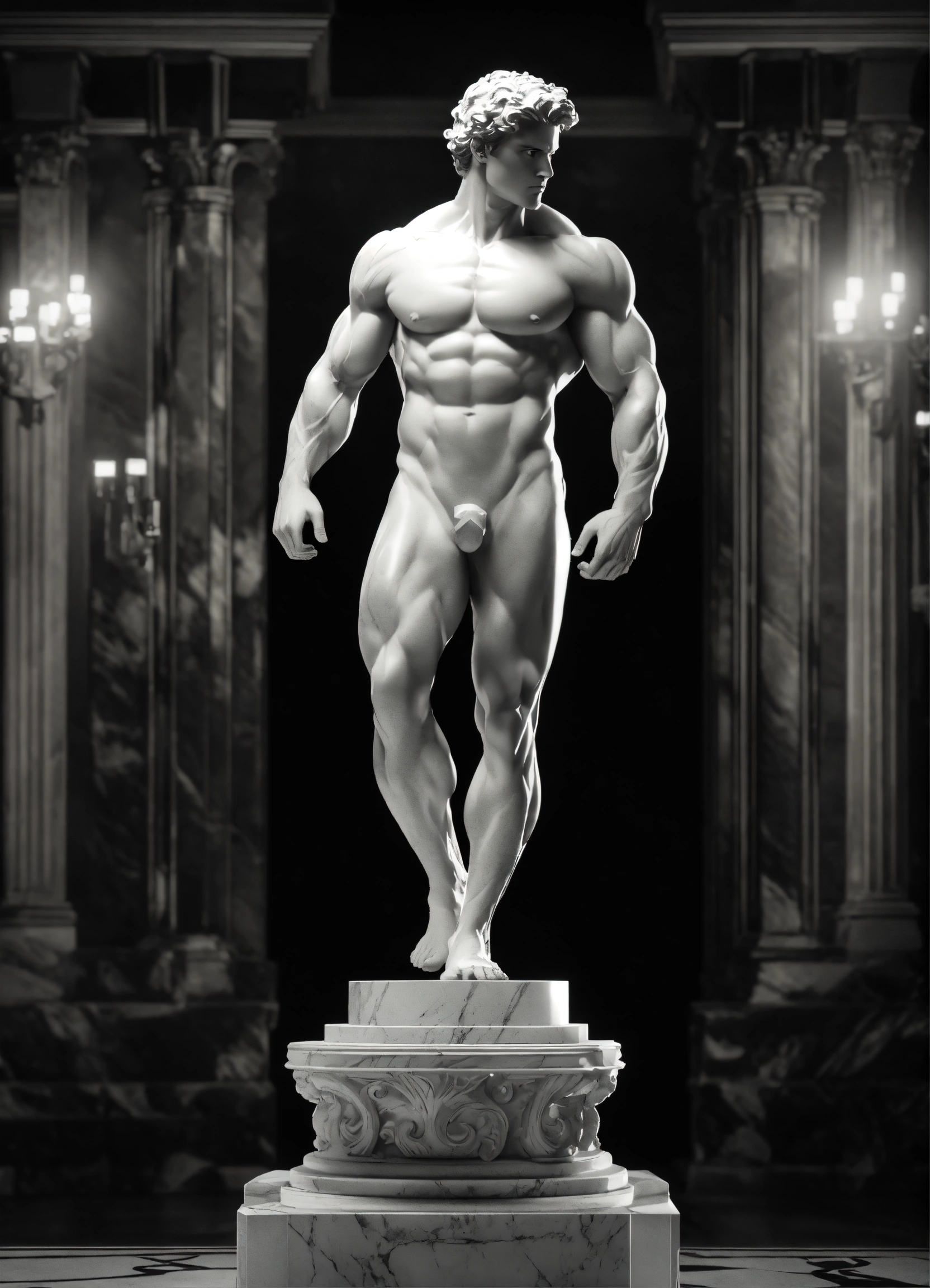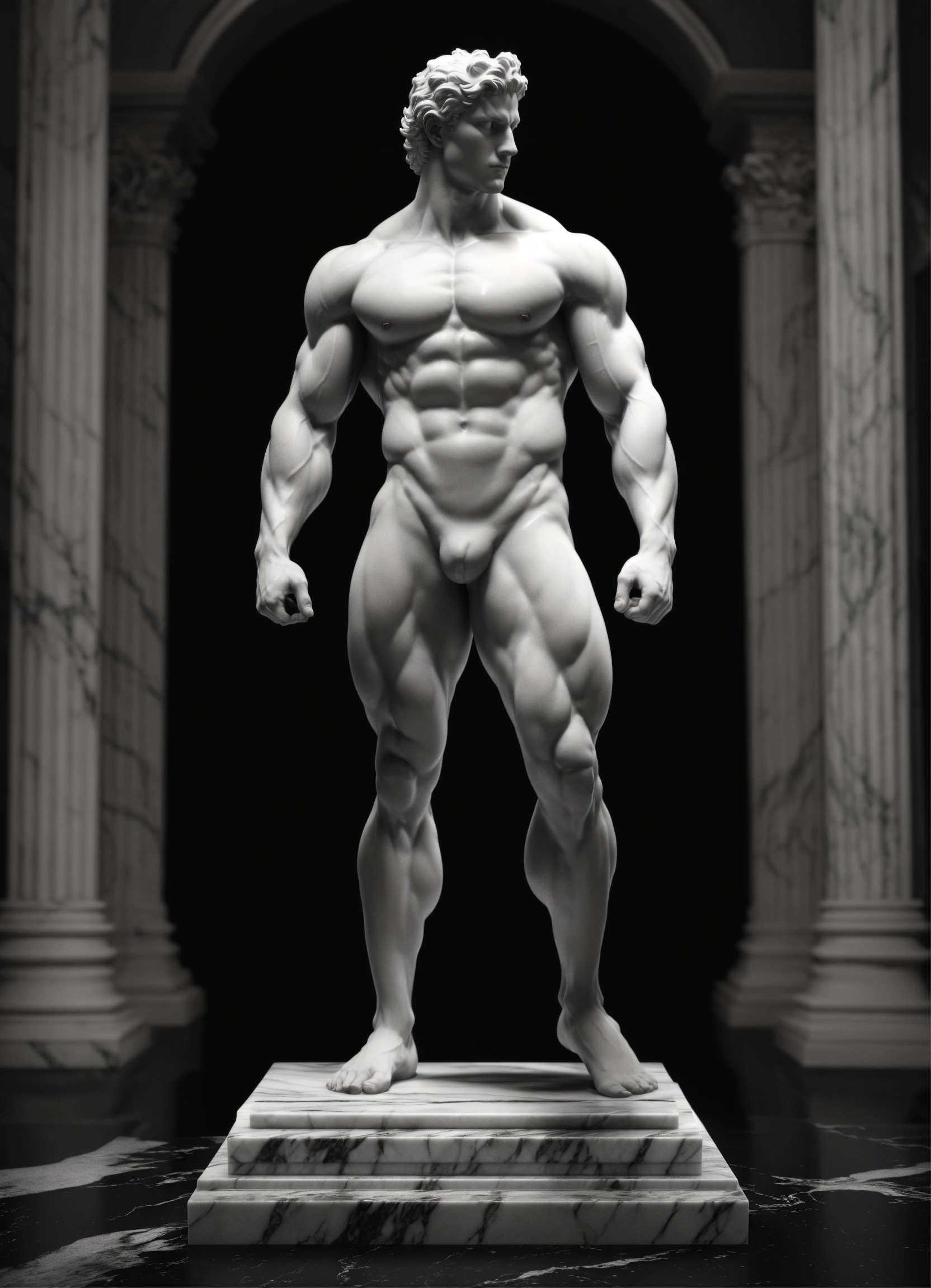 Canova sculpture of superior athletic body muscled man in black and white marble, hero, full character art in blender 3d using volumetric and blurred lights, loop renderer in dark divine ambient setting, 4k, soft details, wlop, vray, absolute black background.