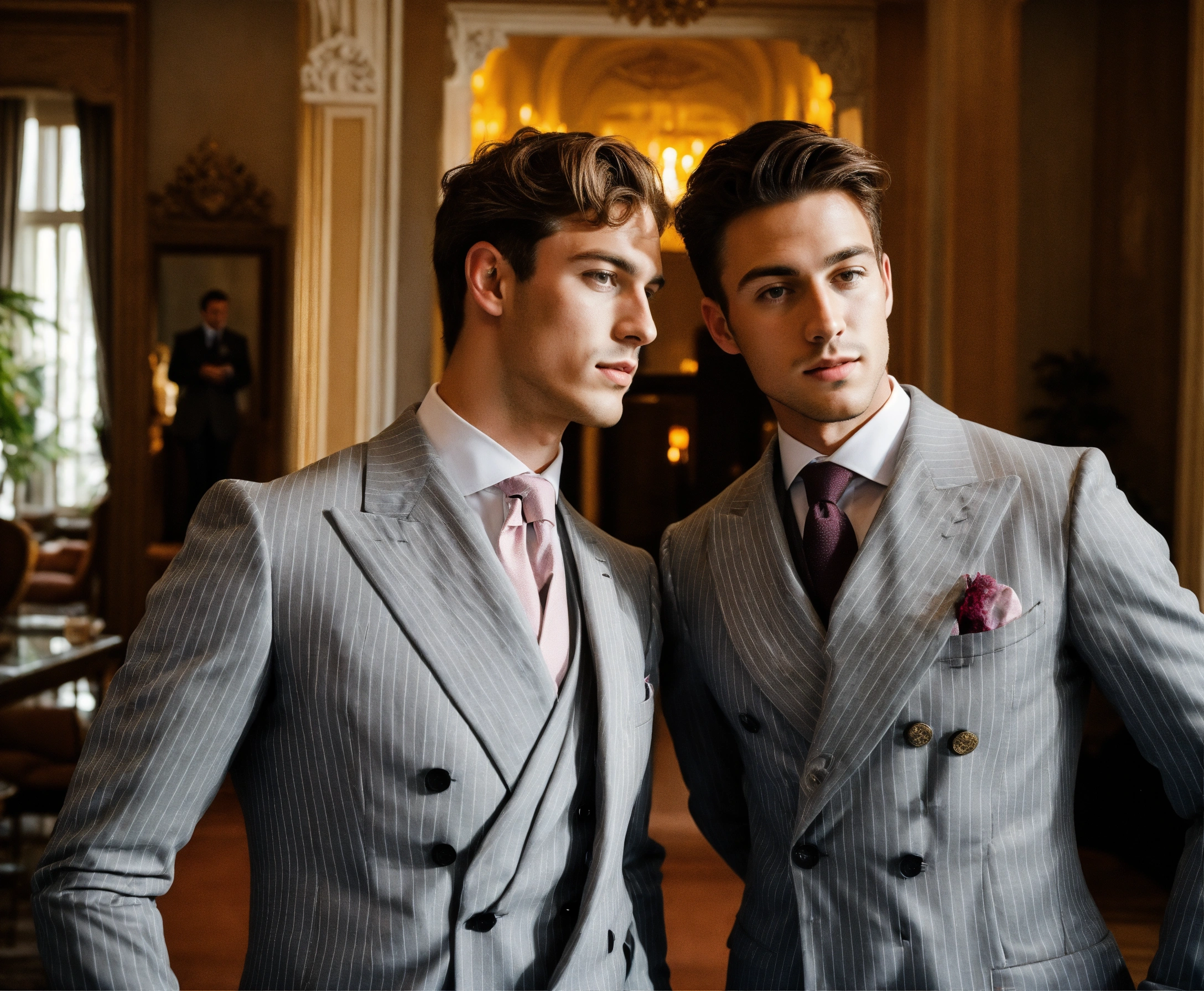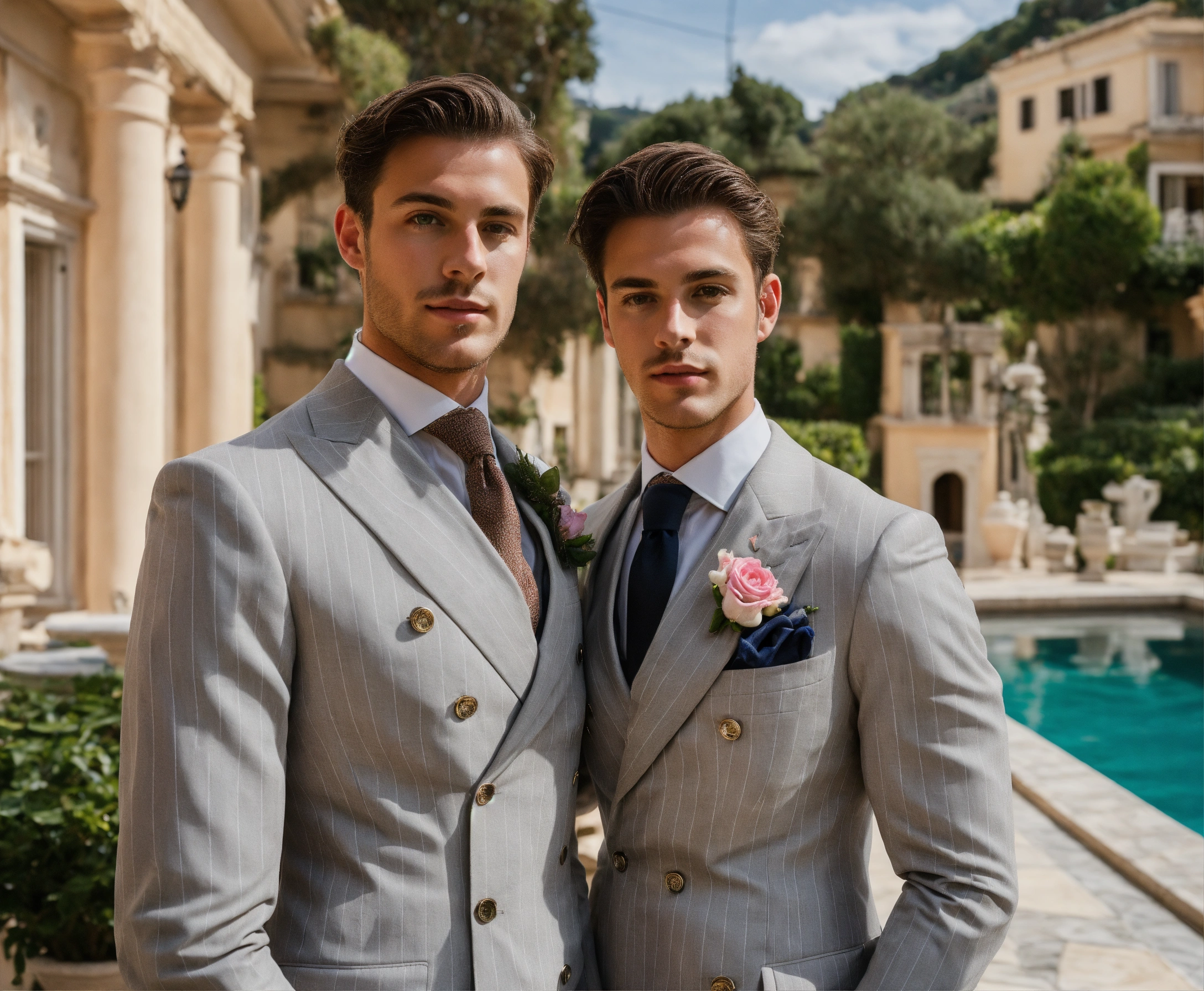 Two young british male aristocrats, in light grey double breasted pinstripe suit, taking a selfie in a villa in naples