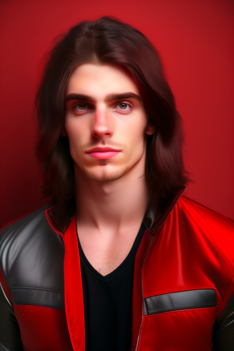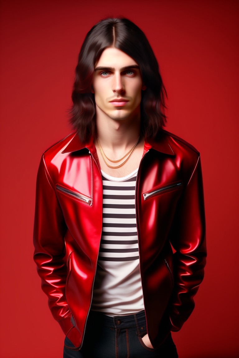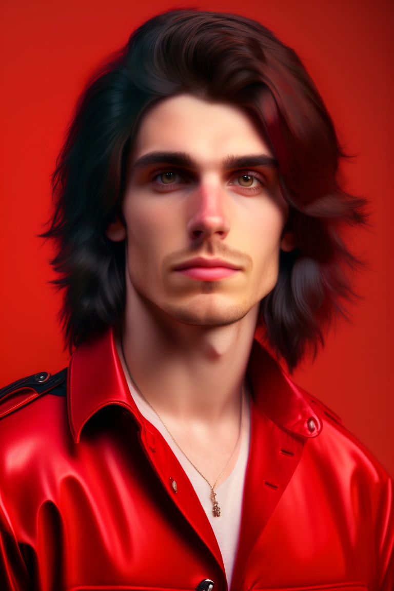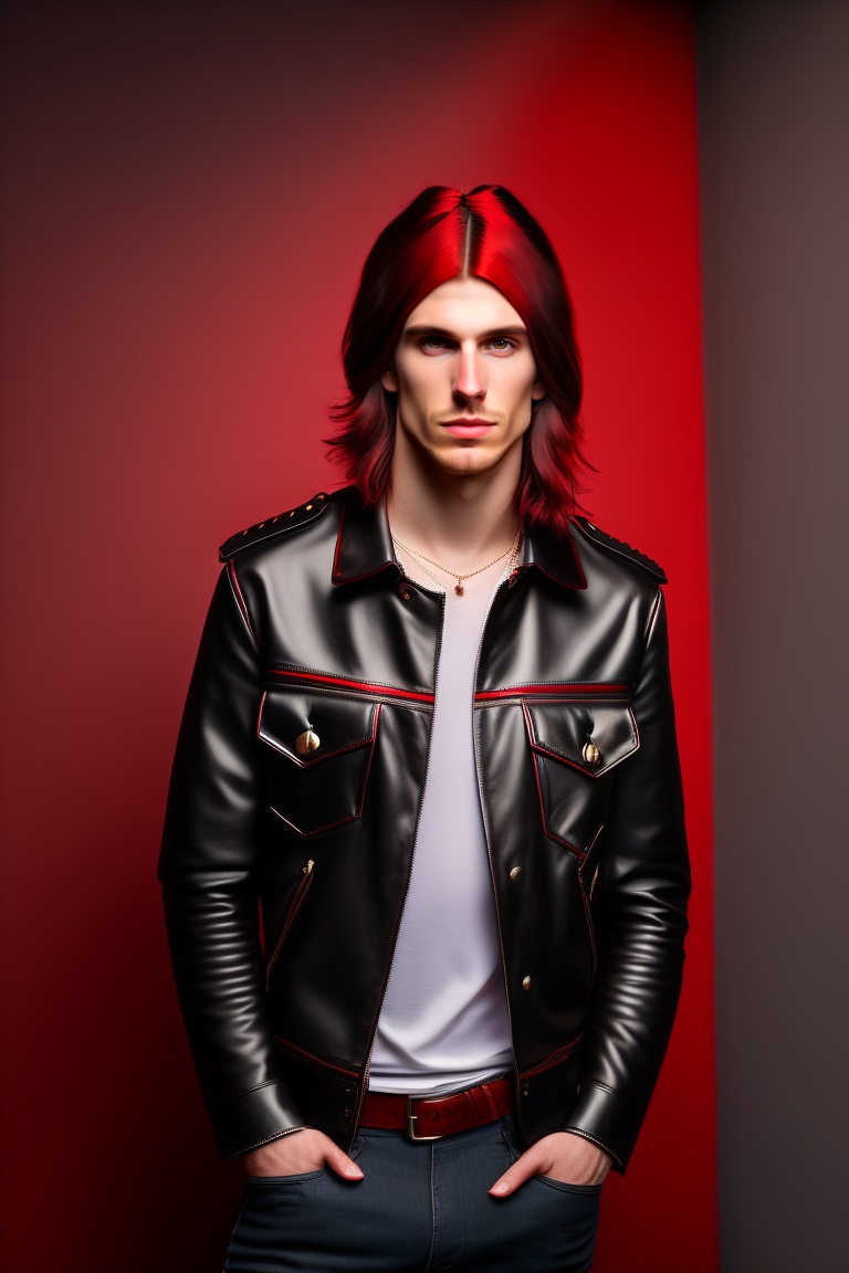 Portrait full body of a 25 years old white man, thin face, medium length like kurt cobain red bungrudy and black hair, black gaze, domonic hero, nose piercing, rock n roll outfit
